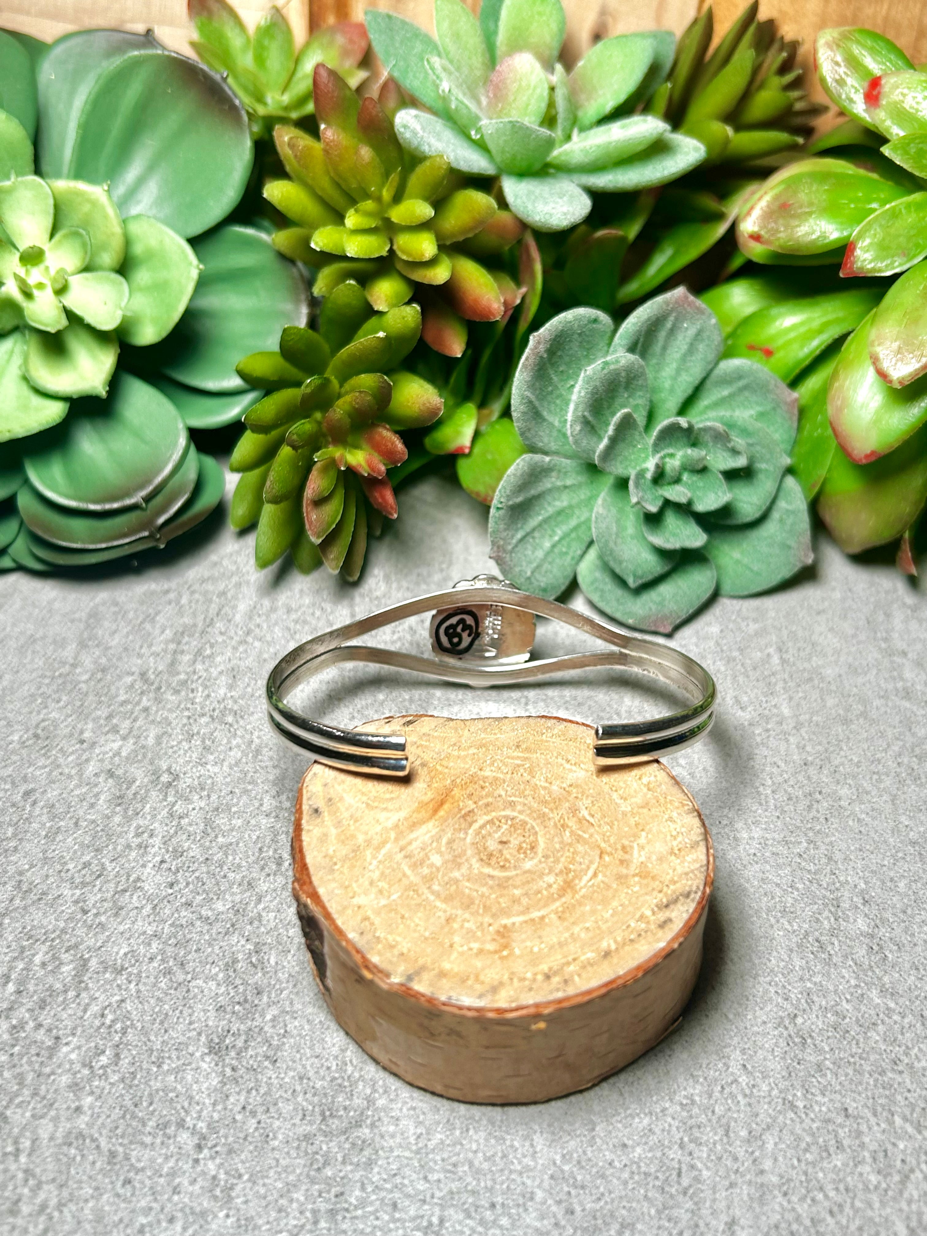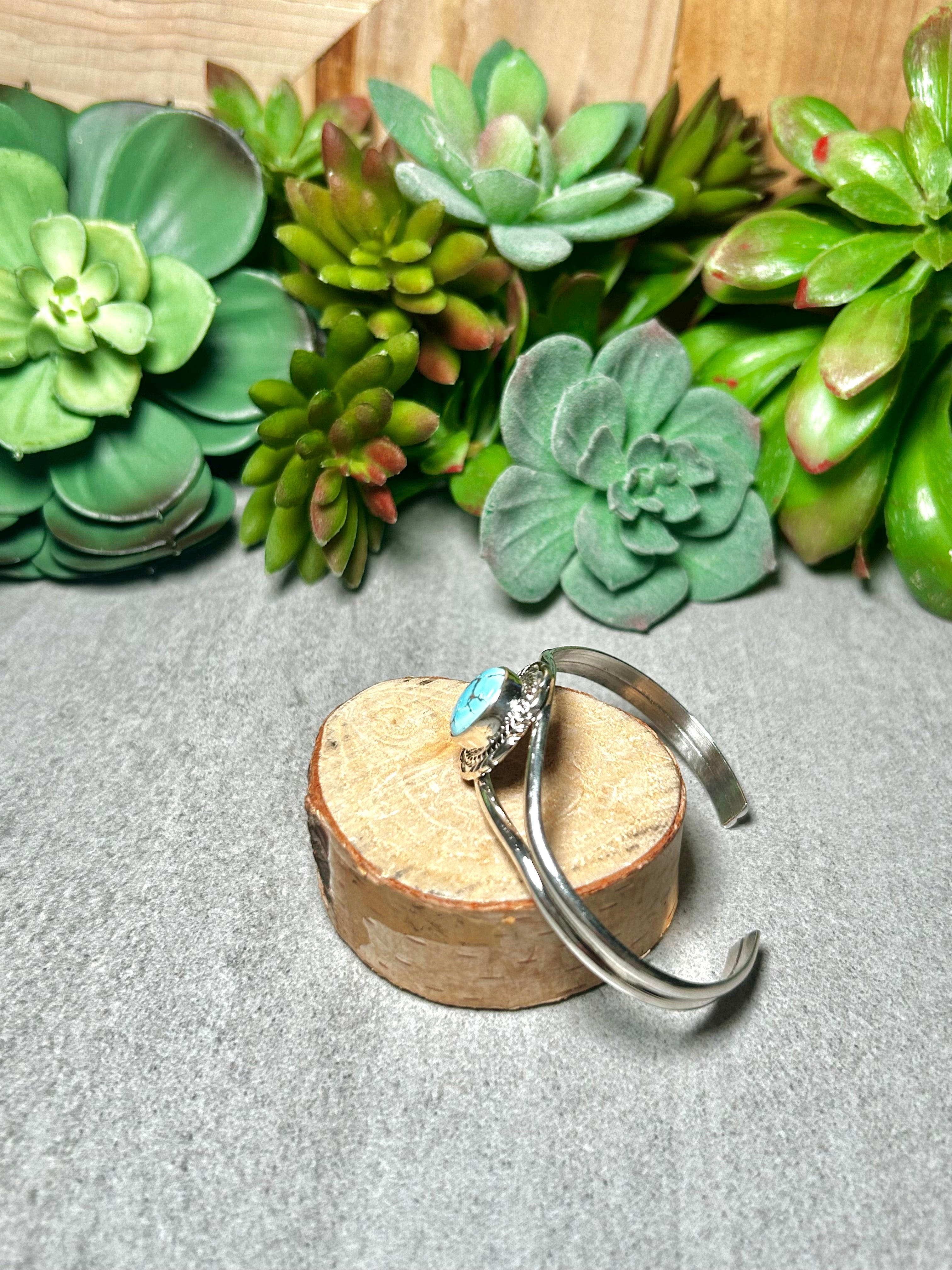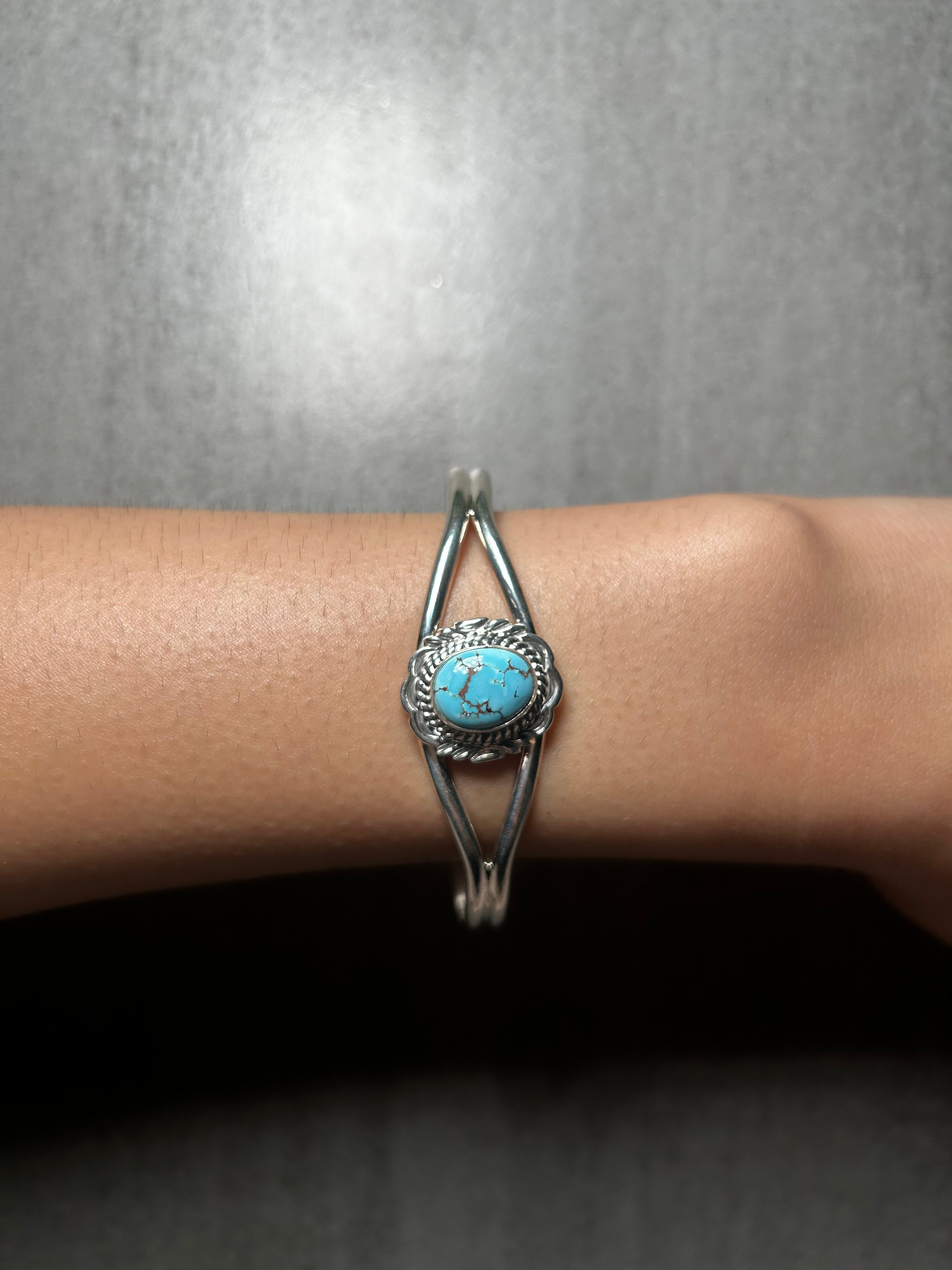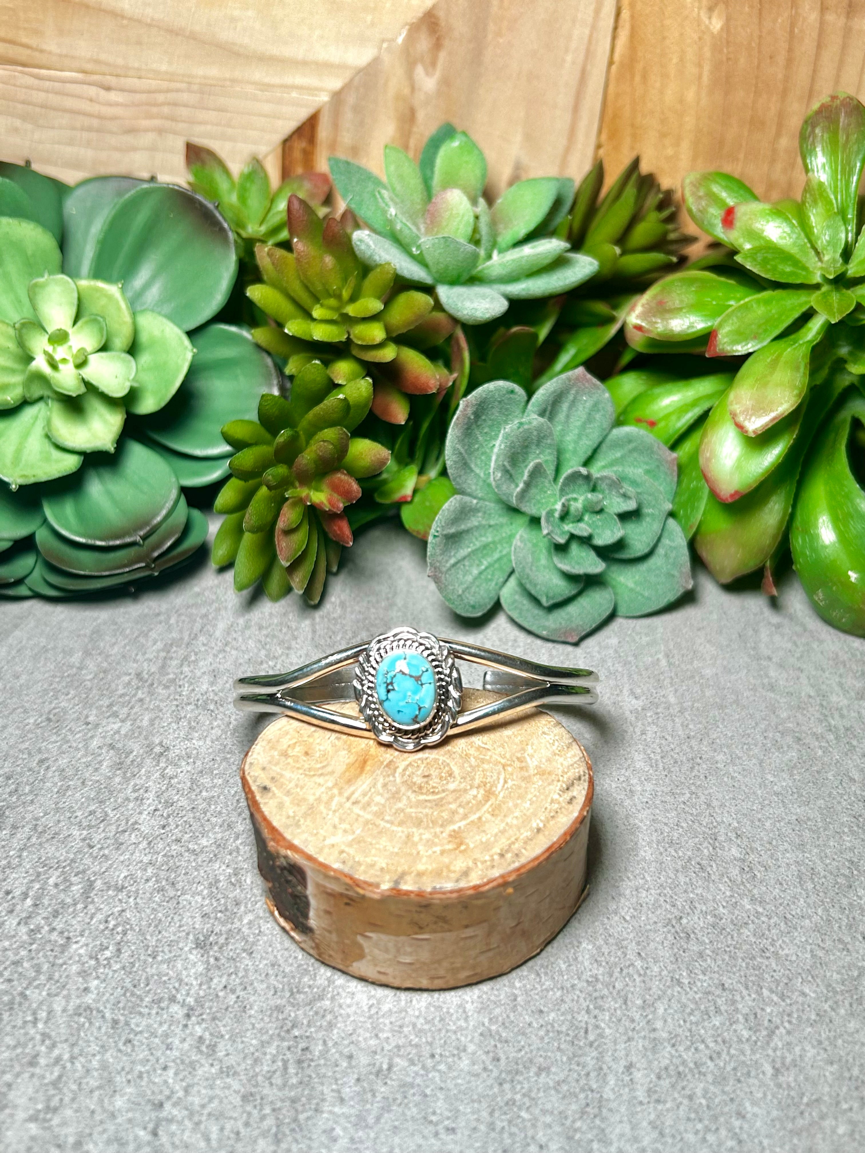 Virgil Chee Golden Hill Turquoise & Sterling Silver Cuff Bracelet. It measures 3/4 of an inch wide with an inside circumference of 5 1/2 inches and a gap of 7/8 of an inch. Signed by the artist and stamped sterling silver.