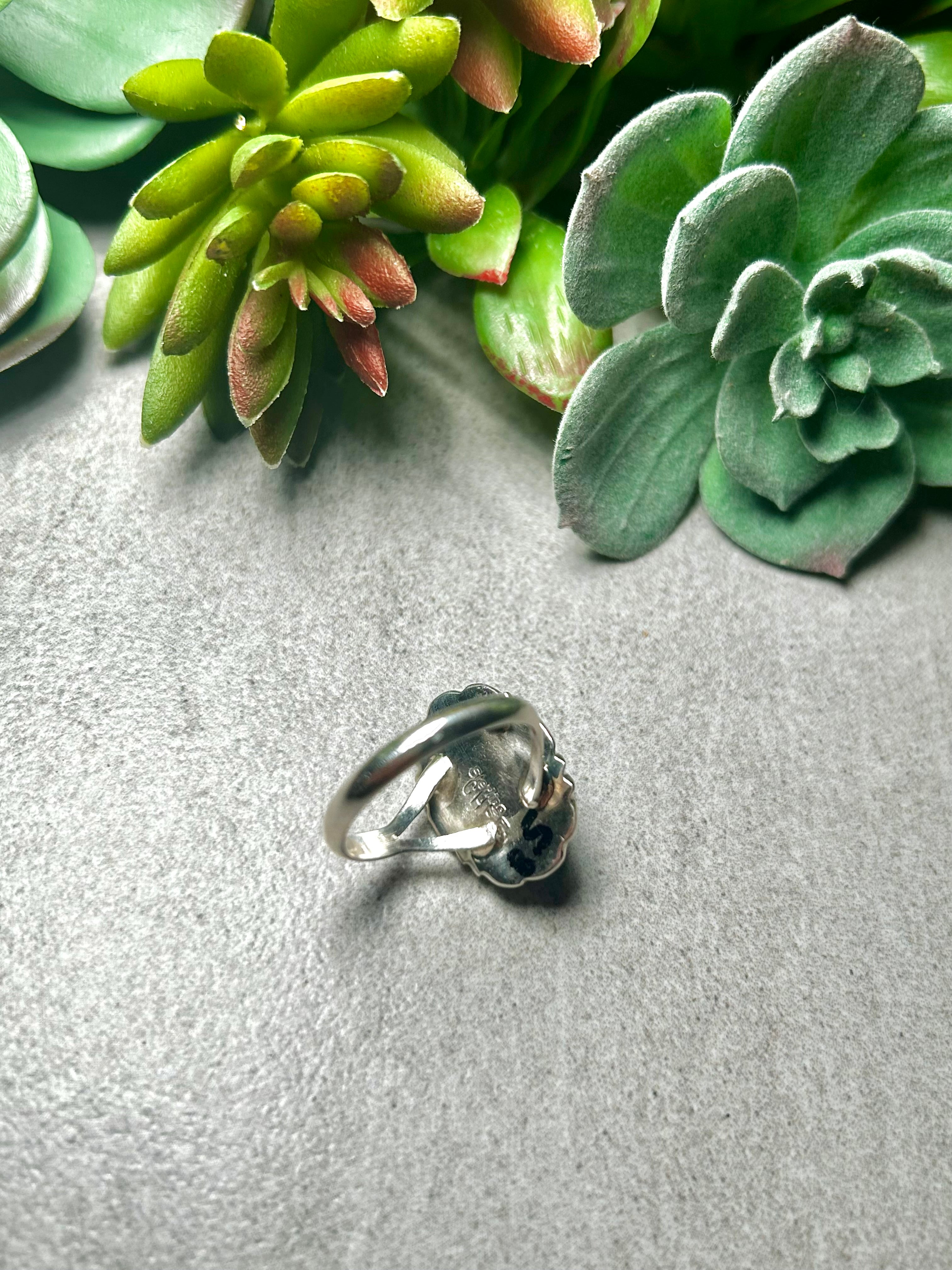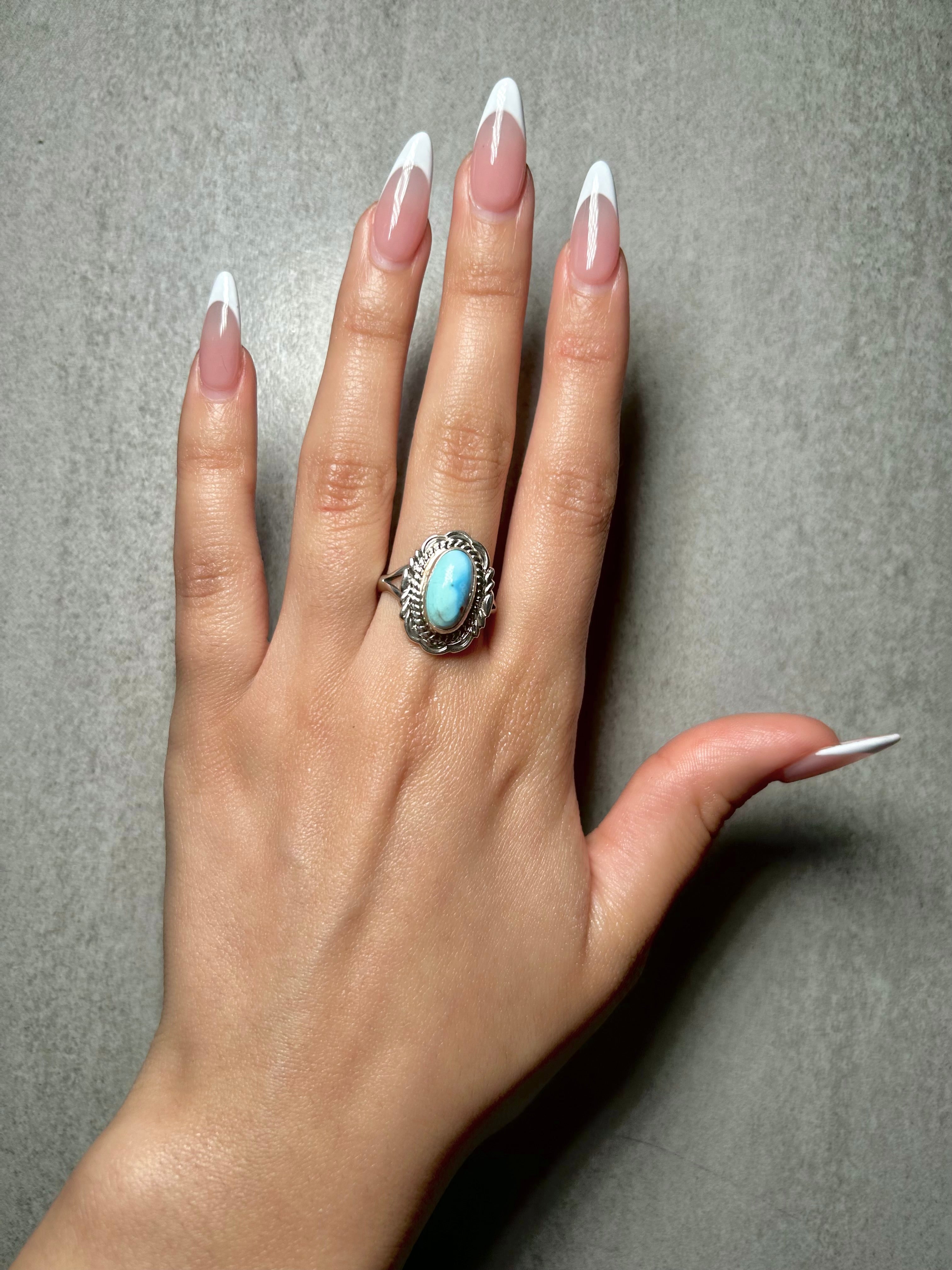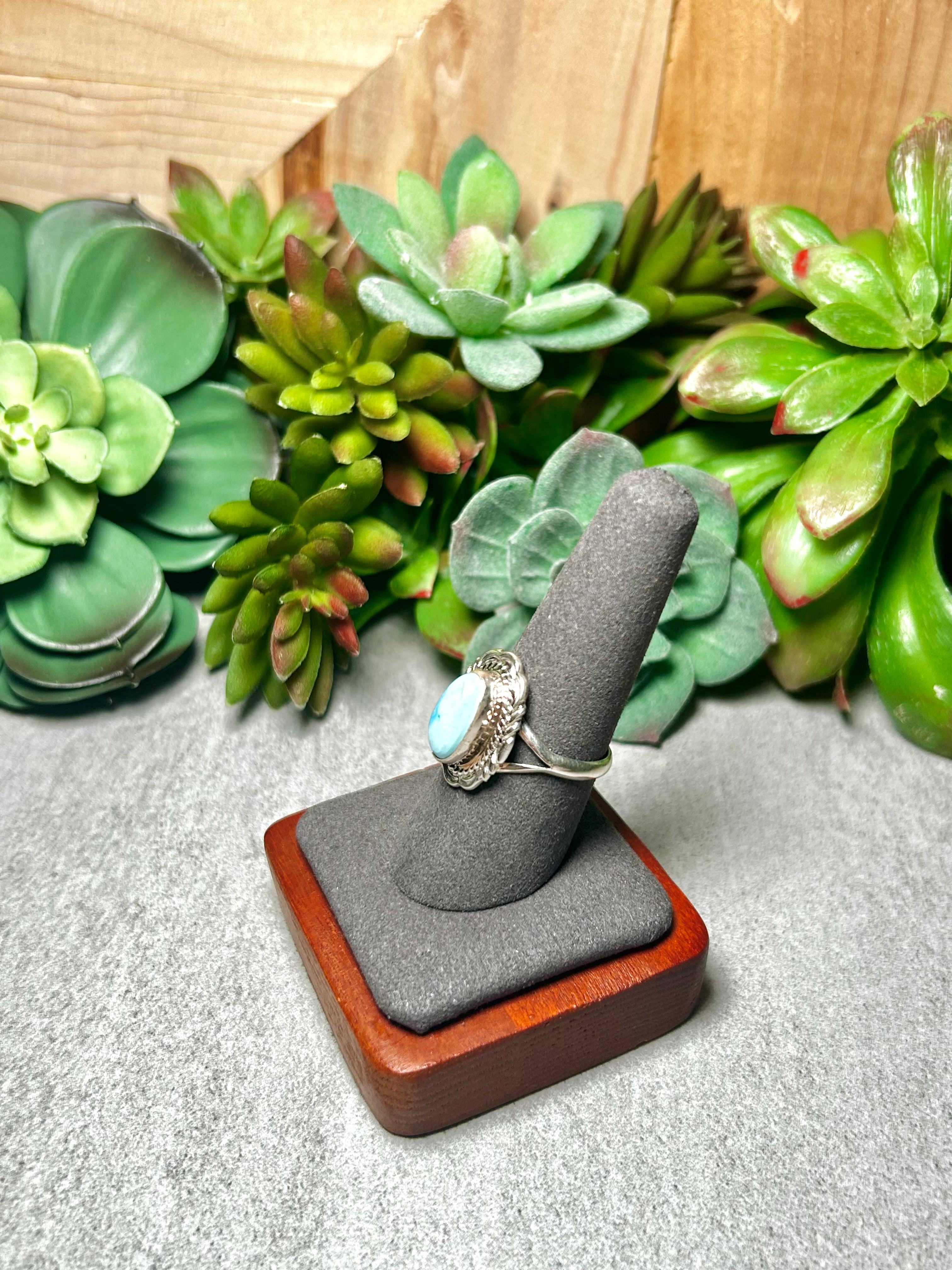 Virgil Chee Golden Hill Turquoise & Sterling Silver Ring Size 8.75. It measures 7/8 of an inch long and 1/2 of an inch wide. Signed by the artist and stamped sterling silver.