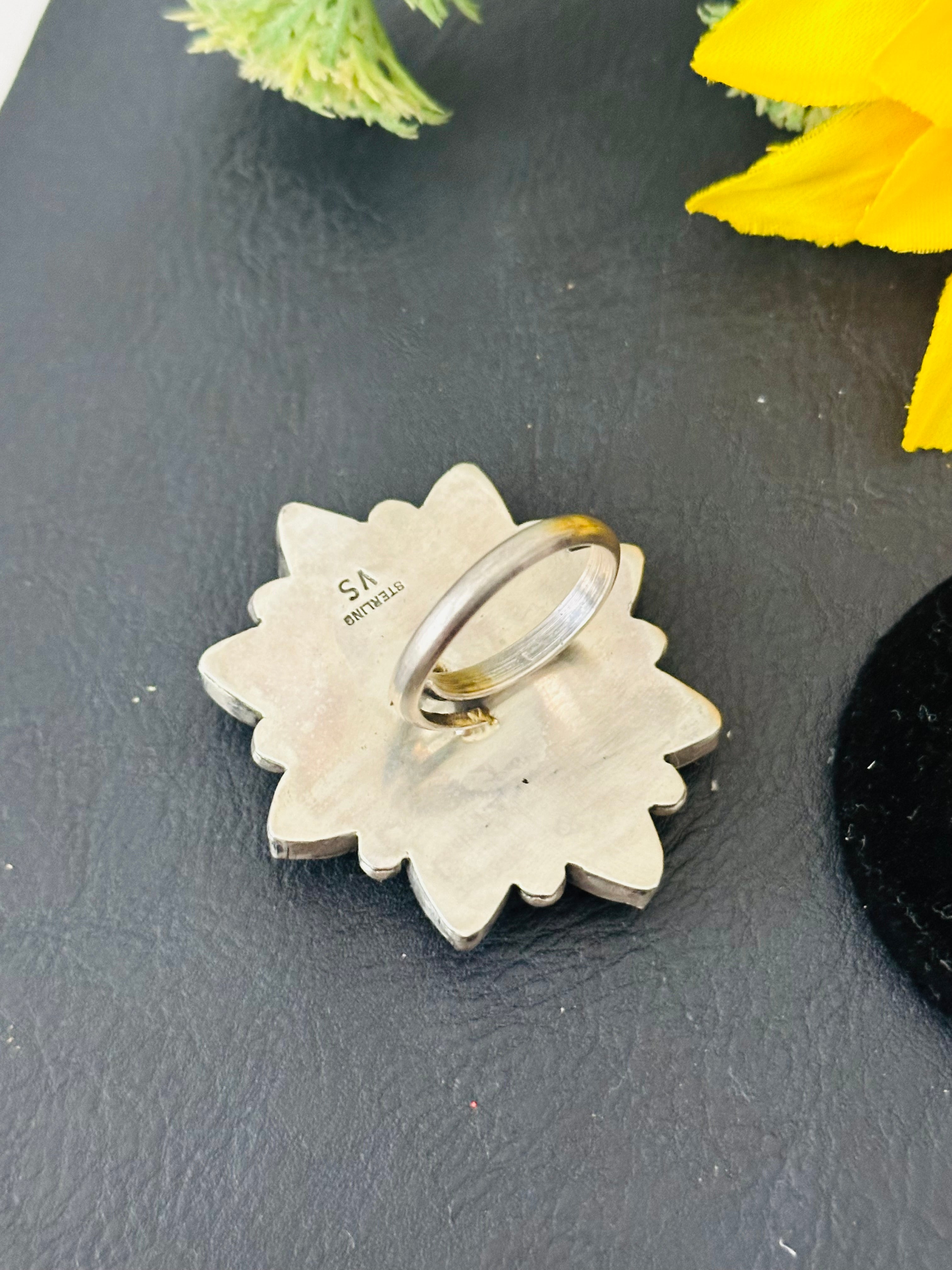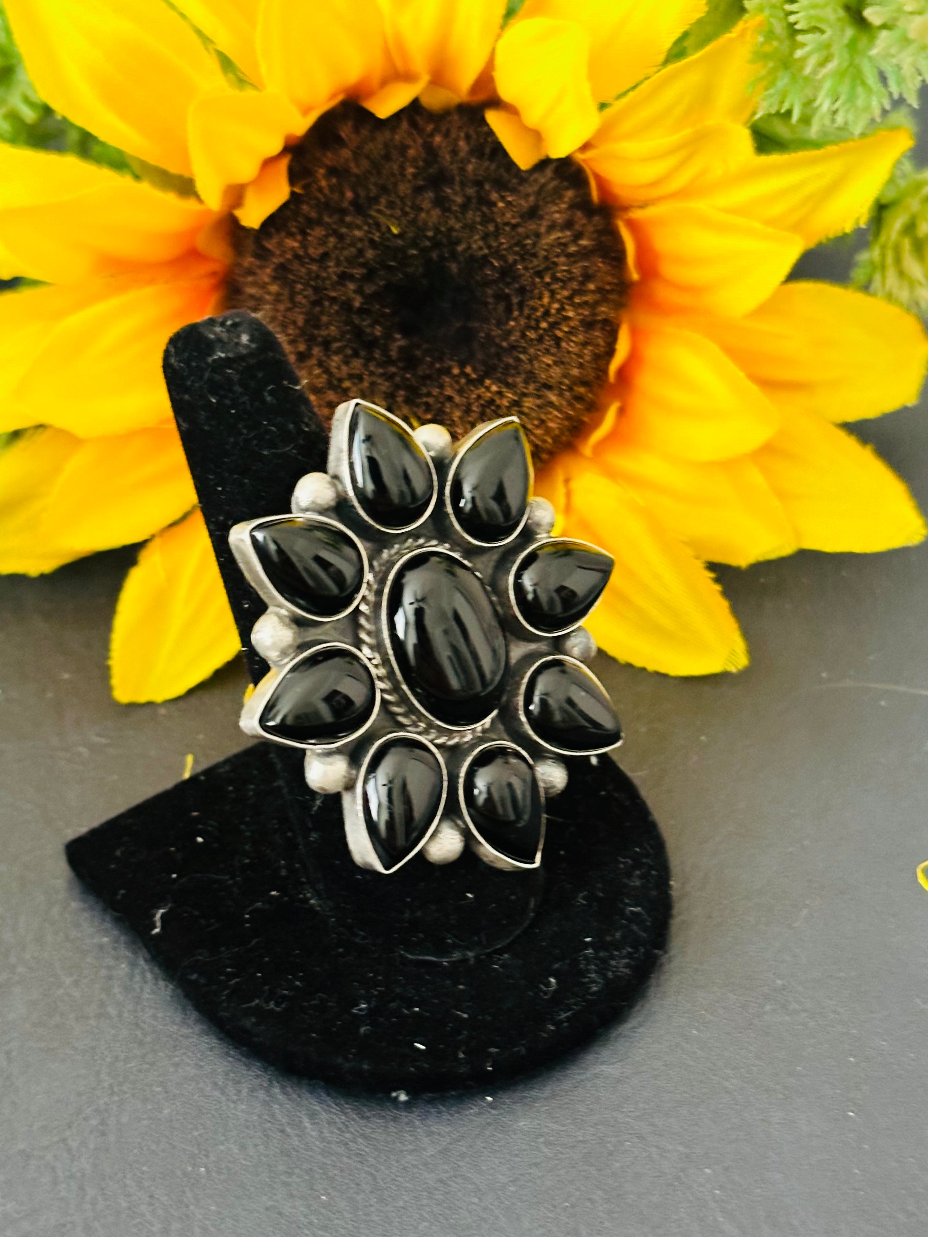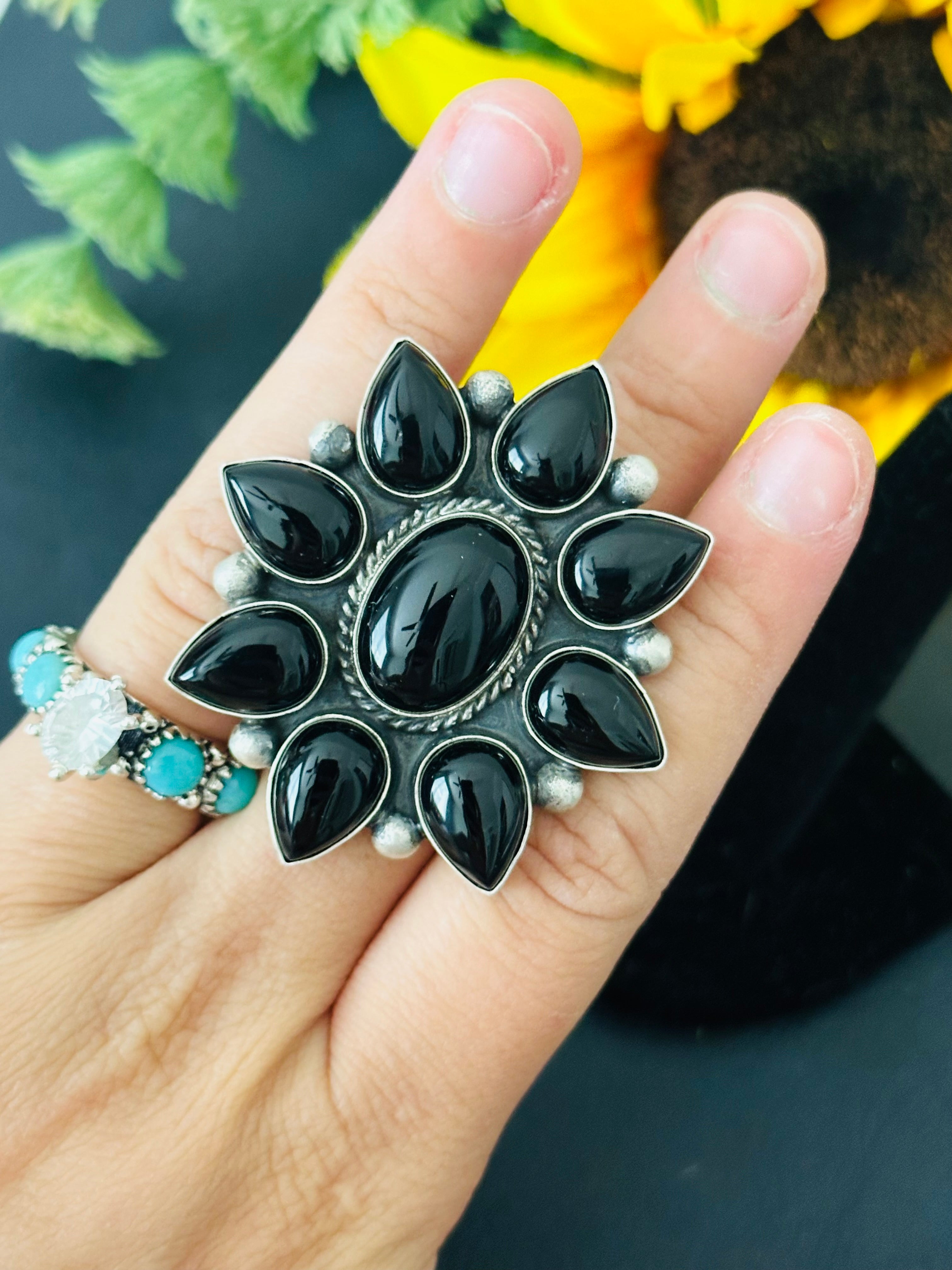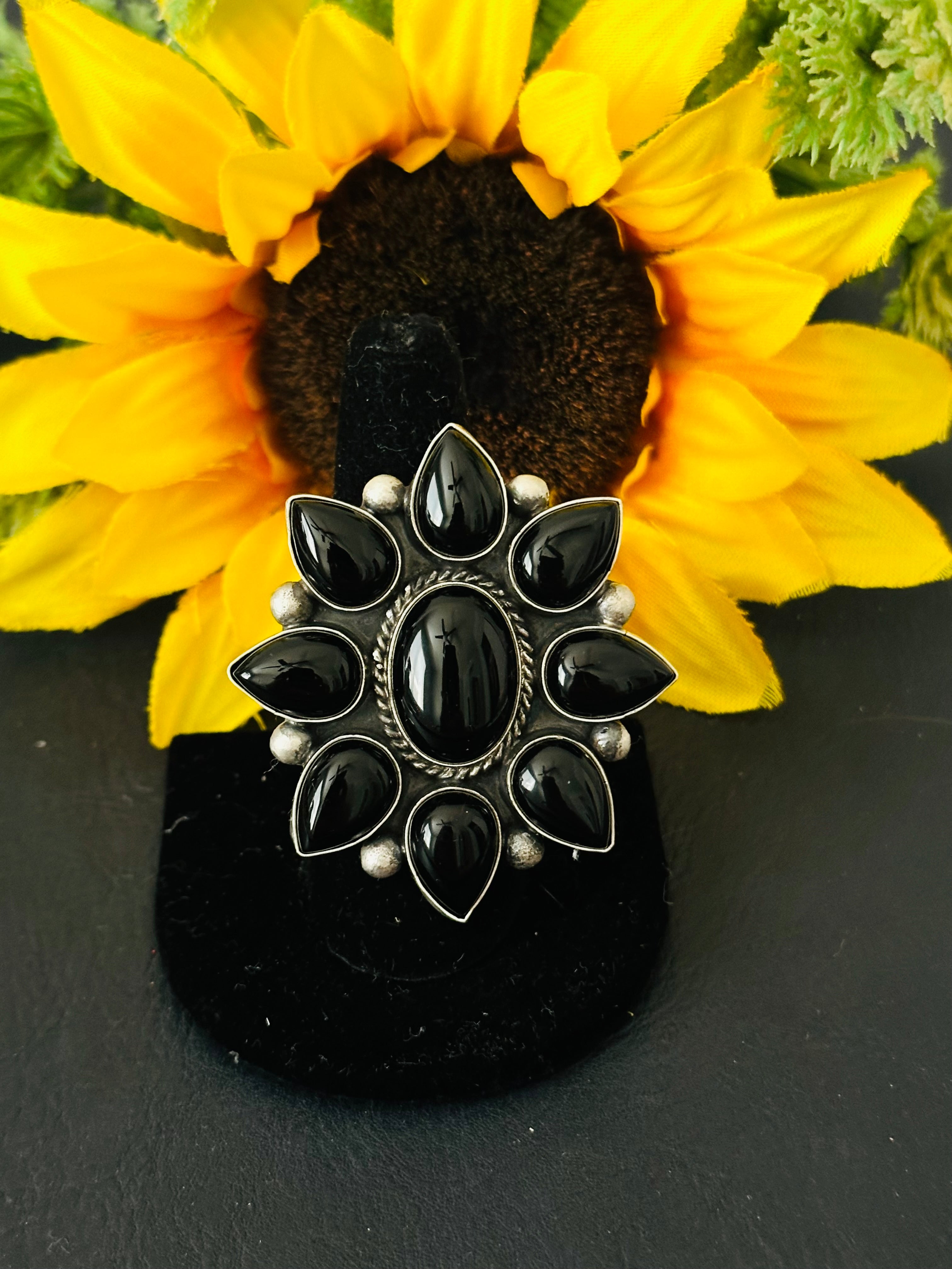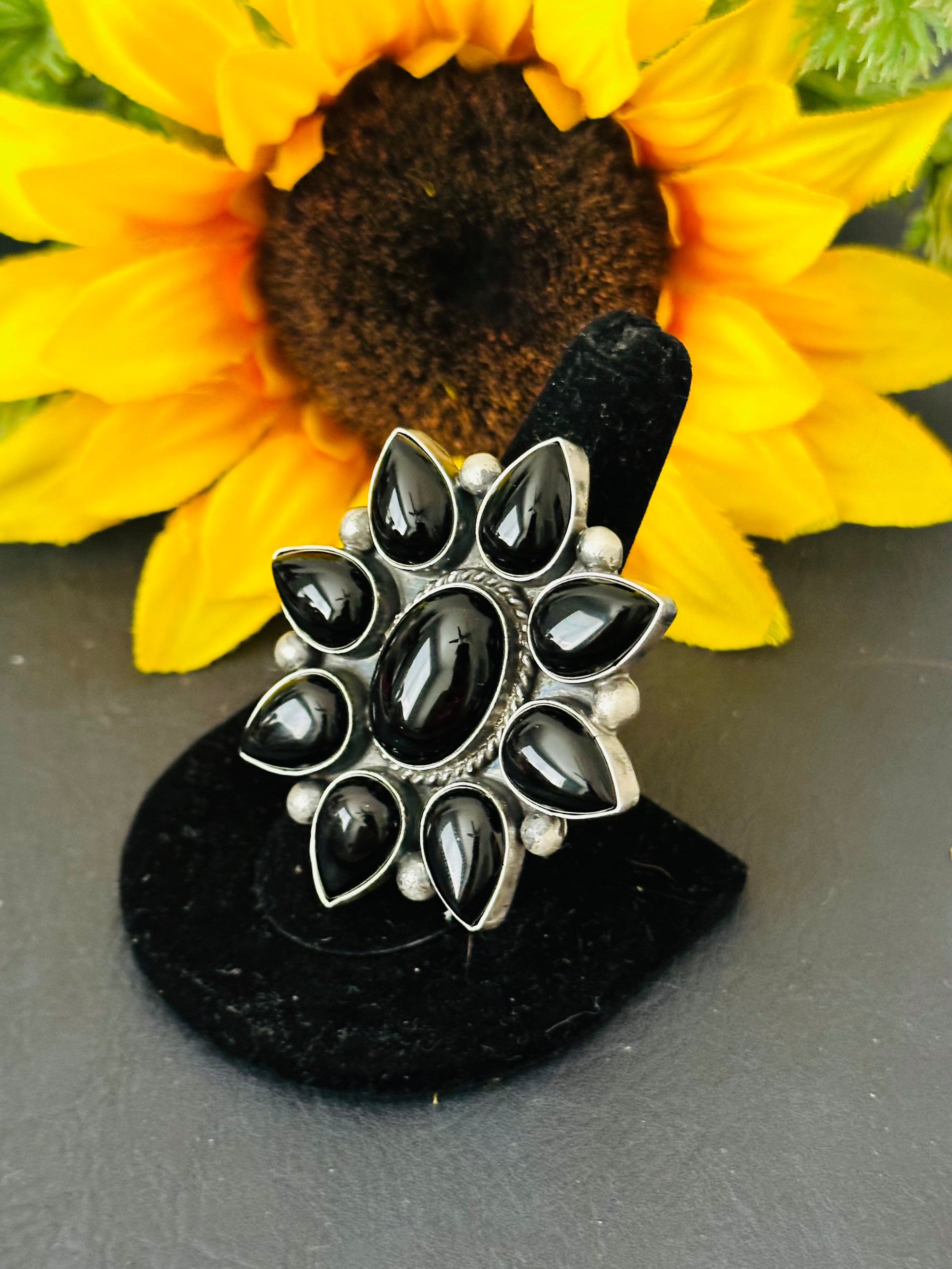 A beautiful Ring. Virginia Sandoval Onyx & Sterling Silver Adjustable Cluster Ring. It measures 2 inches round. Signed by the artist and stamped sterling silver.