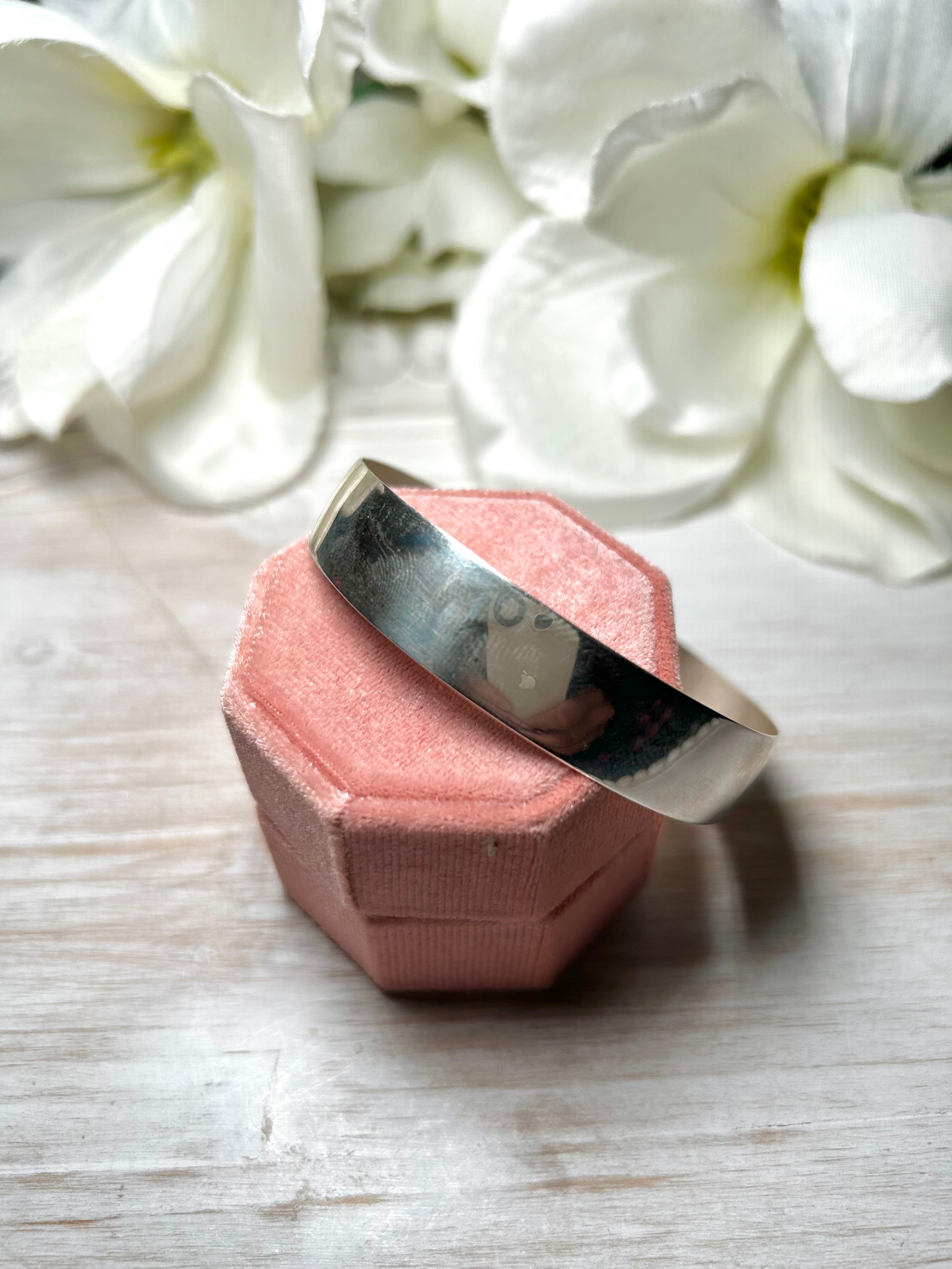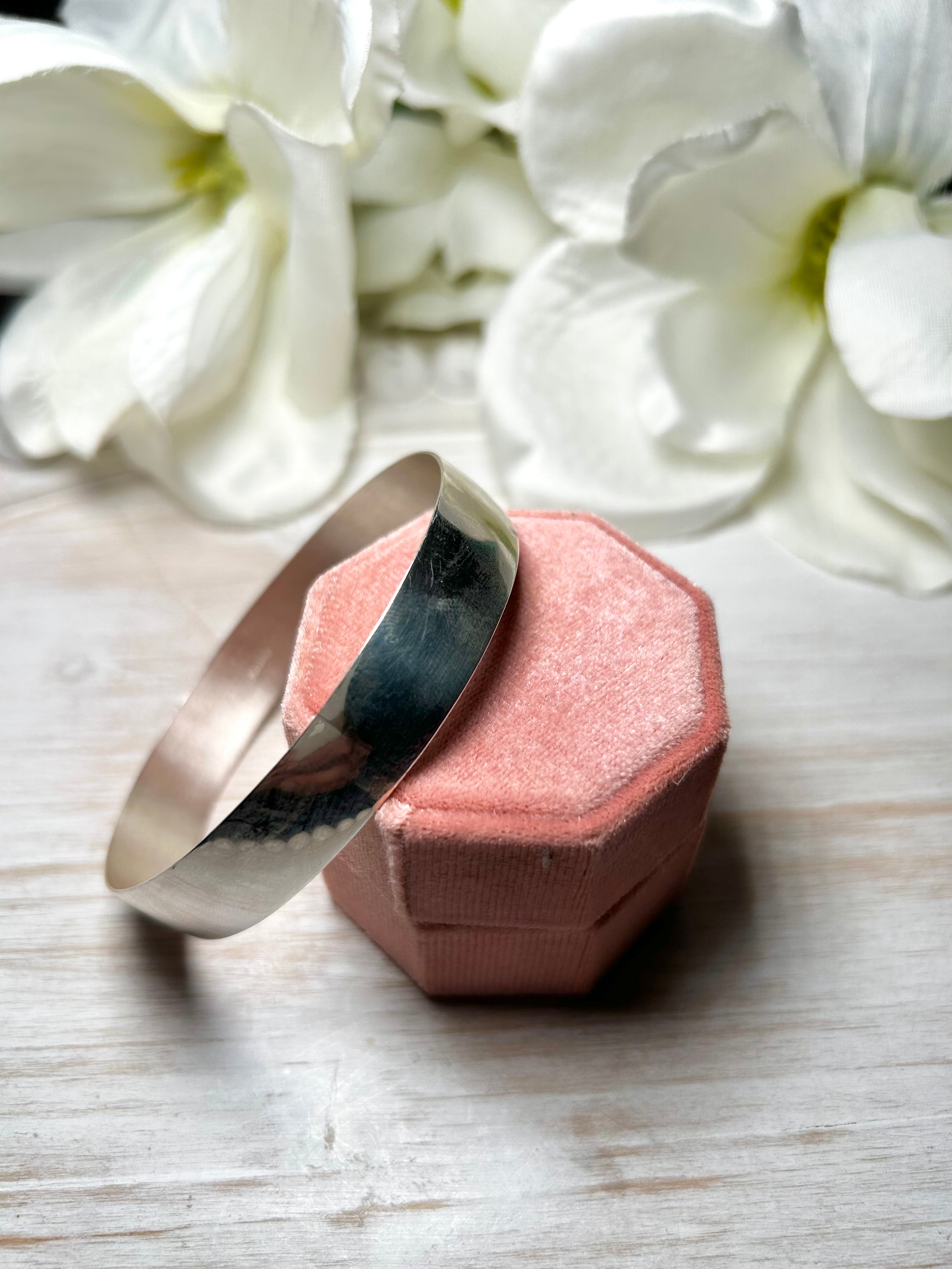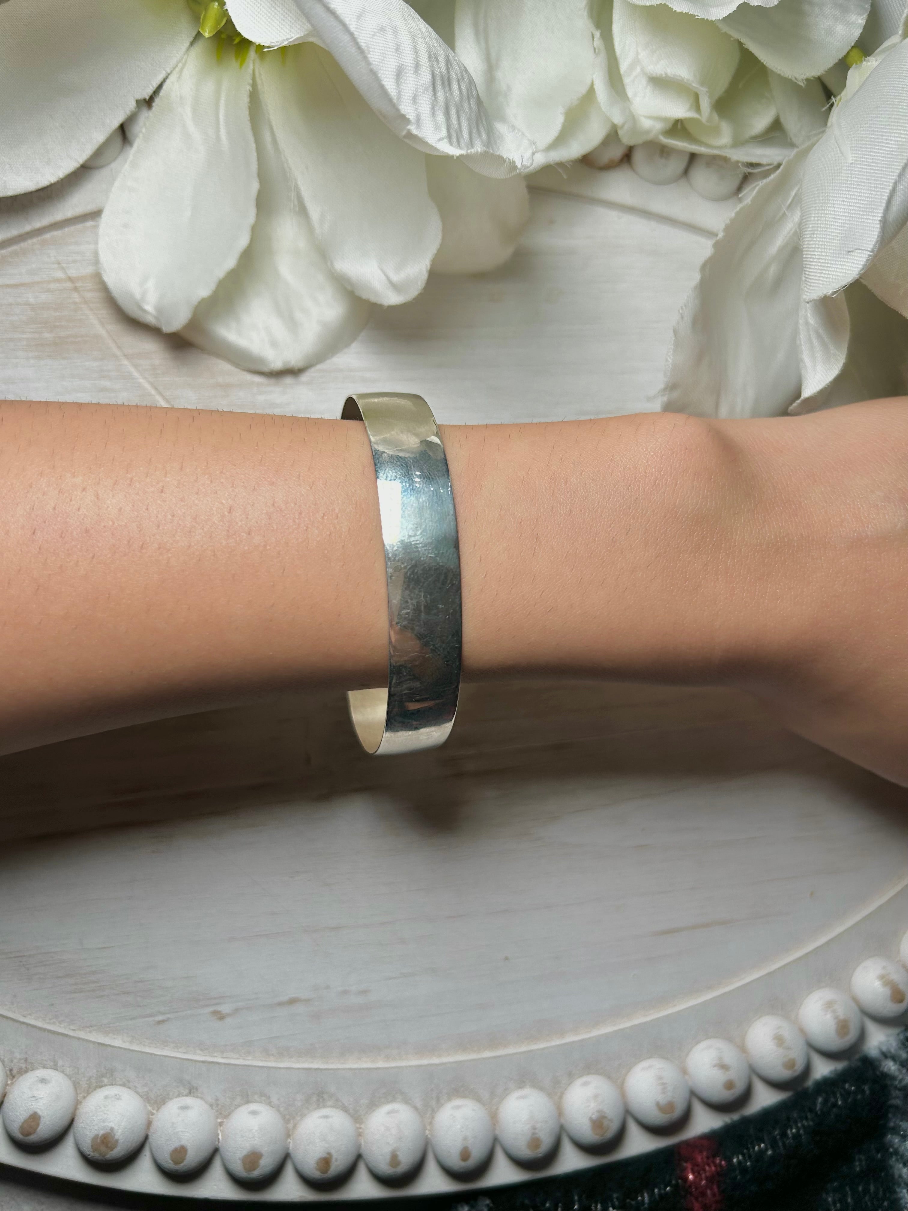 Navajo Sterling Silver Bangle Bracelet. It has an inside circumference of 8 1/4 inches and it measures 1/2 of an inch wide. Signed by artist and stamped sterling silver.