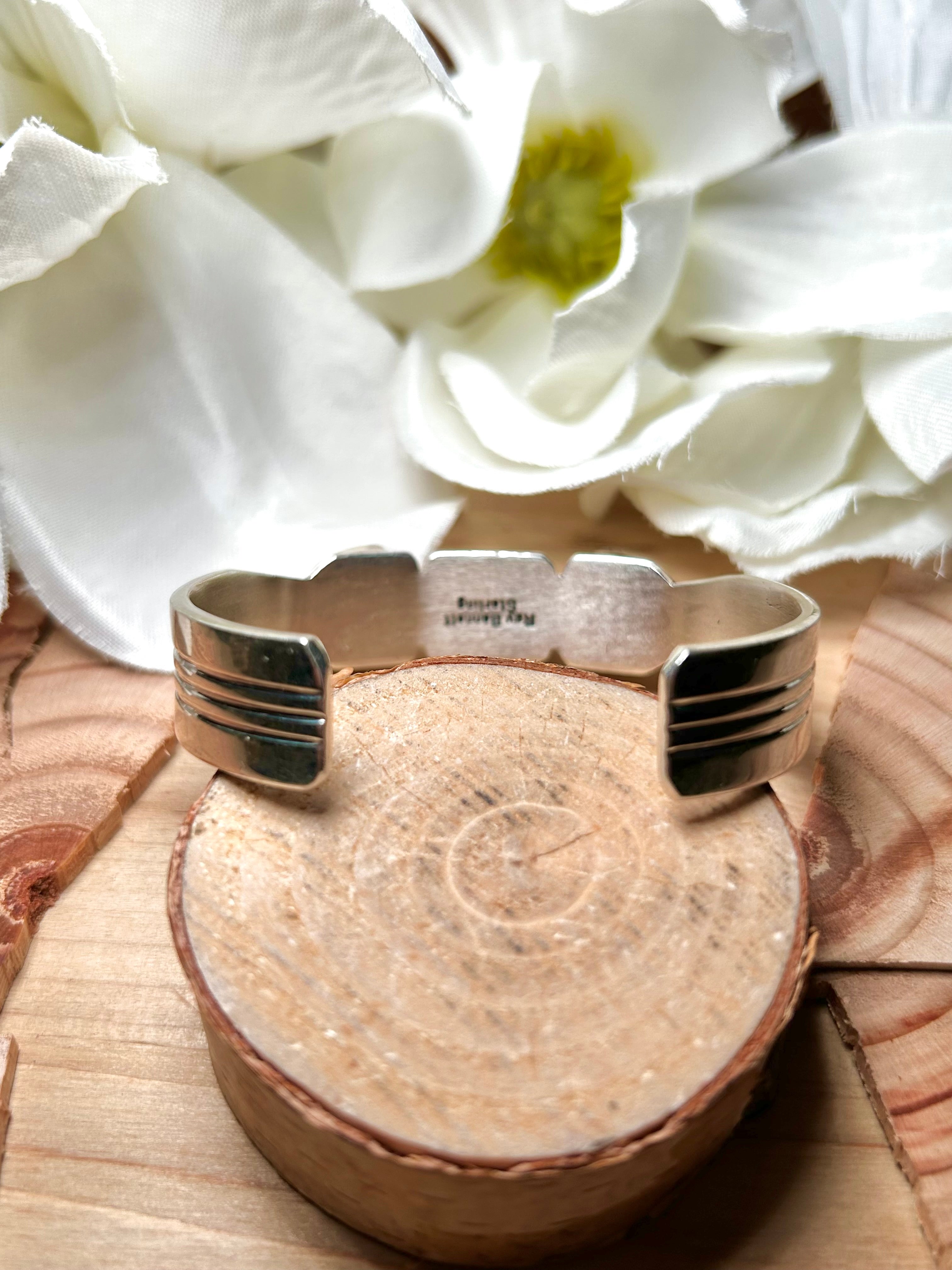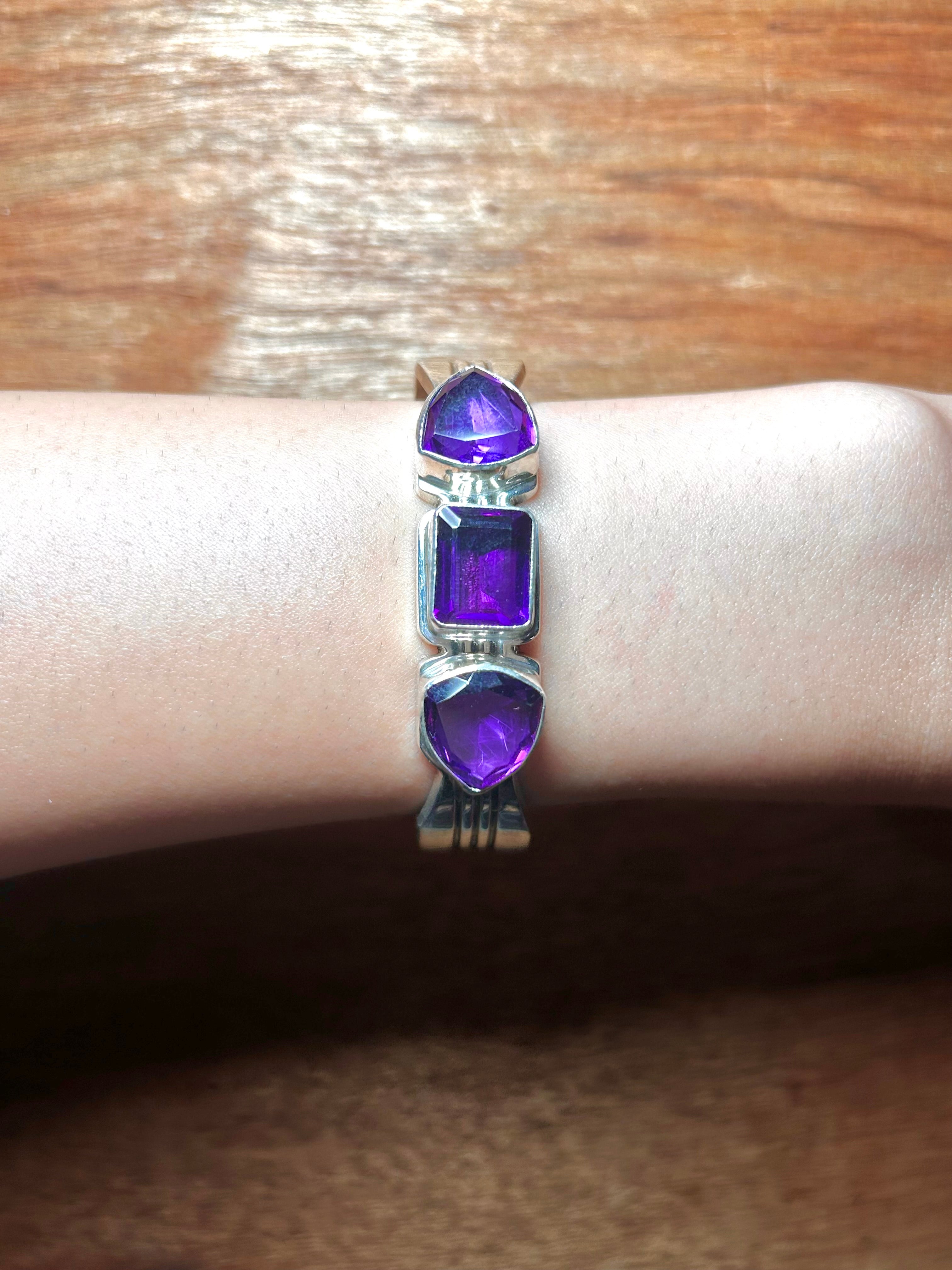 Ray Bennett Amythst & Sterling Silver Cuff Bracelet. It measures 1/2 of an inch wide with an inside circumference of 5 inches and a gap of 1 inch. Signed by the artist and stamped sterling silver.