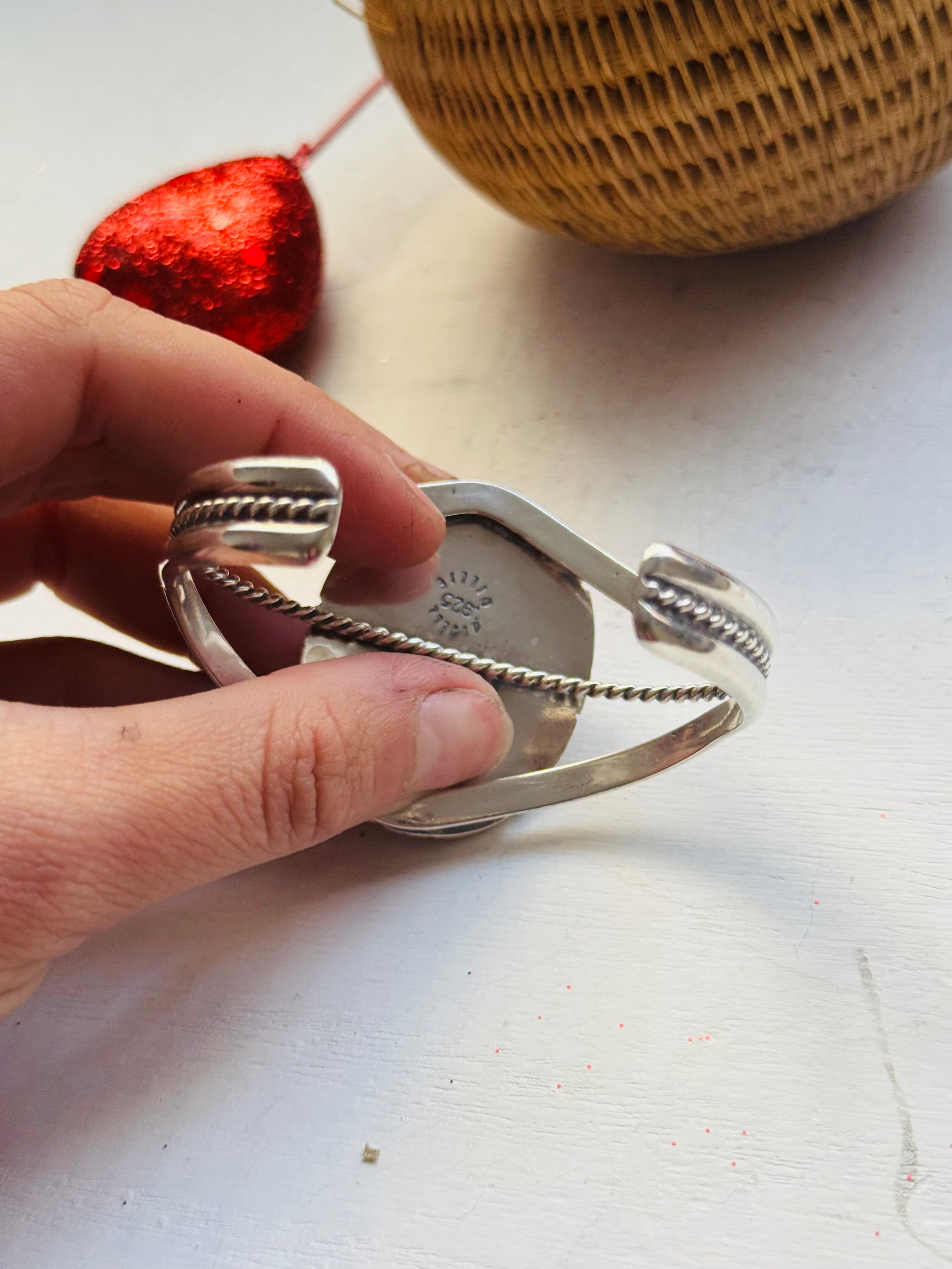 Wydell Billie Pink Conch & Sterling Silver Cuff Bracelet. It measures 1 1/2 inches wide with an inside circumference of 5 3/8 inches and a gap of 1 1/4 inches. Signed by the artist and stamped sterling silver. Stones will differ due to natural stones.