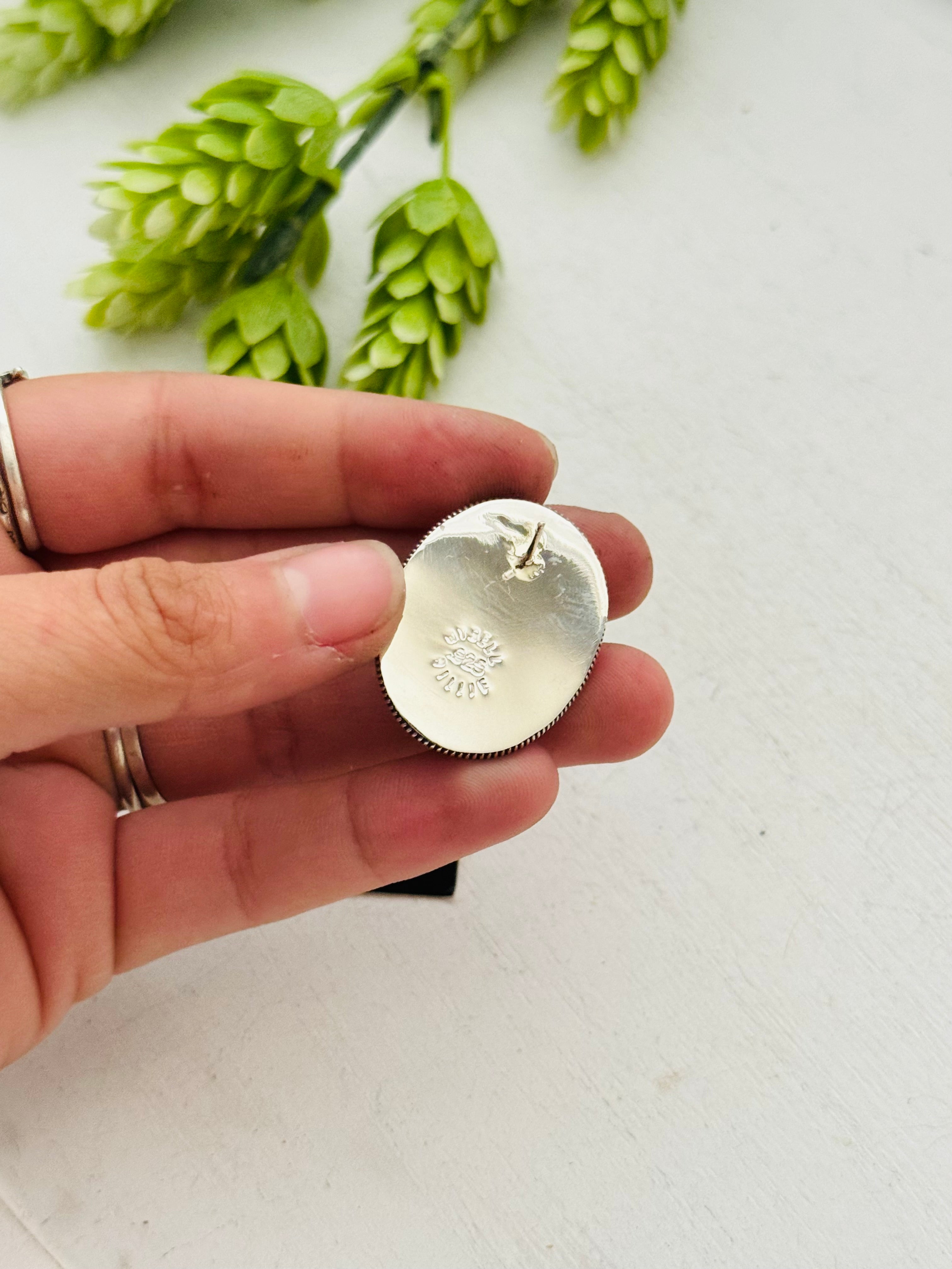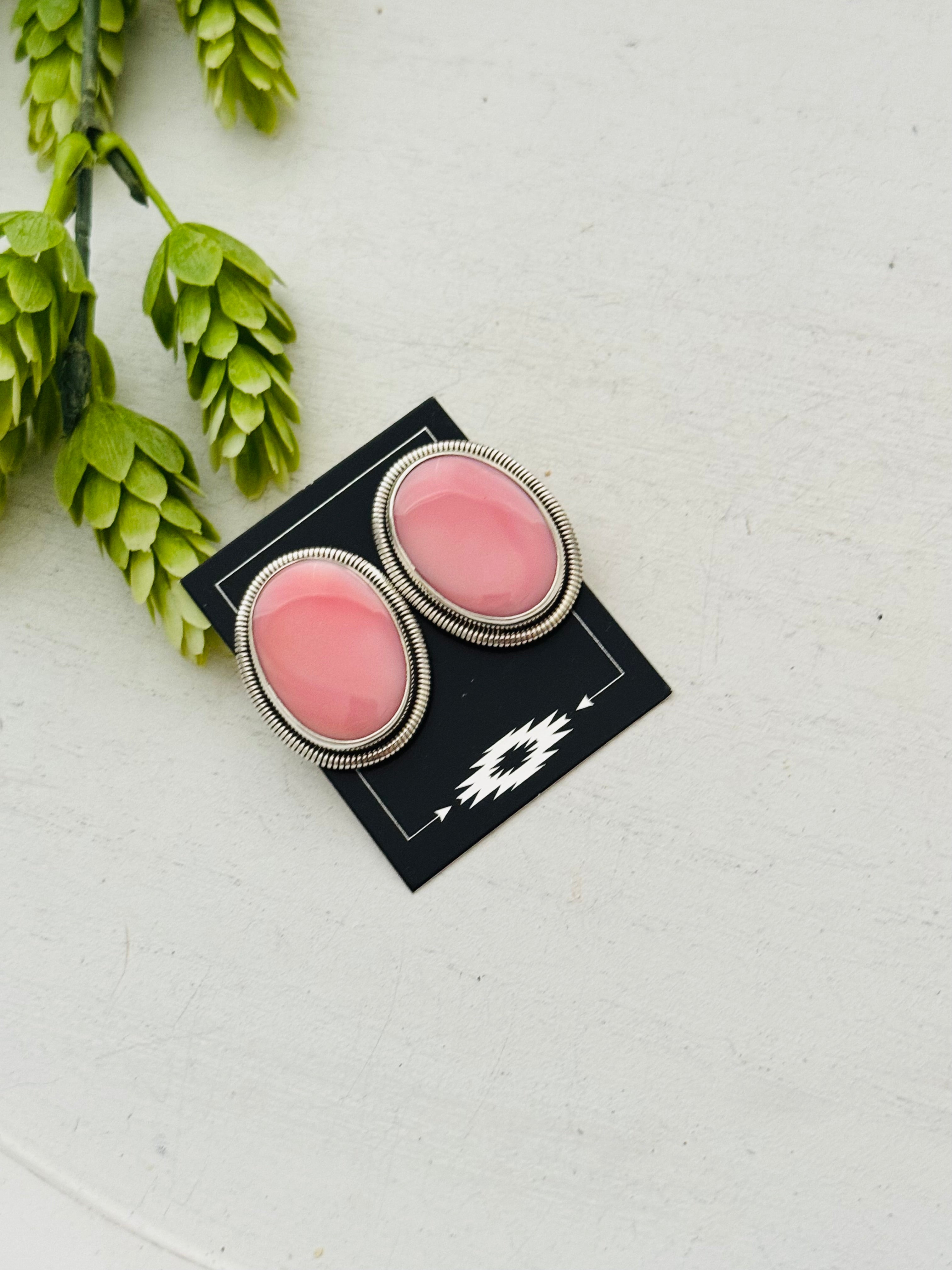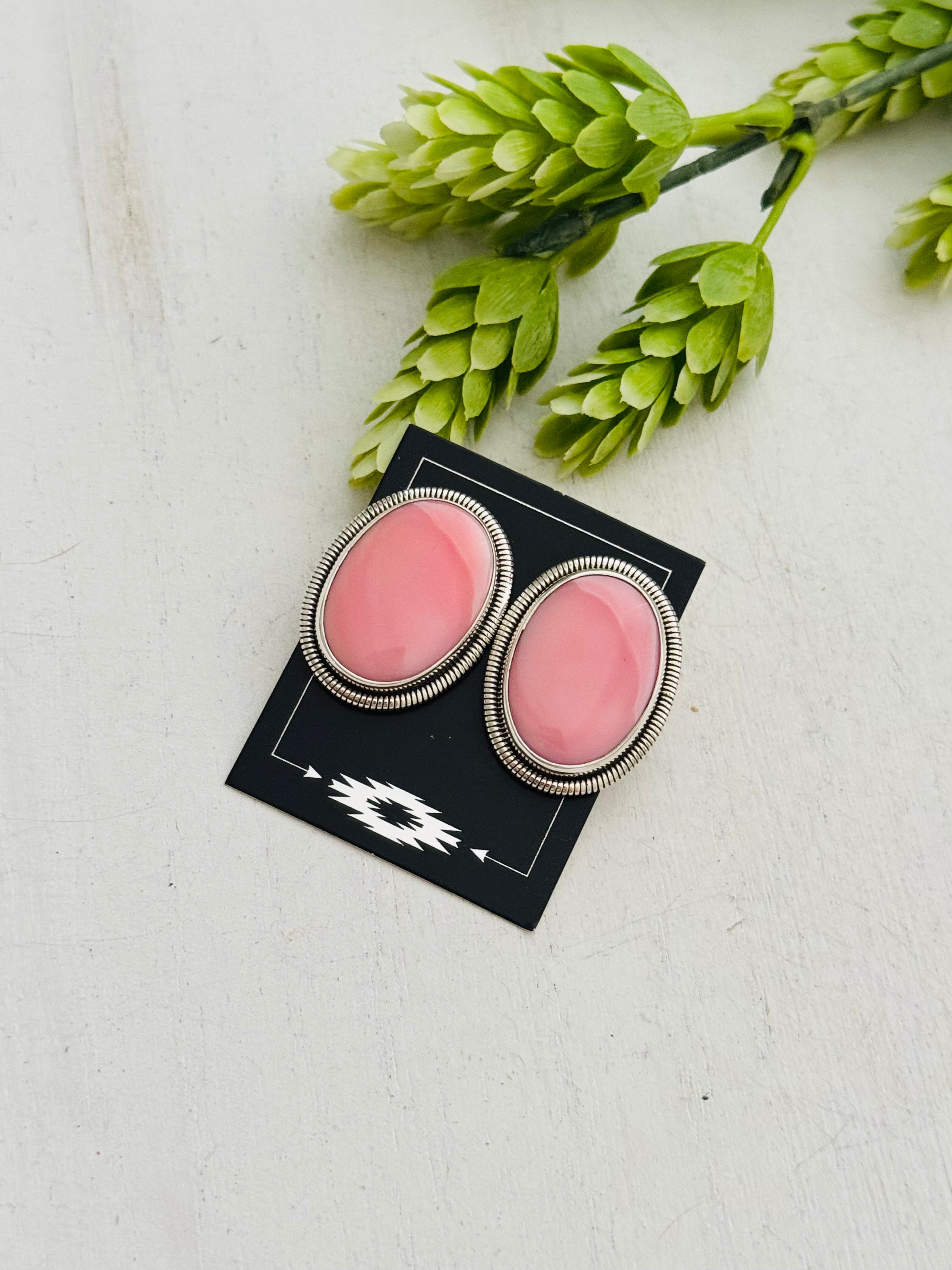 Beautiful Earrings. Wydell Billie Pink Conch & Sterling Silver Post Earrings. It measures 1 1/4 inches long and just over 7/8 of an inch wide. Stamped sterling silver and signed. Stones may differ due to natural stones.