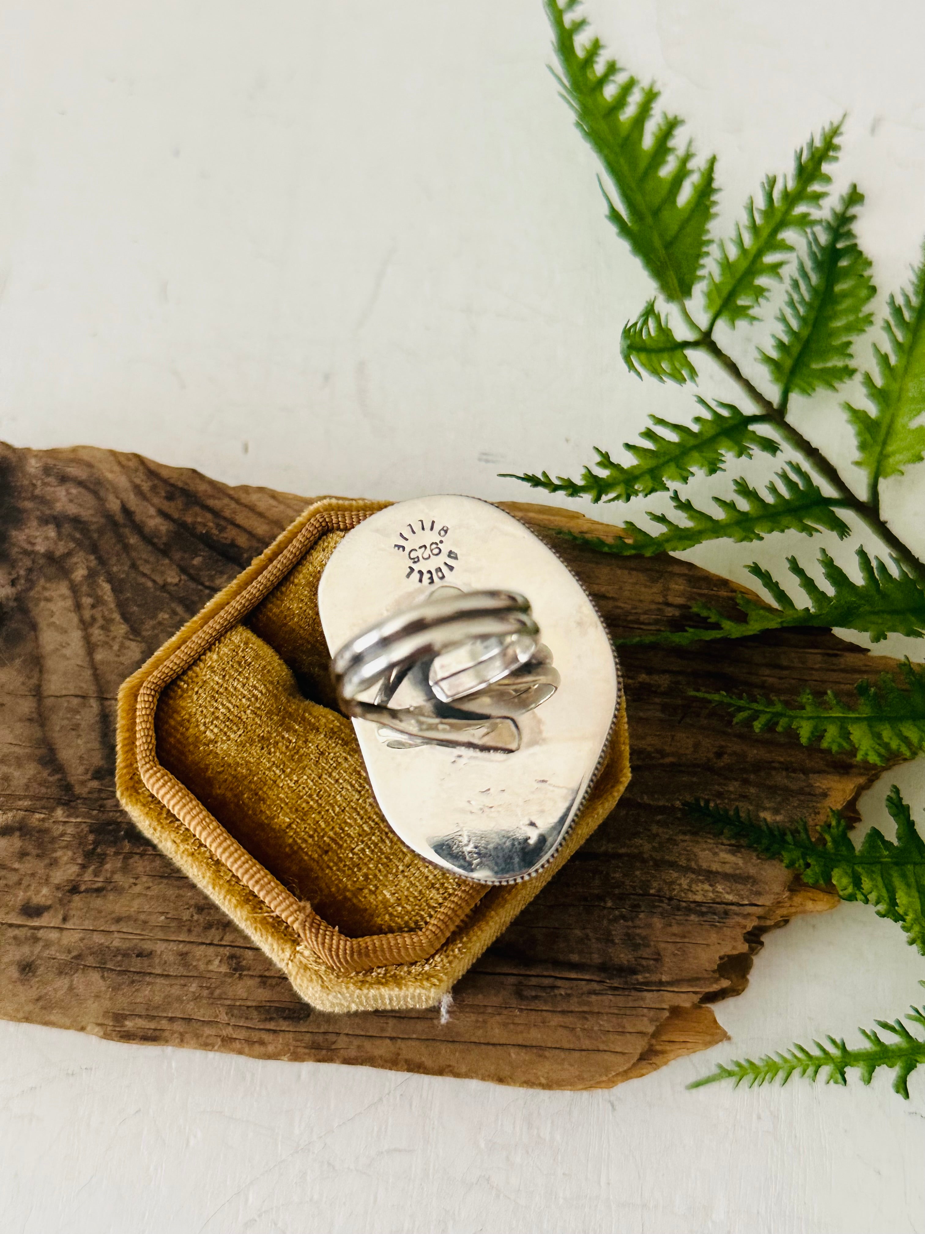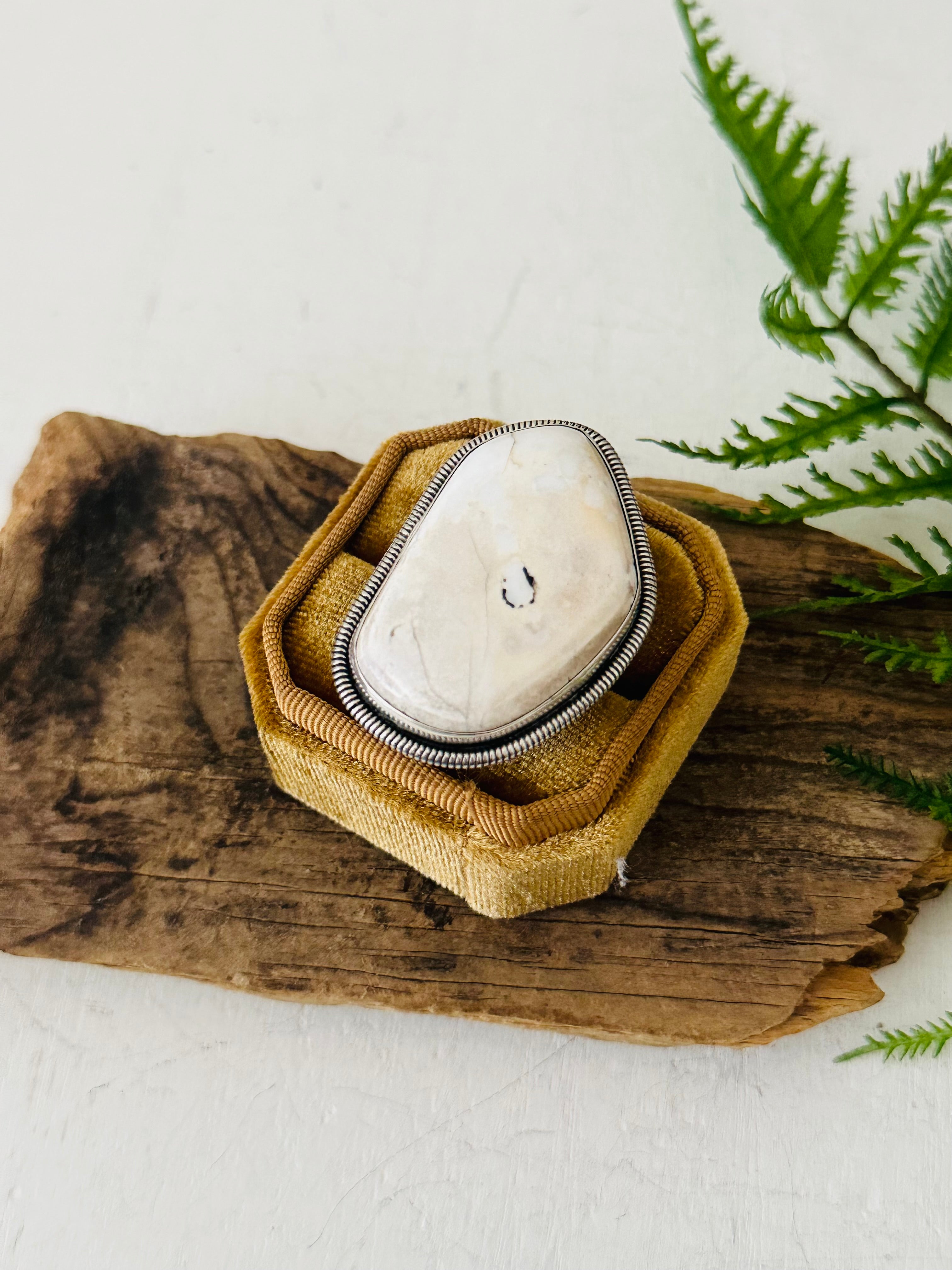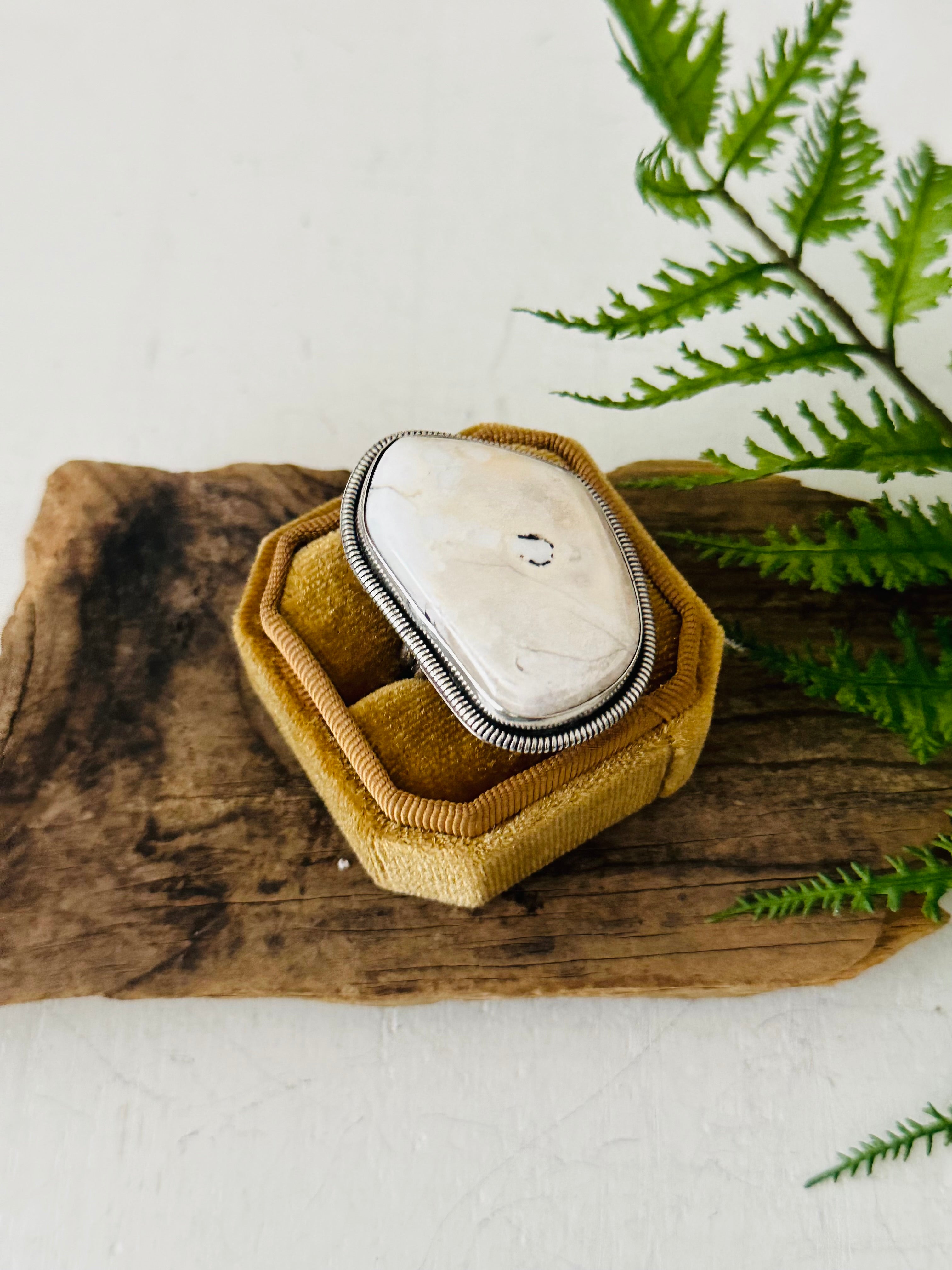 Beautiful ring. Wydell Billie White Buffalo & Sterling Silver Adjustable Ring. It measures 1 3/4 inches long and 1 1/8 inches wide. Signed by the artist and stamped sterling silver.