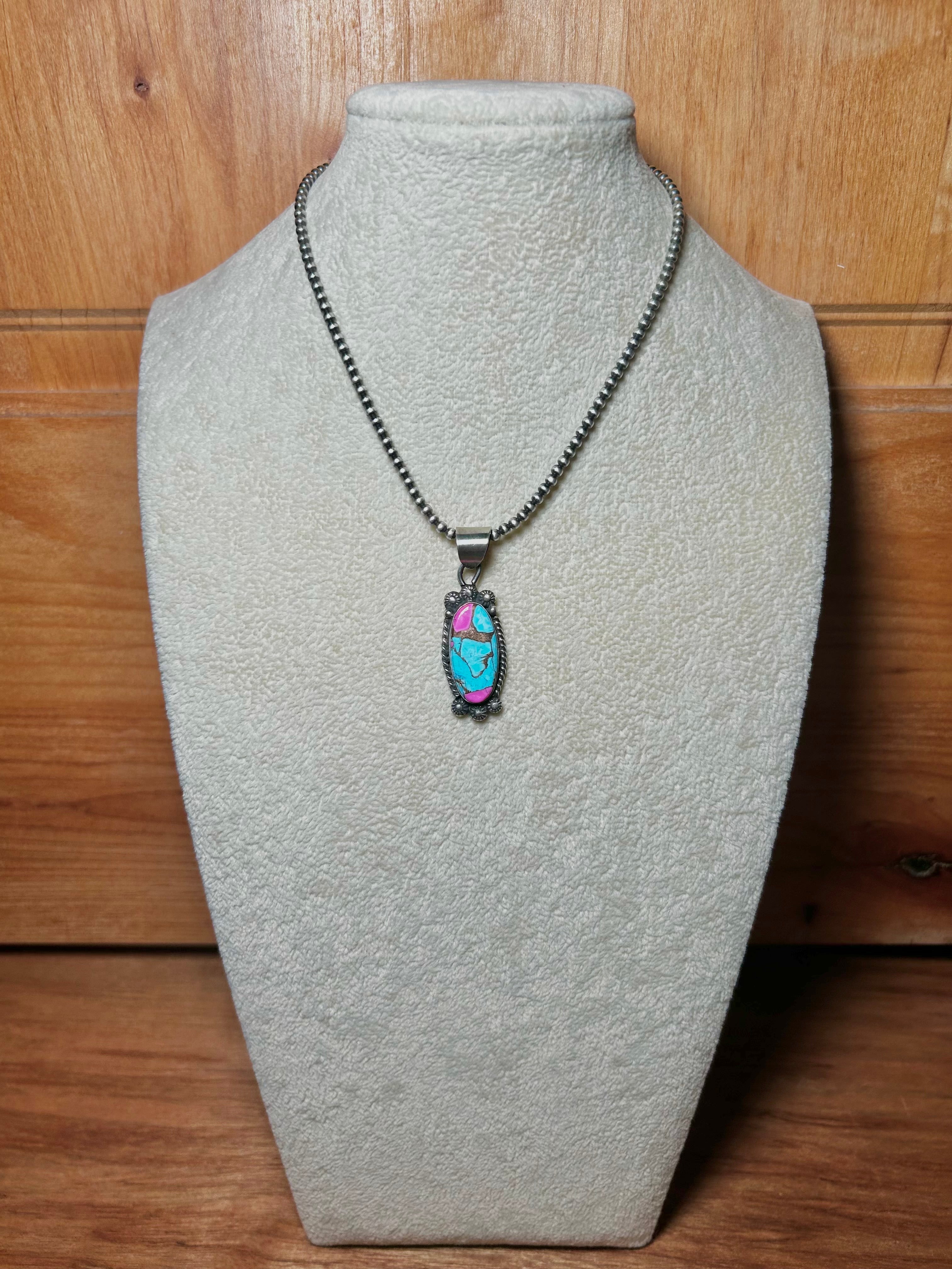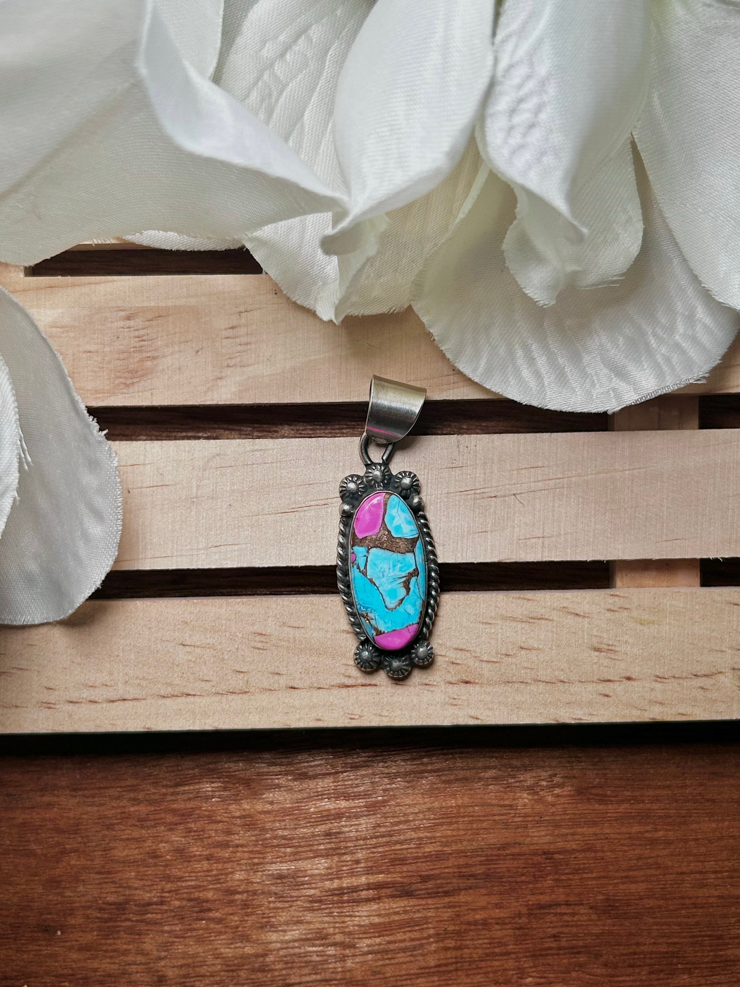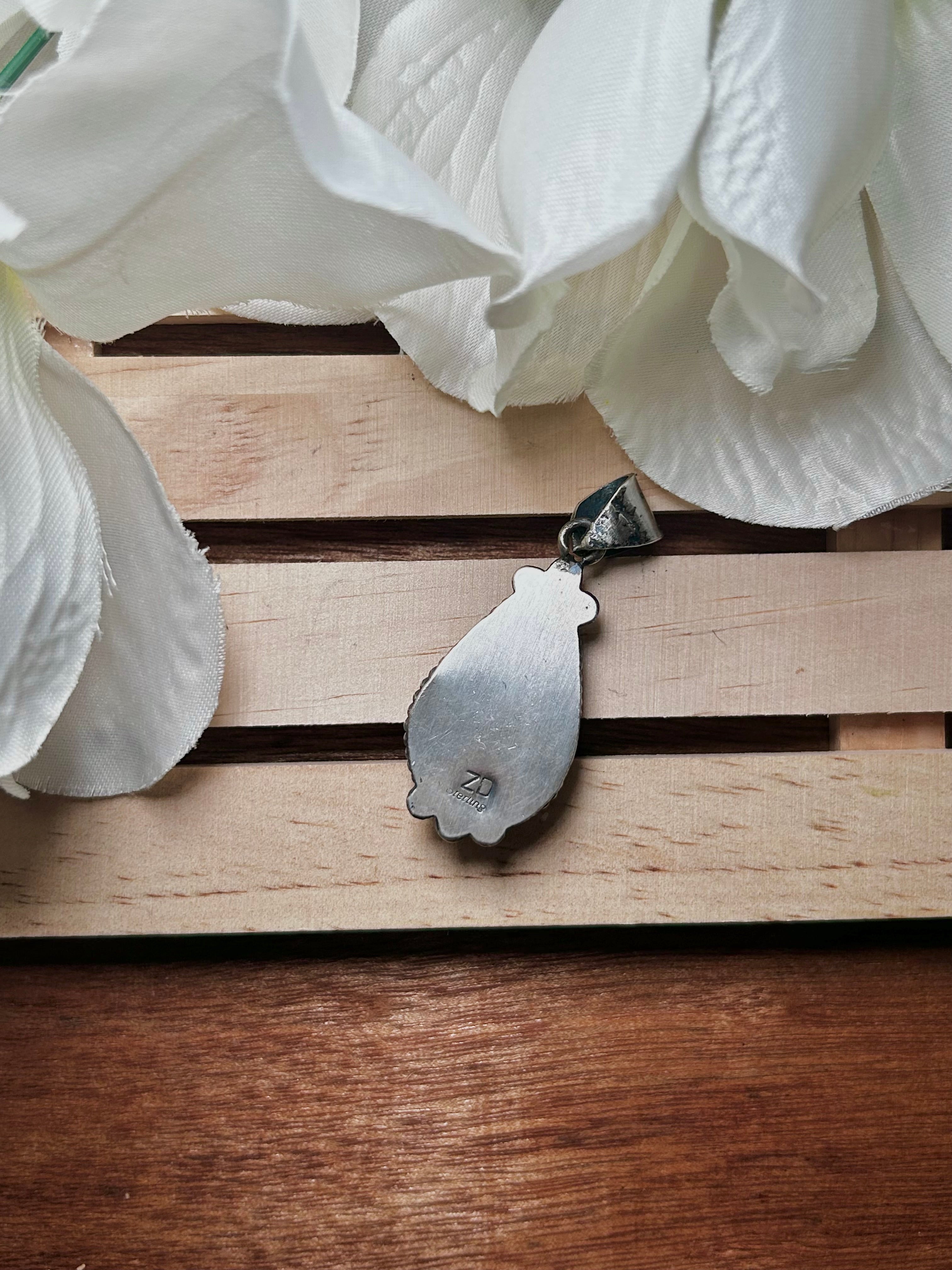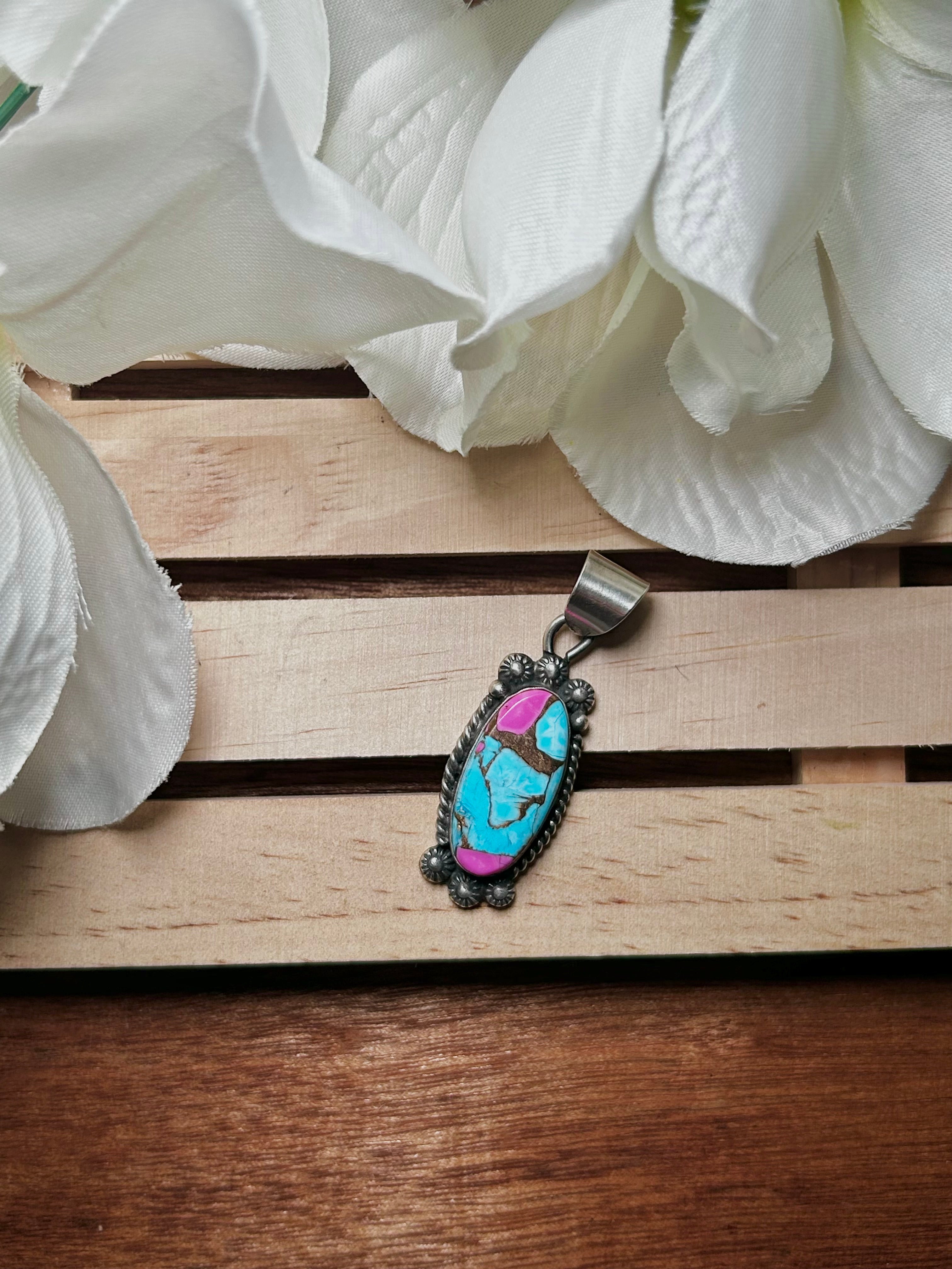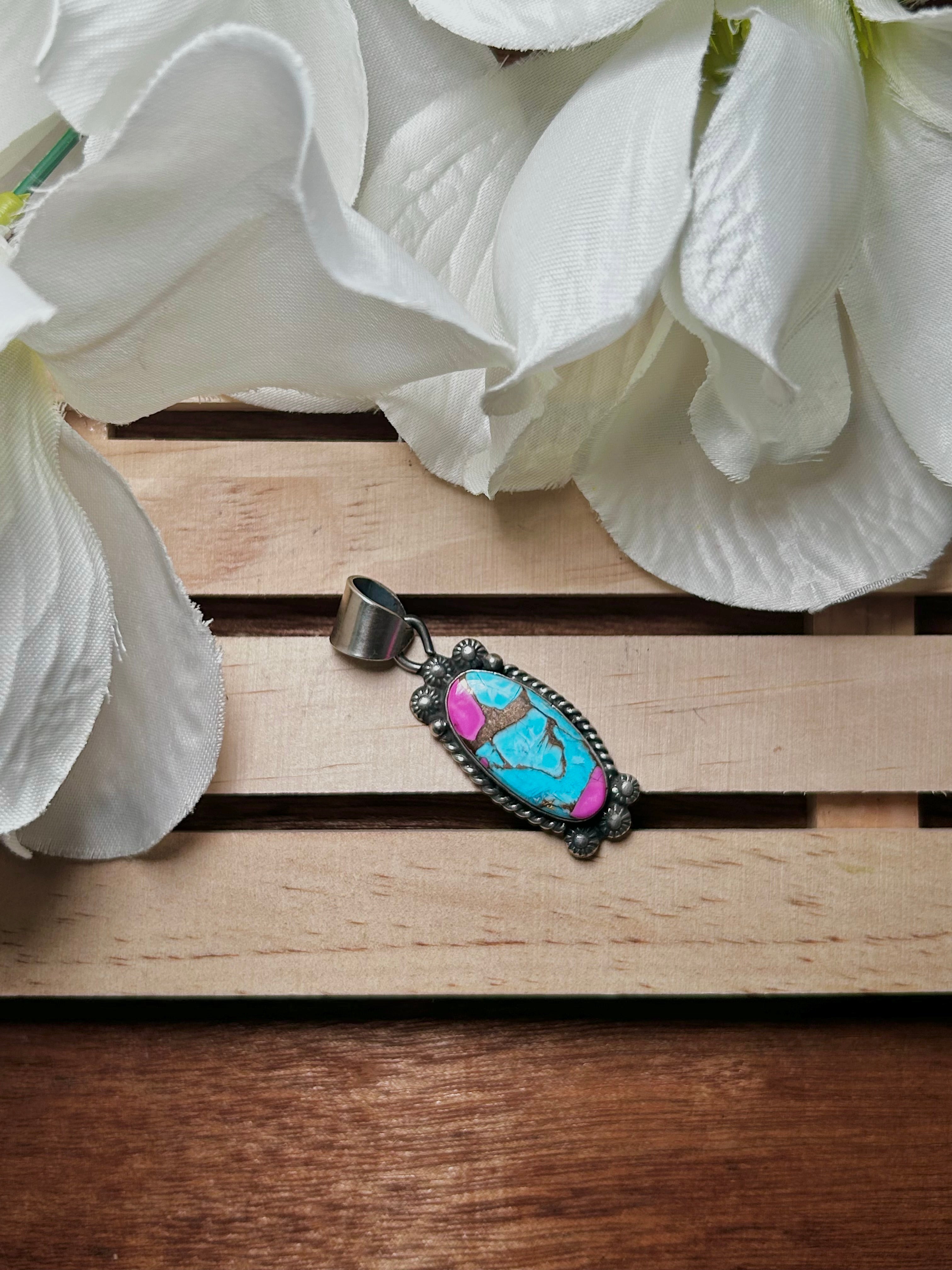 Zachariah David Cotton Candy Dahlia & Sterling Silver Pendant. It measures 2 inches long and 5/8 of an inch wide. Pendant Only. Signed by the artist and stamped sterling silver.