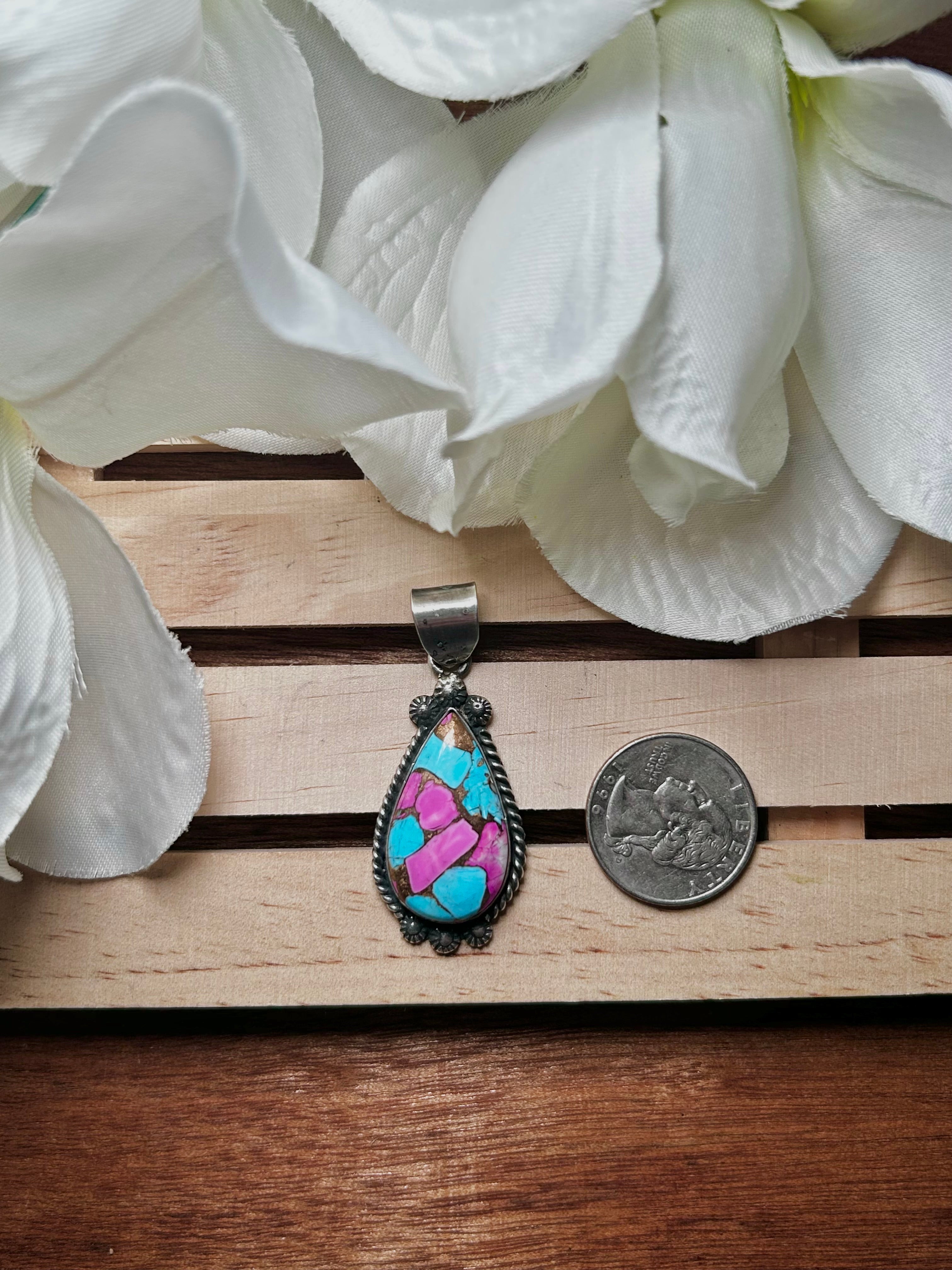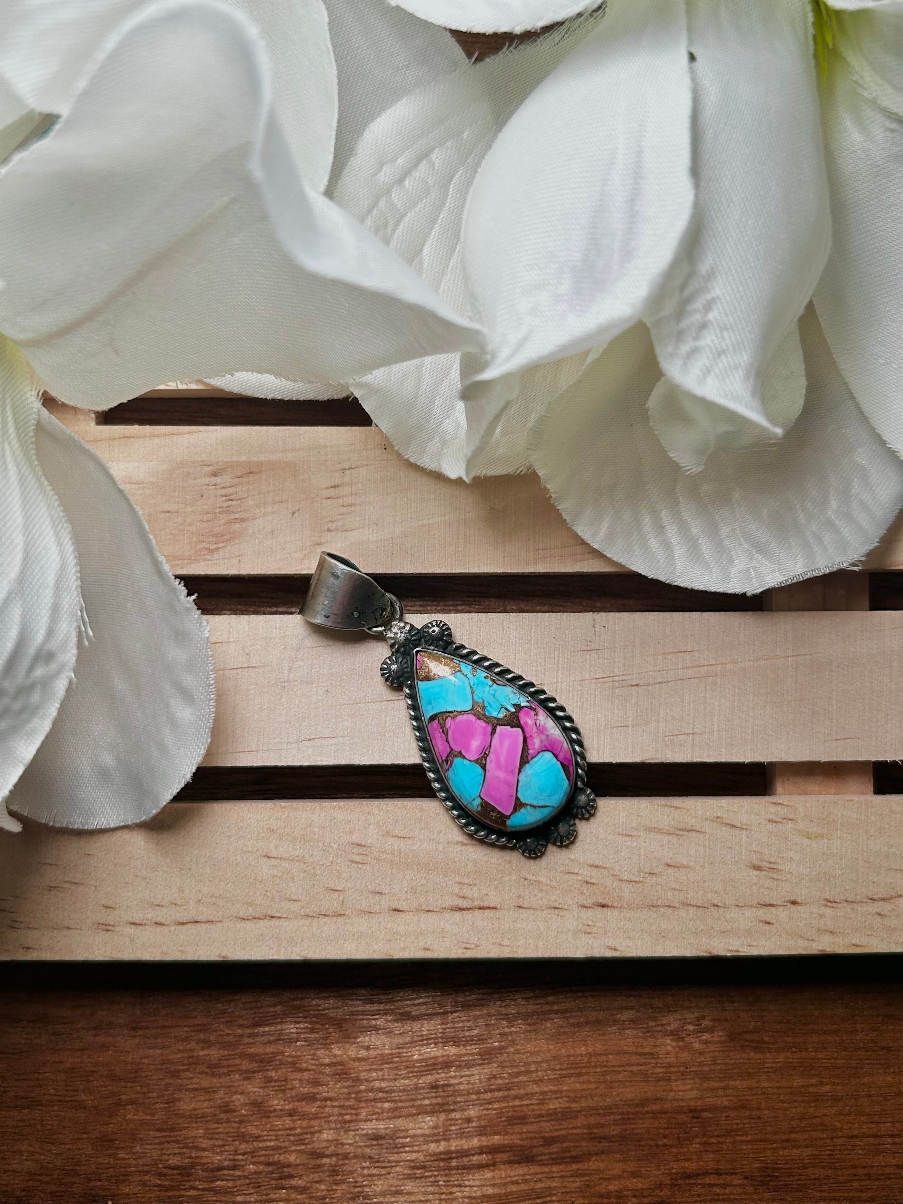 Zachariah David Cotton Candy Dahlia & Sterling Silver Pendant. It measures 2 inches long and 7/8 of an inch wide. Pendant Only. Signed by the artist and stamped sterling silver.