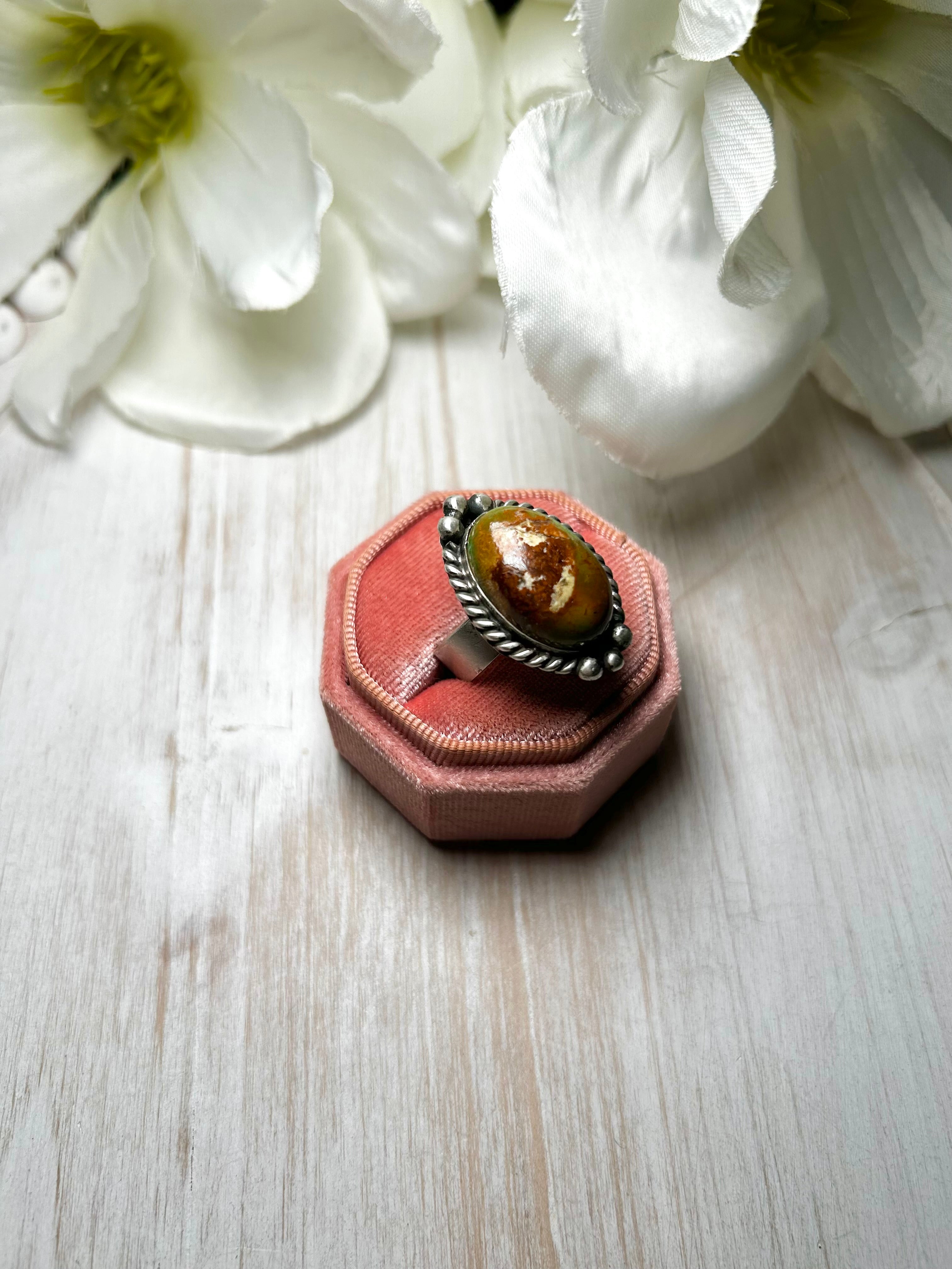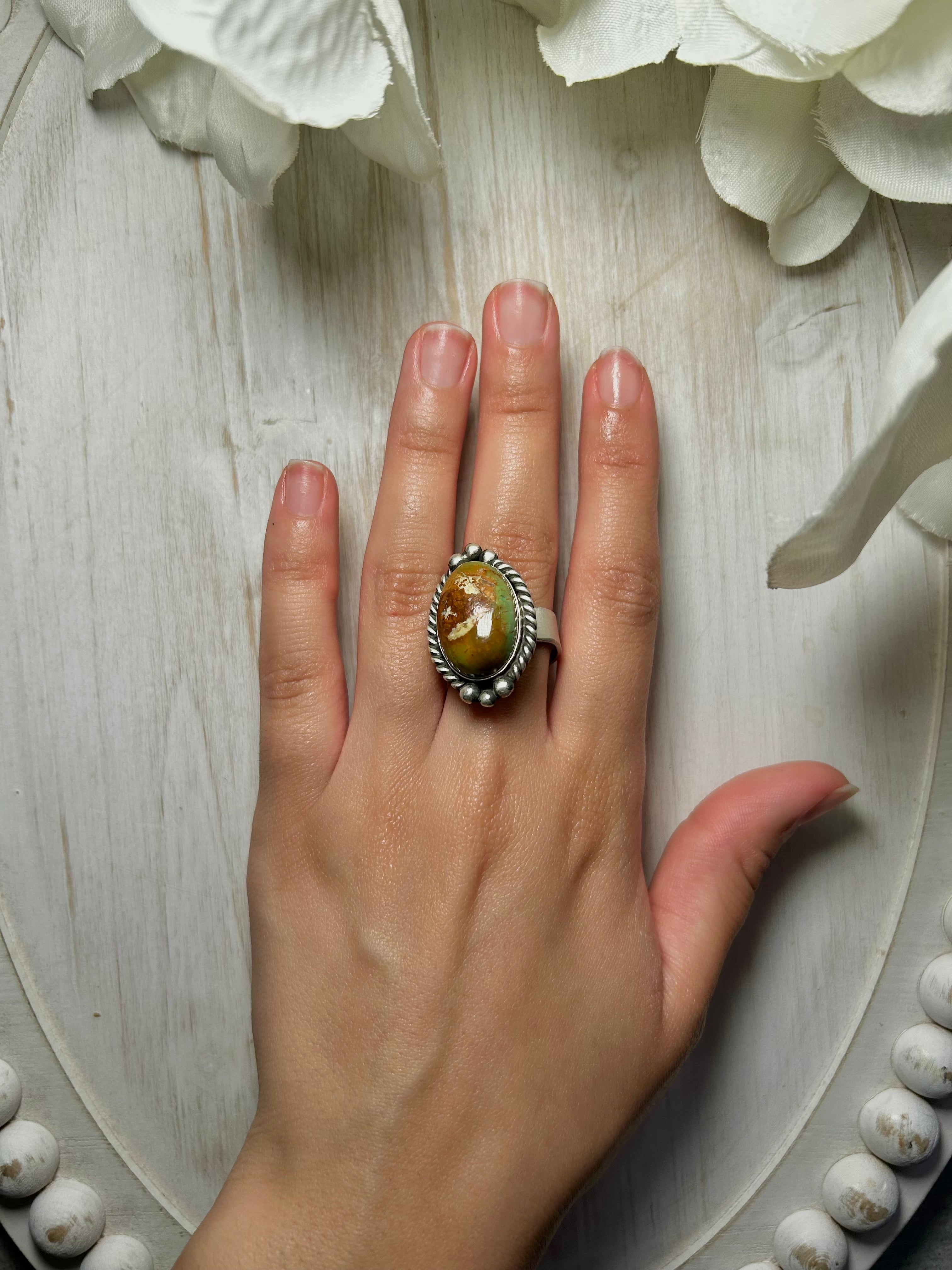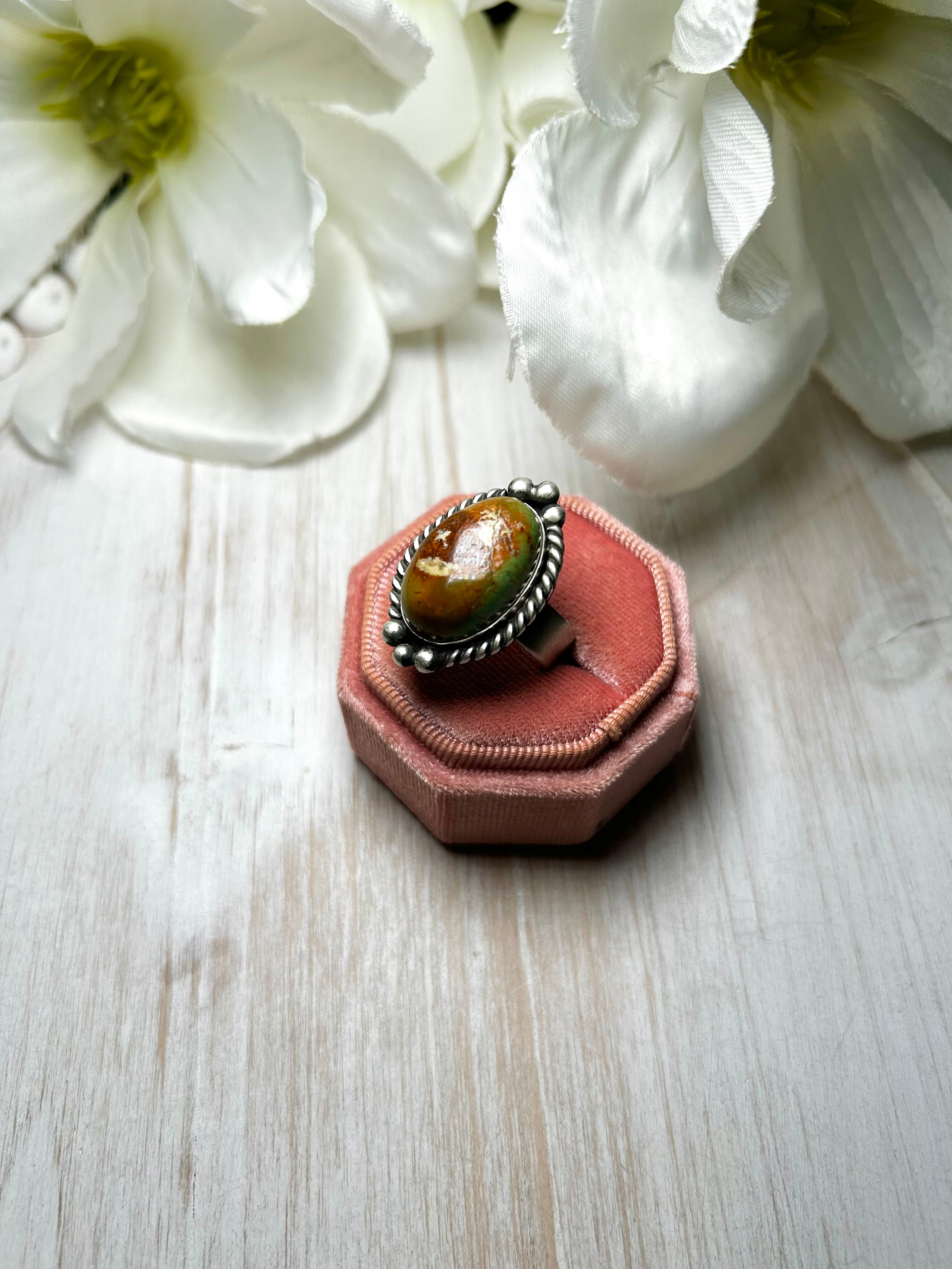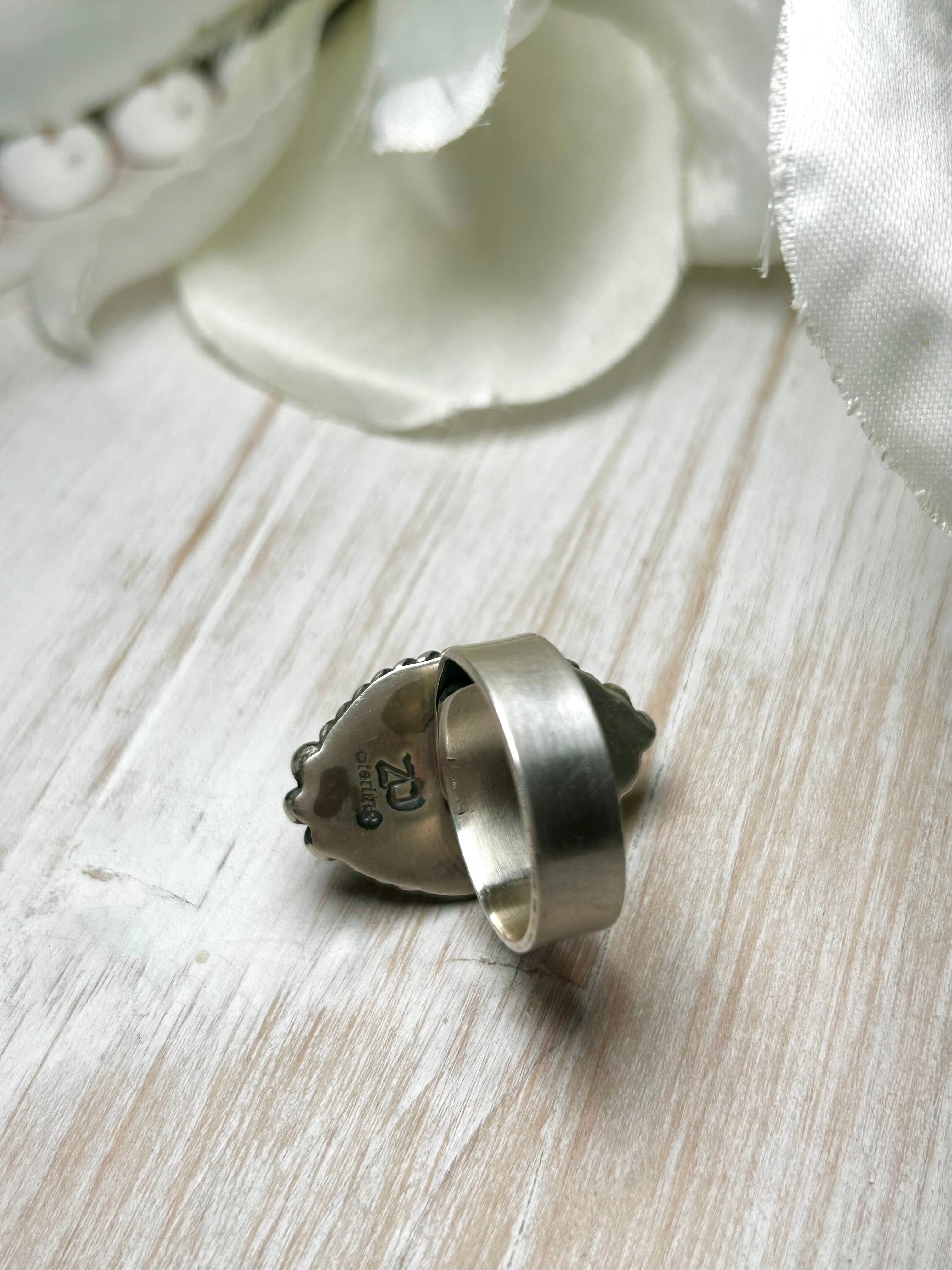 Zachariah David Evans Turquoise & Sterling Silver Adjustable Ring. It measures 1 1/4 inches long and 3/4 of an inch wide. Signed by the artist and stamped sterling silver.
