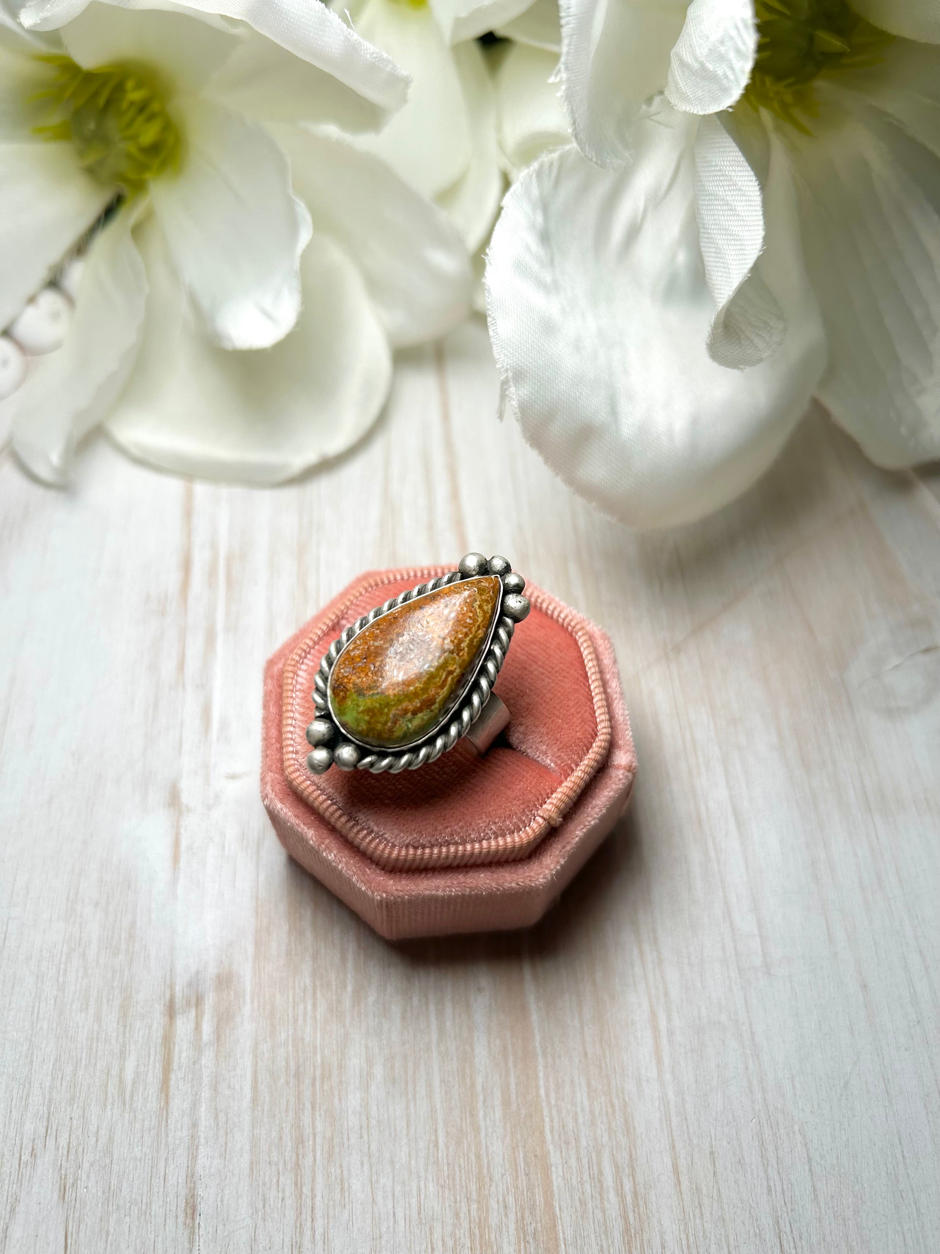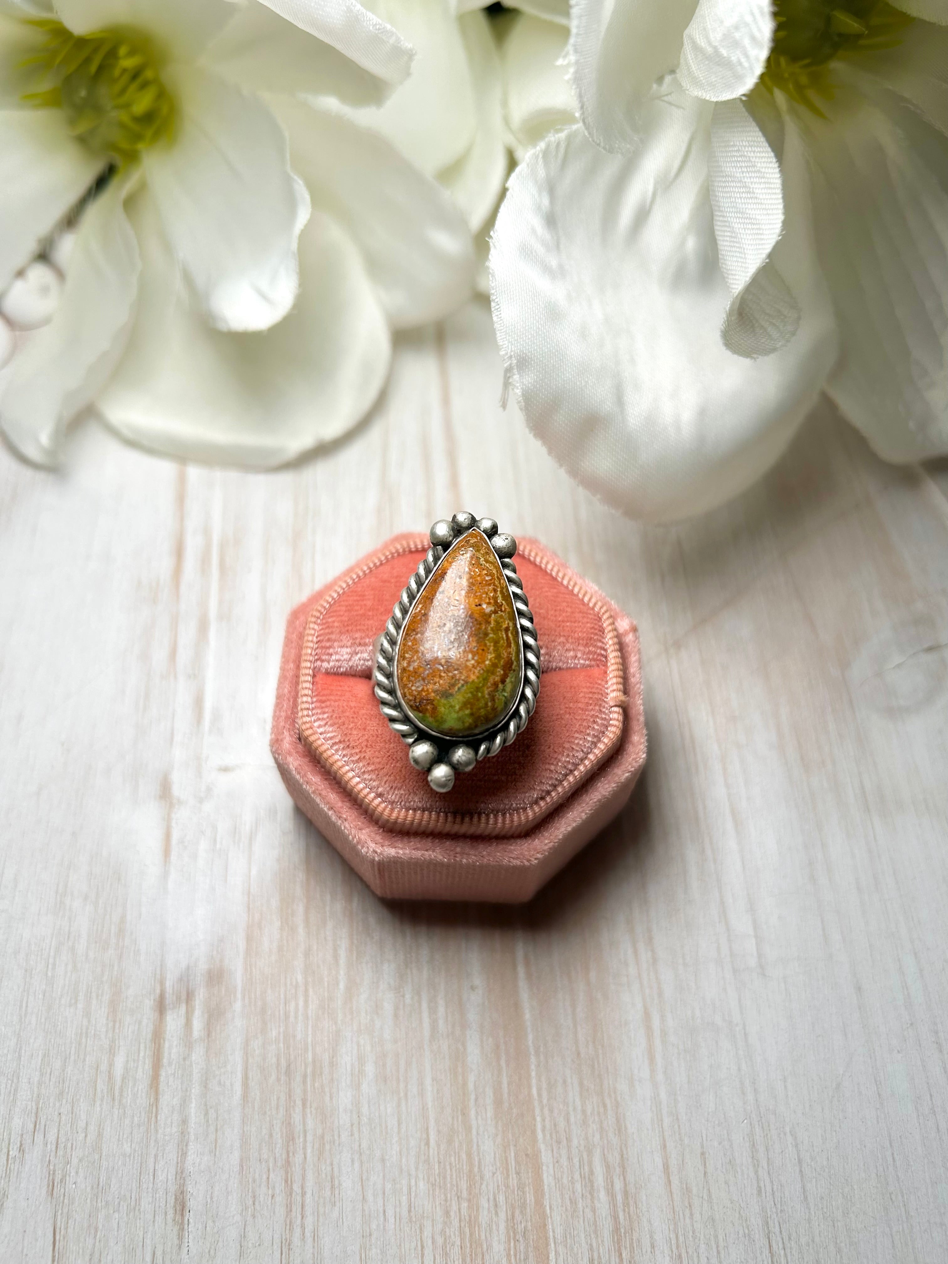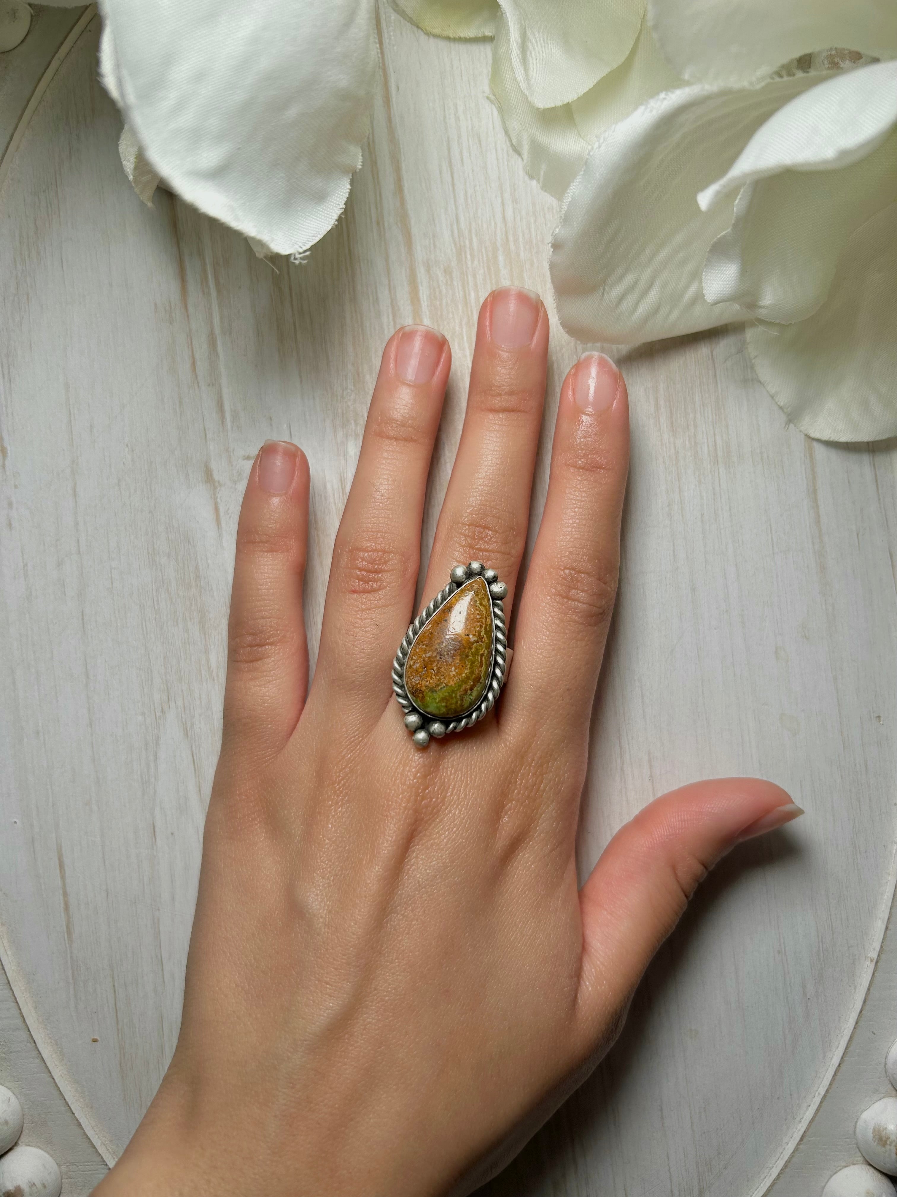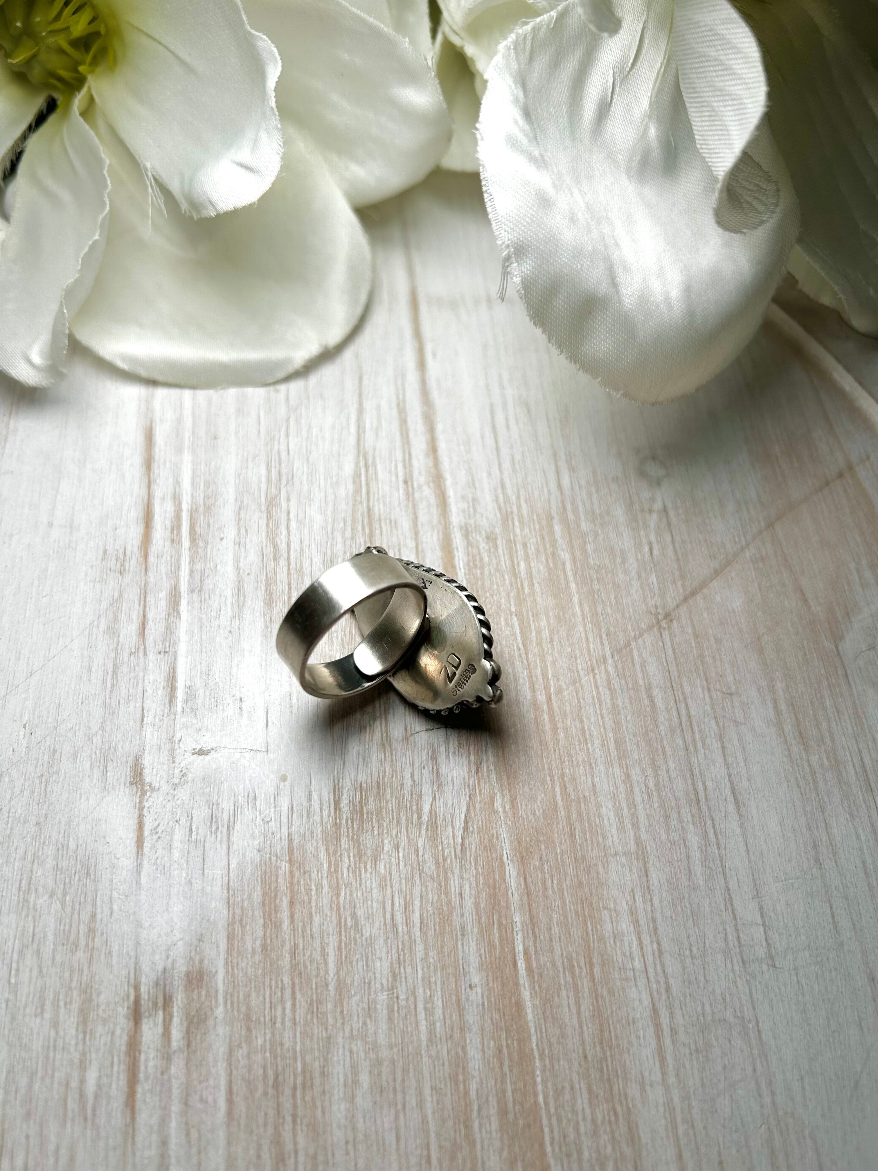 Zachariah David Evans Turquoise & Sterling Silver Adjustable Ring. It measures 1 3/8 inches long and 3/4 of an inch wide. Signed by the artist and stamped sterling silver.