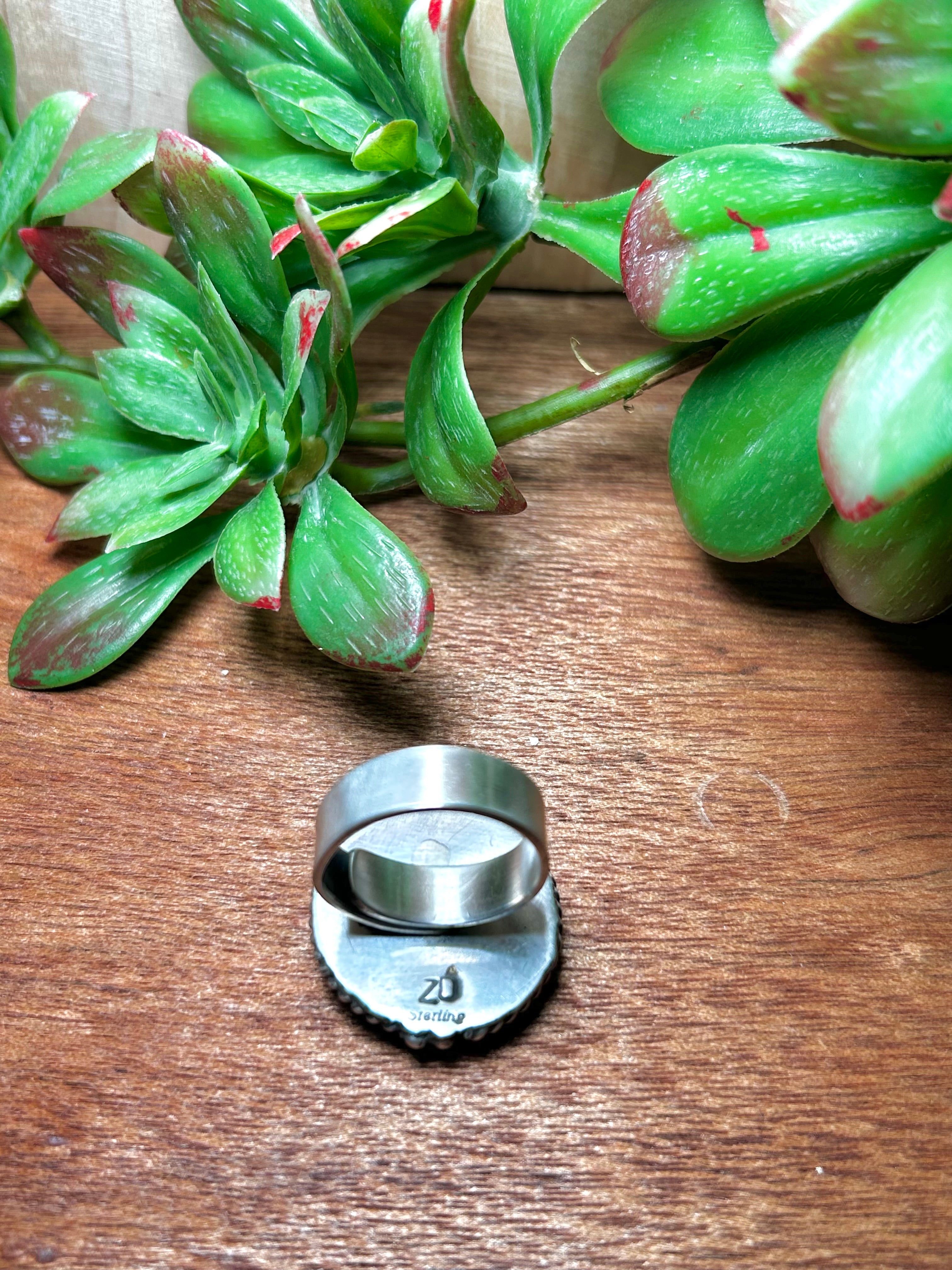 Zachariah David Honey Dahlia & Sterling Silver Adjustable Ring. It measures 1 1/8 inches long and 1 inch wide. Signed by artist and stamped sterling silver.