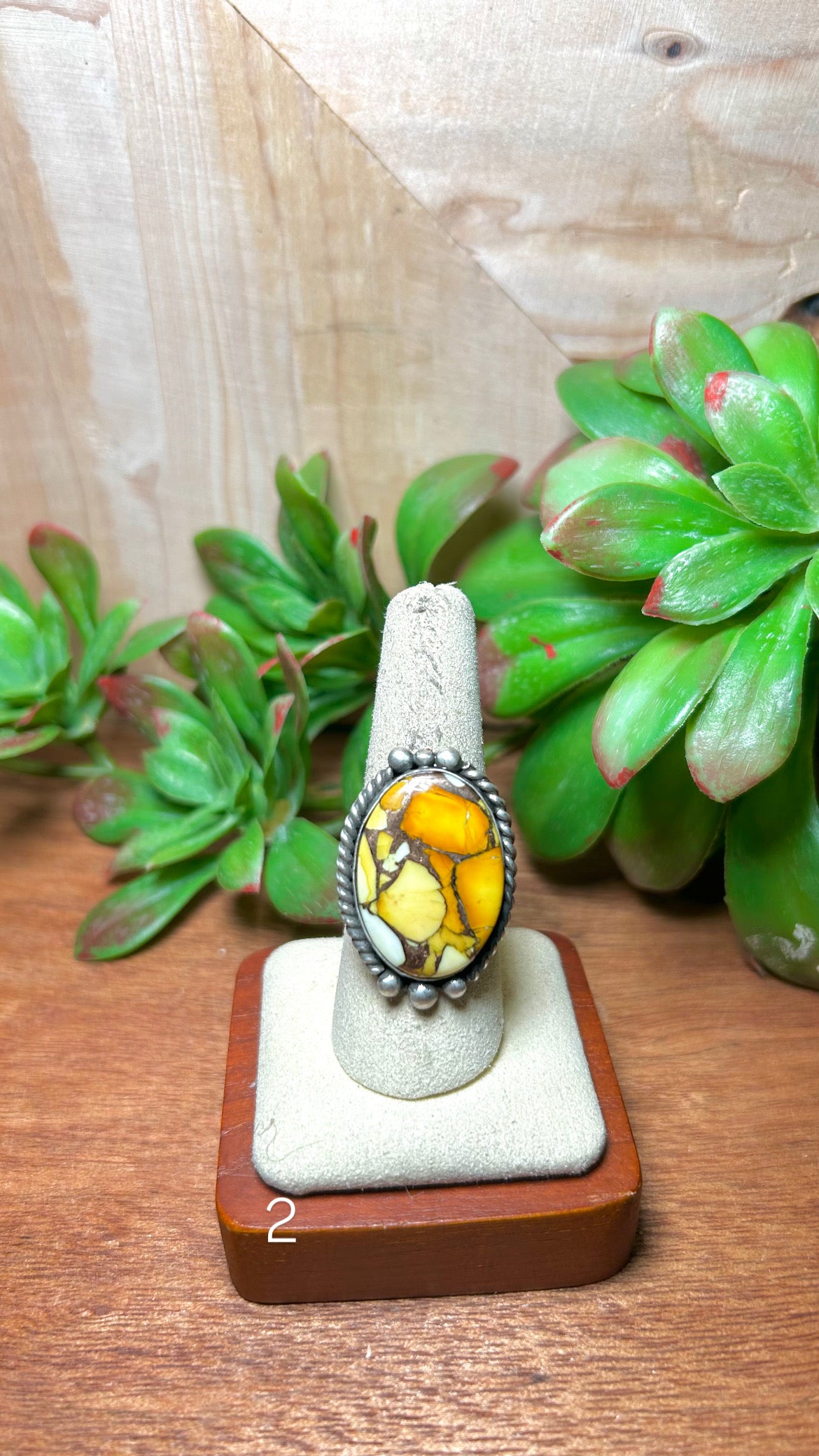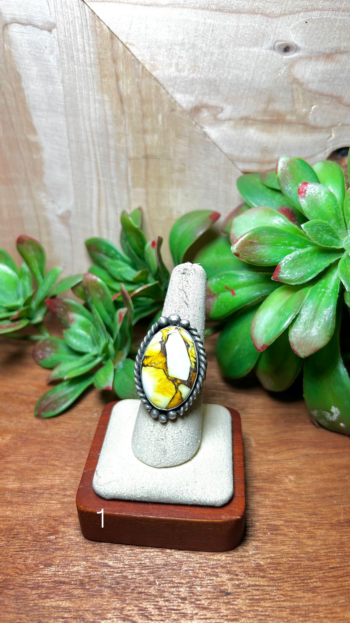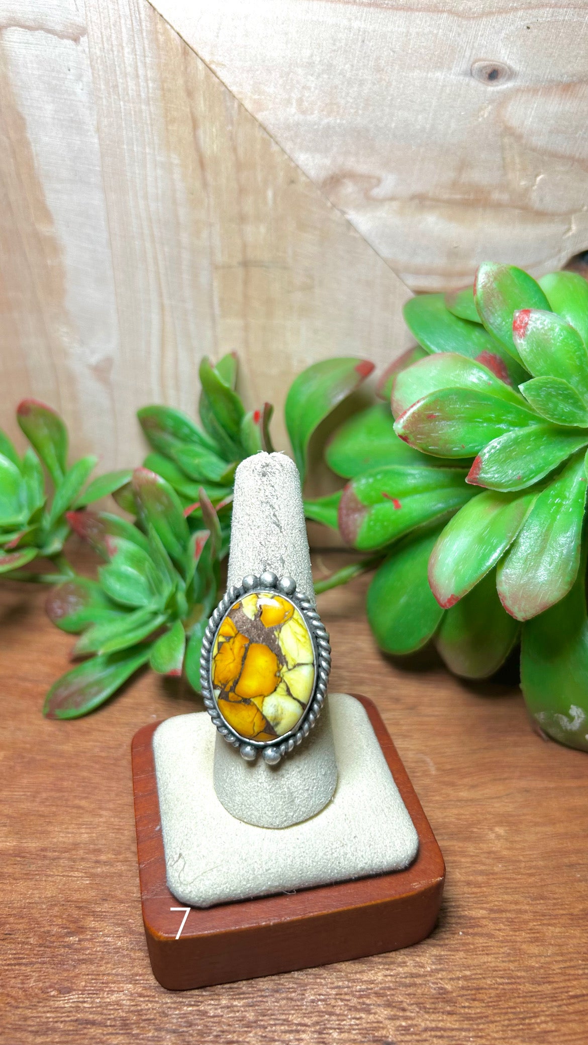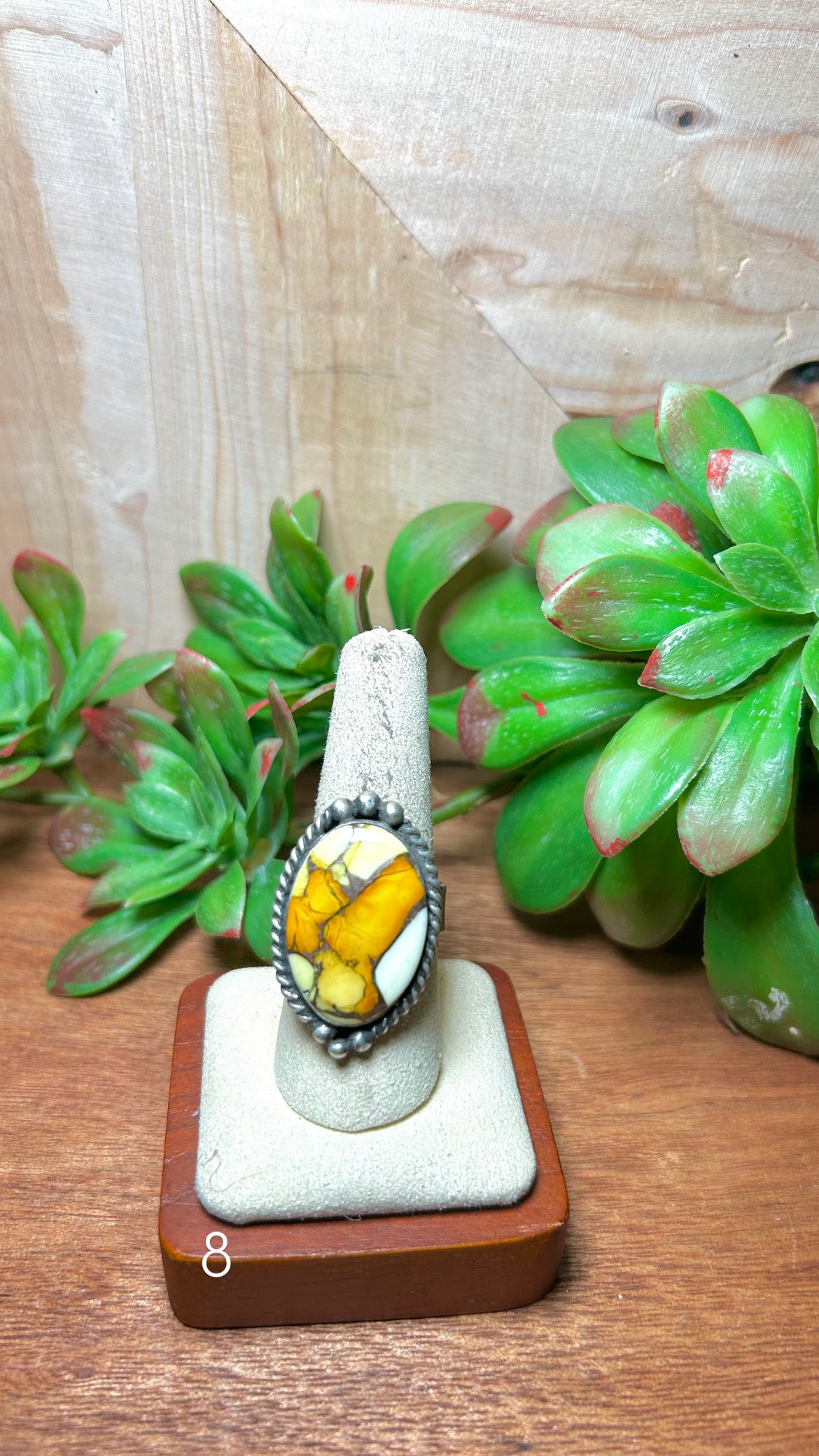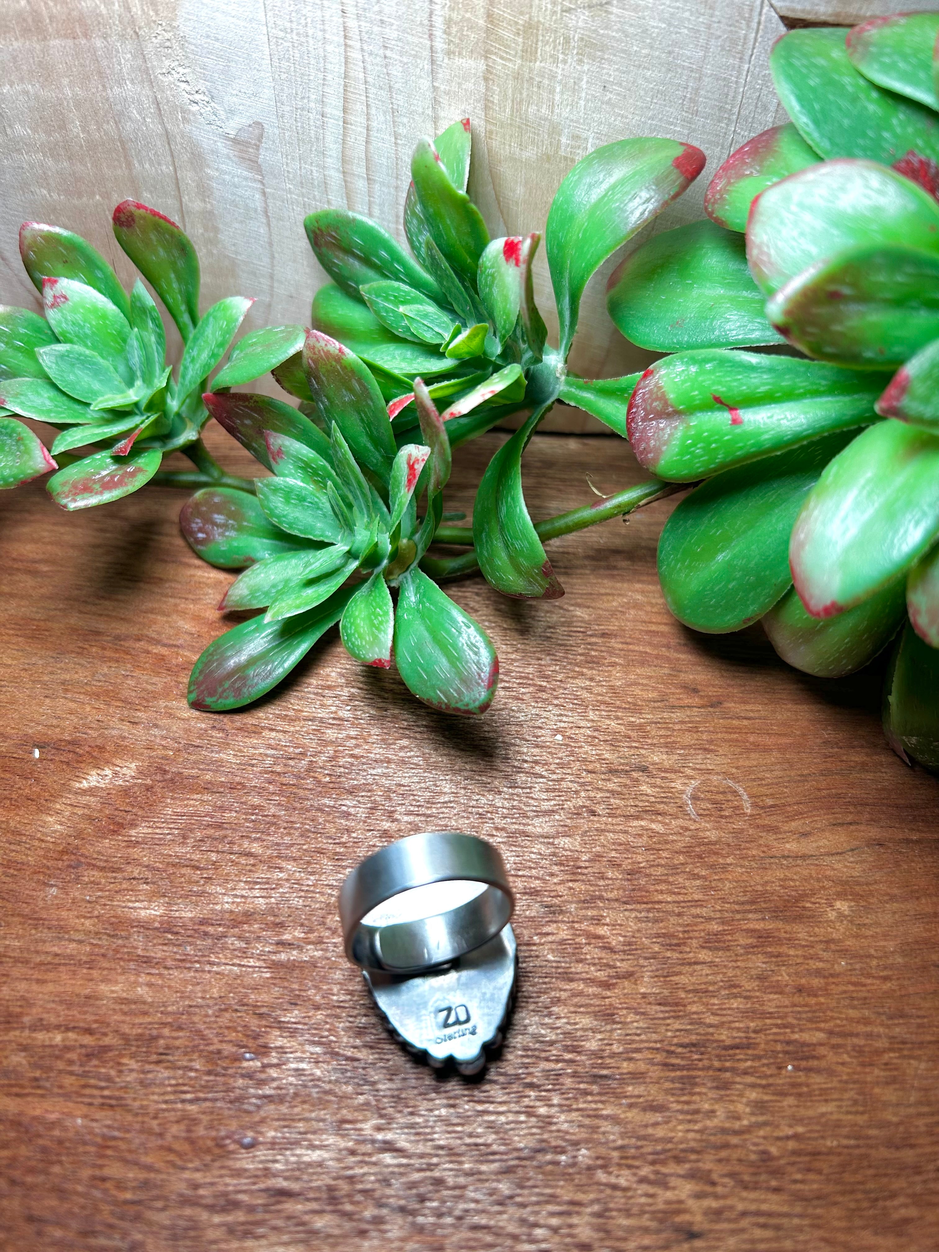 Zachariah David Honey Dahlia & Sterling Silver Adjustable Ring. It measures 1 1/4 inches long and 7/8 of an inch wide. Signed by artist and stamped sterling silver.