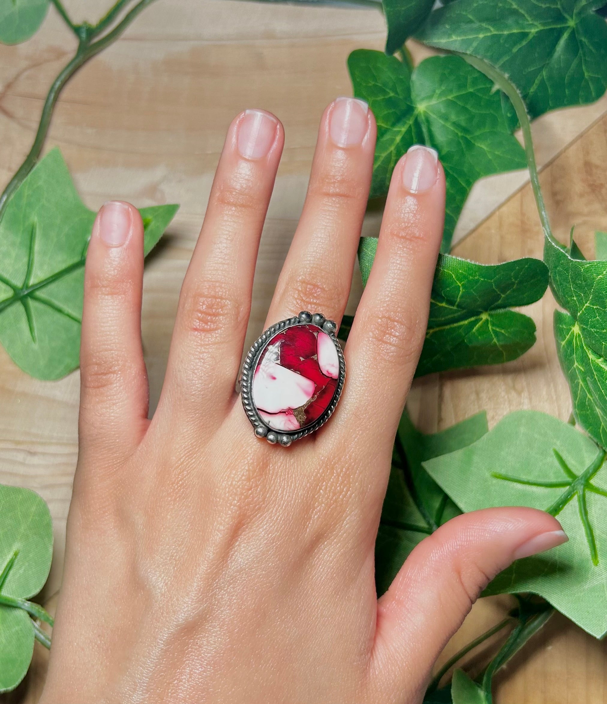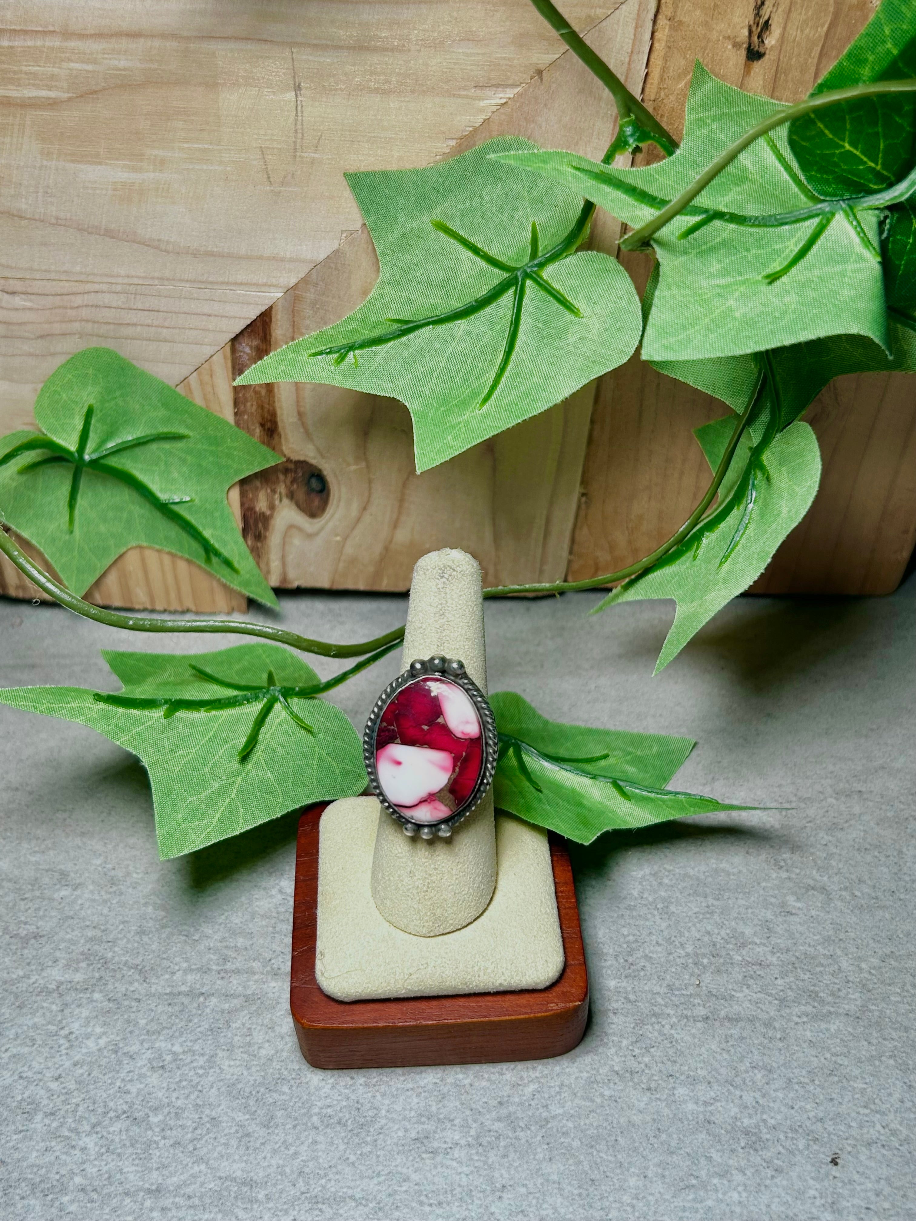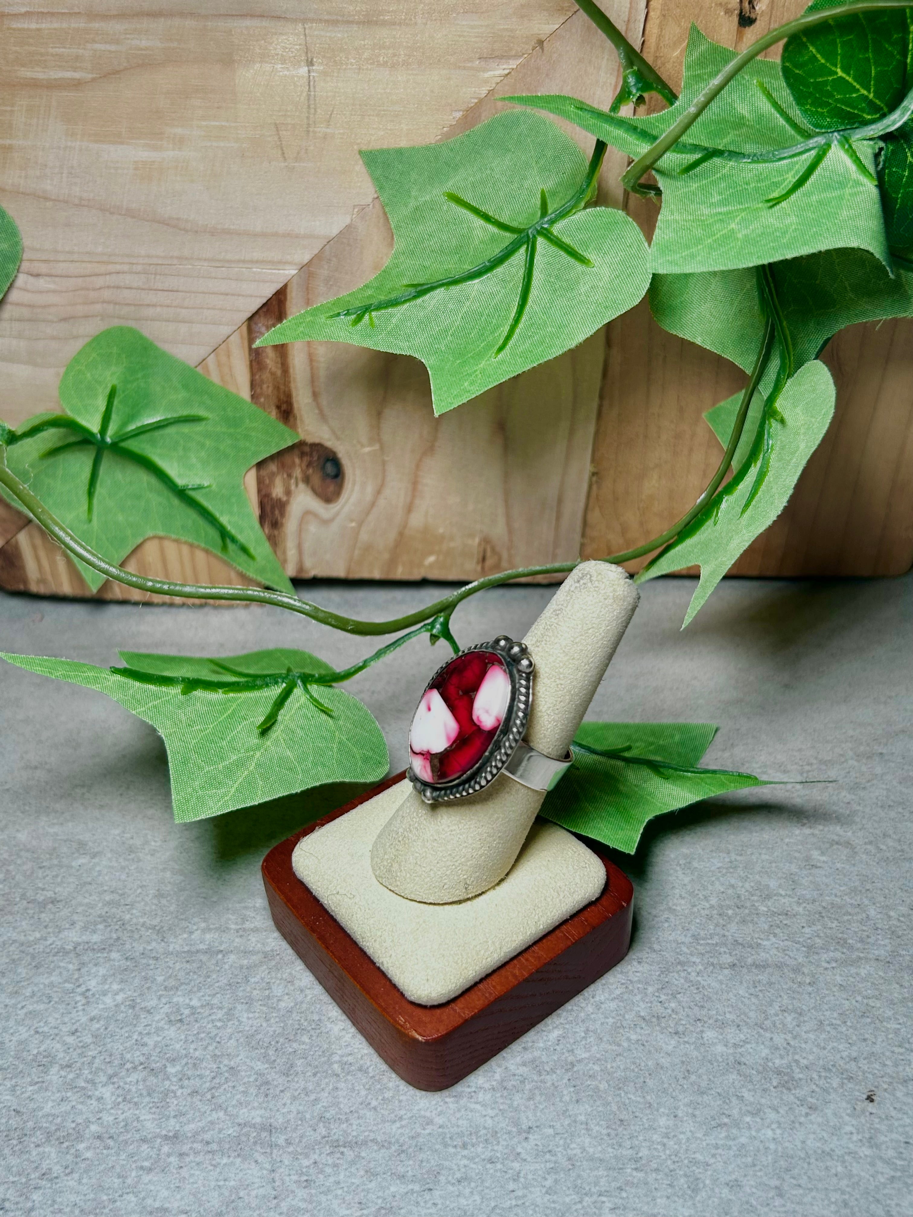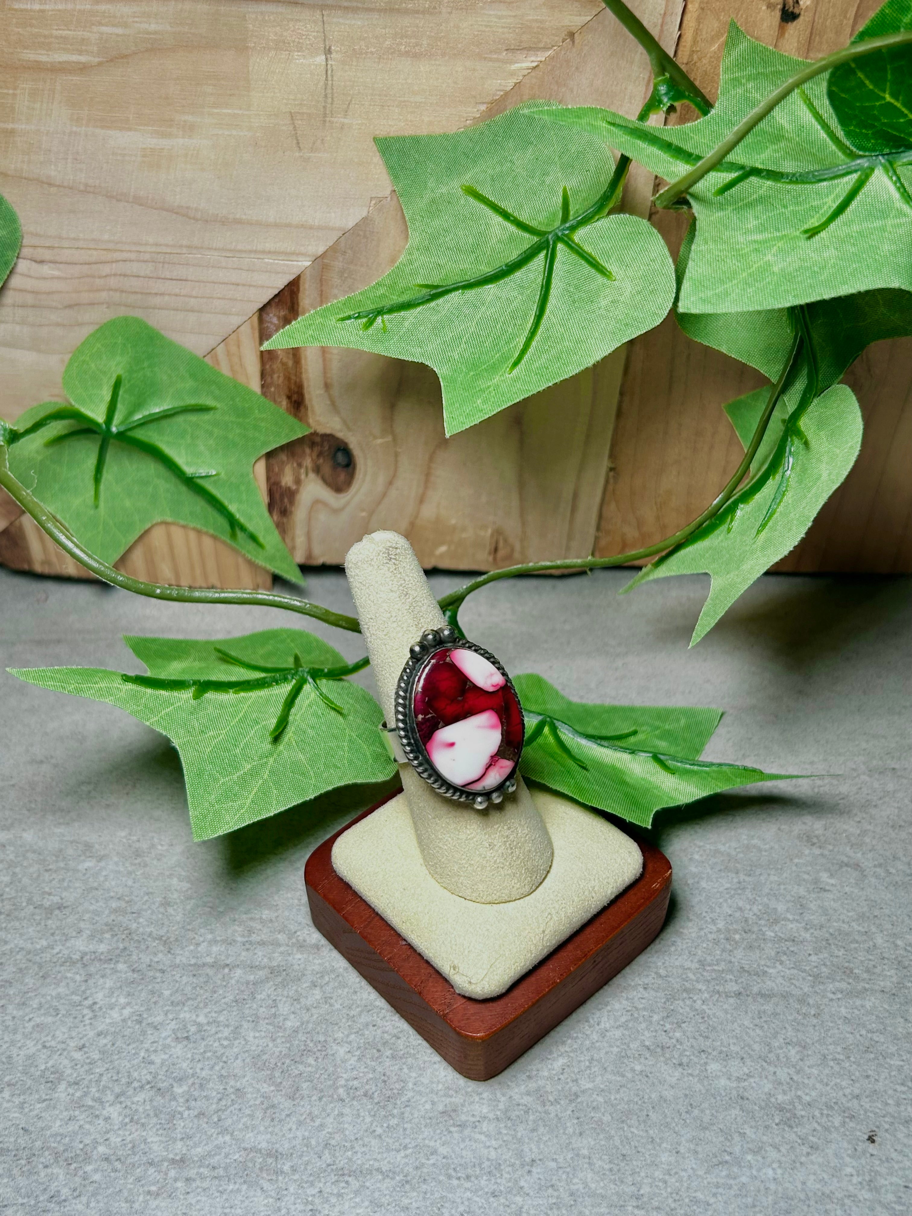 Zachariah David Rose Dahlia & Sterling Silver Adjustable Ring. It measures 1 1/4 inches long and 7/8 of an inch wide. Signed by the artist and stamped sterling silver.