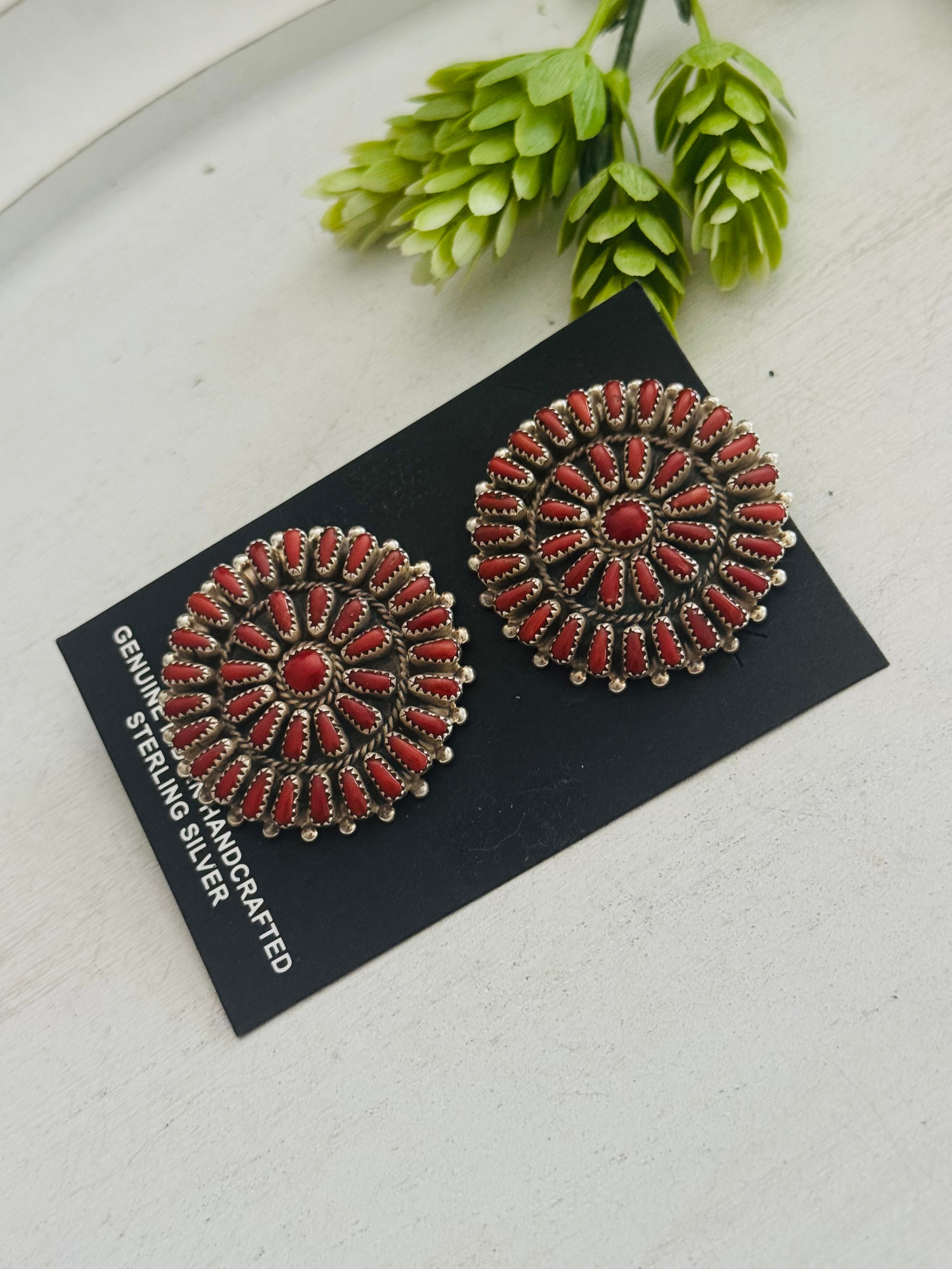 Zuni Made Coral & Sterling Silver Post Cluster Earrings