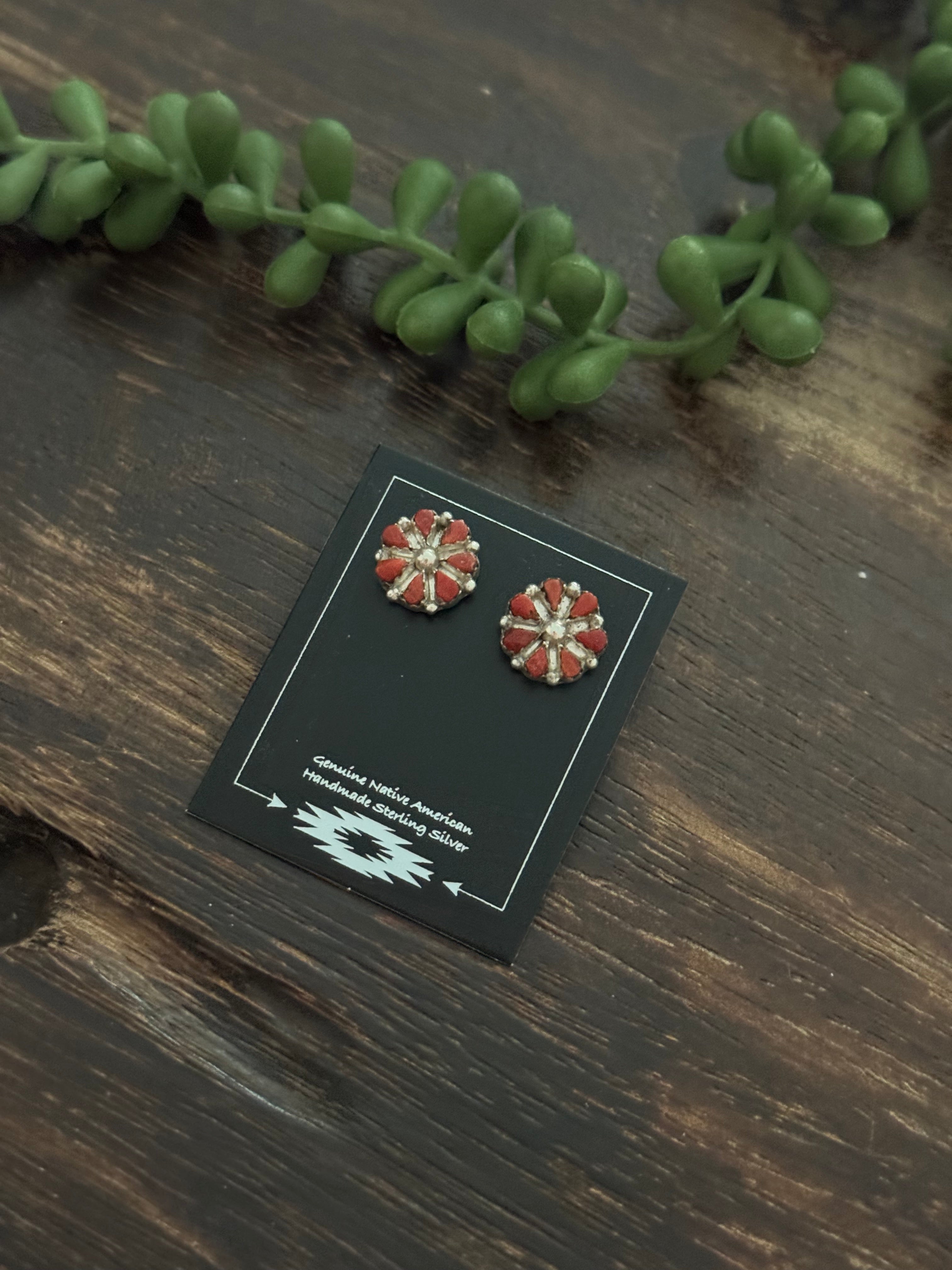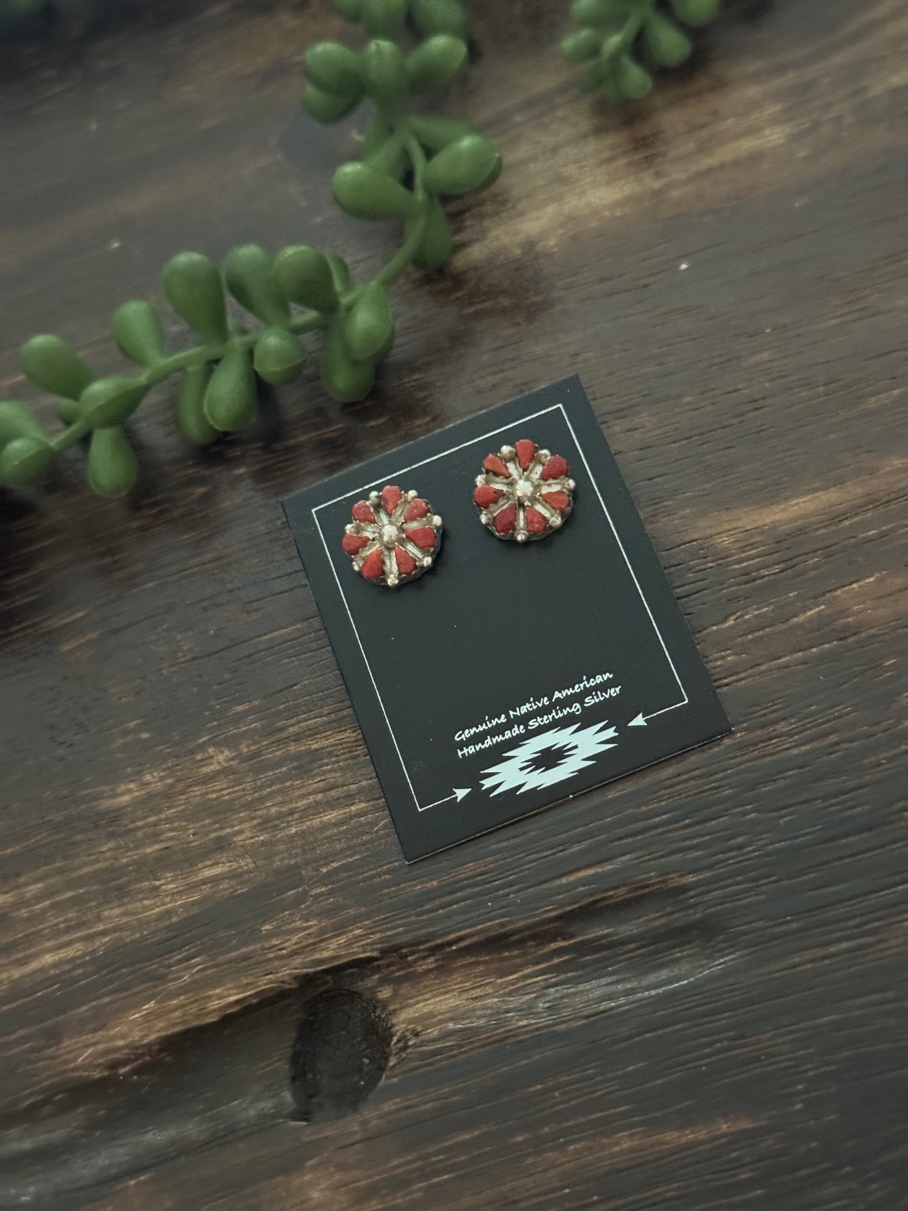 Zuni Made Coral & Sterling Silver Post Cluster Earrings