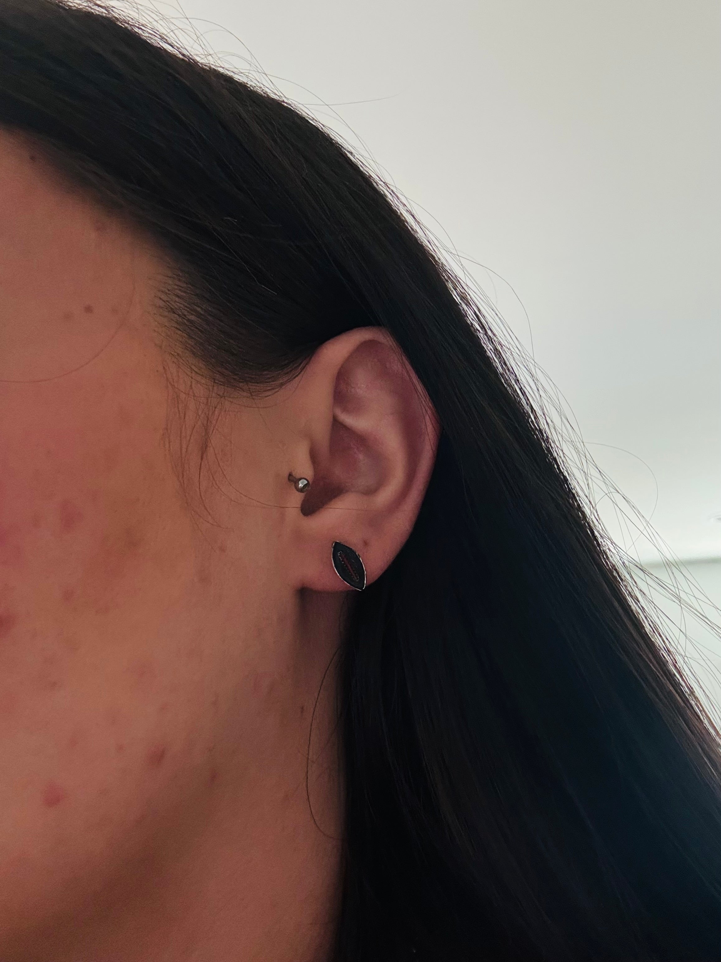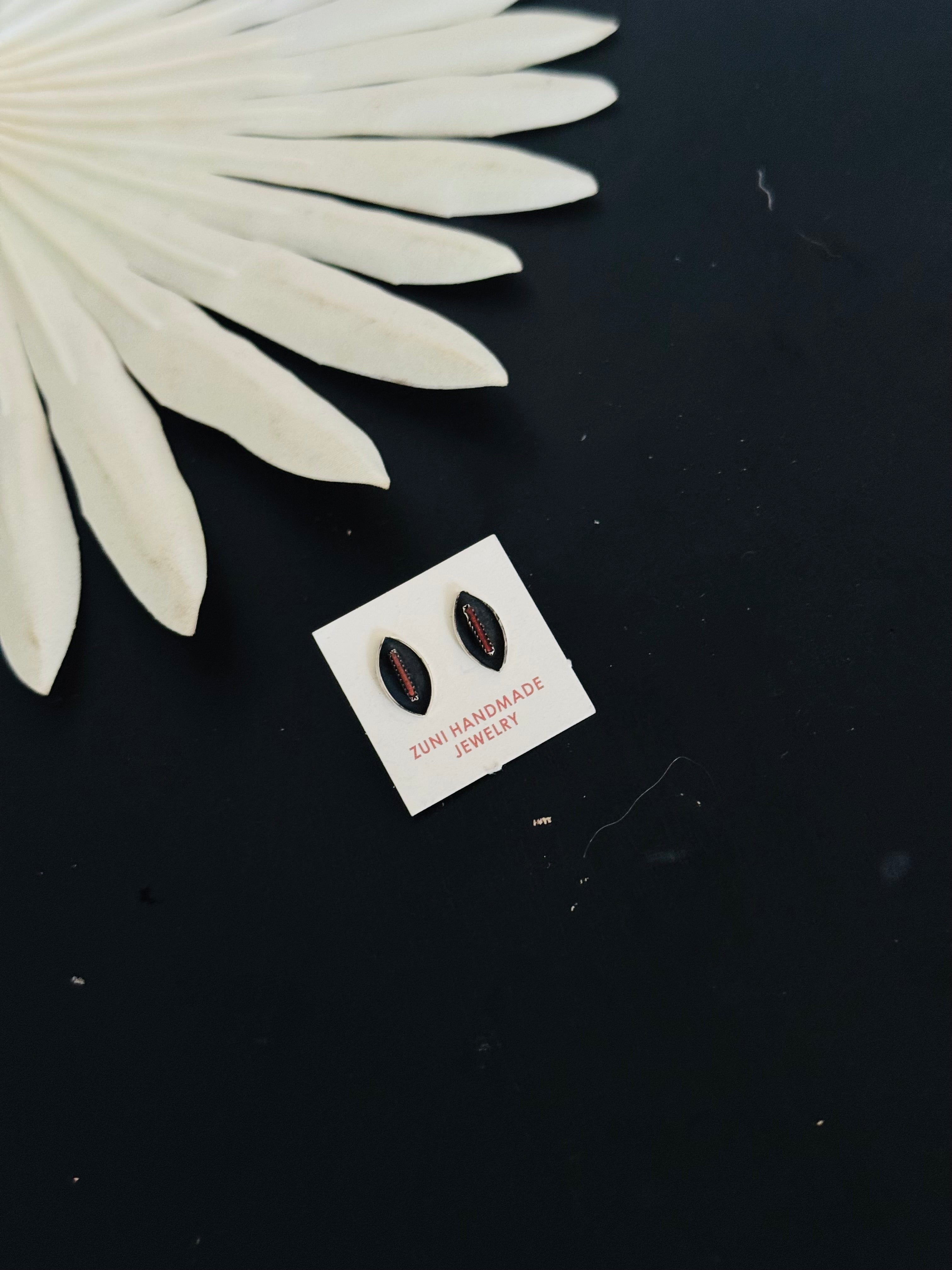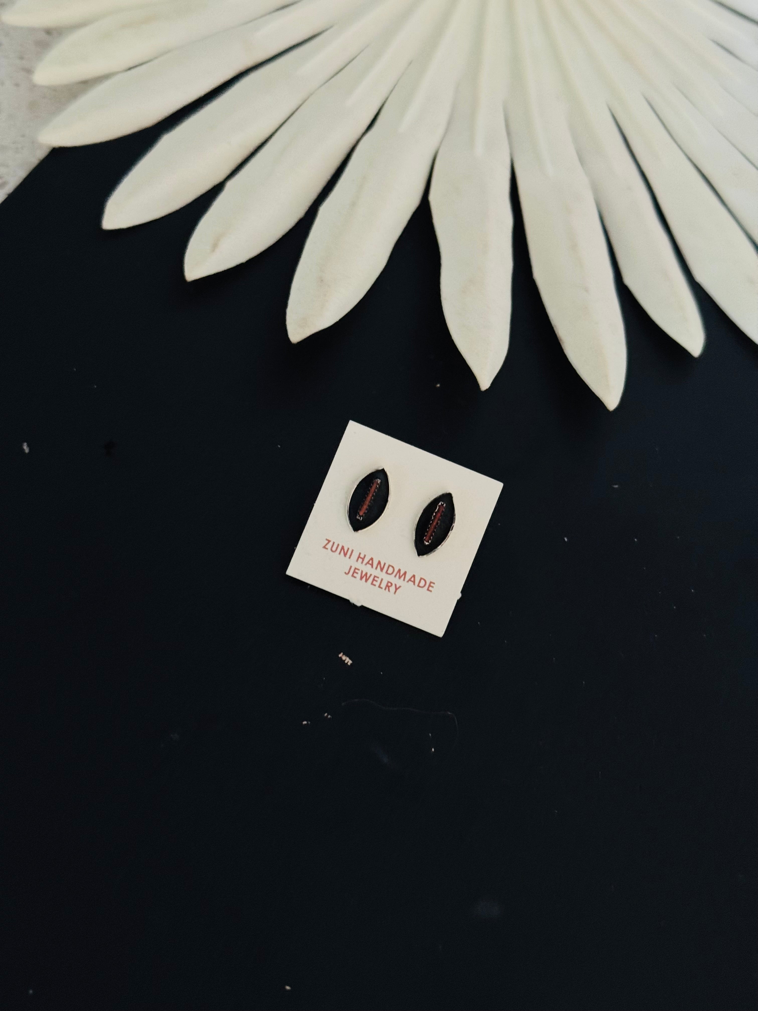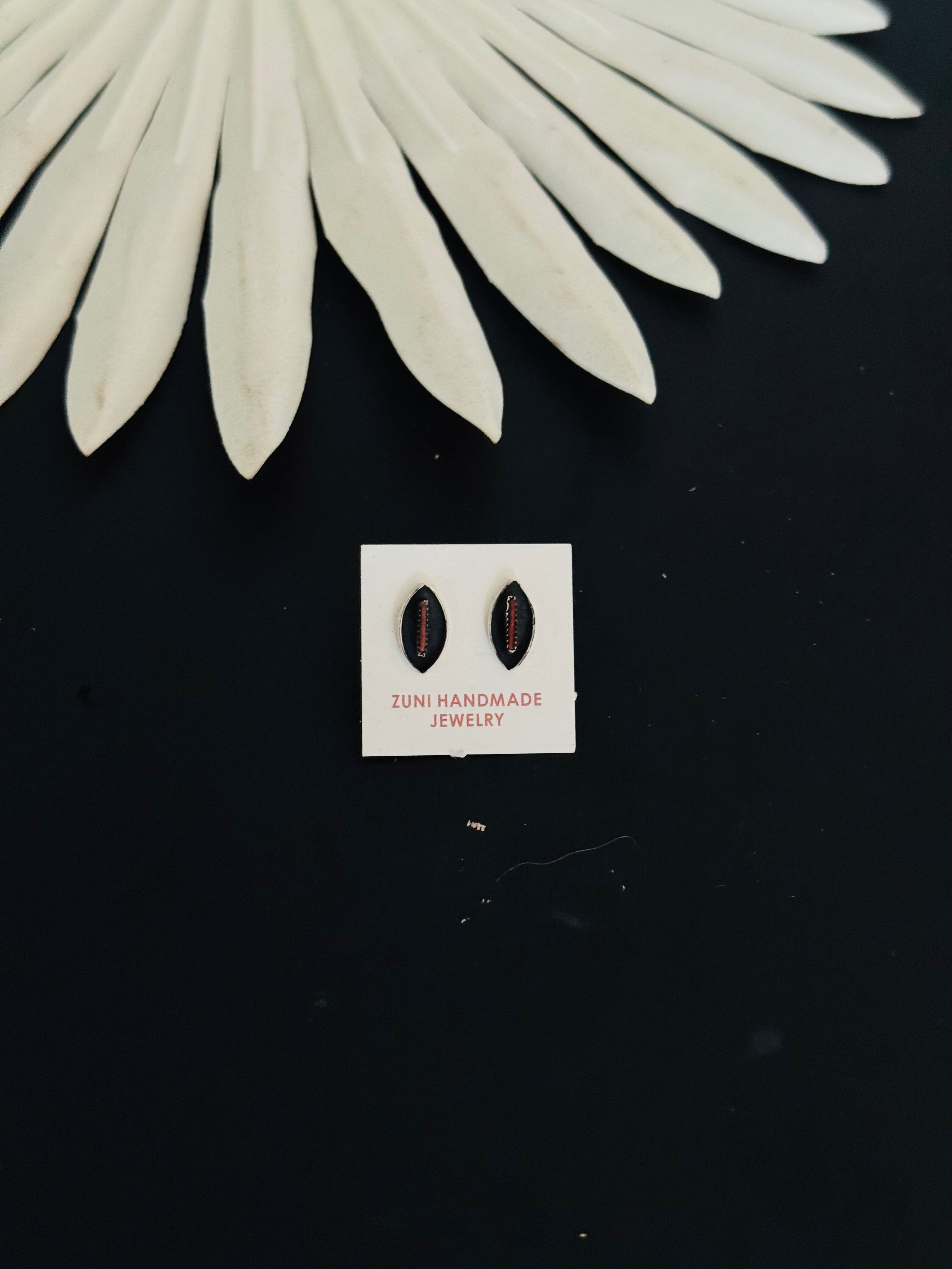 Zuni Made Coral & Sterling Silver Earrings. They measure 1/2 of an inch long and 1/4 of an inch wide. Stamped sterling silver.