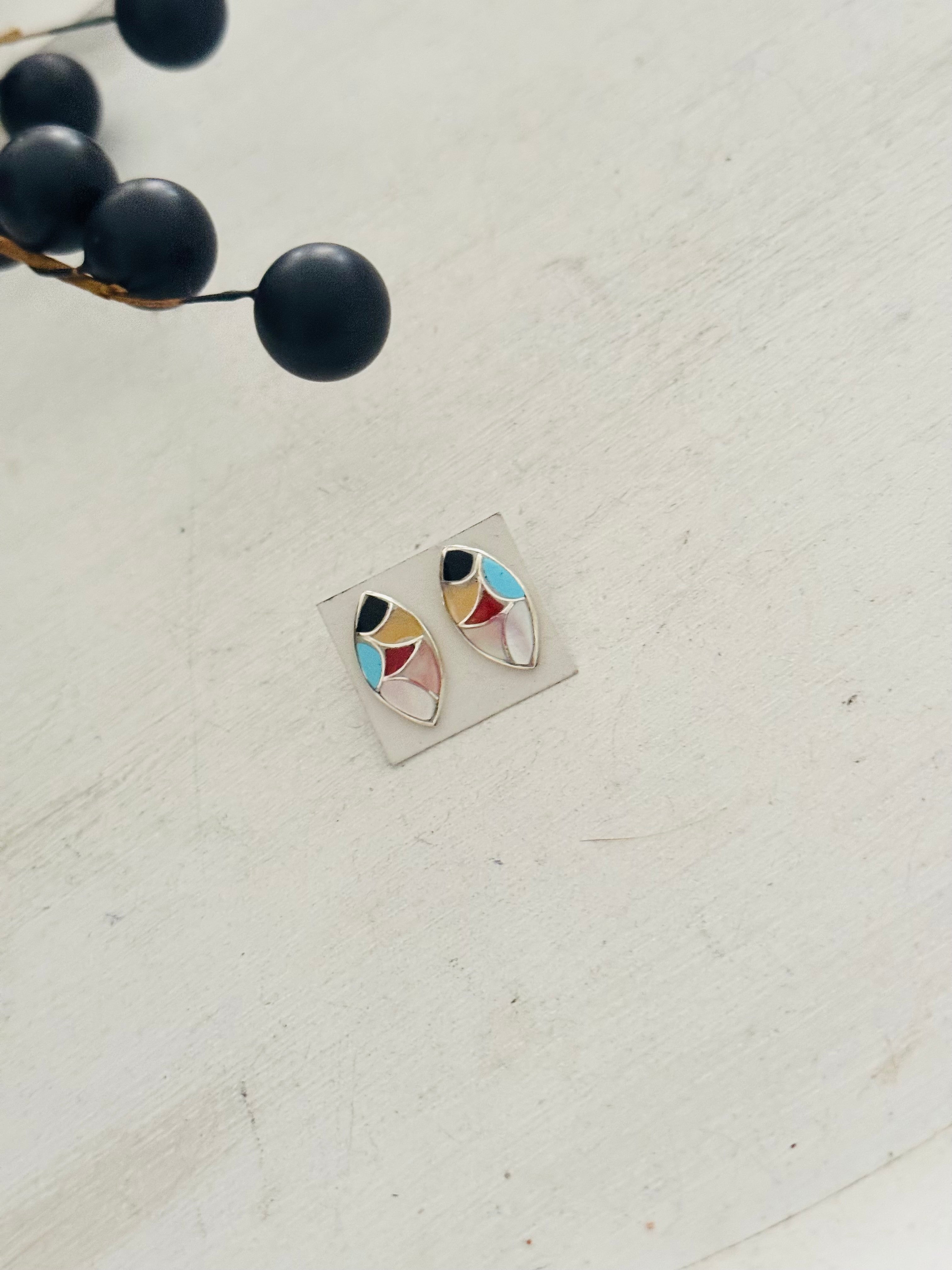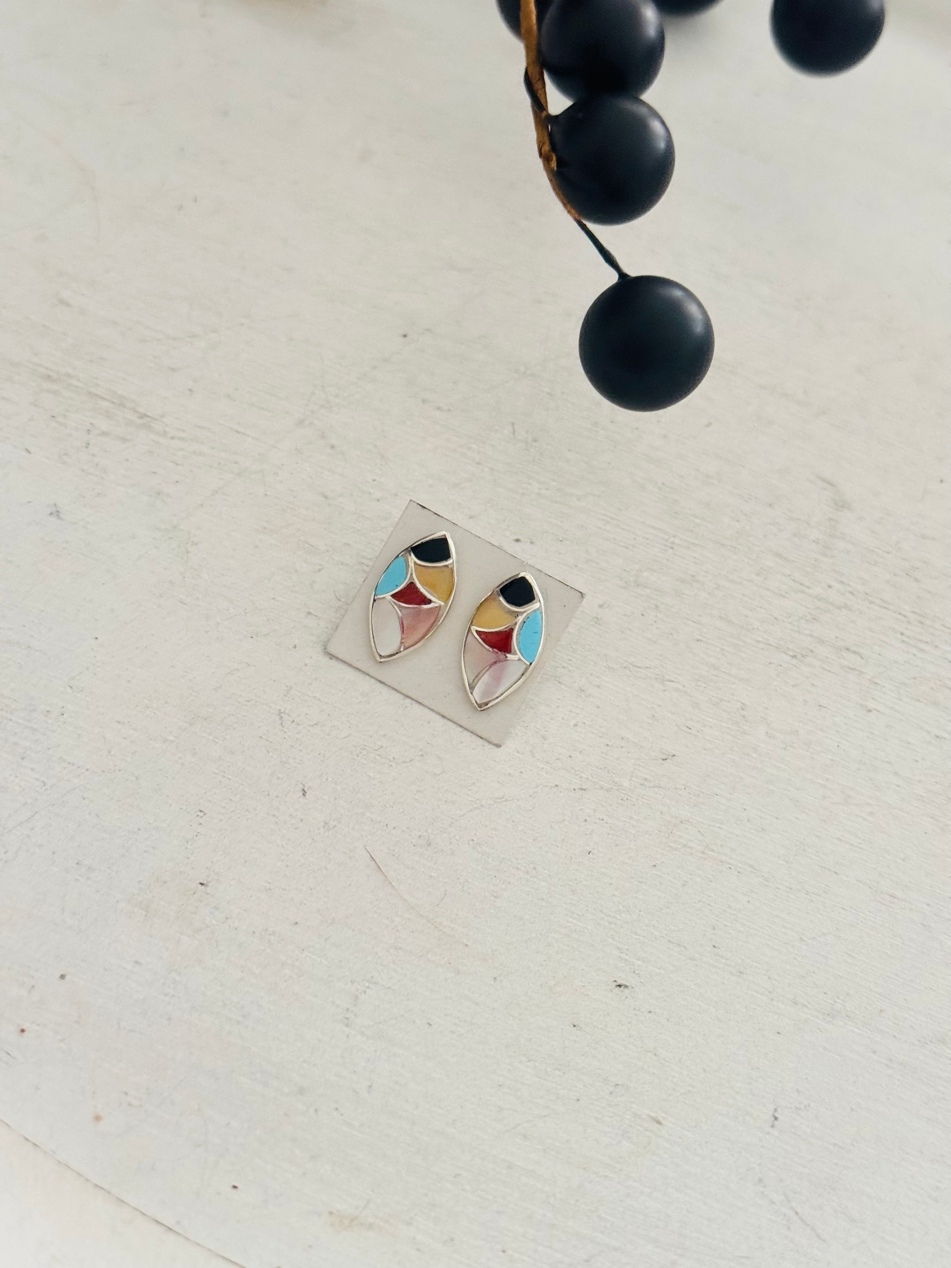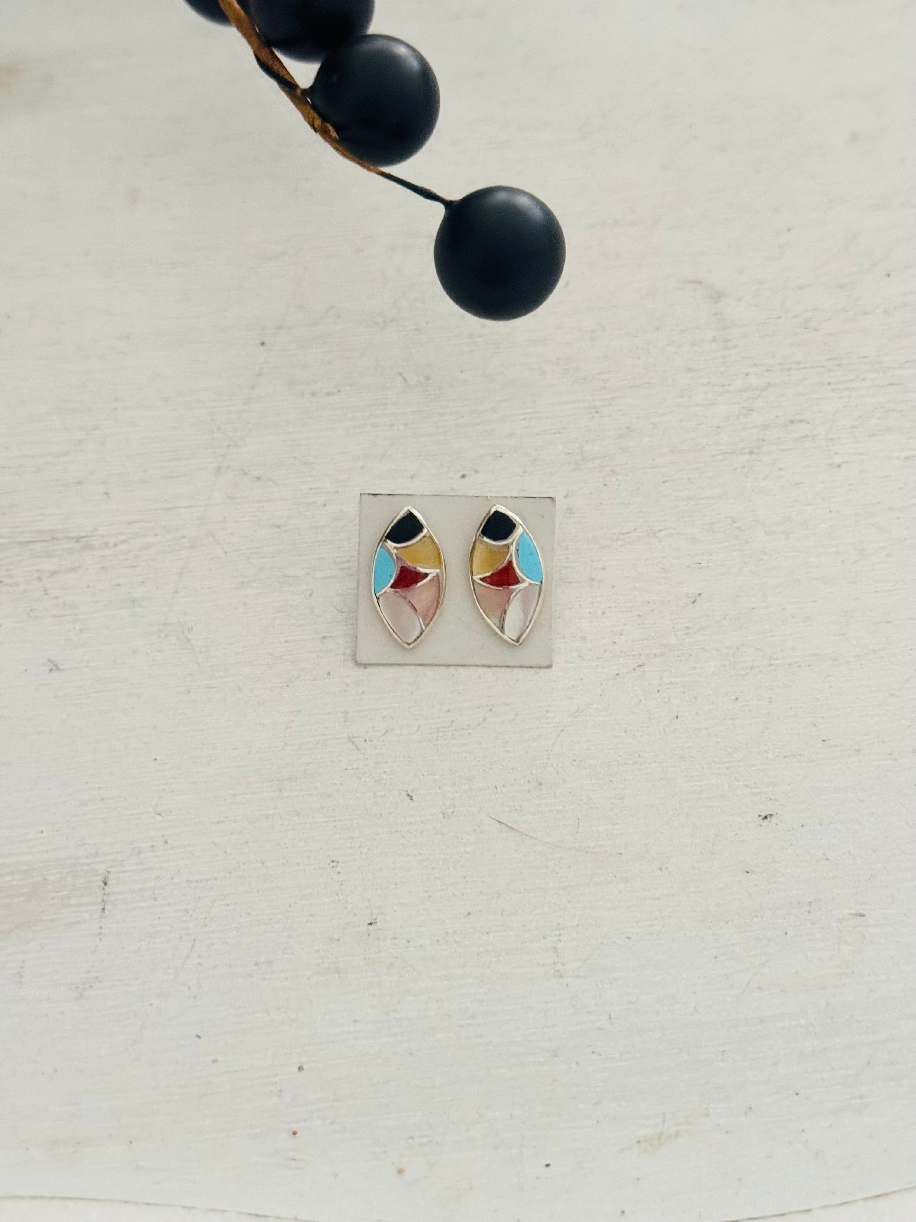 Zuni Made Multi Stone & Sterling Silver Inlay Earrings. They measure just under 3/4 of an inch long and 1/2 of an inch wide.