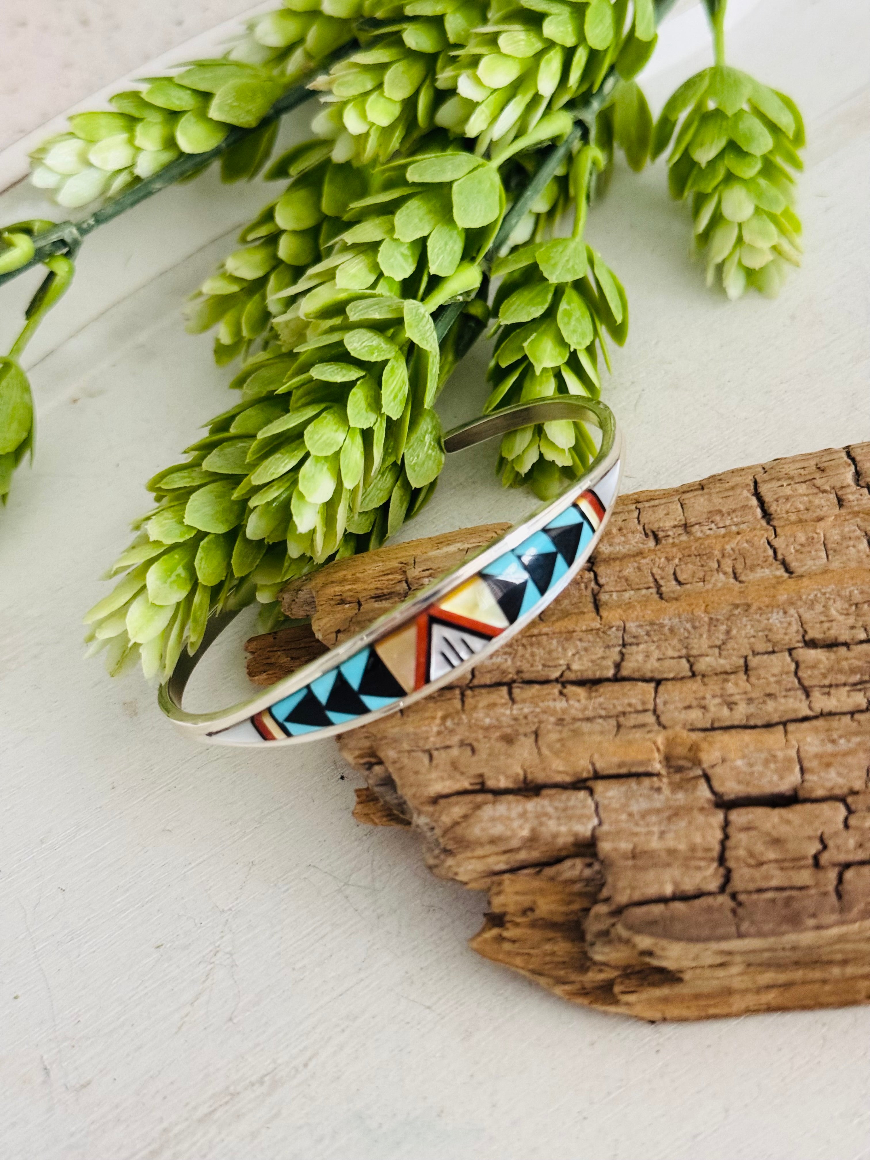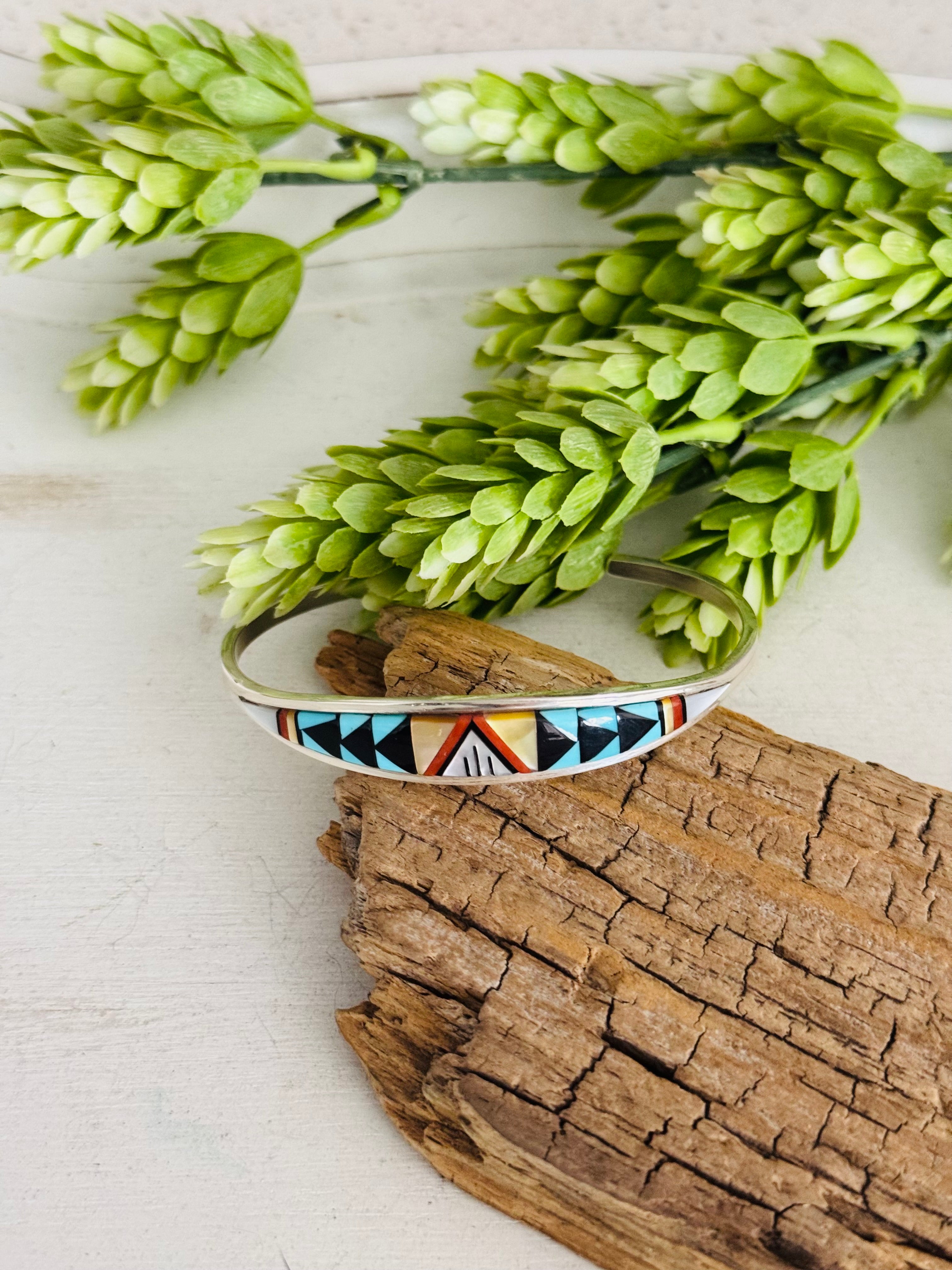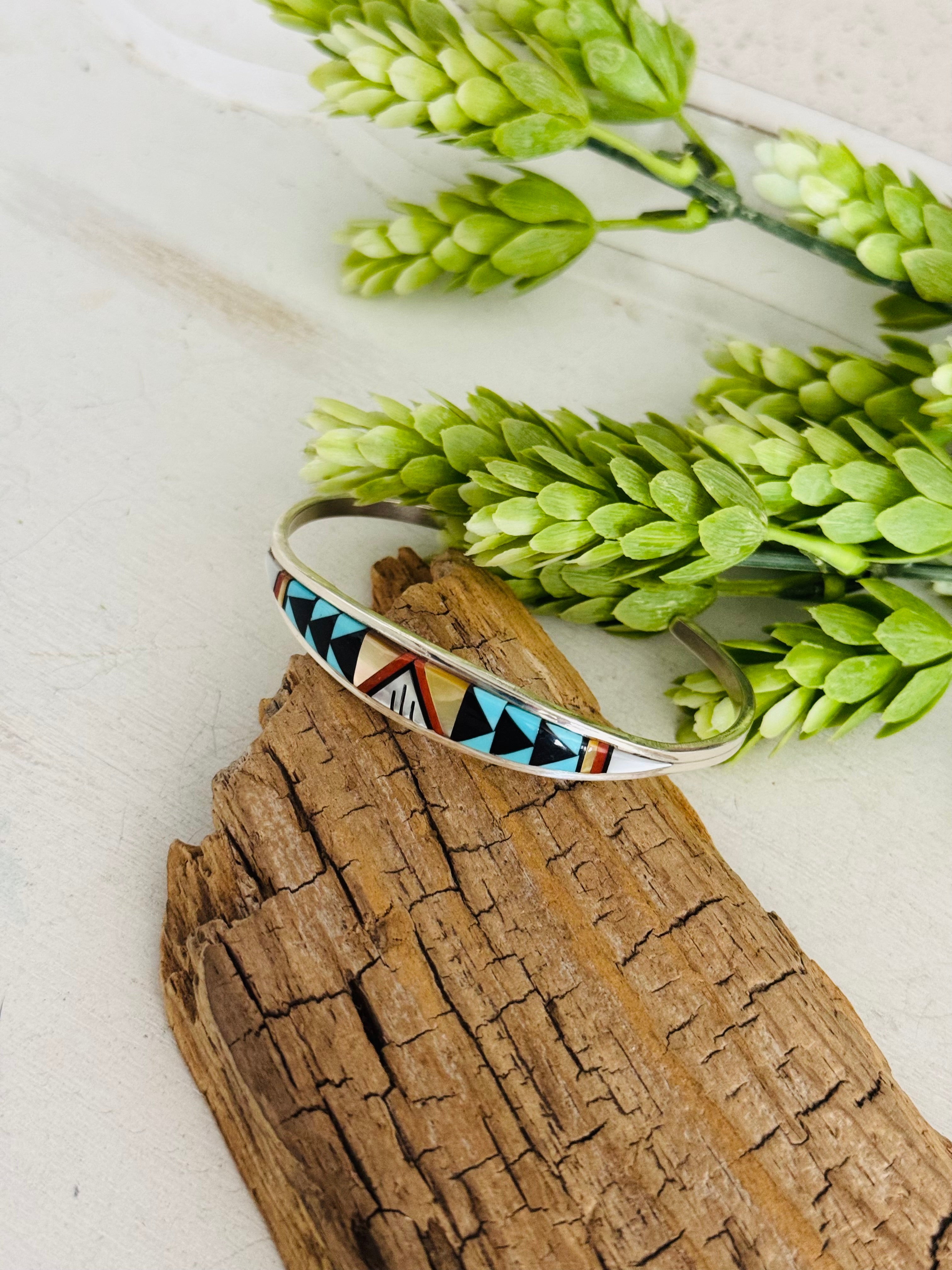 Lynette Booqua Multi Stone & Sterling Silver Inlay Cuff Bracelet. It measures 3/8 of an inch wide with an inside circumference of 5 3/8 inches and a gap of 1 1/4 inches. Signed by artist and stamped sterling silver.