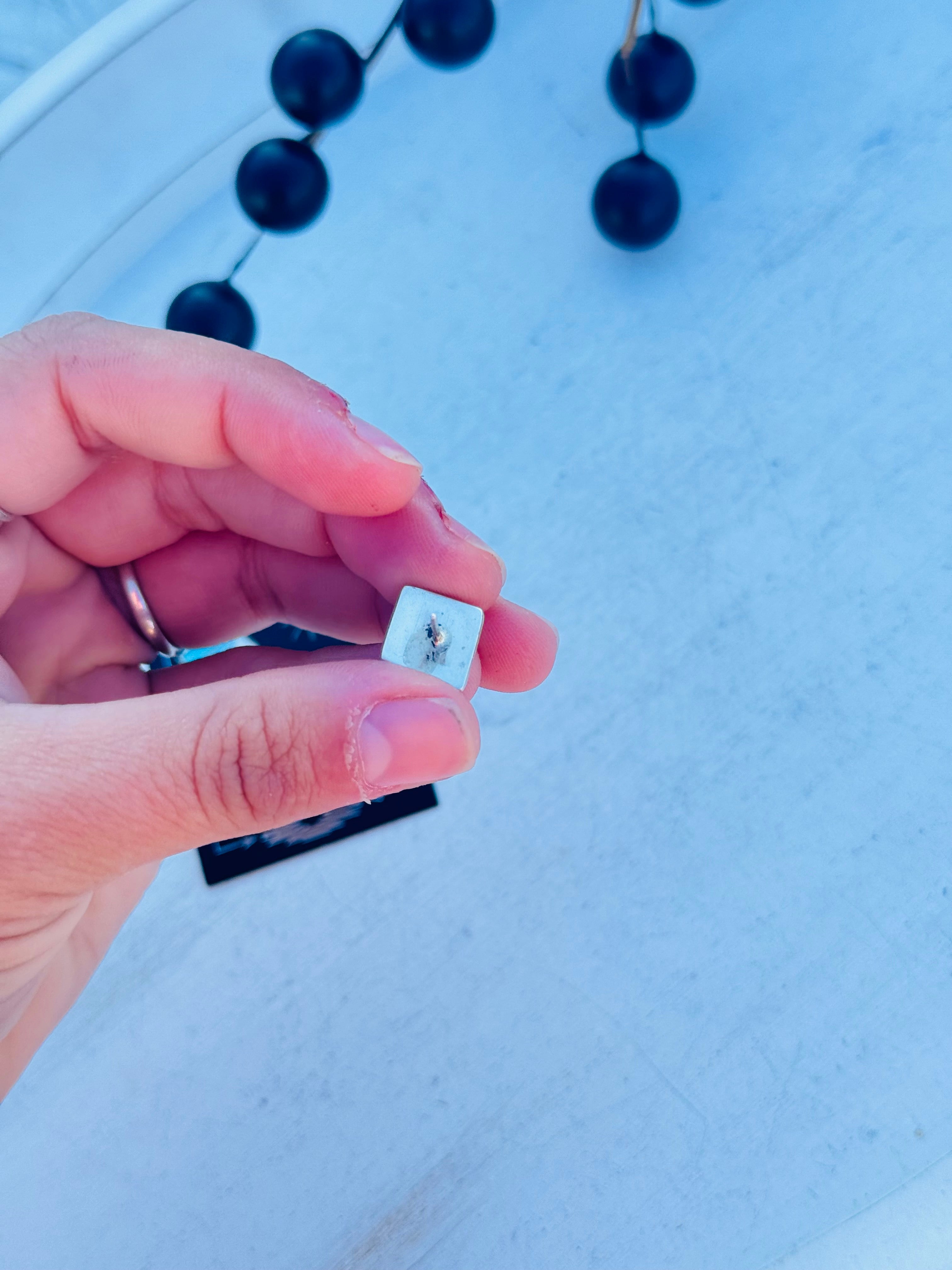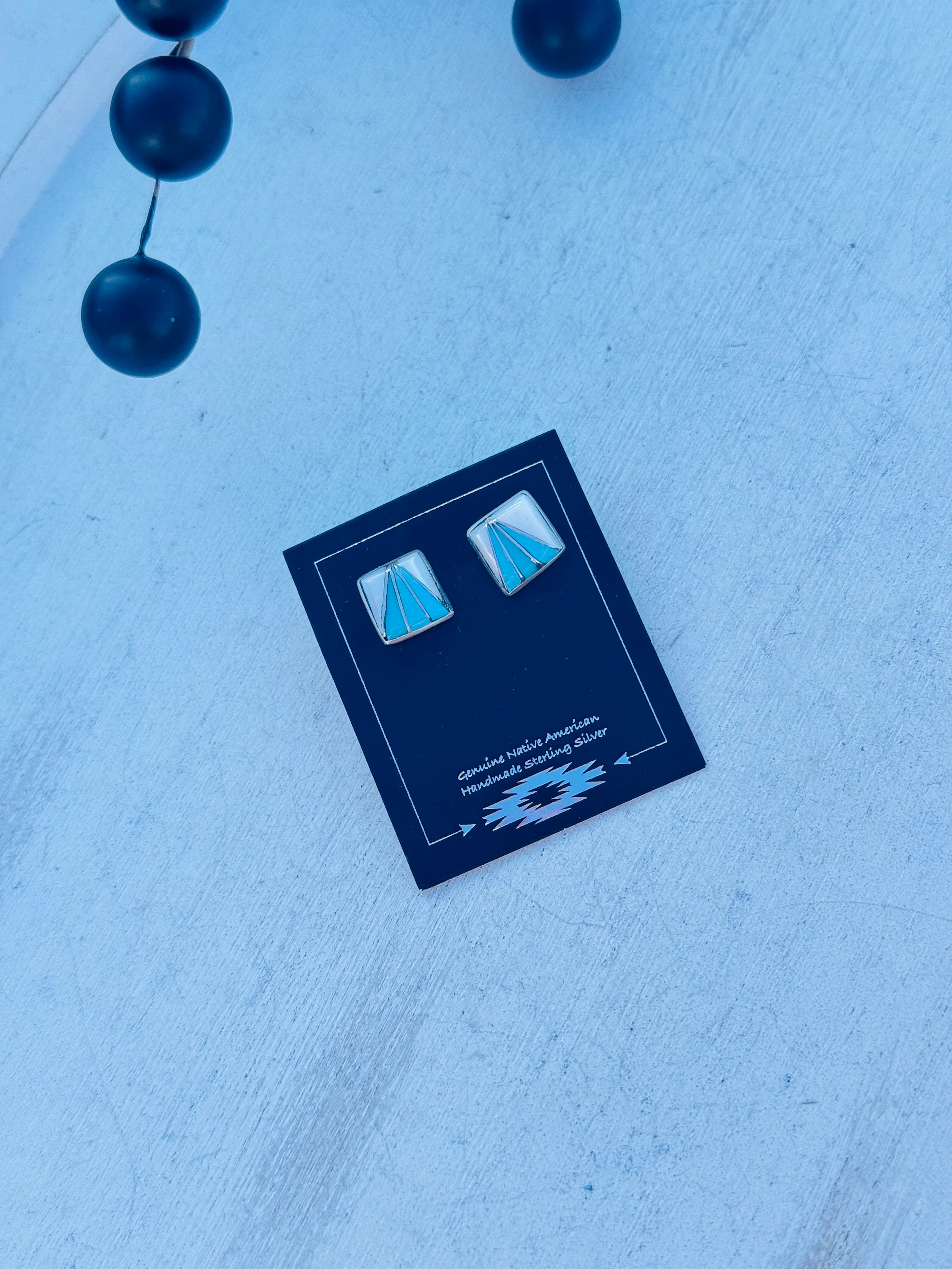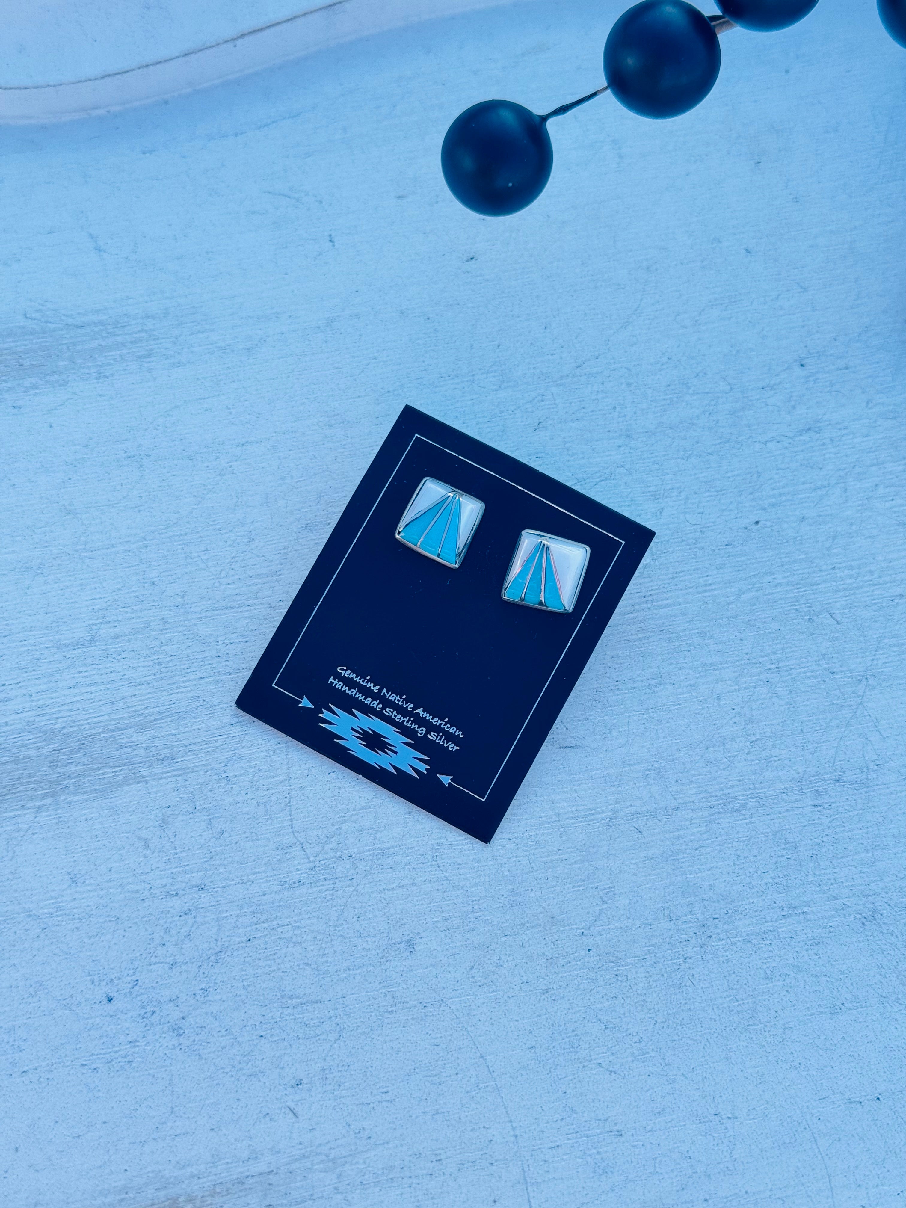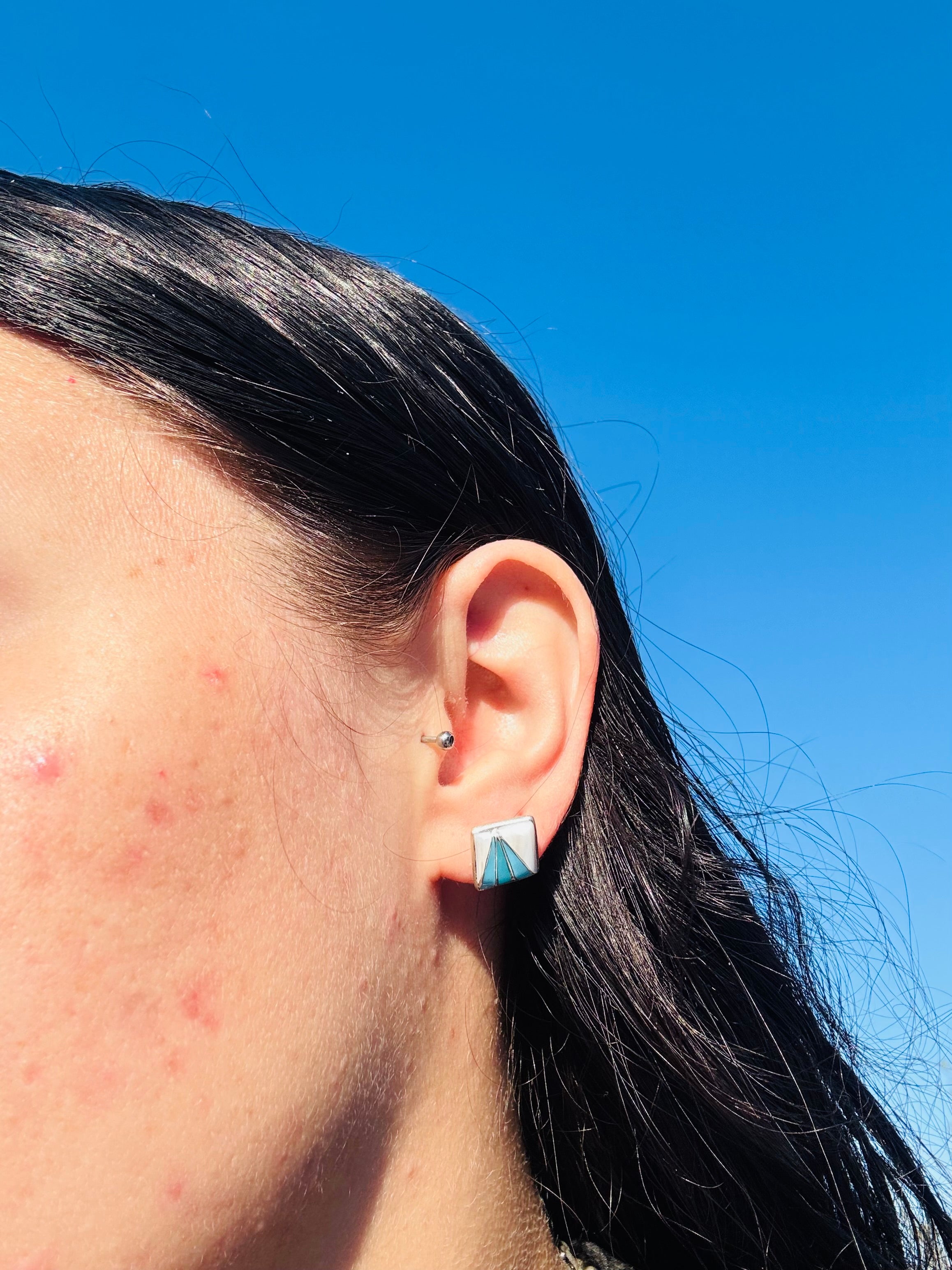 Zuni Made Multi Stone & Sterling Silver Inlay Earrings. They measure just under 3/8 of an inch long and 3/8 of an inch wide.