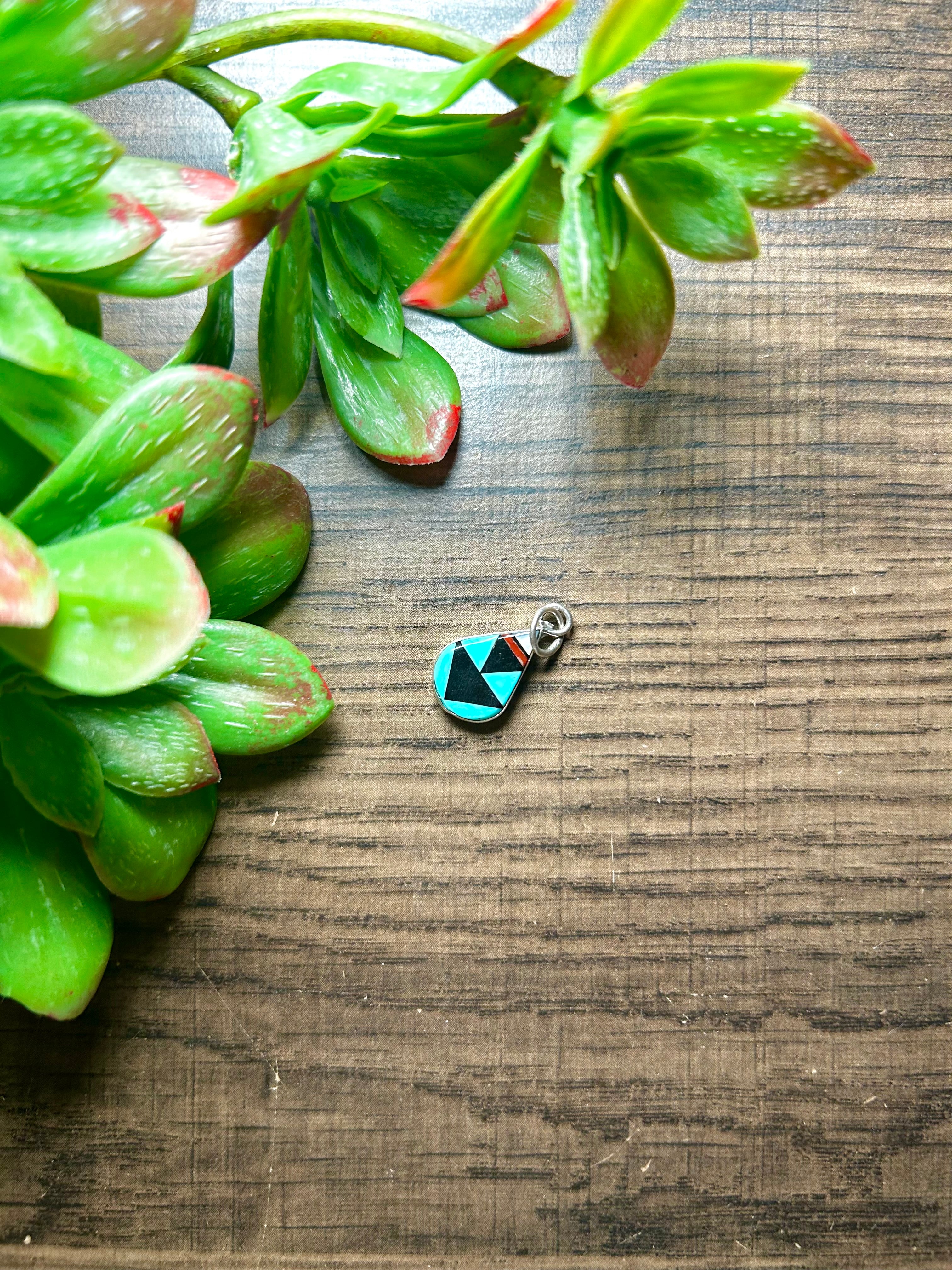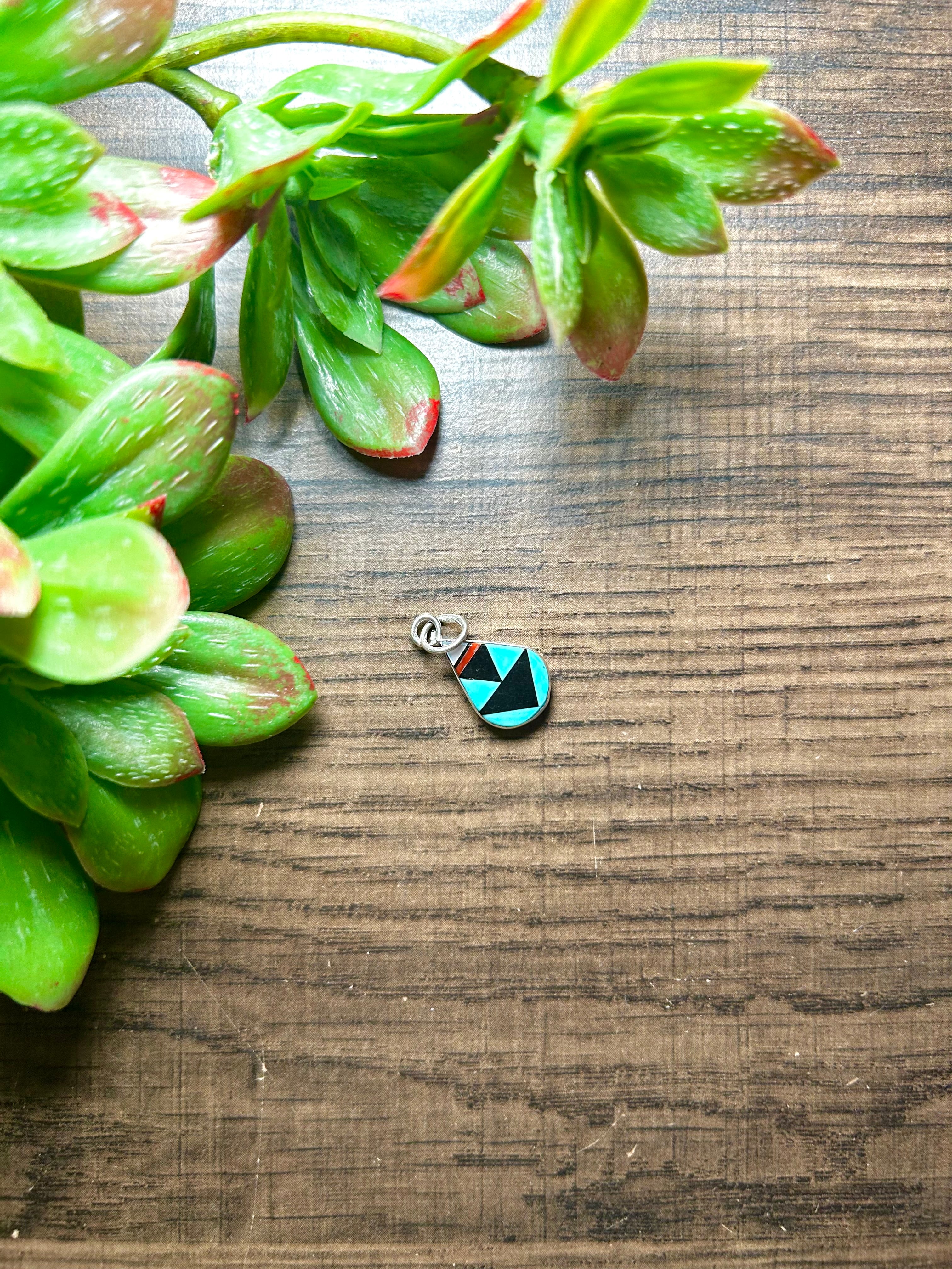 Zuni Made Multi Stone & Sterling Silver Pendant. It measures 1 inch long and 1/2 of an inch wide. Pendant Only! Signed by the artist and stamped sterling silver.