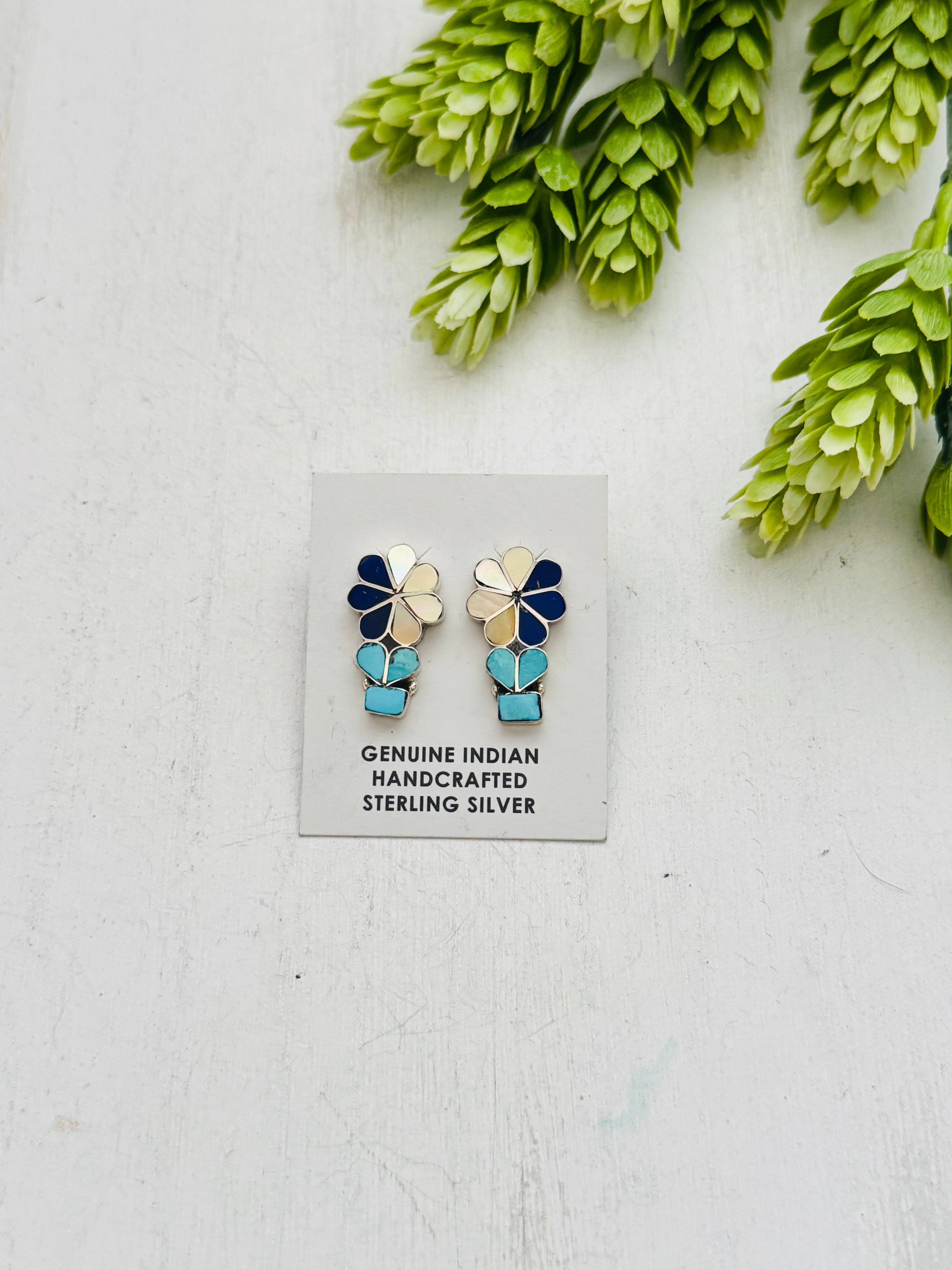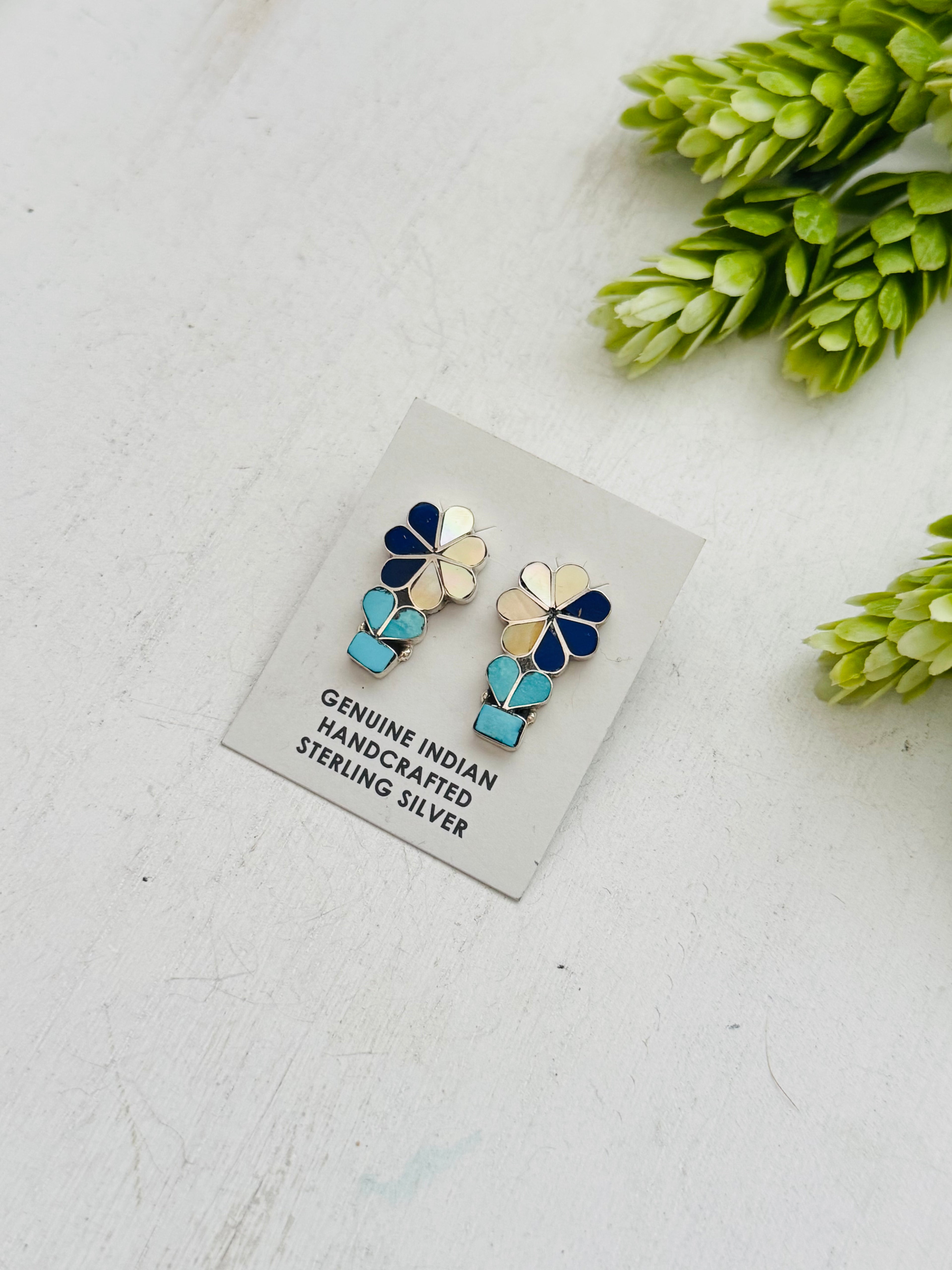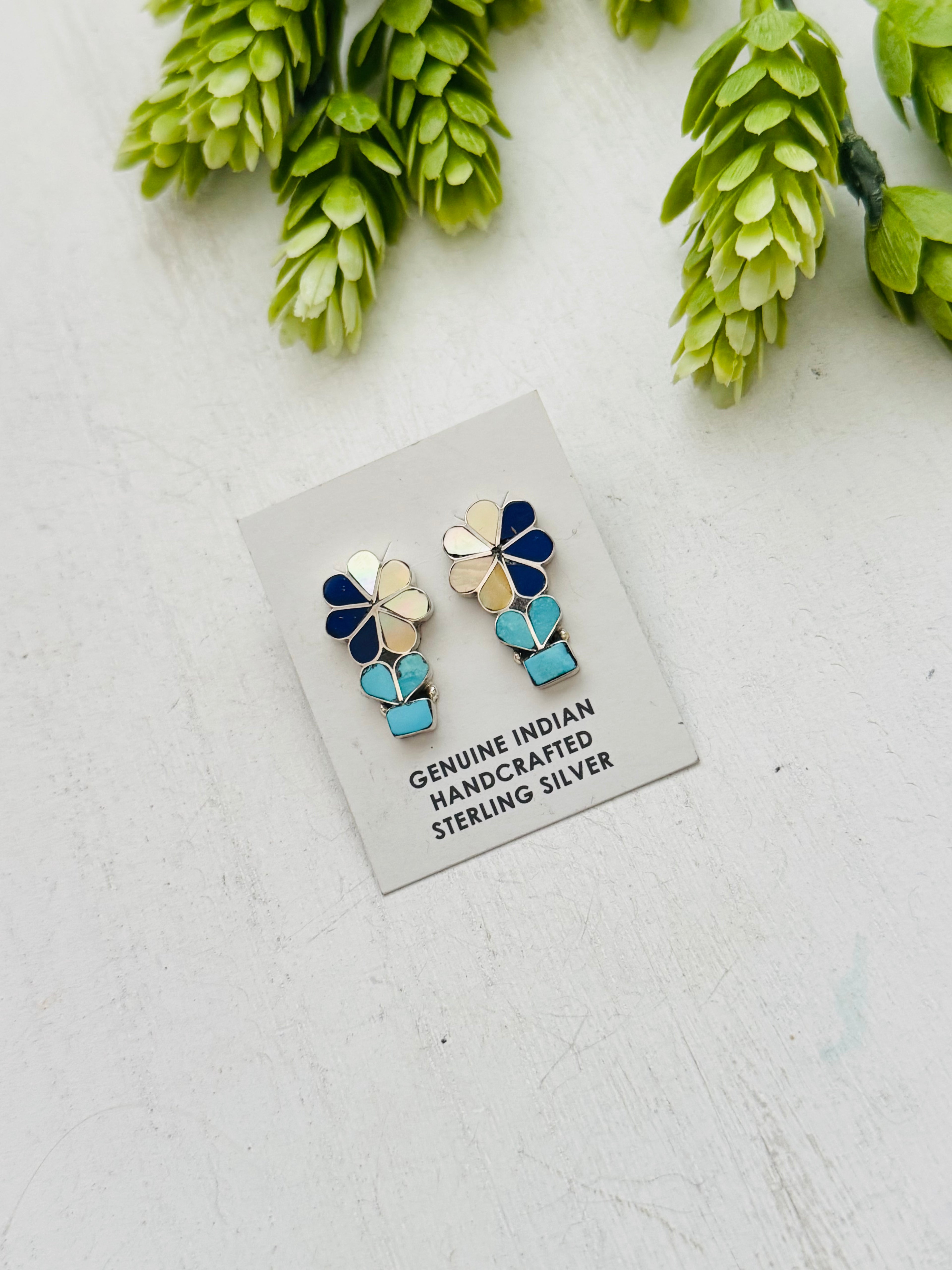 Zuni Made Multi Stone & Sterling Silver Post Dangle Earrings