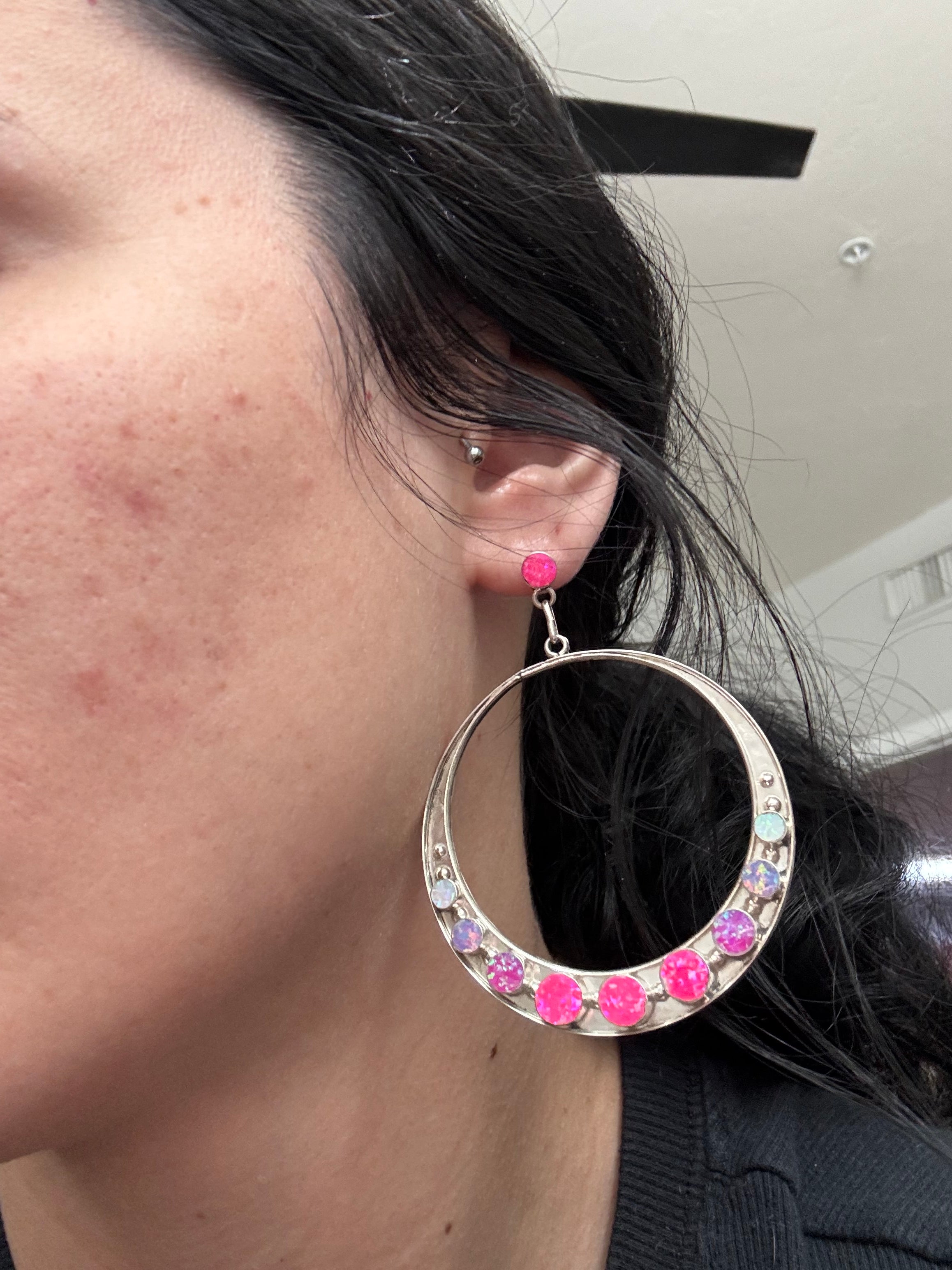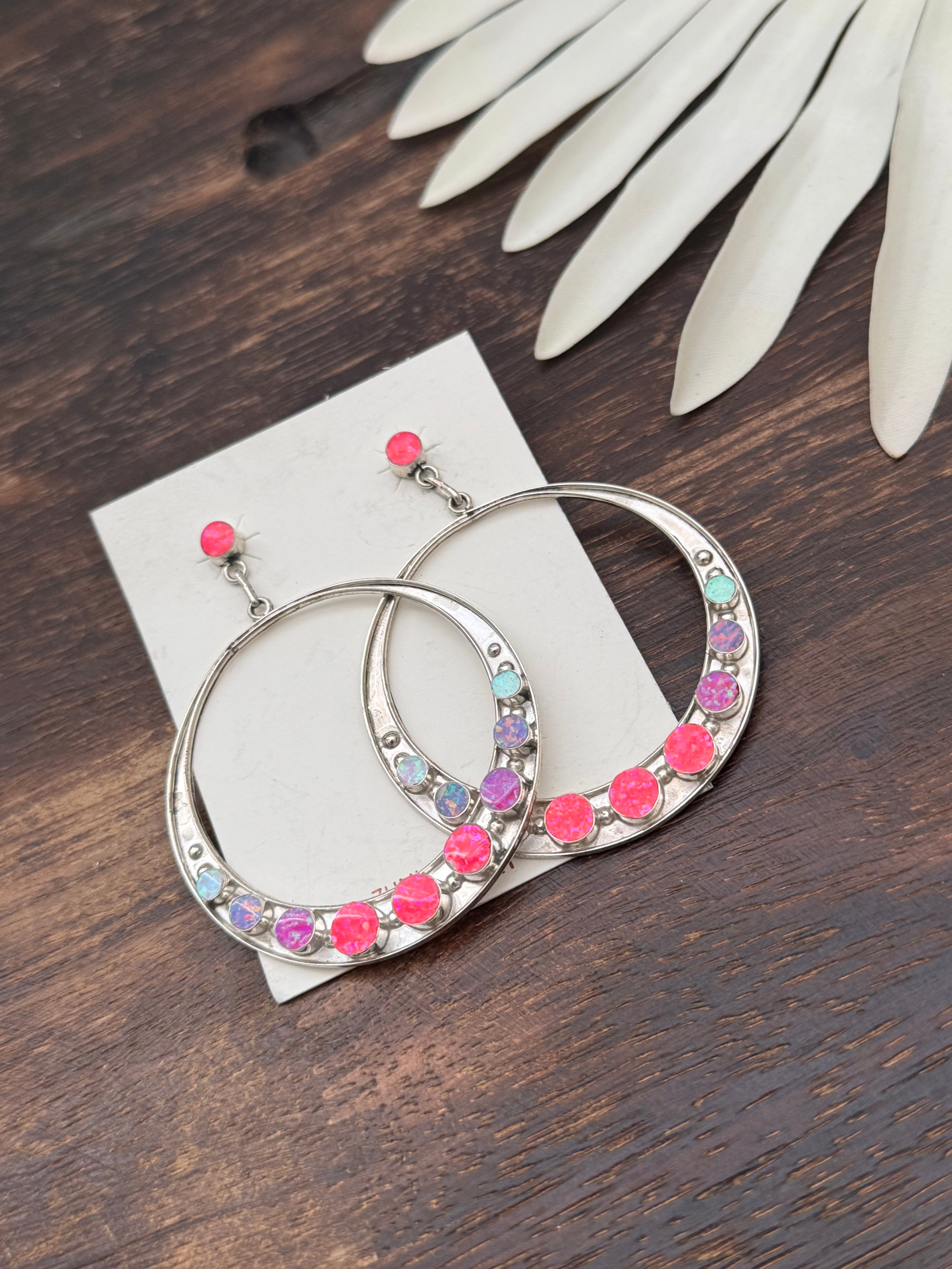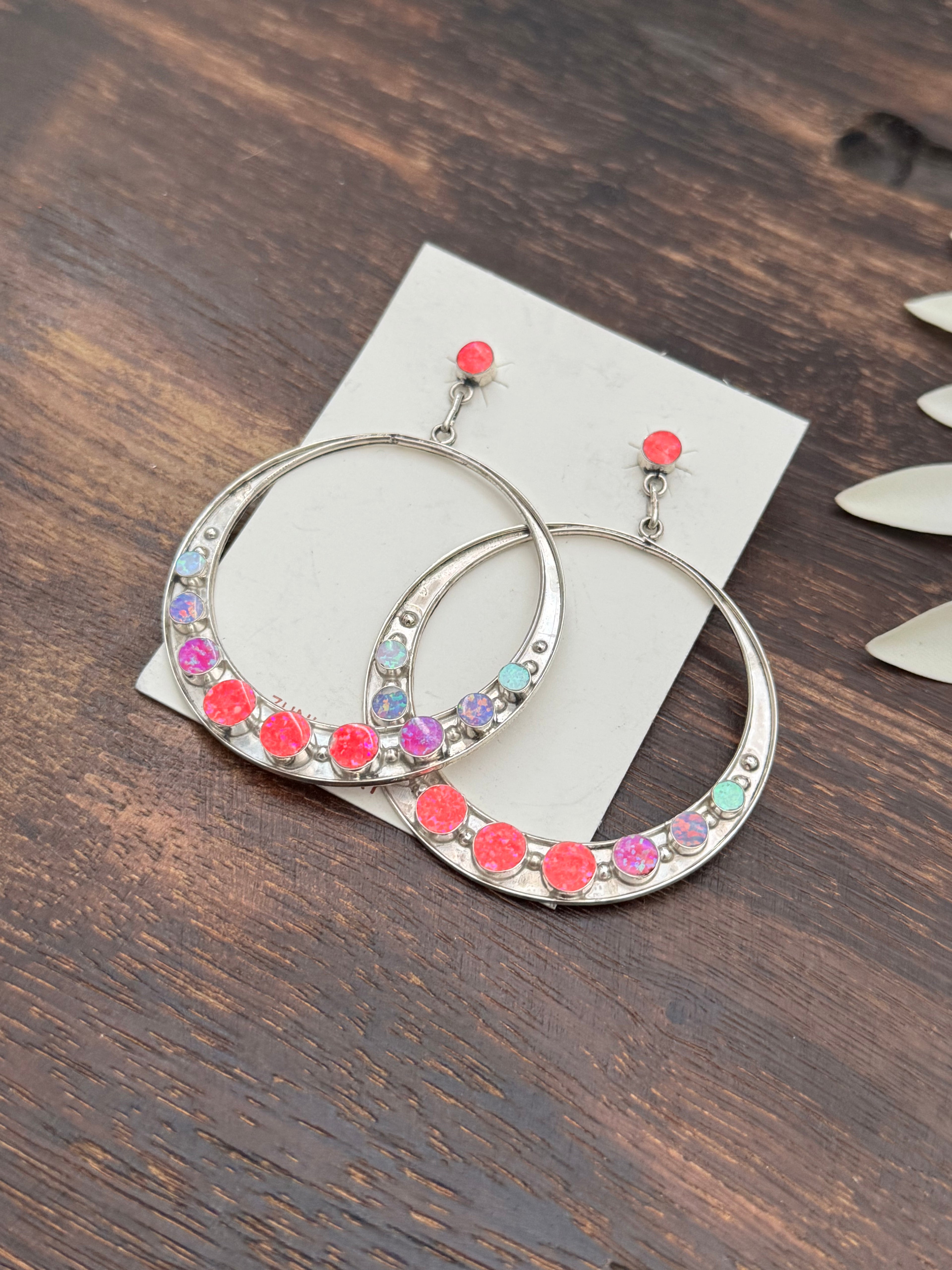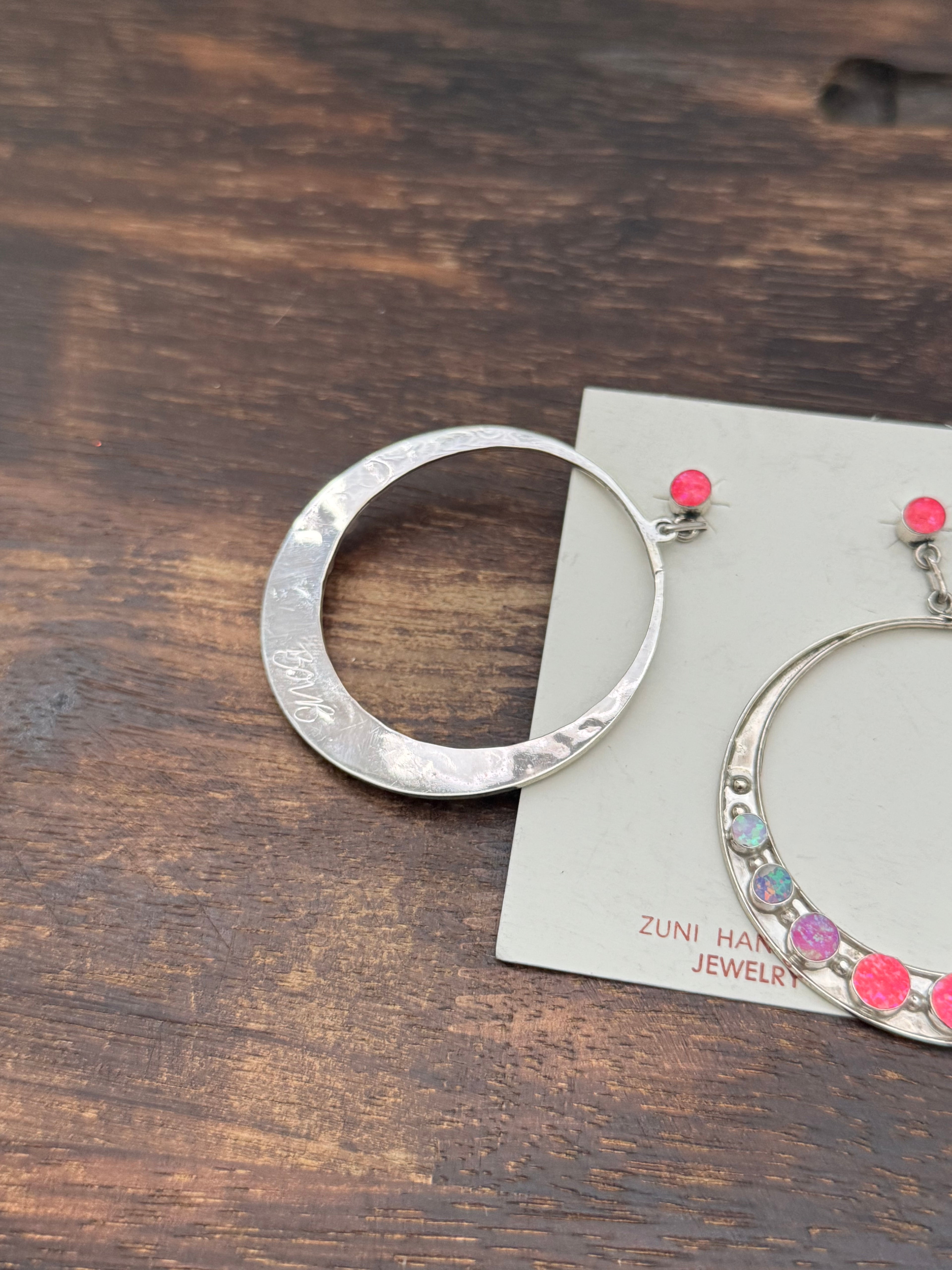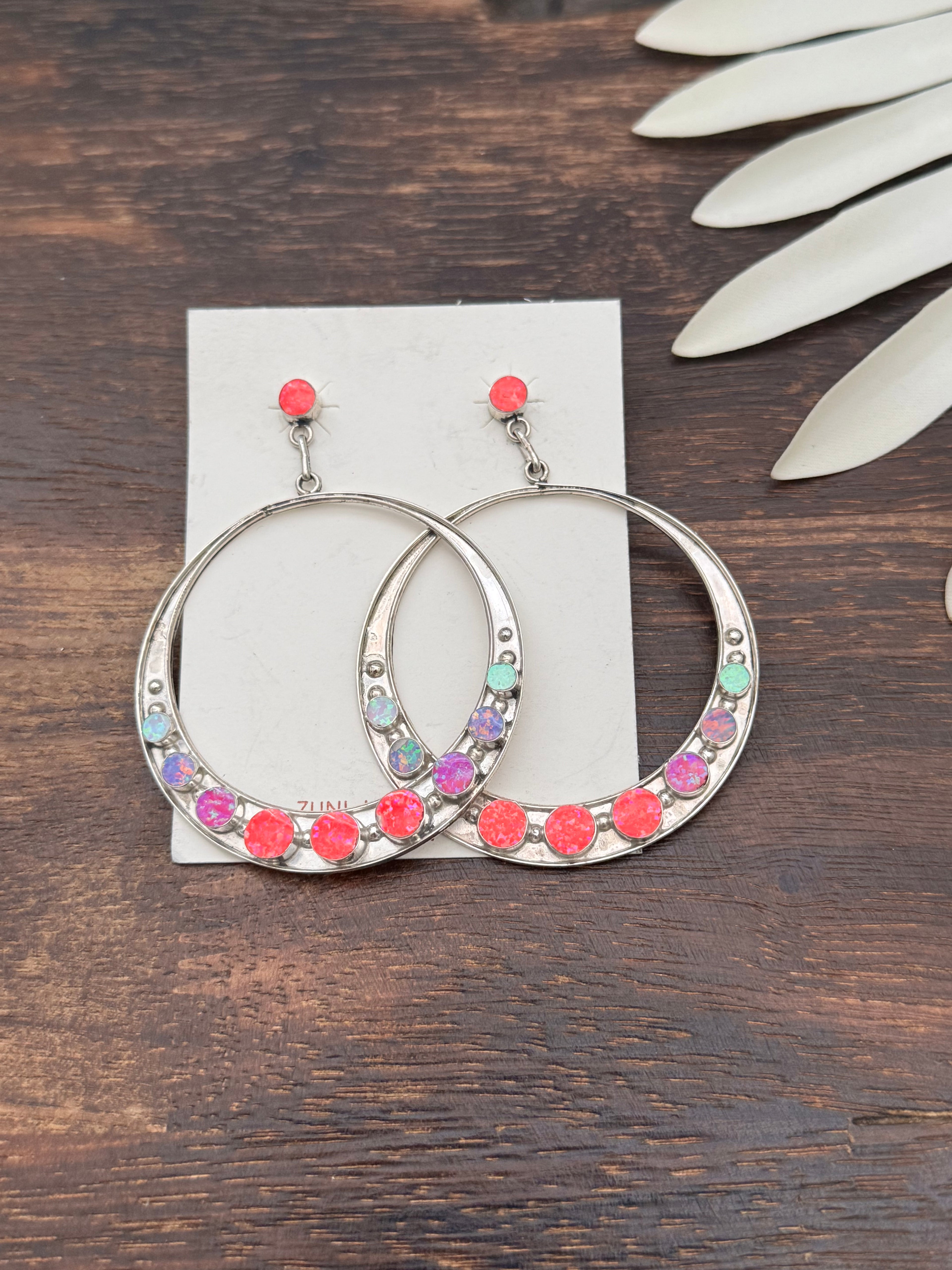 Zuni Made Opal (Man Made) & Sterling Silver Post Dangle Earrings. It measures 2 5/8 inches long and 2 inches wide. Signed by artist and stamped sterling silver.