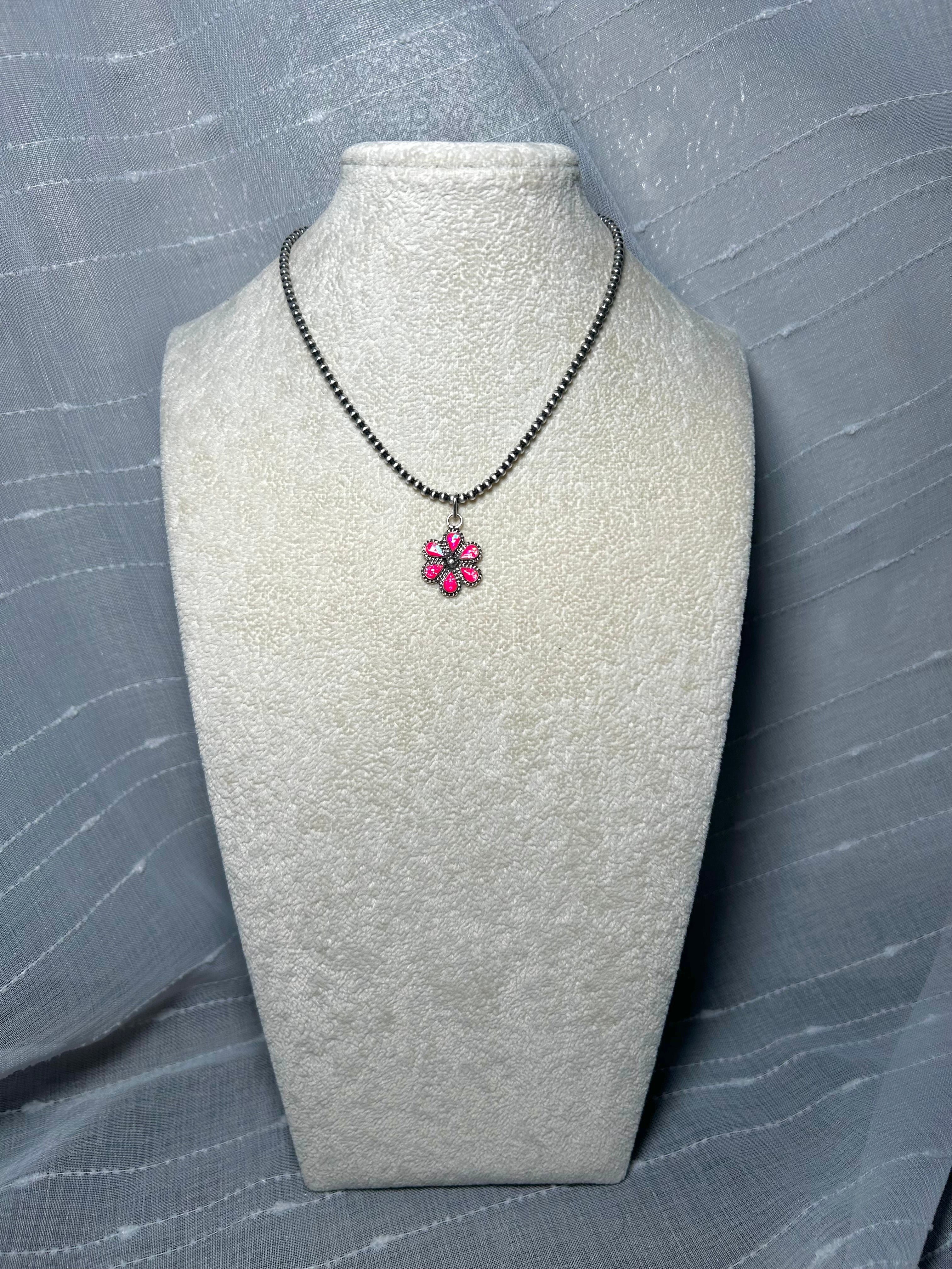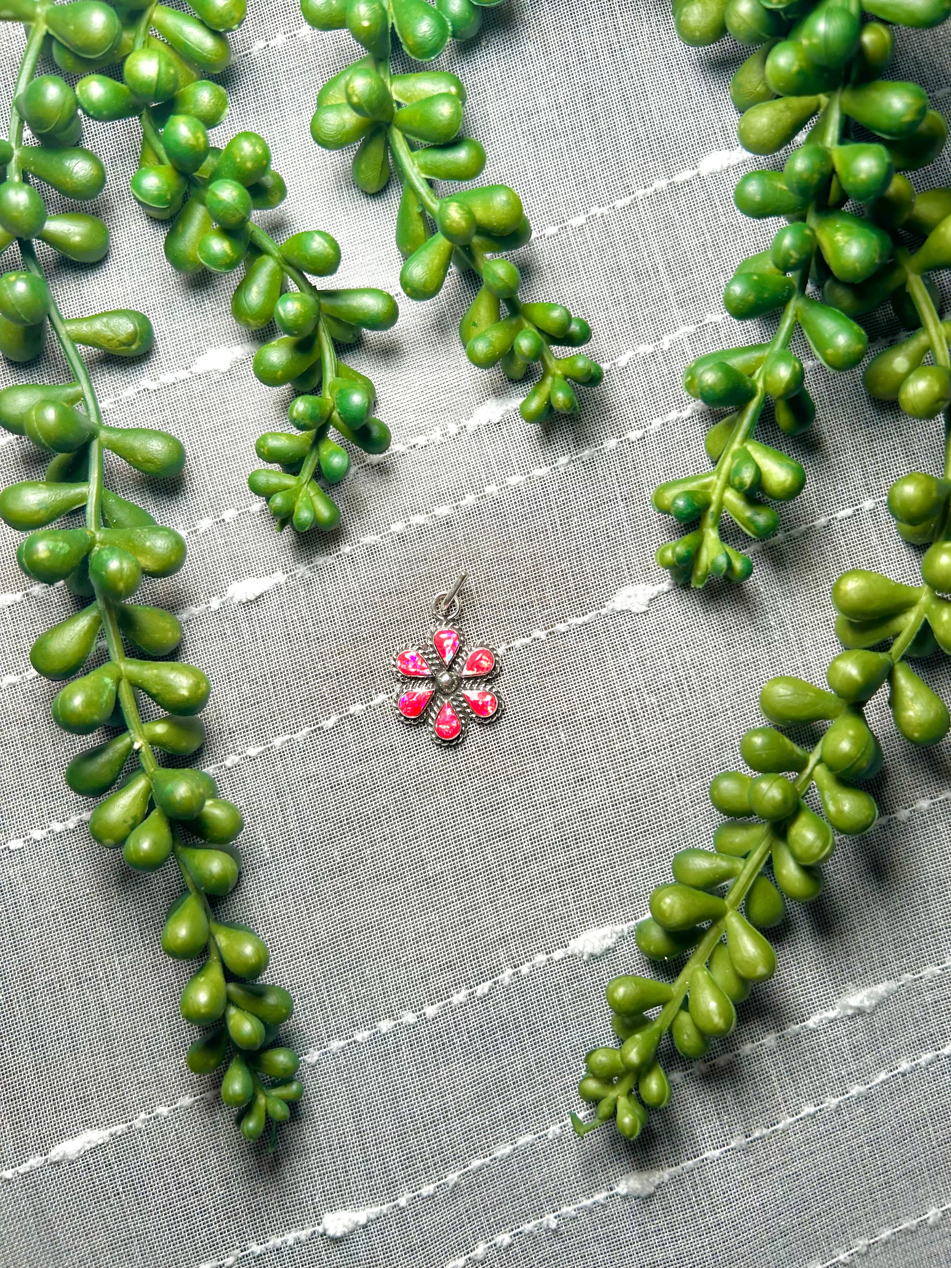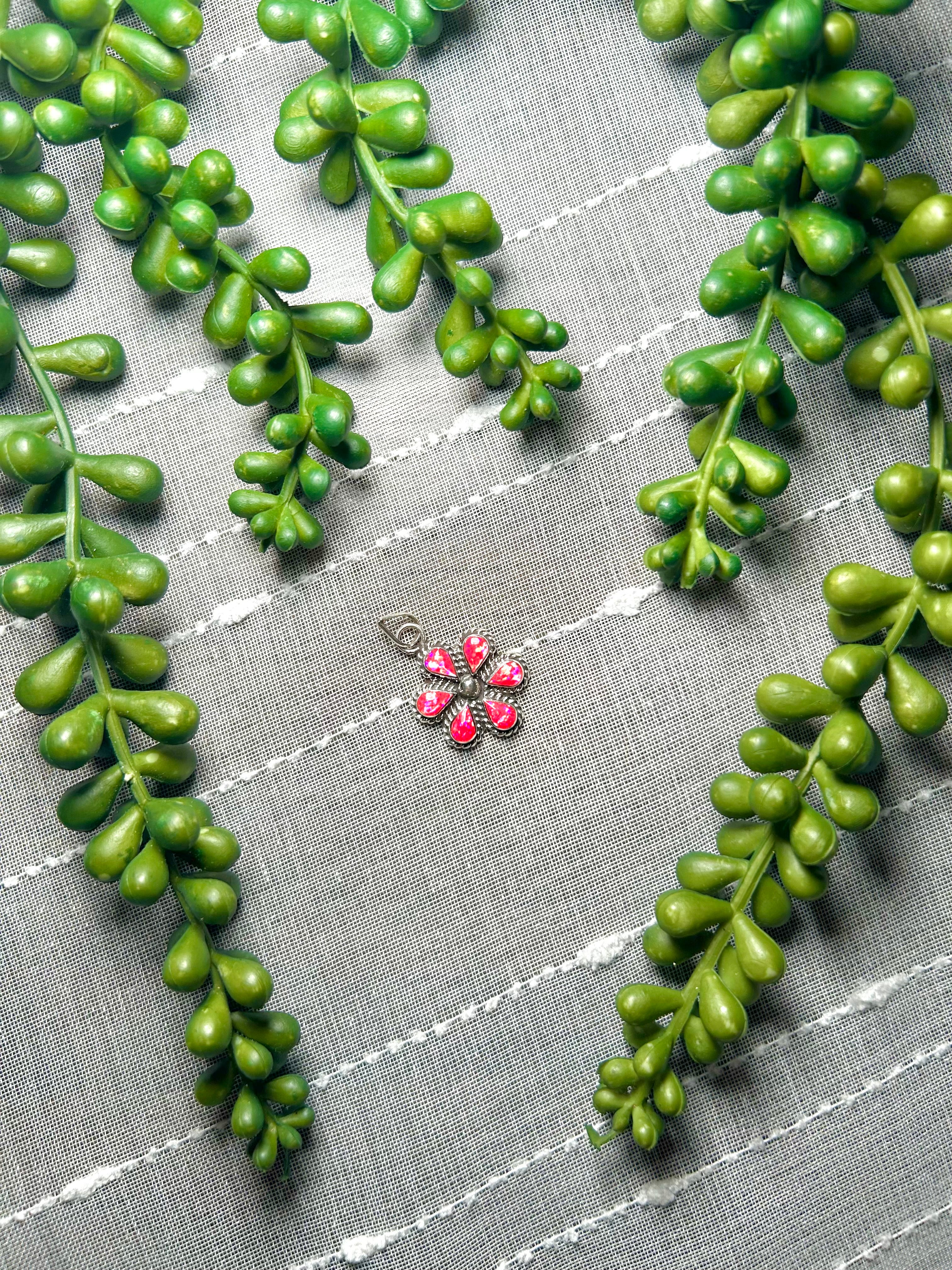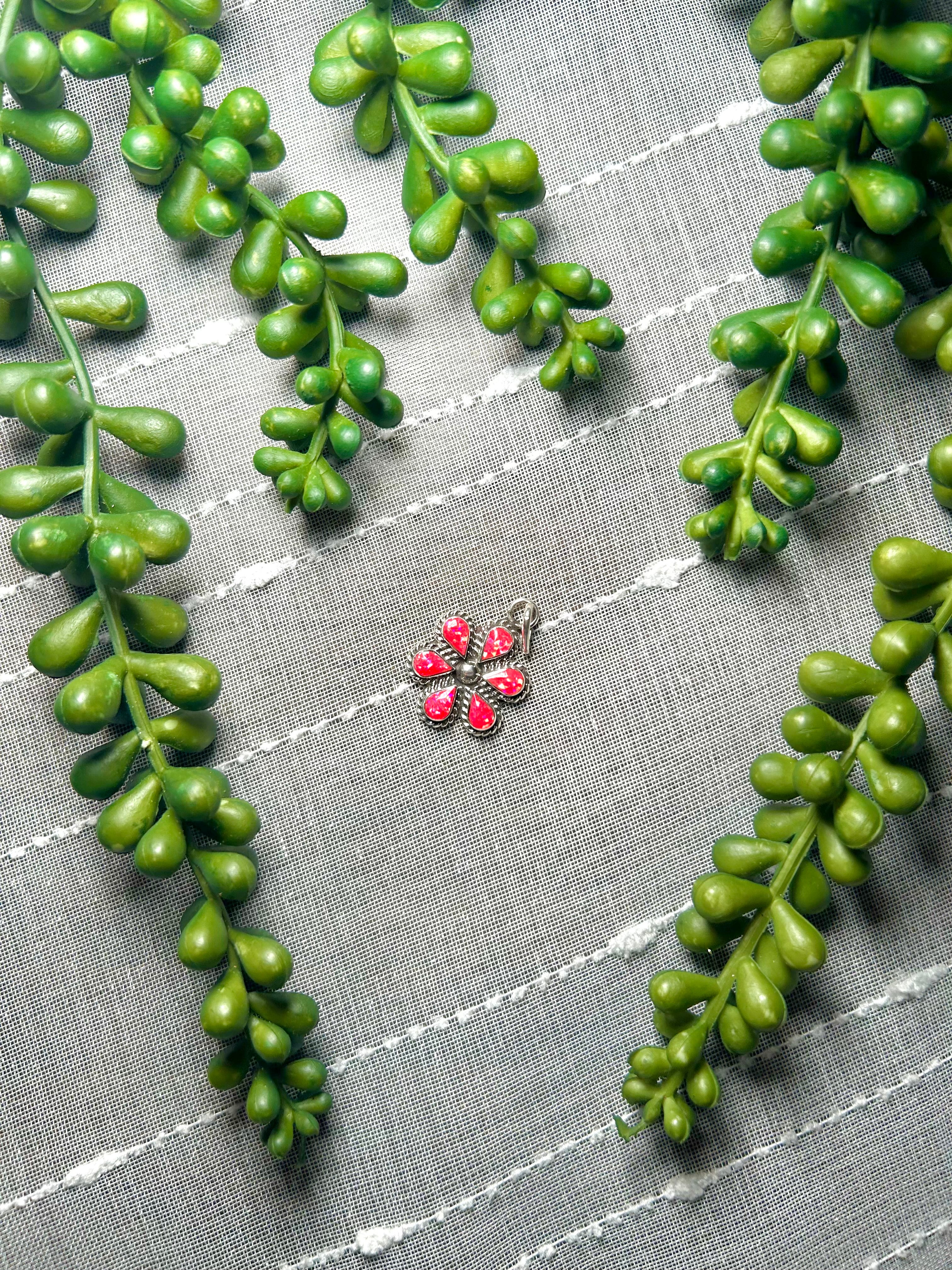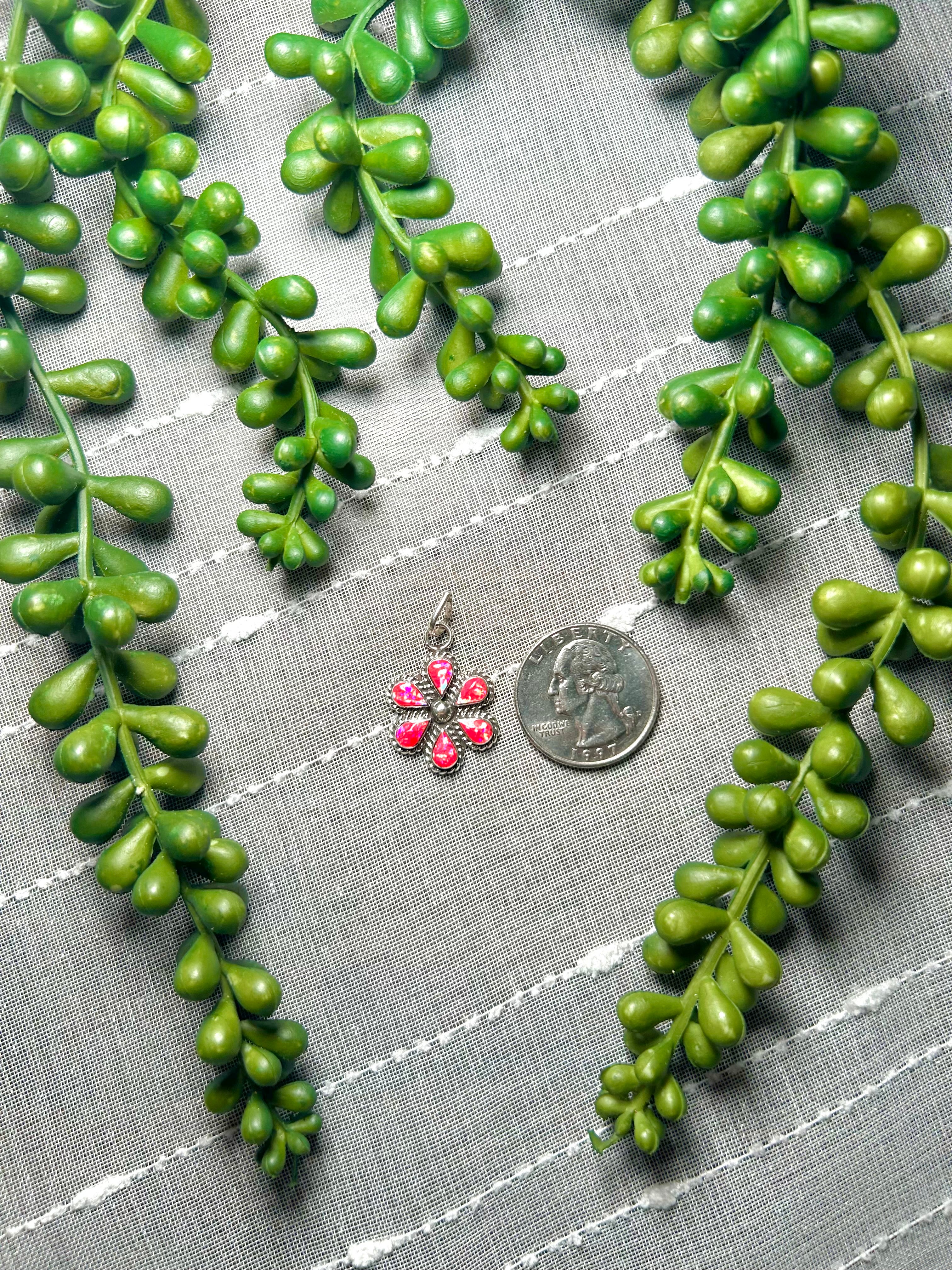 Zuni Man-Made Opal & Sterling Silver Pendant. It measures 1 1/4 inches long and 3/4 of an inch wide. Pendant Only! Signed by the artist and stamped sterling silver.