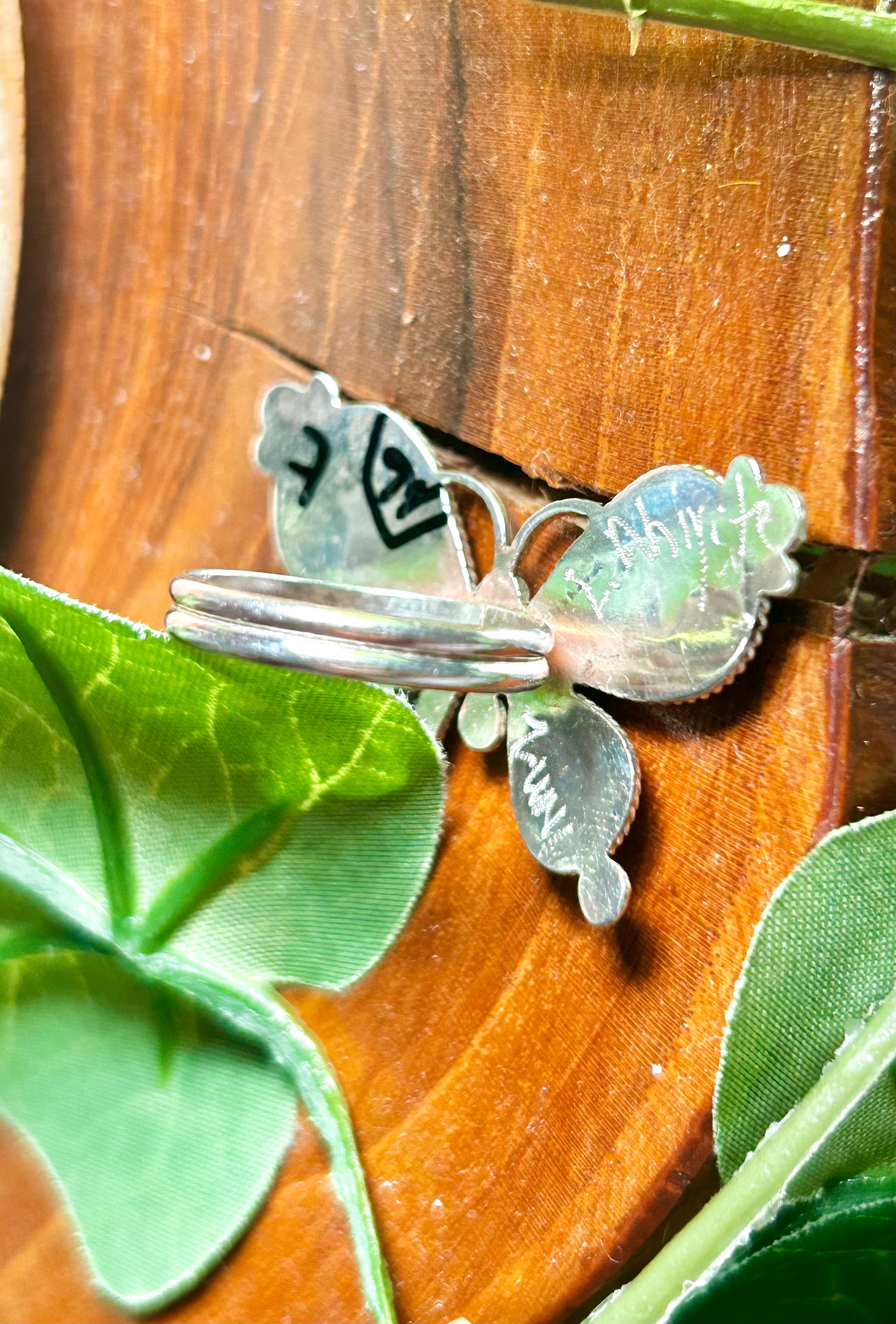 Zuni Made Multi Stone & Sterling Silver Ring Size 7. It measures 7/8 of an inch long and 1 1/2 inches wide. Signed by the artist and stamped sterling silver.