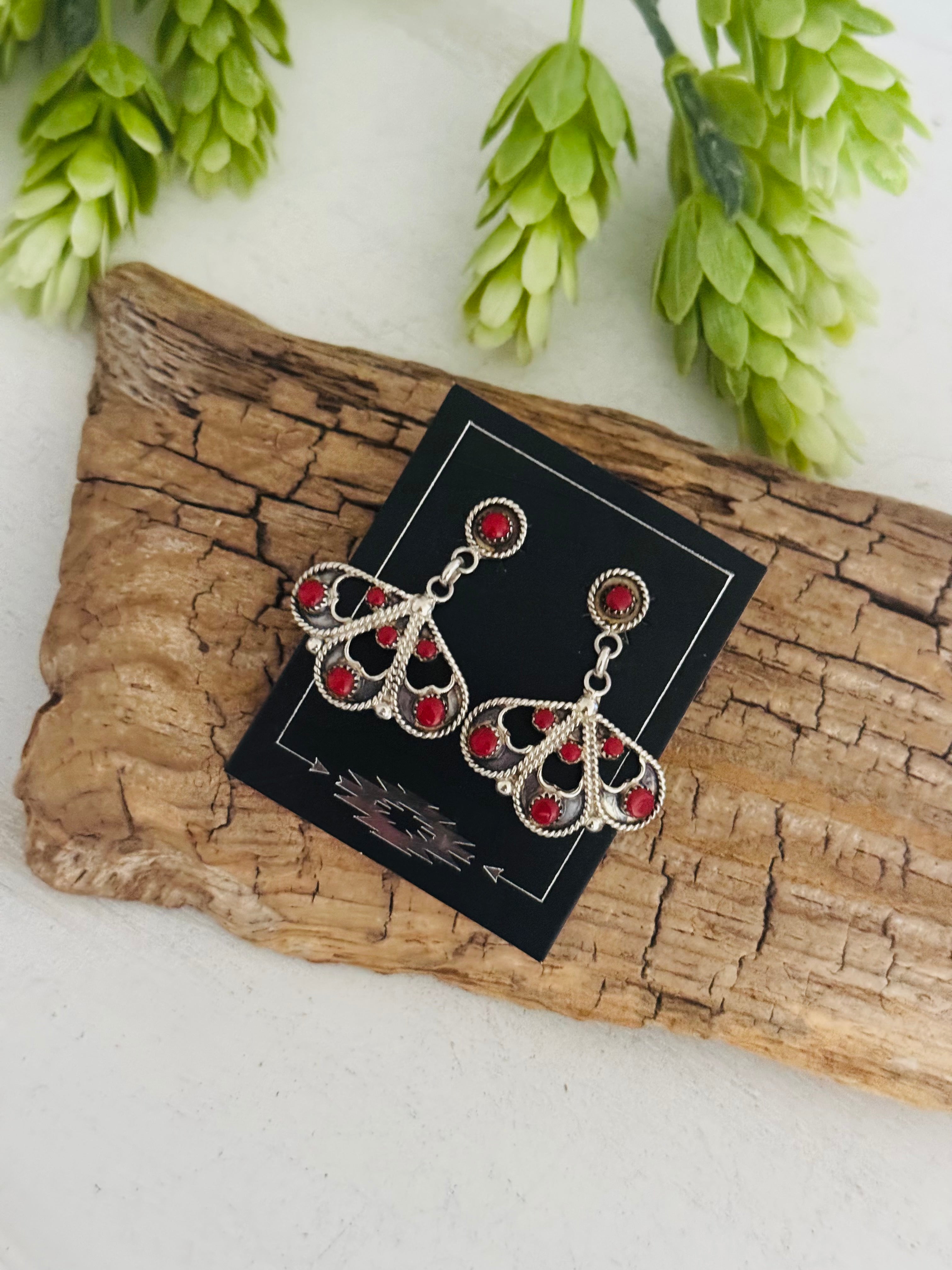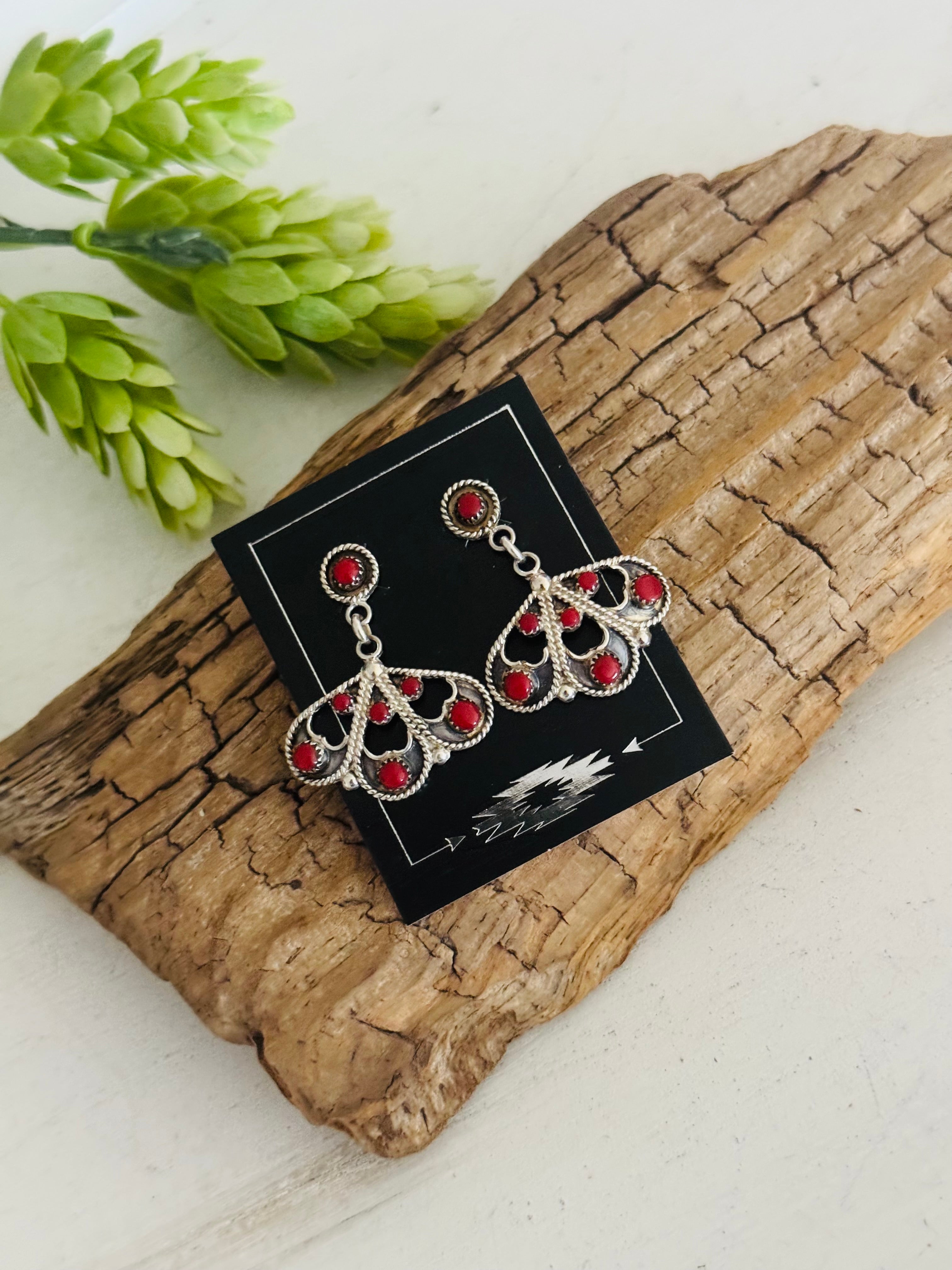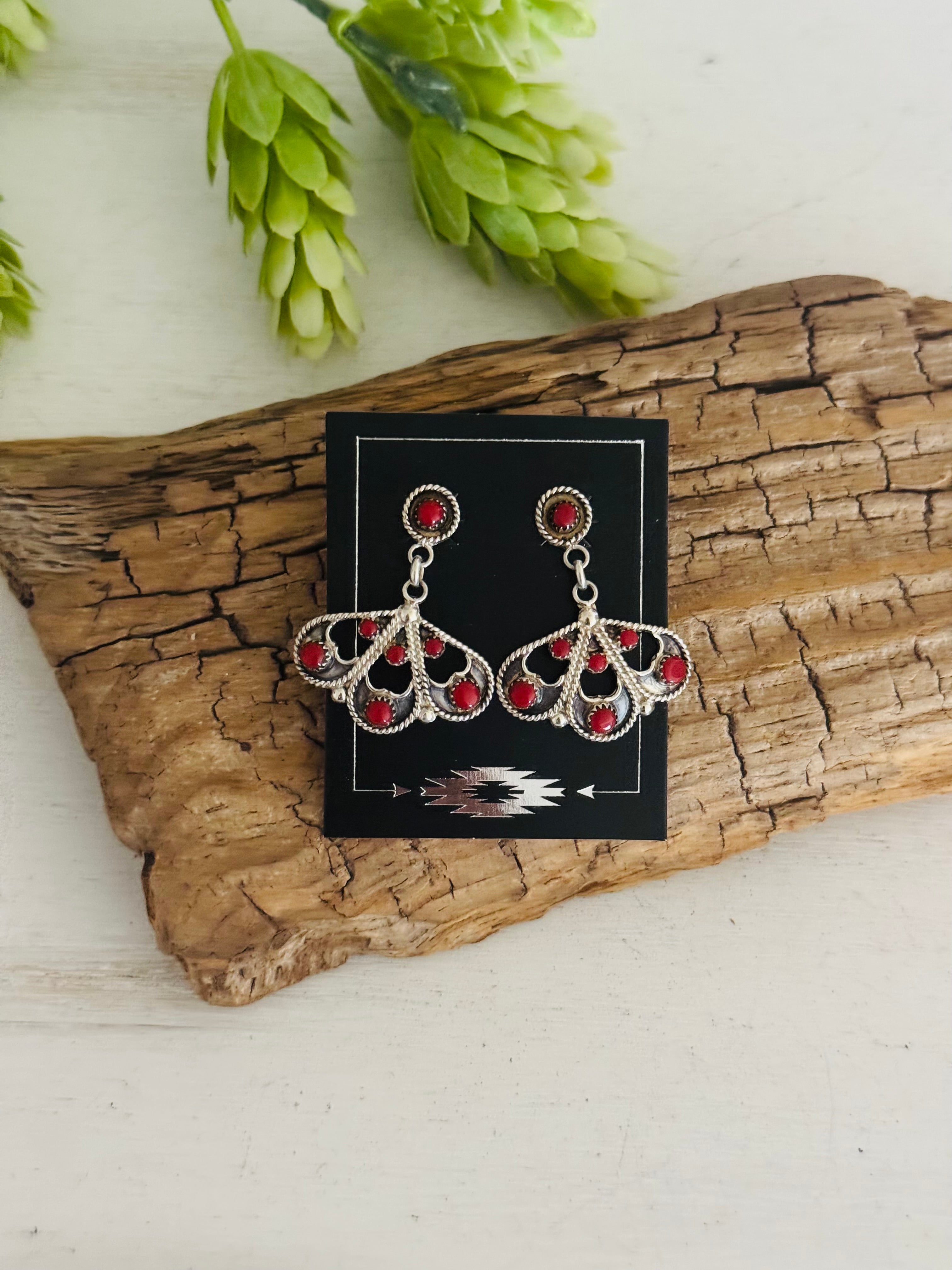 Zuni Made Red Coral & Sterling Silver Post Dangle Earrings