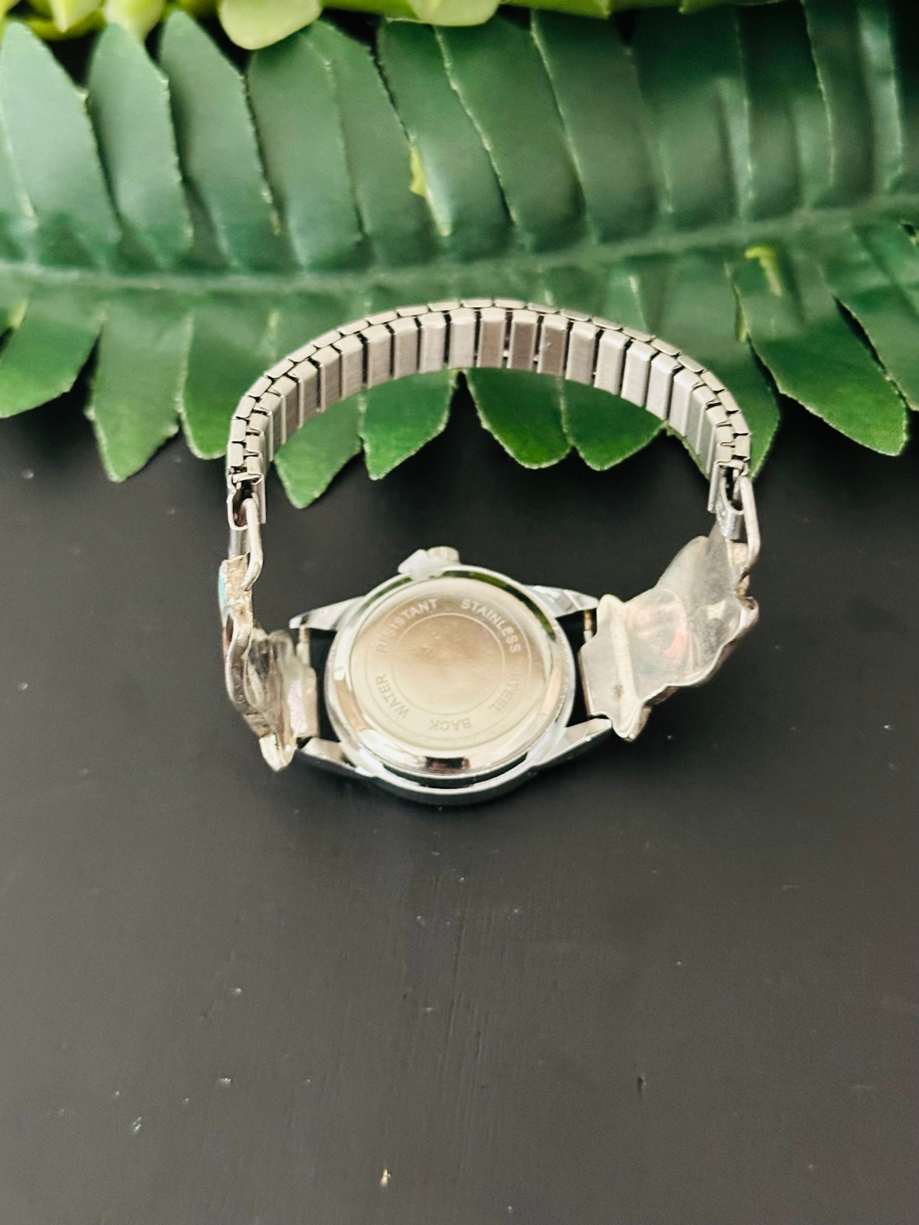 Zuni Made Multi Stone & Sterling Silver Inlay Adjustable Watch. It measures 3 1/2 inches long and 1 inch wide. Watch bands are sterling silver but watch face and extender are stainless steel.