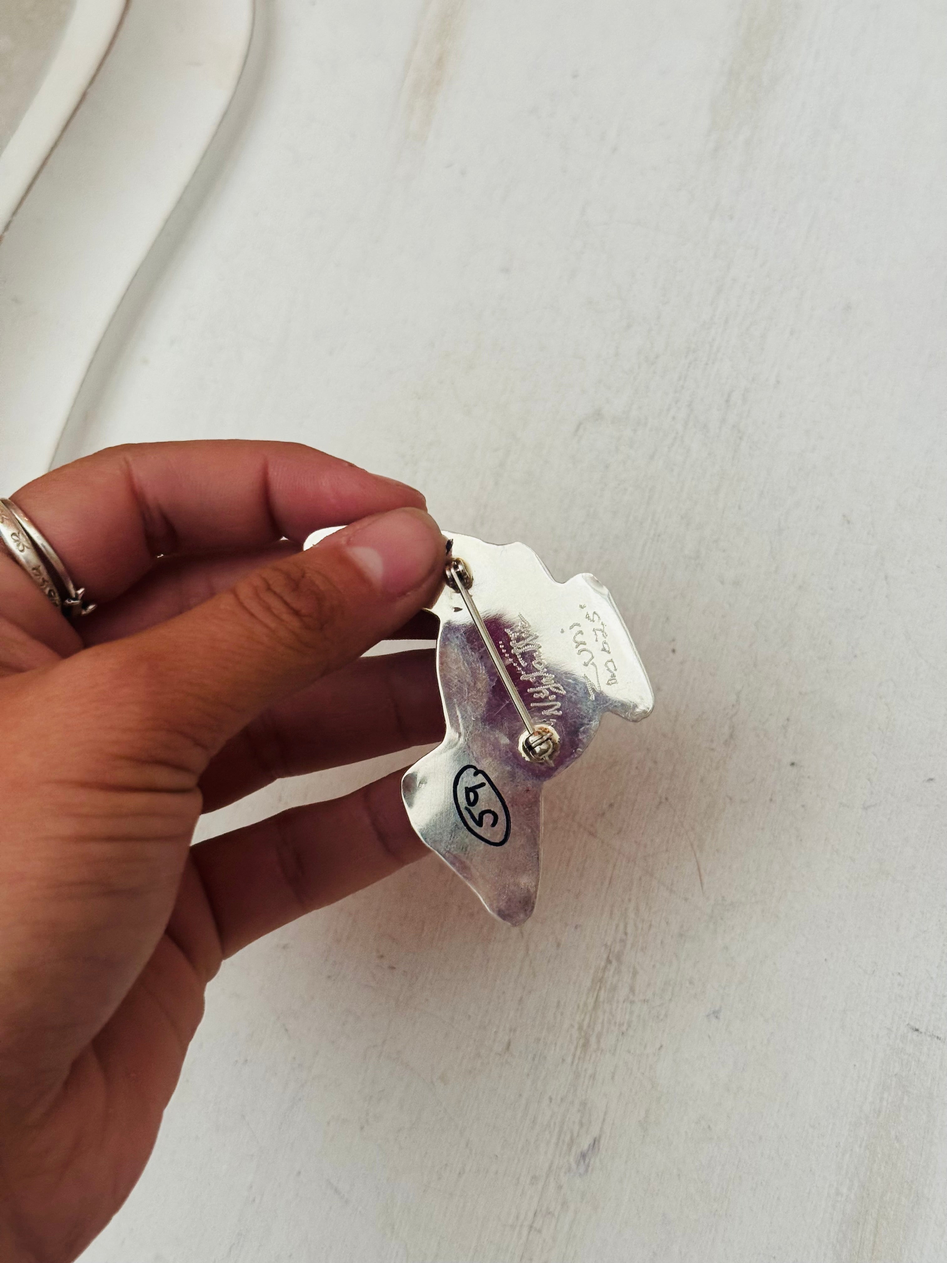 Zuni Made Mother of Pearl & Sterling Silver Roadrunner Pin. It measures 1 5/8 inches long and 2 1/2 inches wide. Signed by the artist and stamped sterling silver.