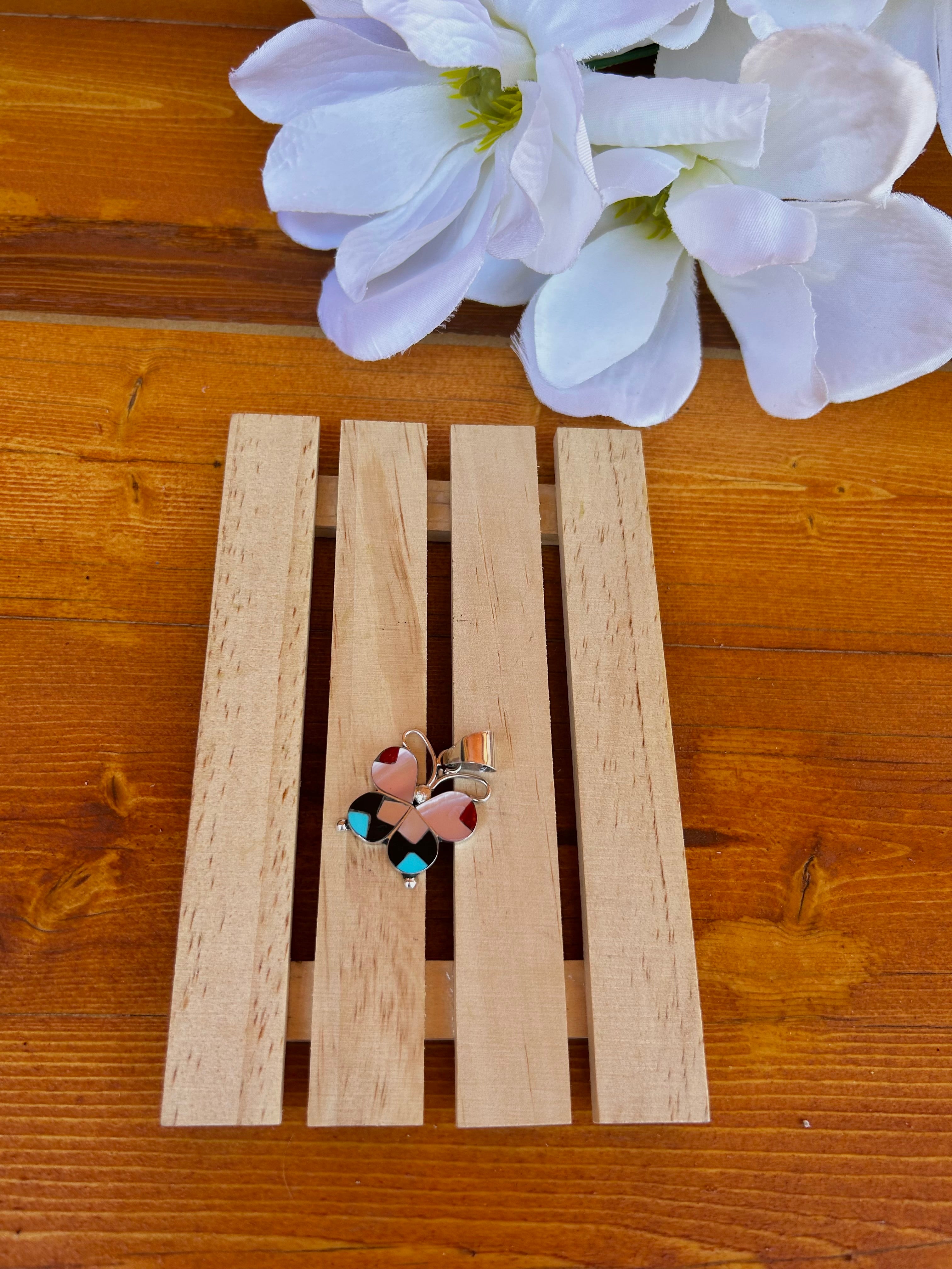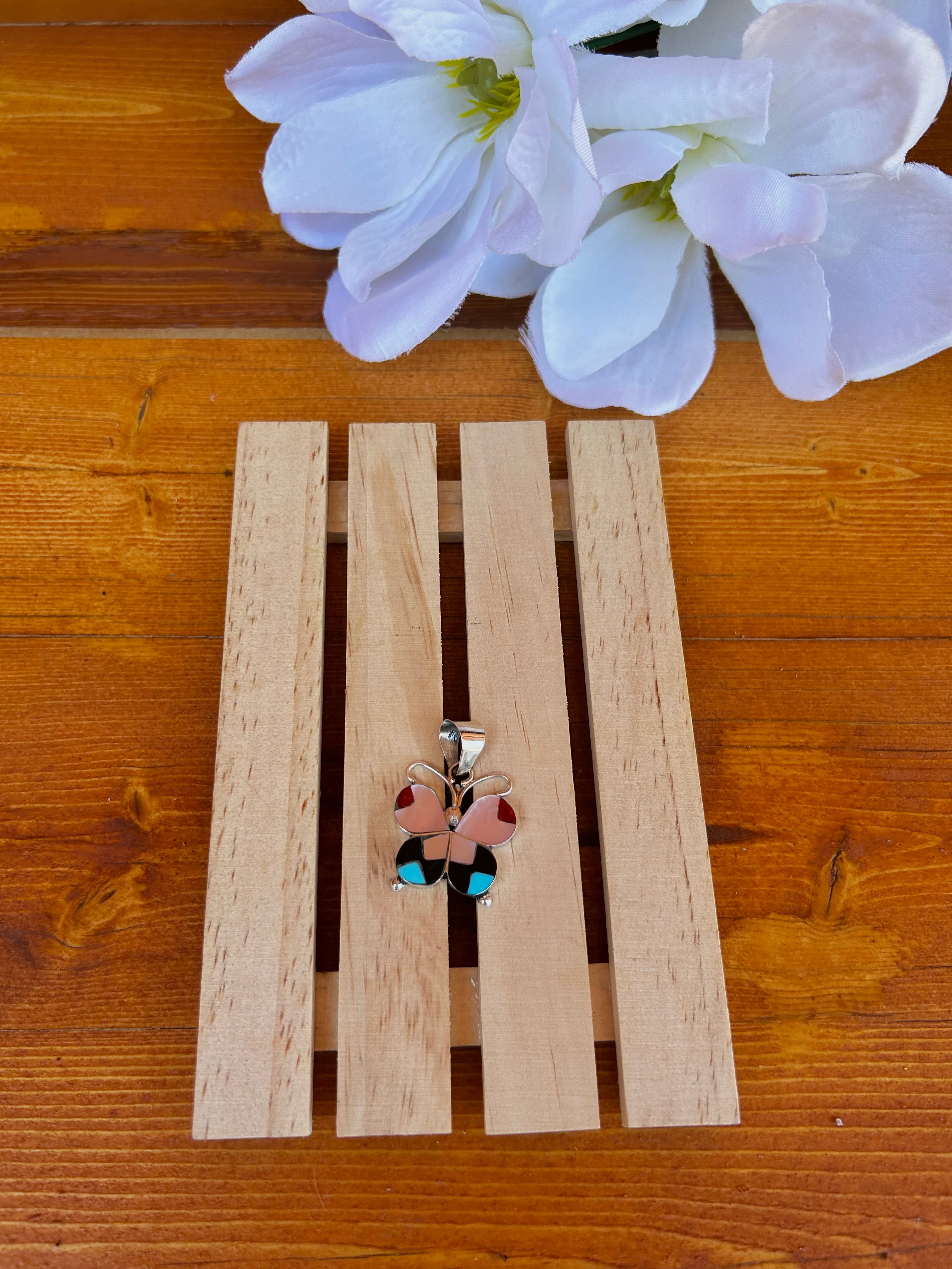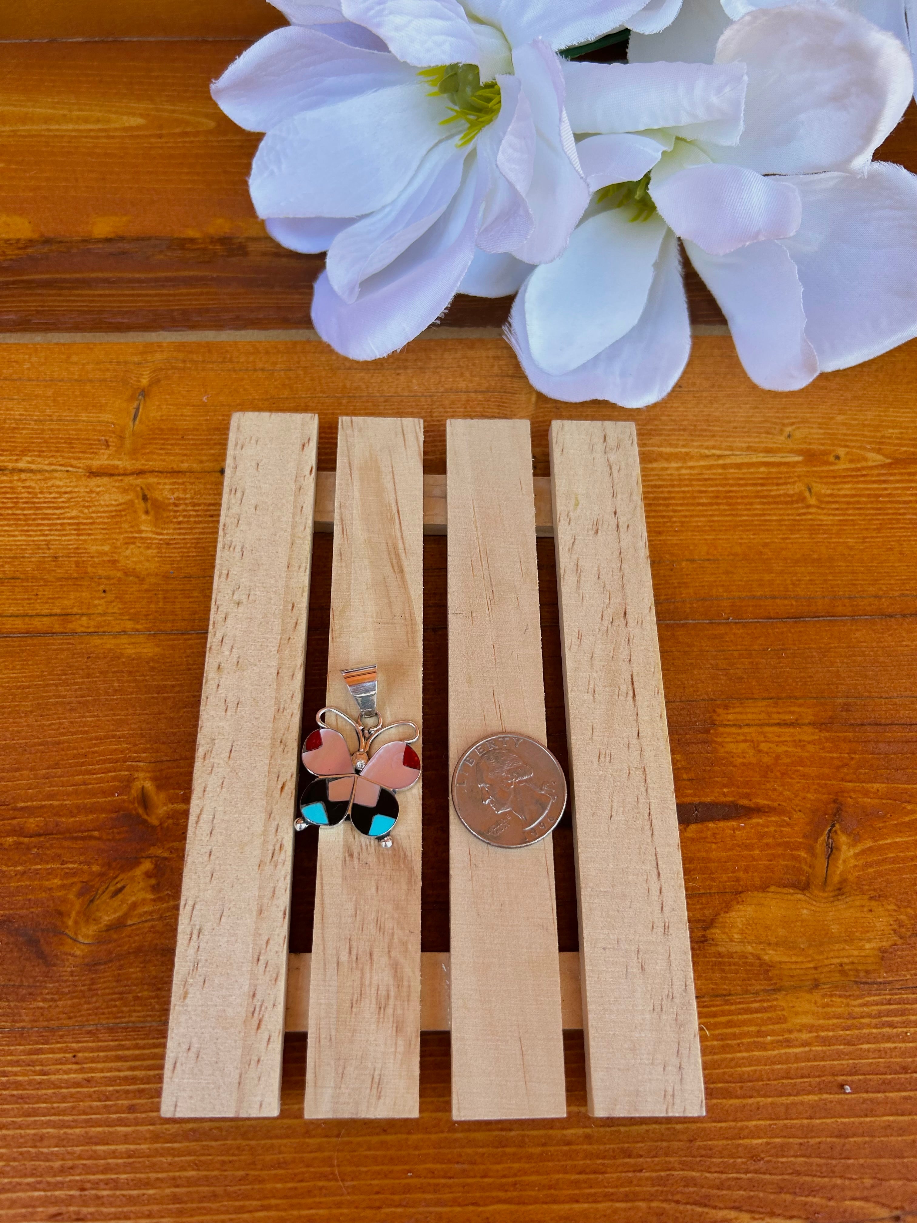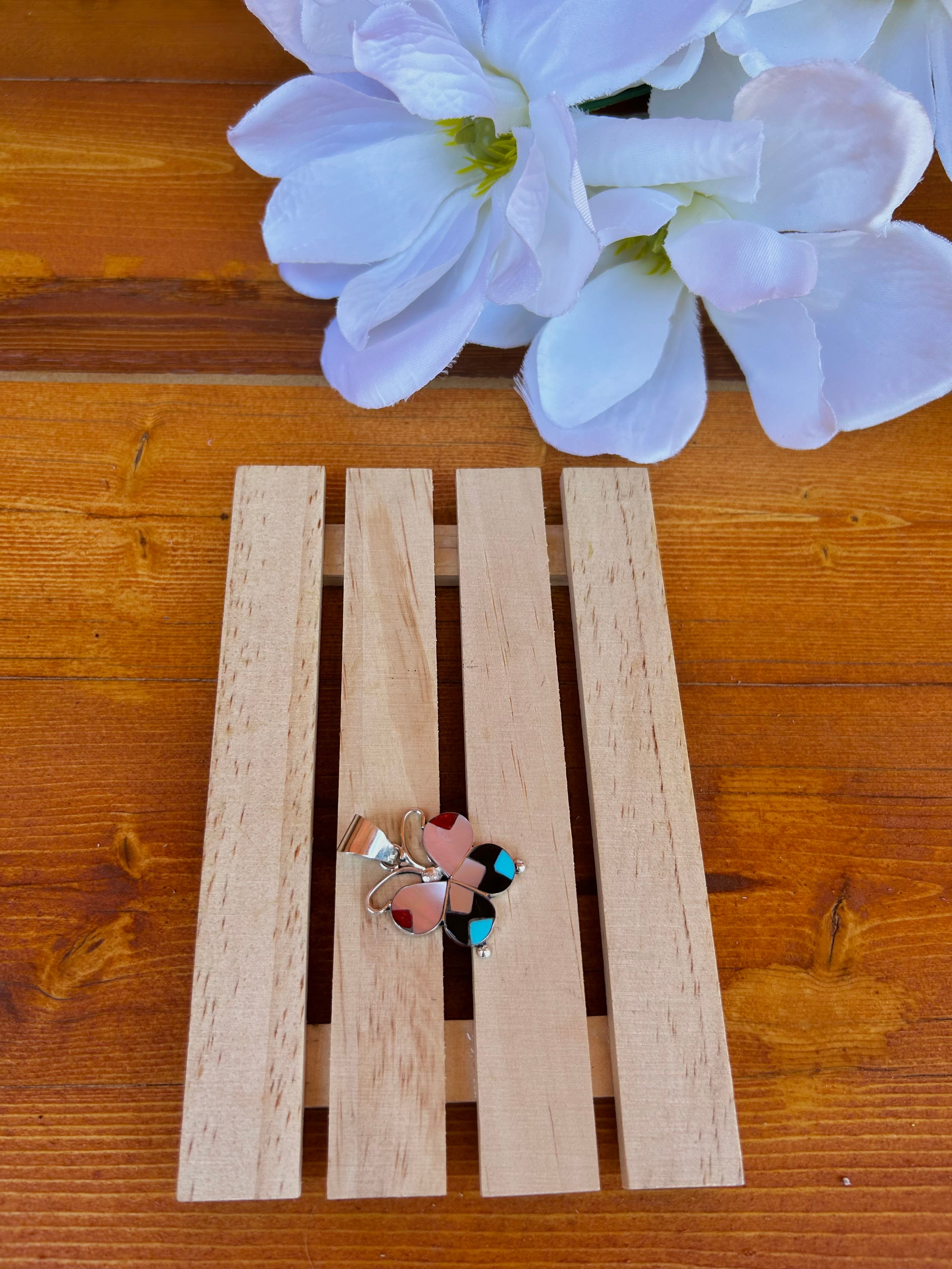 Zuni Multi Stone Inlay & Sterling Silver Pendant. It measures 1 1/2 inches long and 1 inch wide. Pendant Only. Signed by the artist and stamped sterling silver.