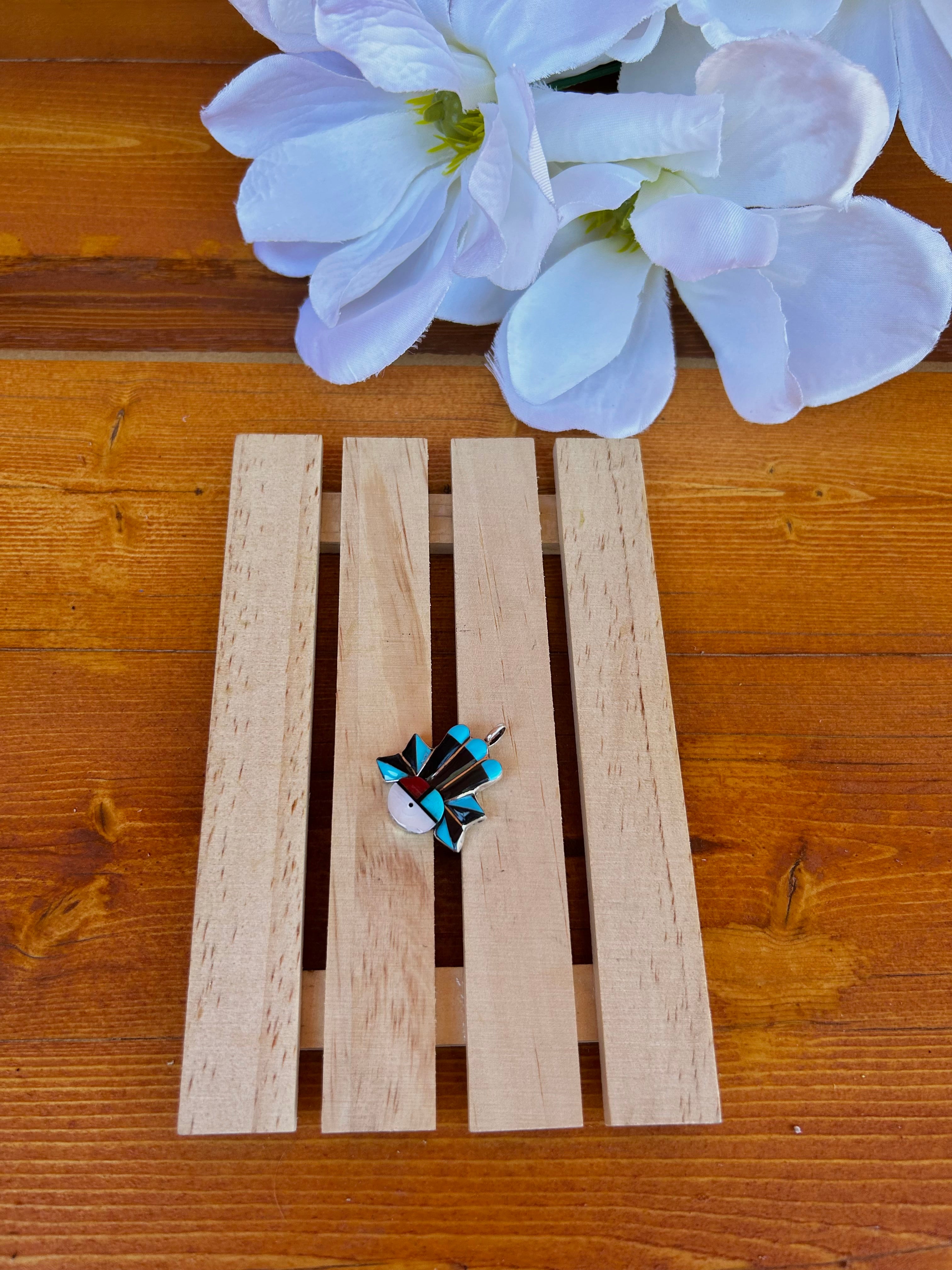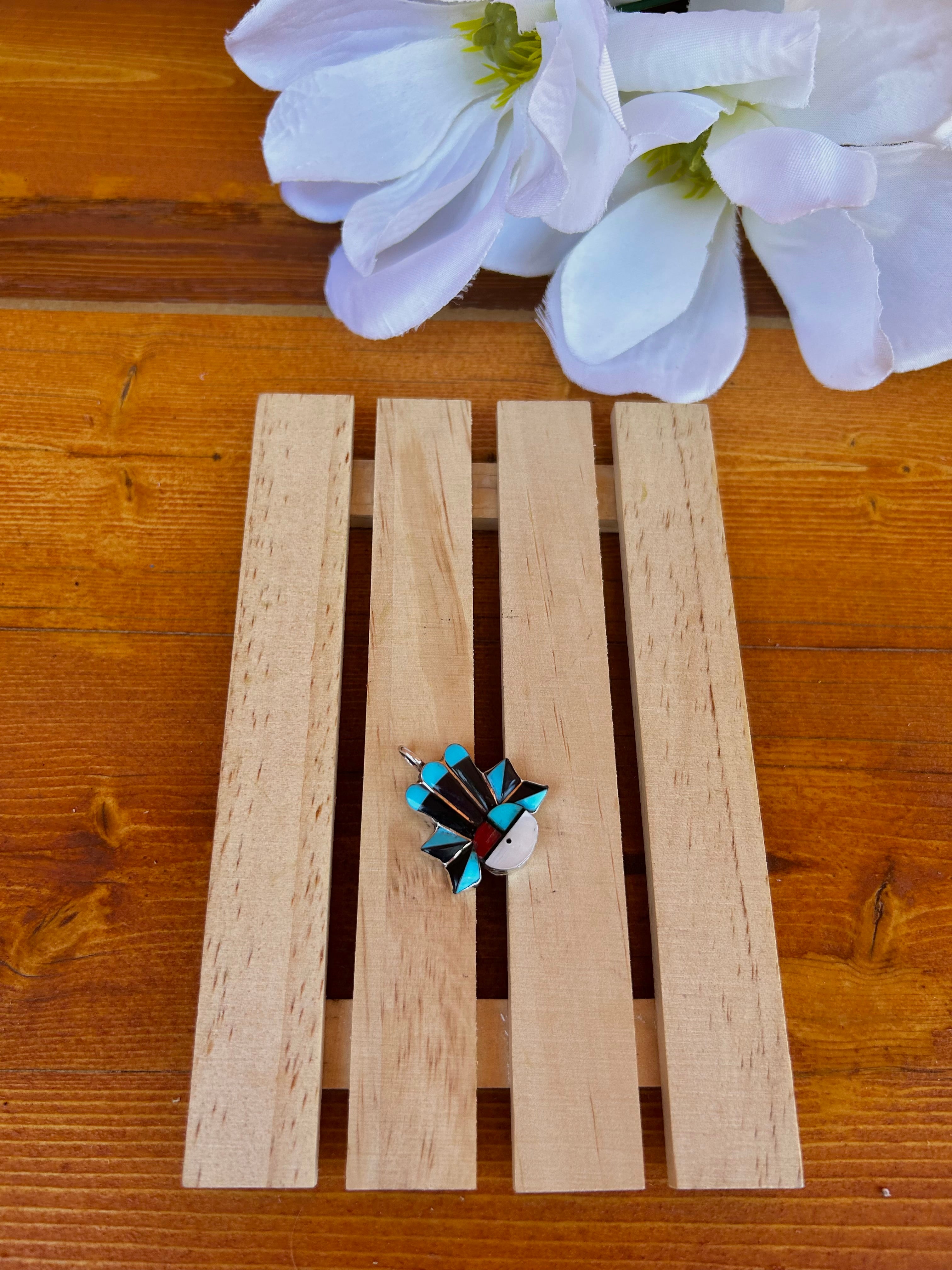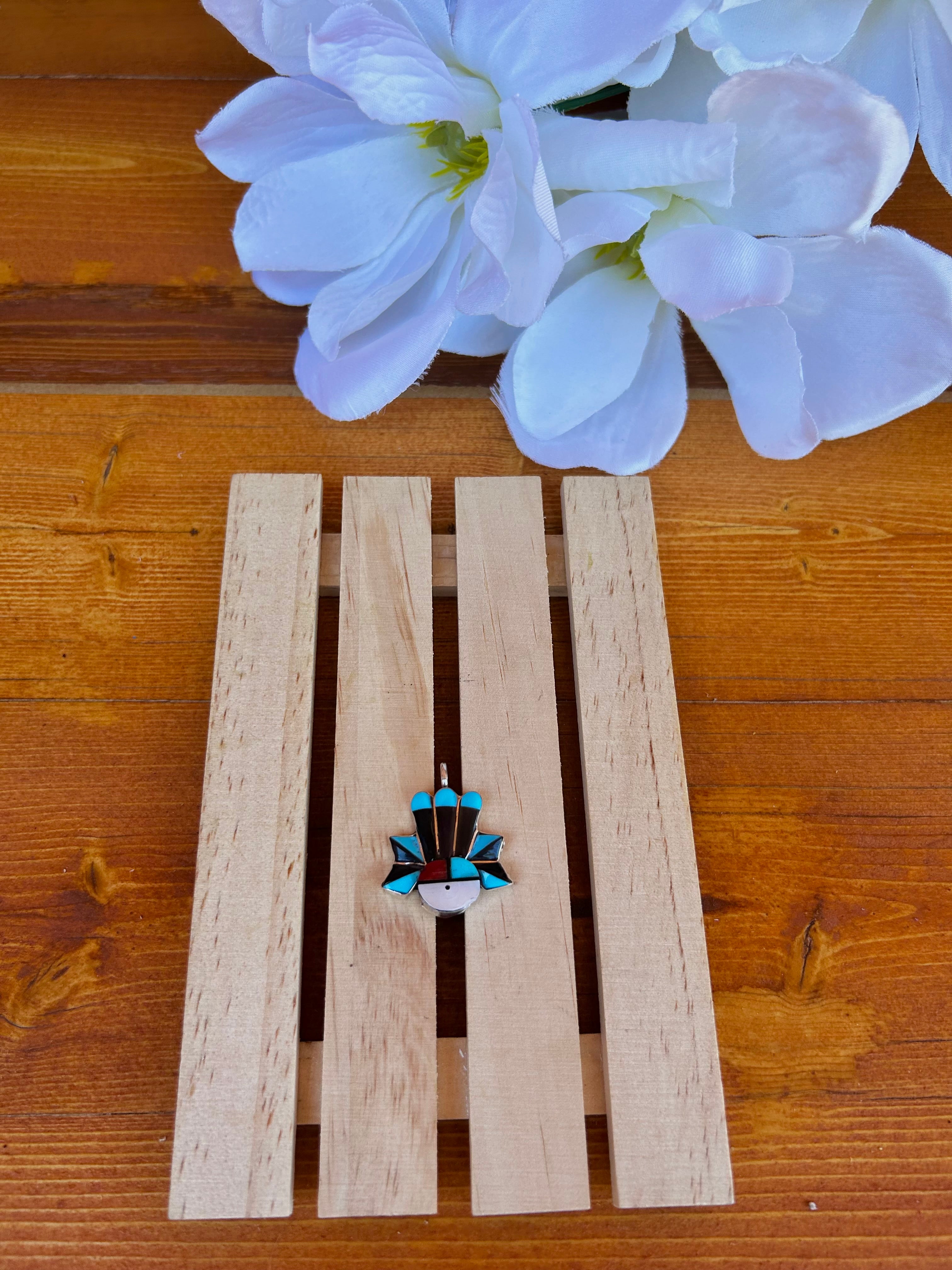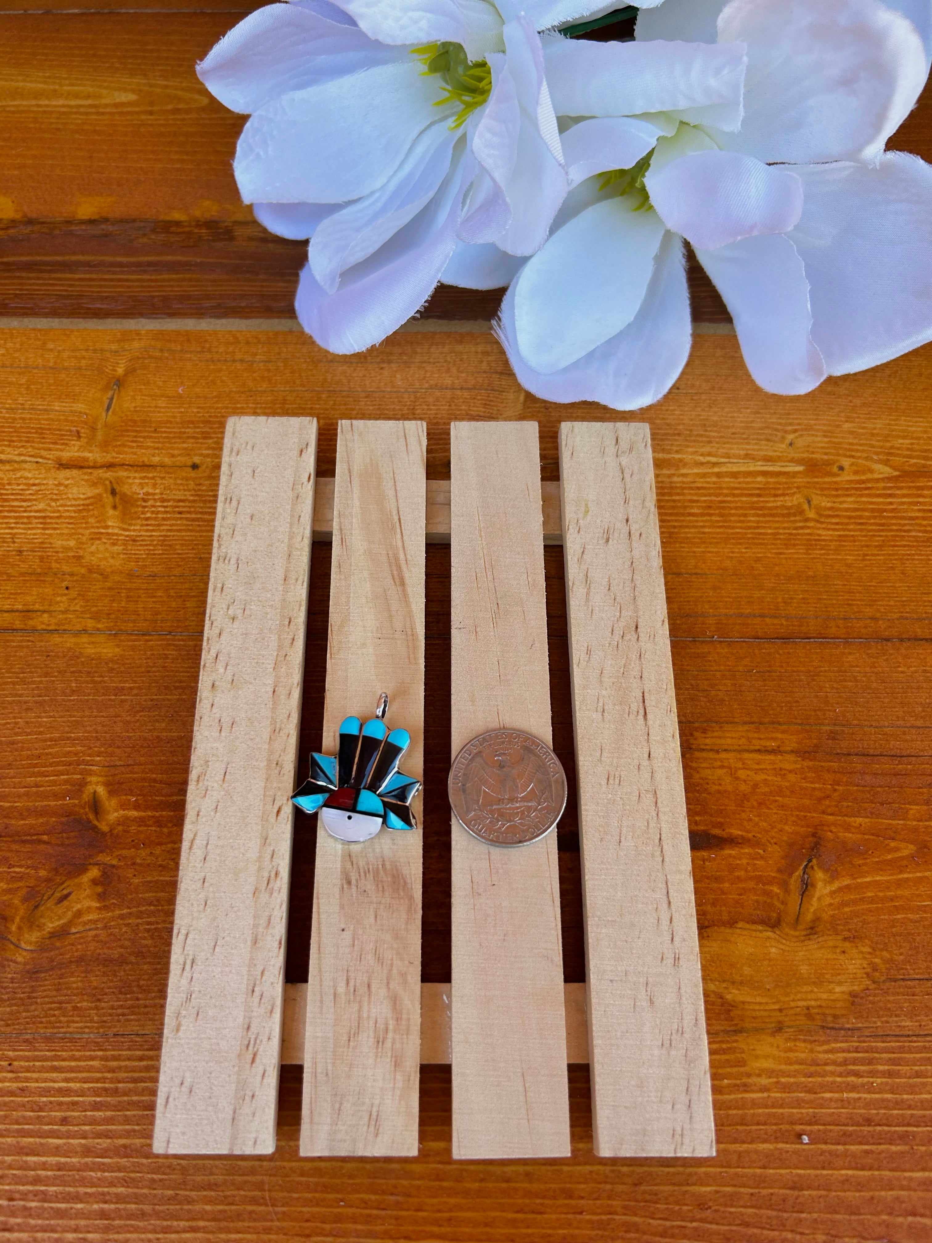 Zuni Multi Stone Inlay & Sterling Silver Pendant. It measures 1 1/4 inches long and 1 inch wide. Pendant Only. Signed by the artist and stamped sterling silver.