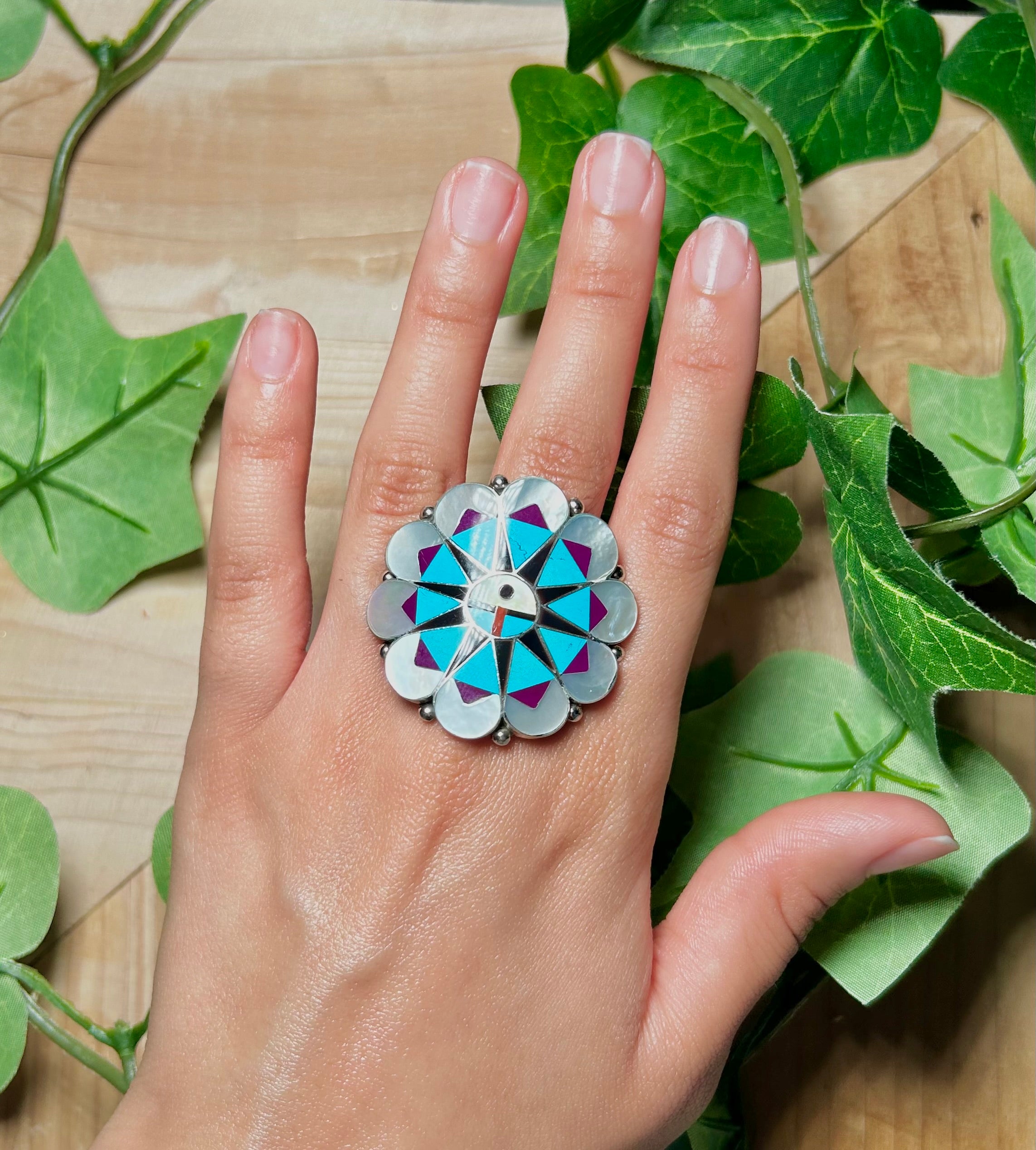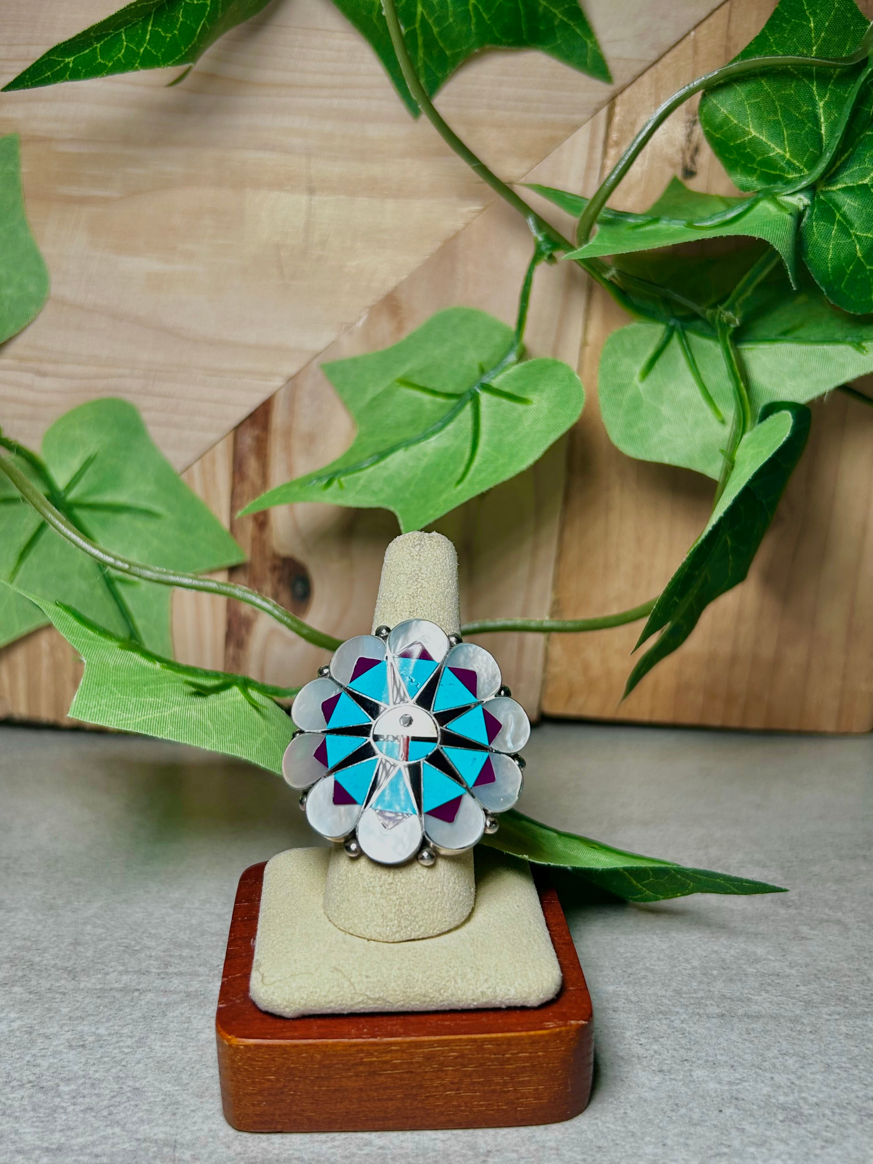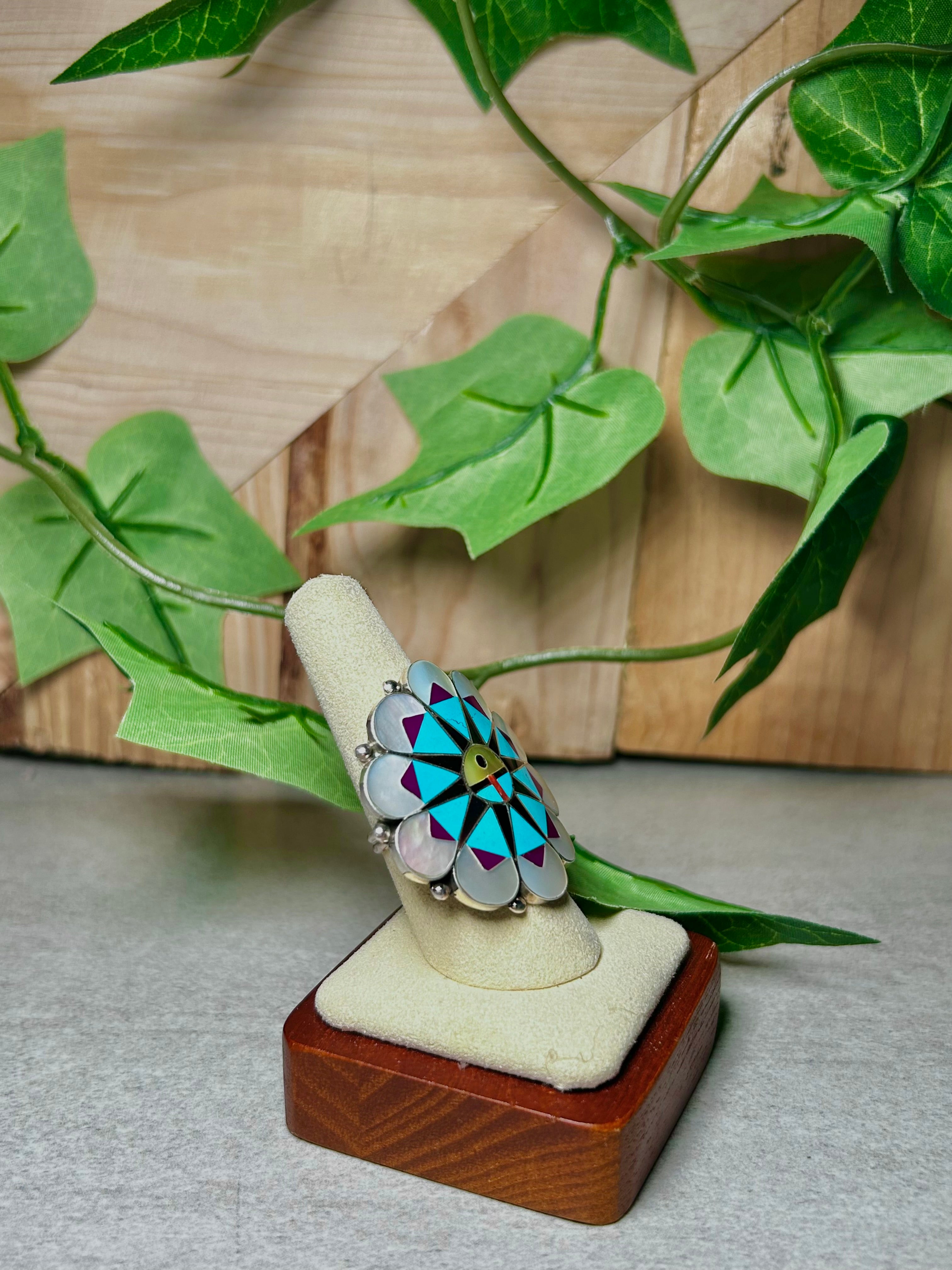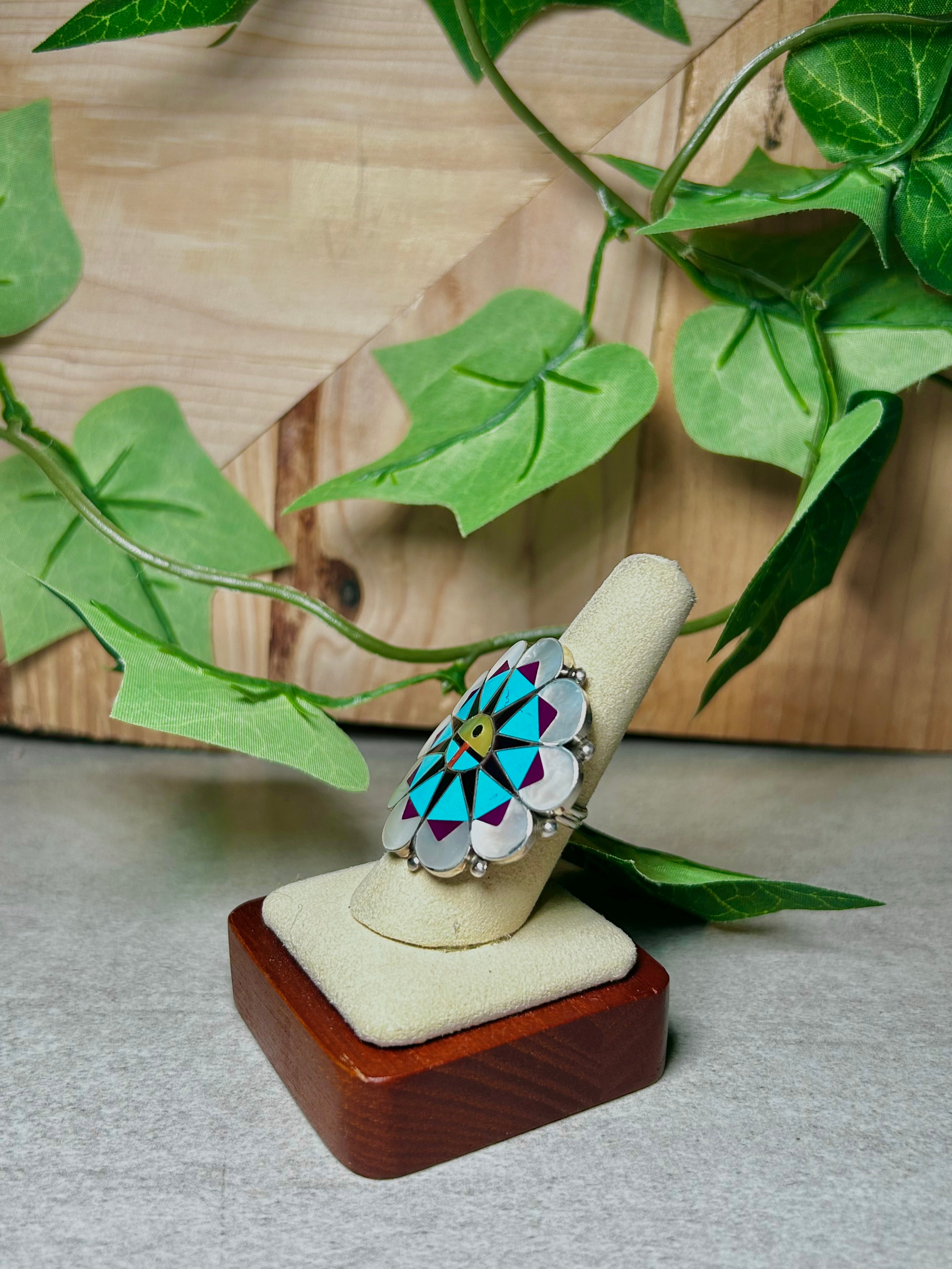 Zuni Multi Stone Inlay & Sterling Silver Ring Size 8.25. It measures 1 1/2 inches long and 1 1/2 inches wide. Signed by the artist and stamped sterling silver.