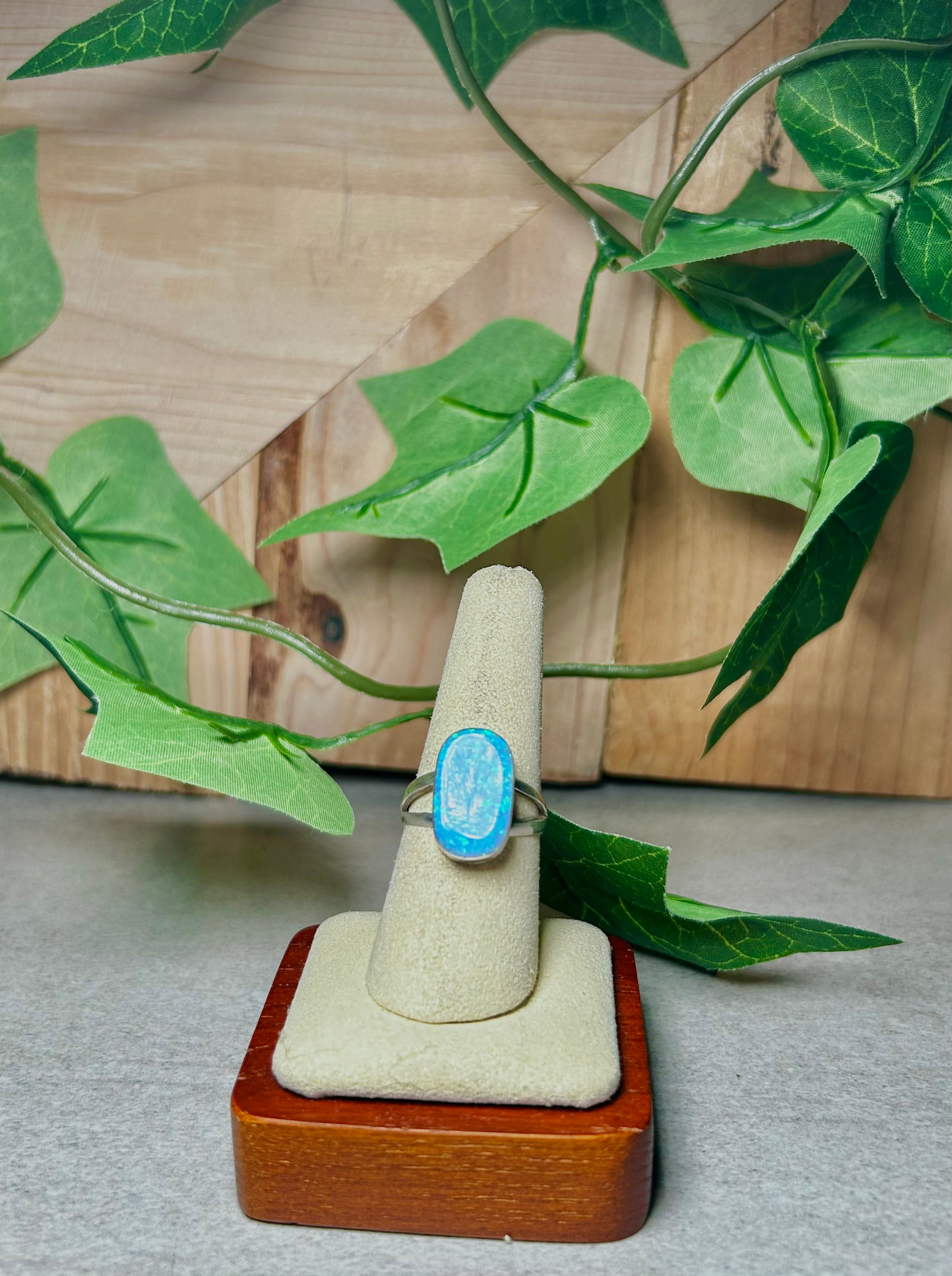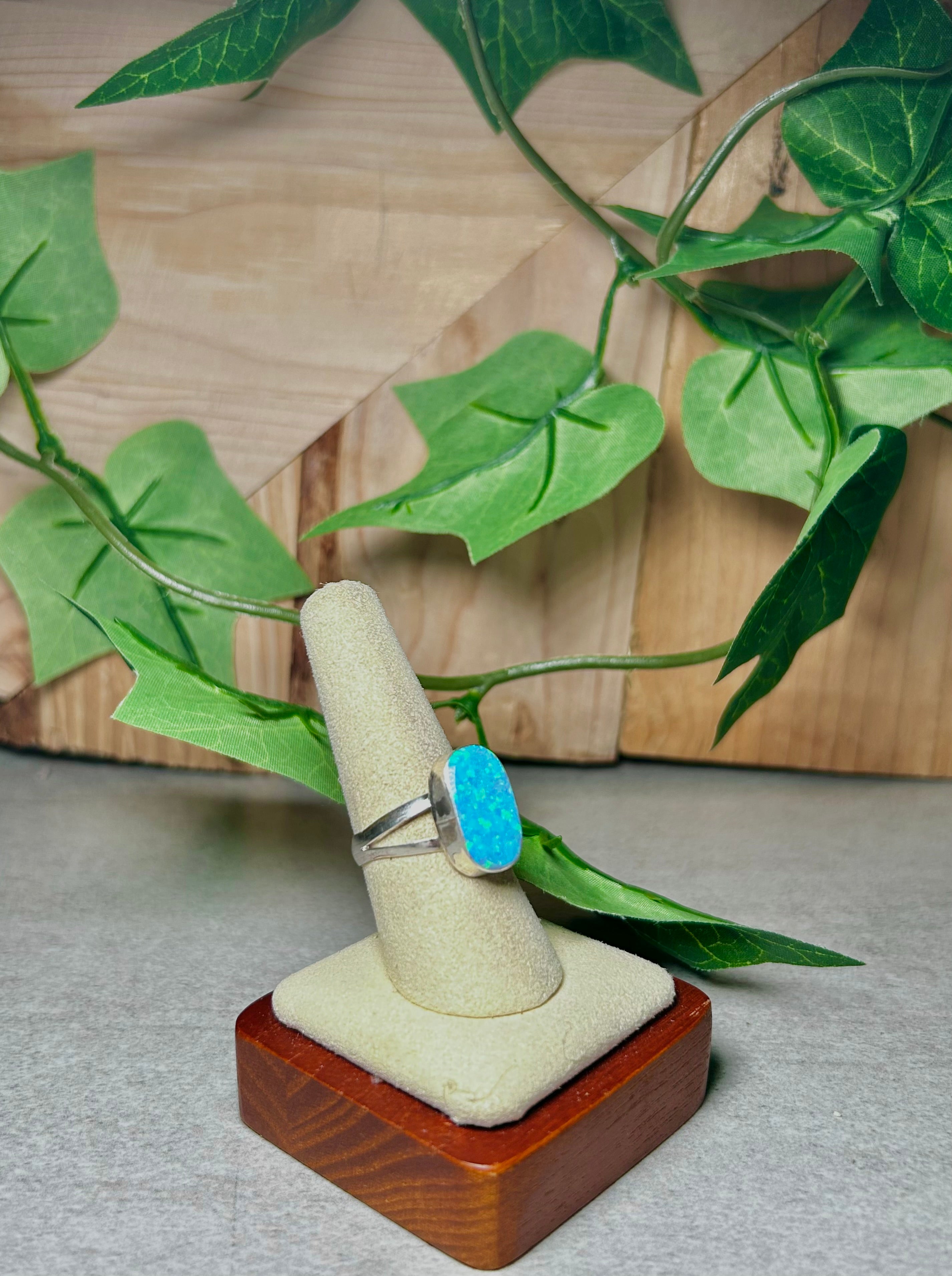 Victor Thompson Opal & Sterling Silver Ring. It measures 5/8 of an inch long and 3/8 of an inch wide. Signed by the artist and stamped sterling silver.