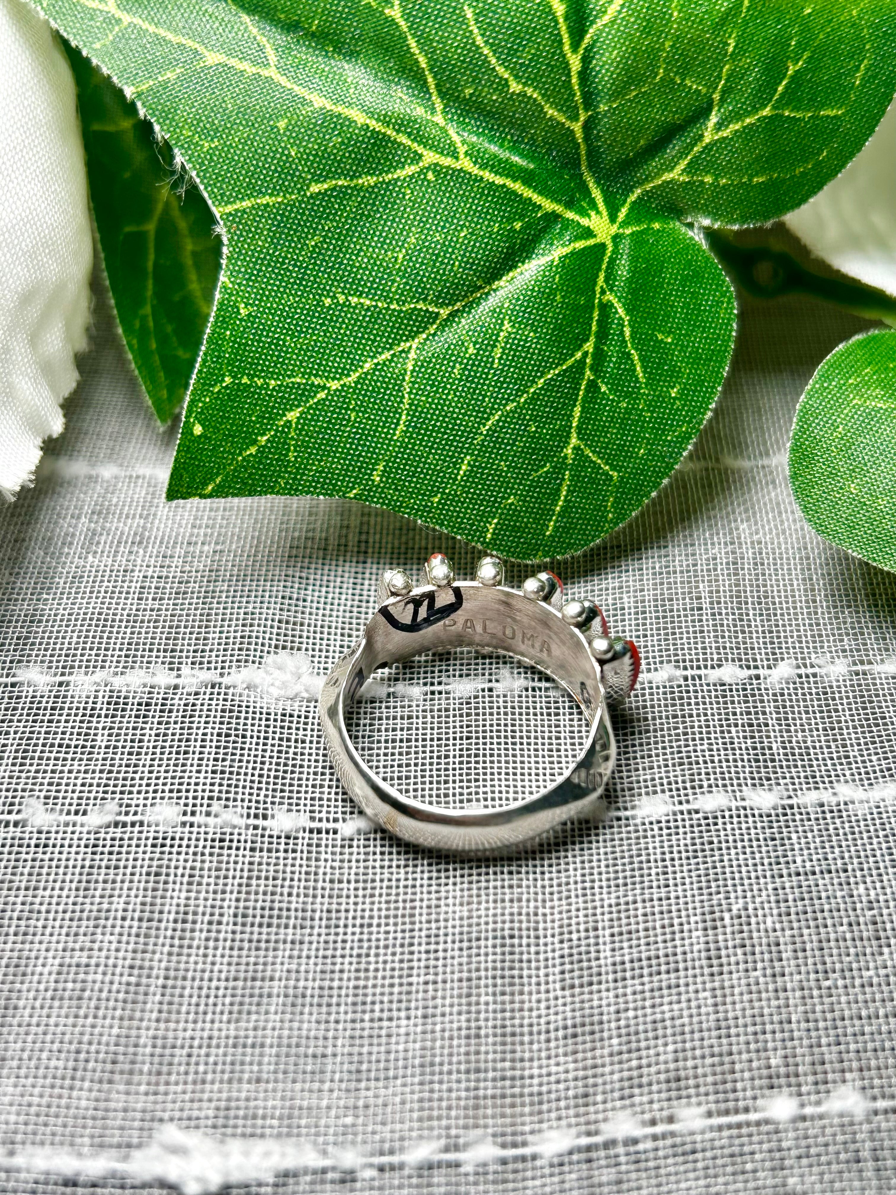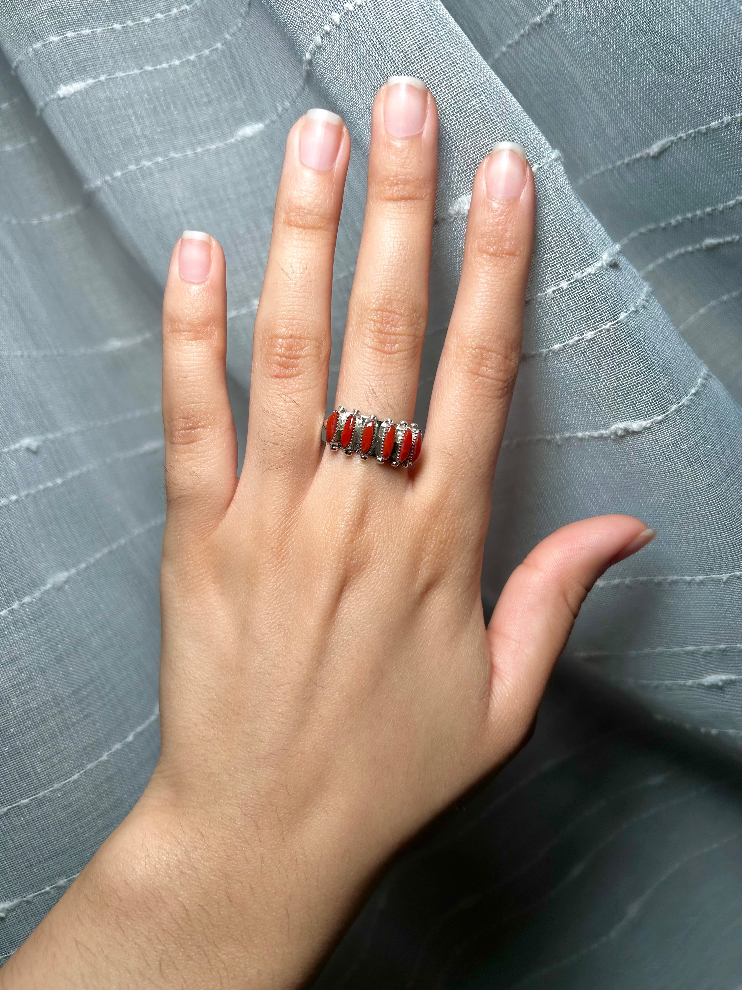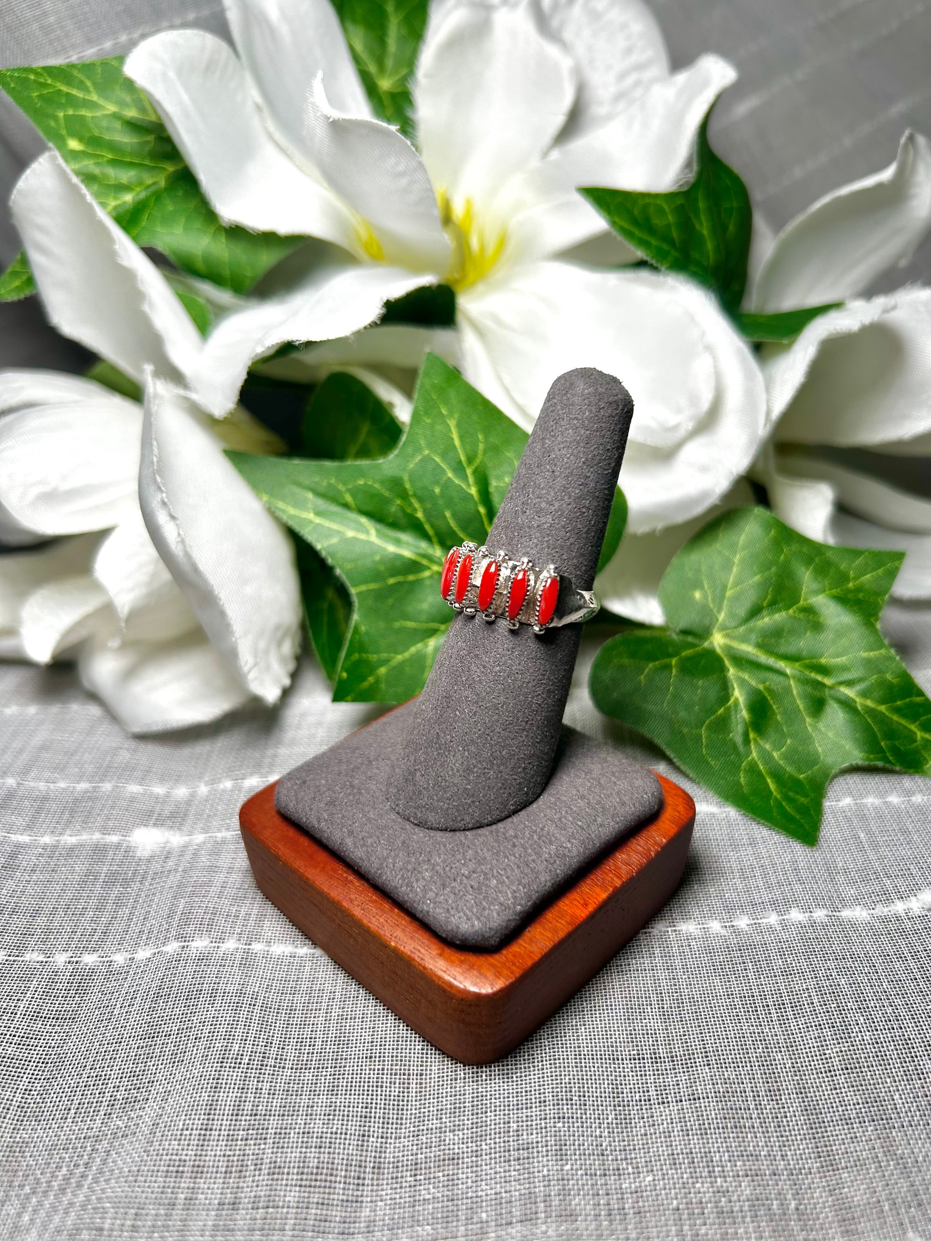 Zuni Coral & Sterling Silver Ring. It measures 3/8 of an inch long and 3/4 of an inch wide. Signed by the artist and stamped sterling silver.