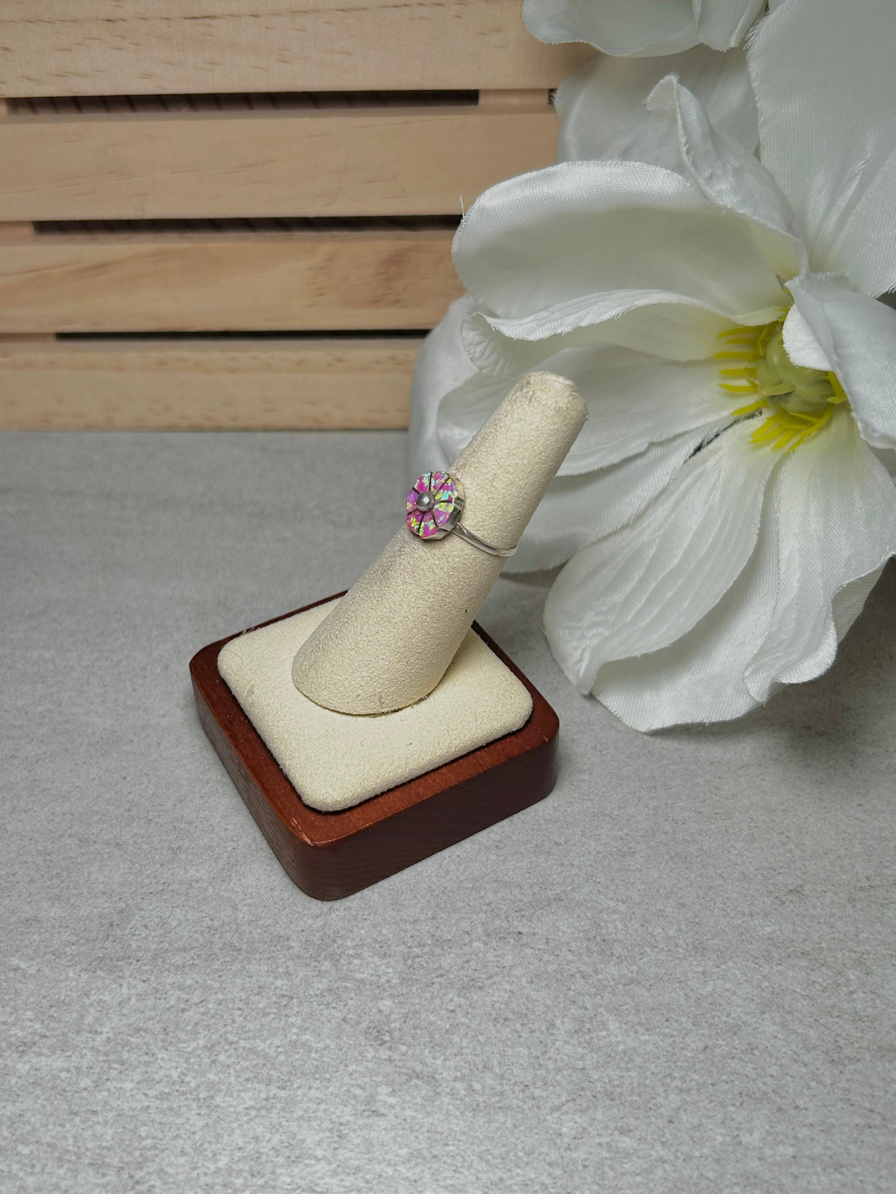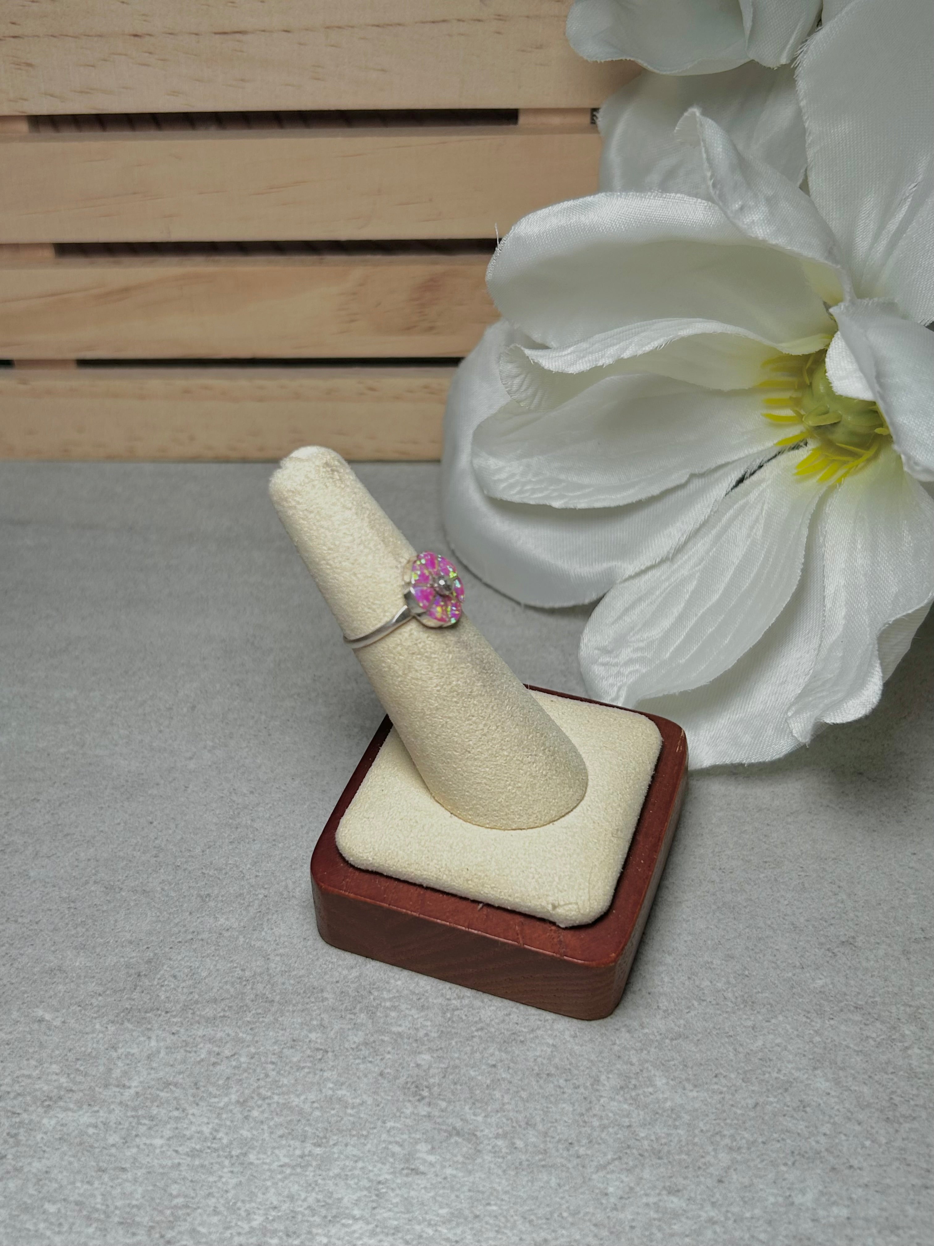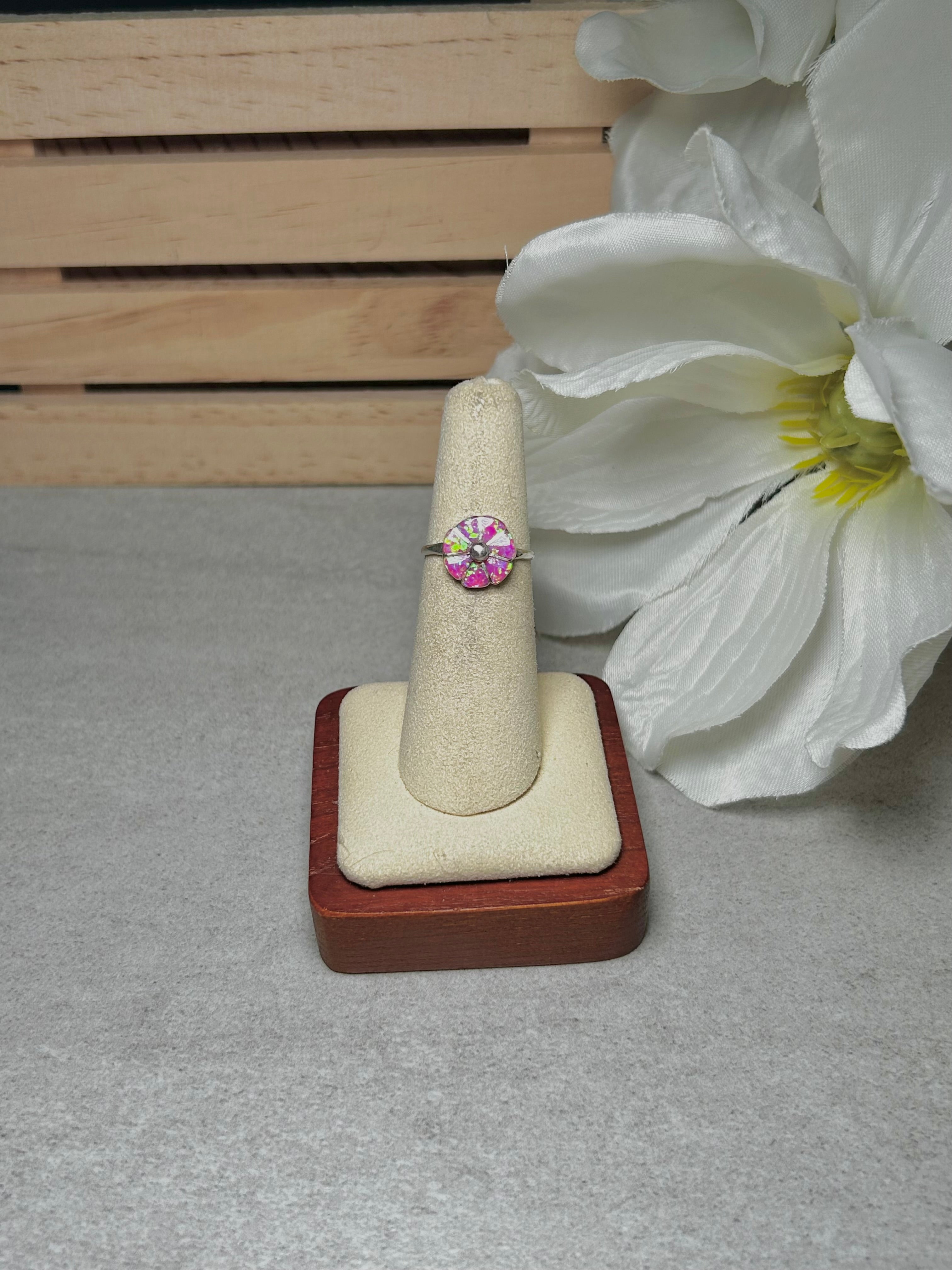Zuni Purple Opal & Sterling Silver Ring Size 5.5. It measures 3/8 of an inch long and a little over 3/8 of an inch wide. Signed by the artist and stamped sterling silver.