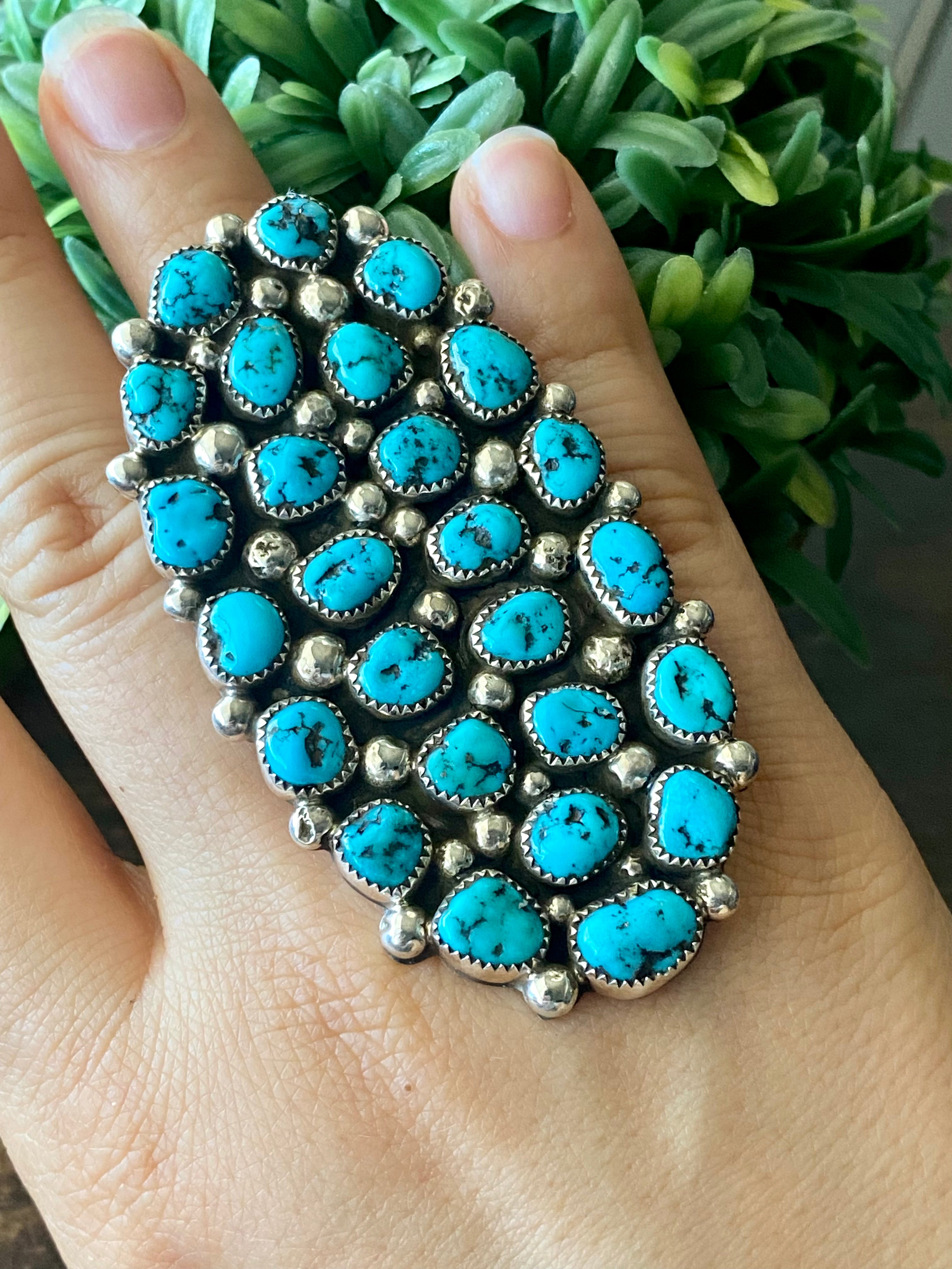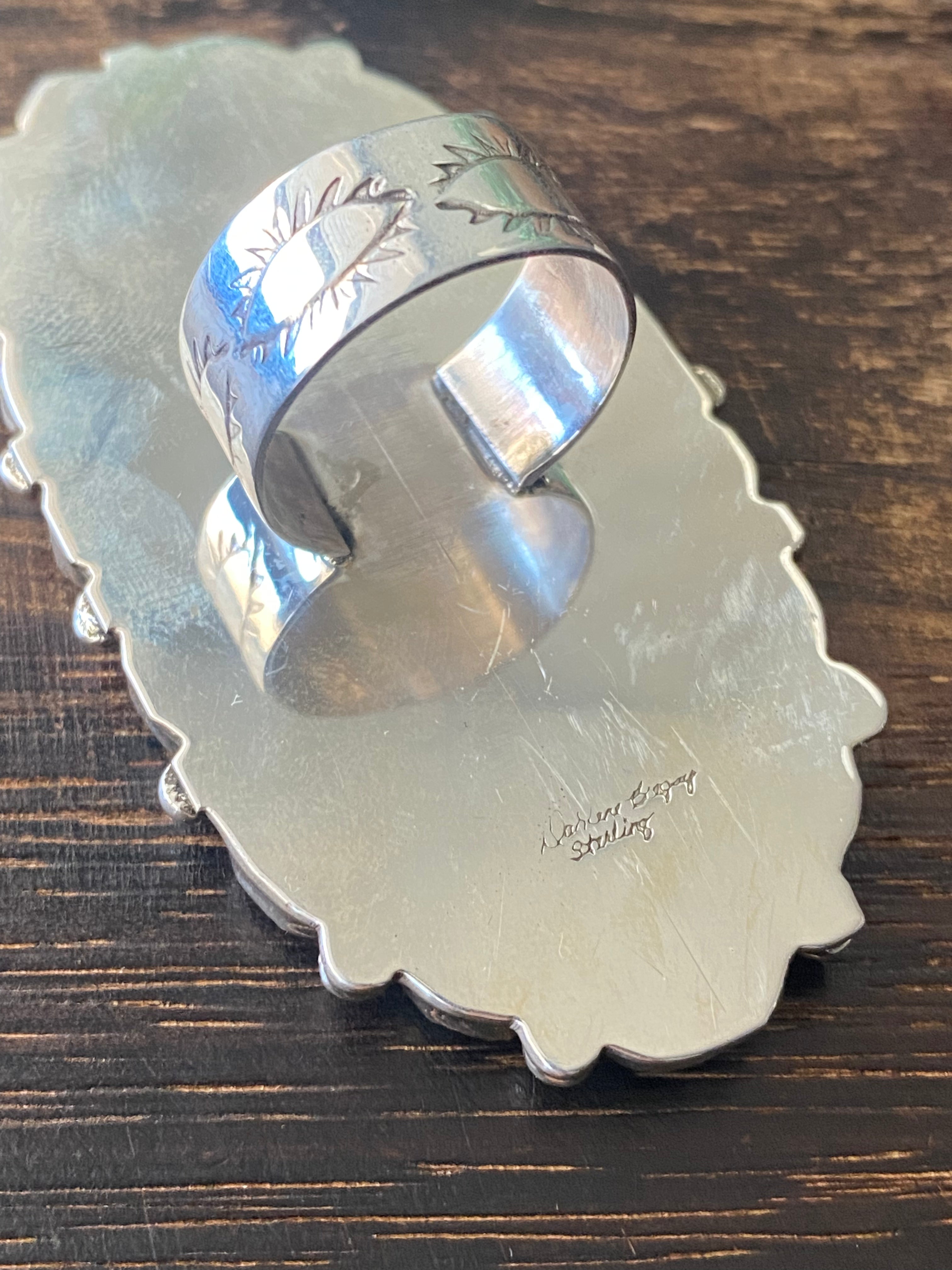 Darlene Begay Kingman Turquoise & Sterling Silver Ring Size 11. It measures 3 inches long and 1 5/8 inches wide. Signed by the artist and stamped sterling silver.