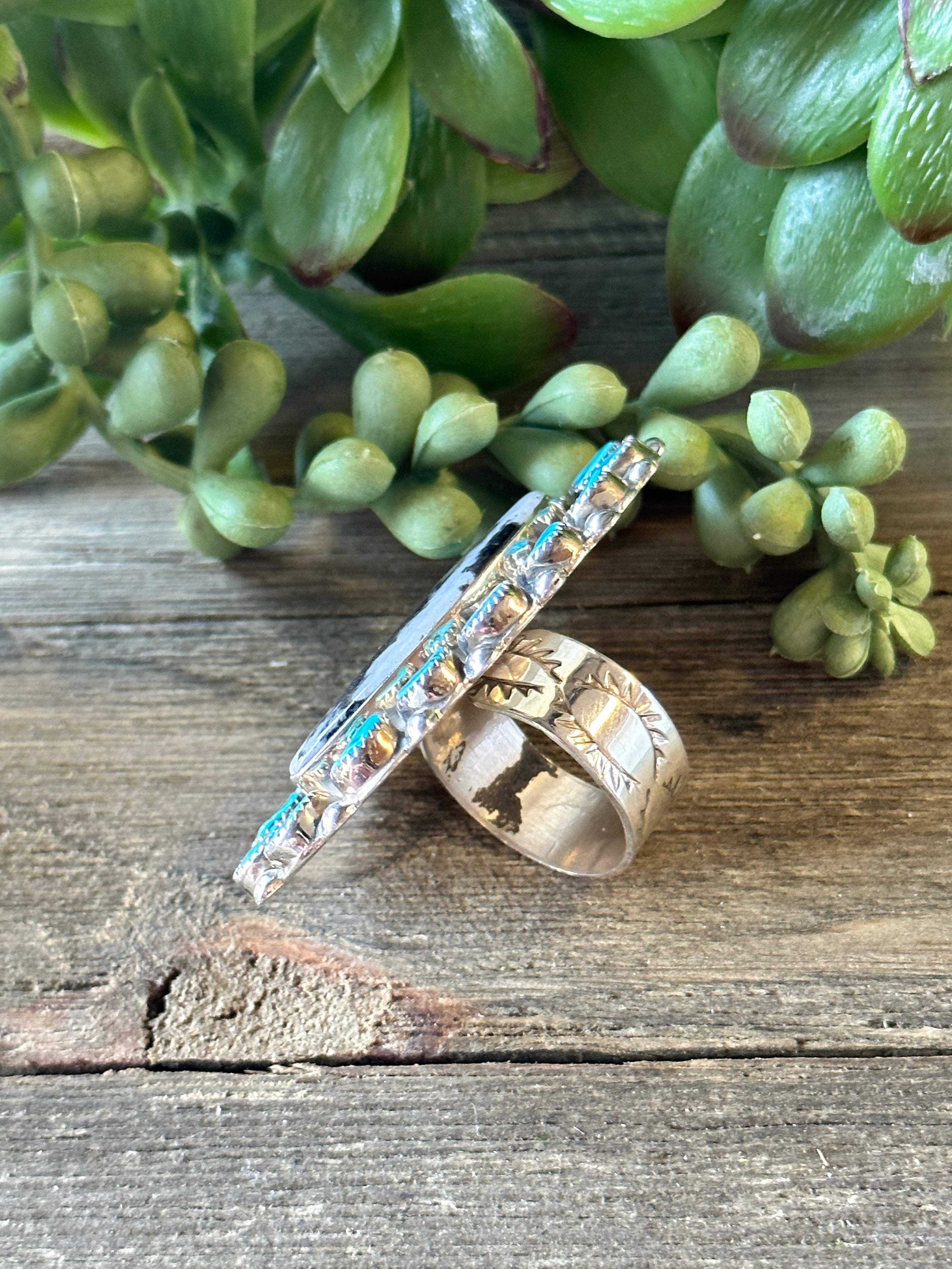 This is an awesome ring. Darlene Begay Multi Stone & Sterling Silver Adjustable Ring. It measures 2 1/4 inches long and 1 3/8 inches wide. Signed by the artist and stamped sterling silver.