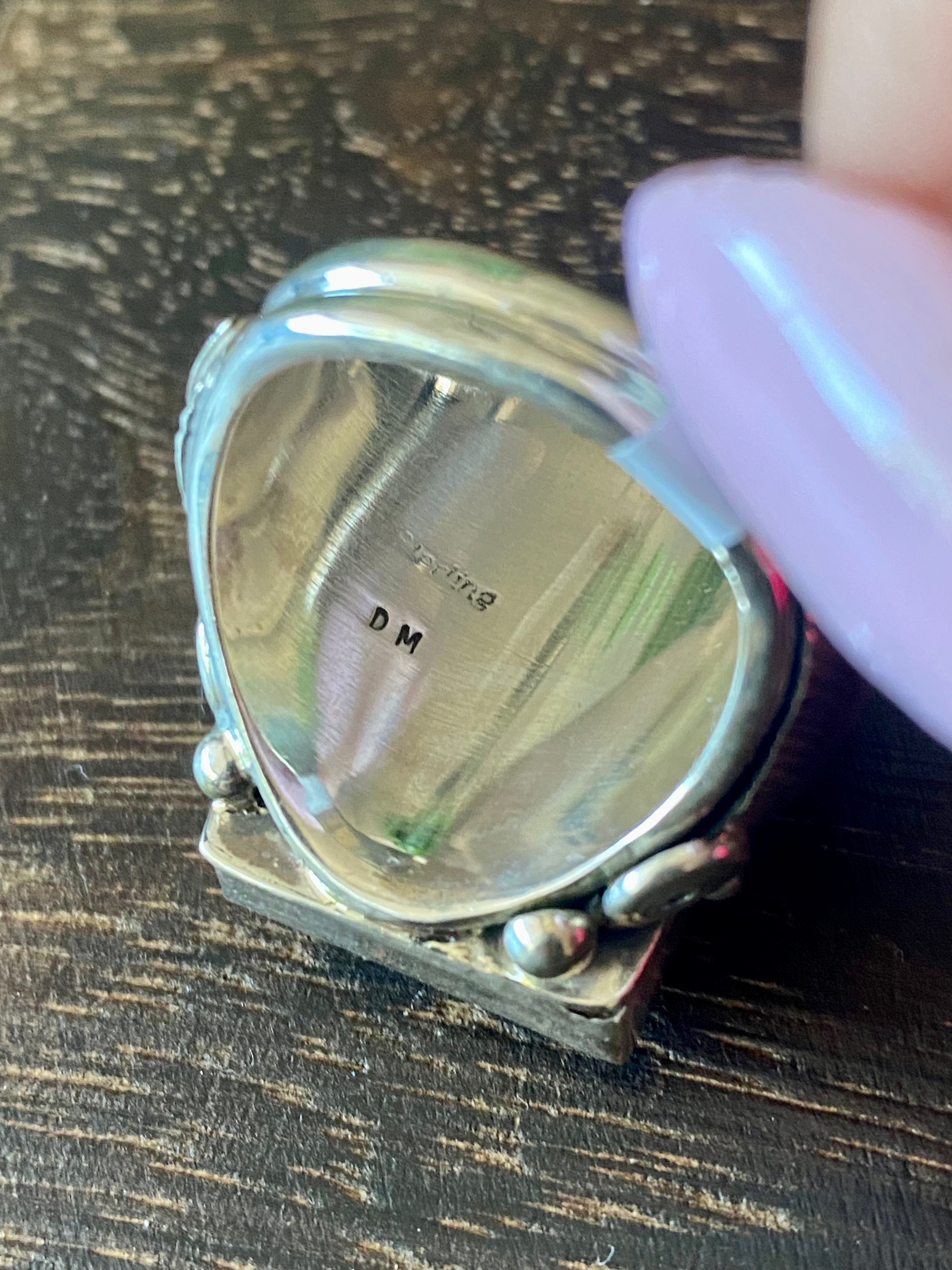 Darrell Morgan Kingman Turquoise & Sterling Silver Ring Size 10.5. It measures just over 1 inch long and 3/4 of an inch wide. Signed by the artist and stamped sterling silver.