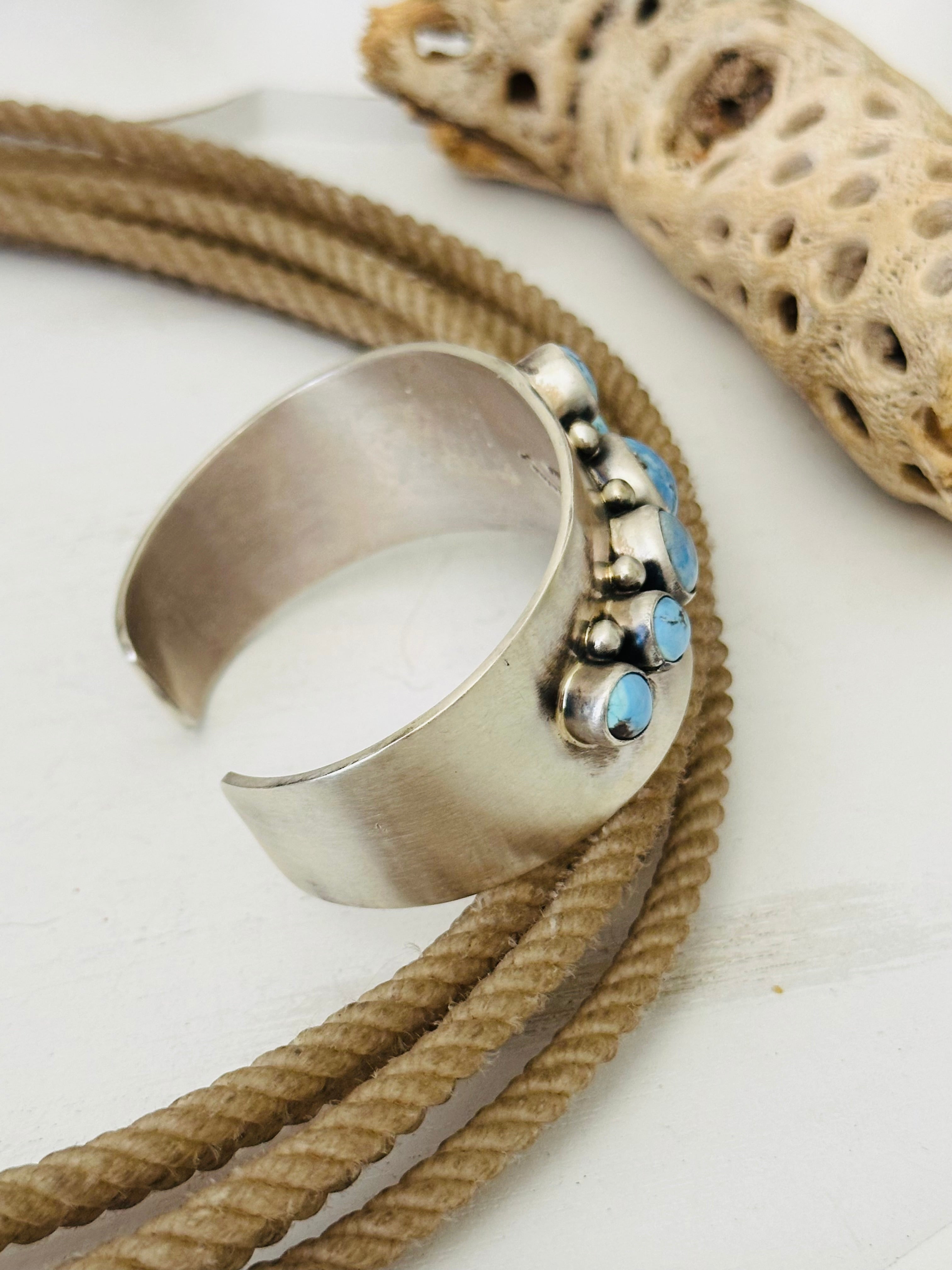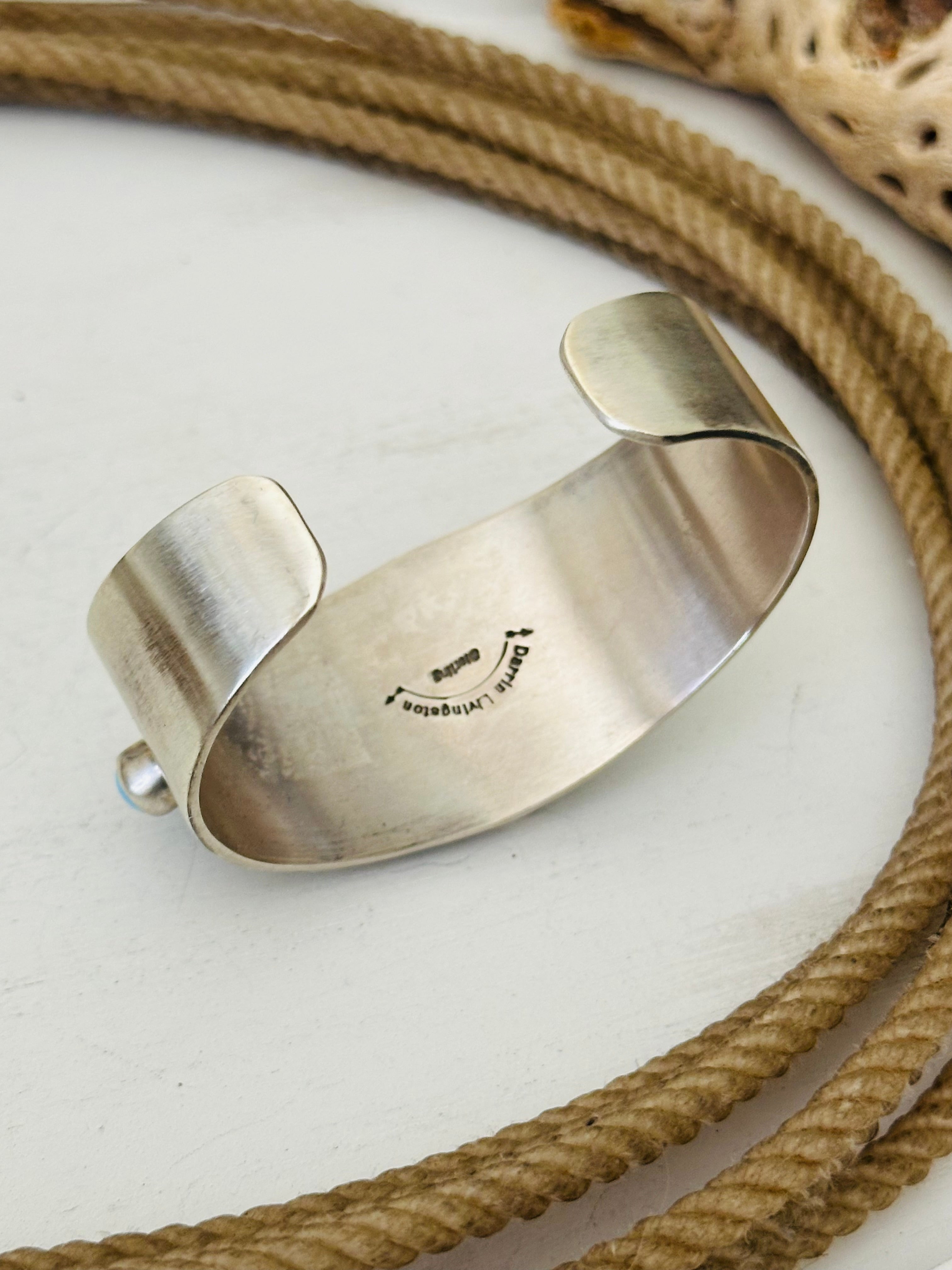 Darrin Livingston Golden Hills Turquoise & Sterling Silver Cuff Bracelet. It measures 1 1/4 inches wide with an inside circumference of 5 3/4 inches and a gap of 1 inch. Signed by artist and stamped sterling silver.