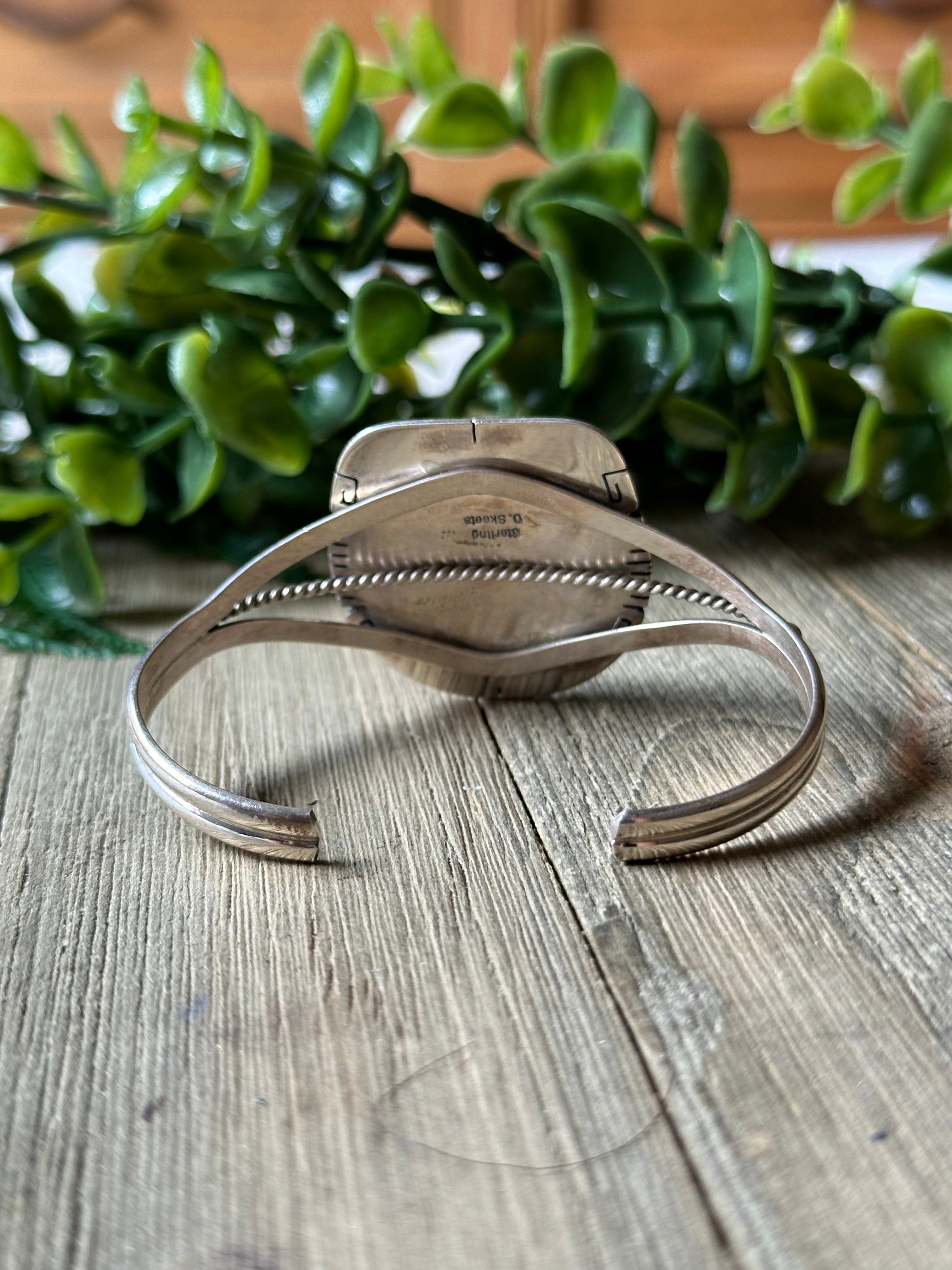 Dave Skeets Spiny Oyster & Sterling Silver Cuff Bracelet. It measures 1 3/8 inches wide with an inside circumference of 5 3/8 inches and a gap of 1 inch. Signed by artist and stamped sterling silver.