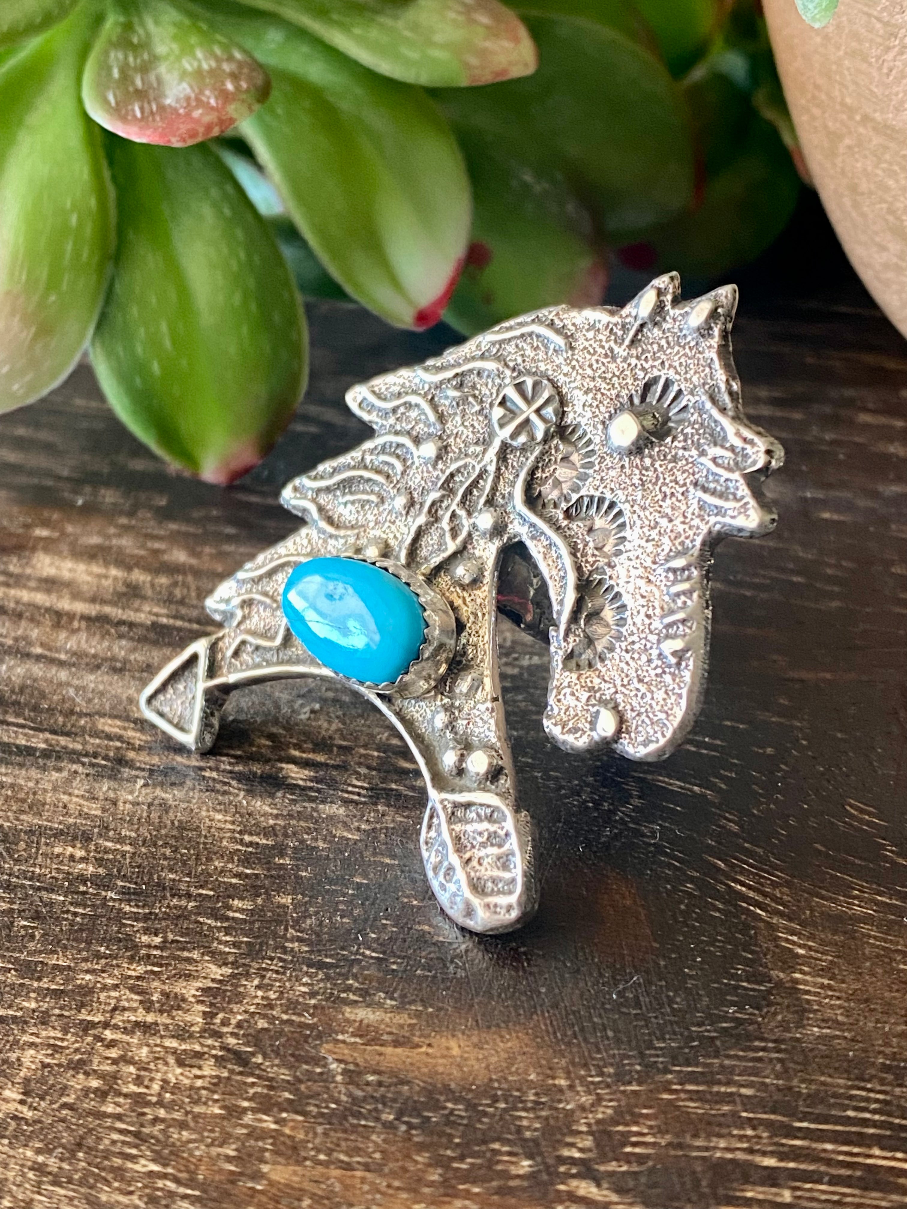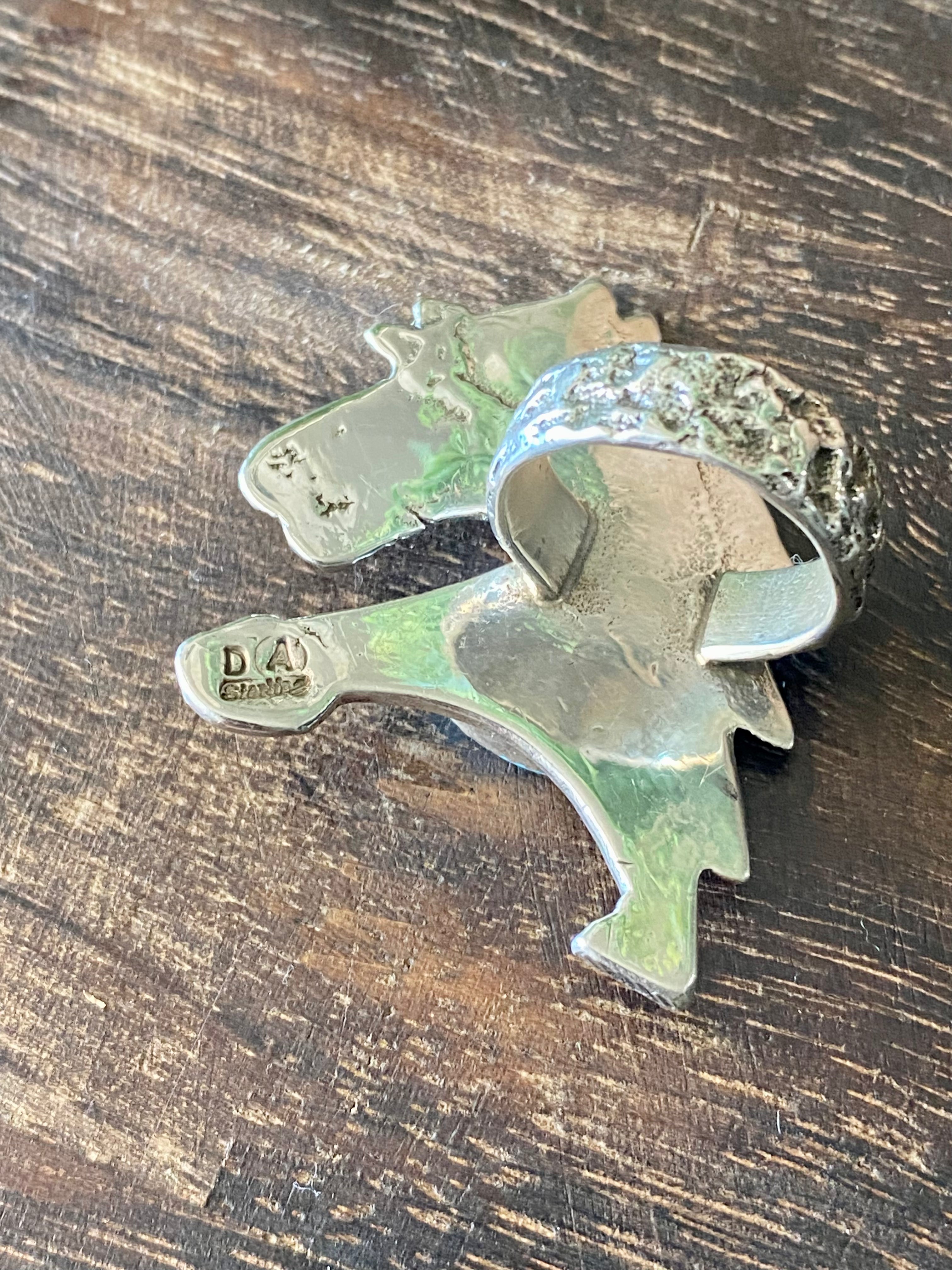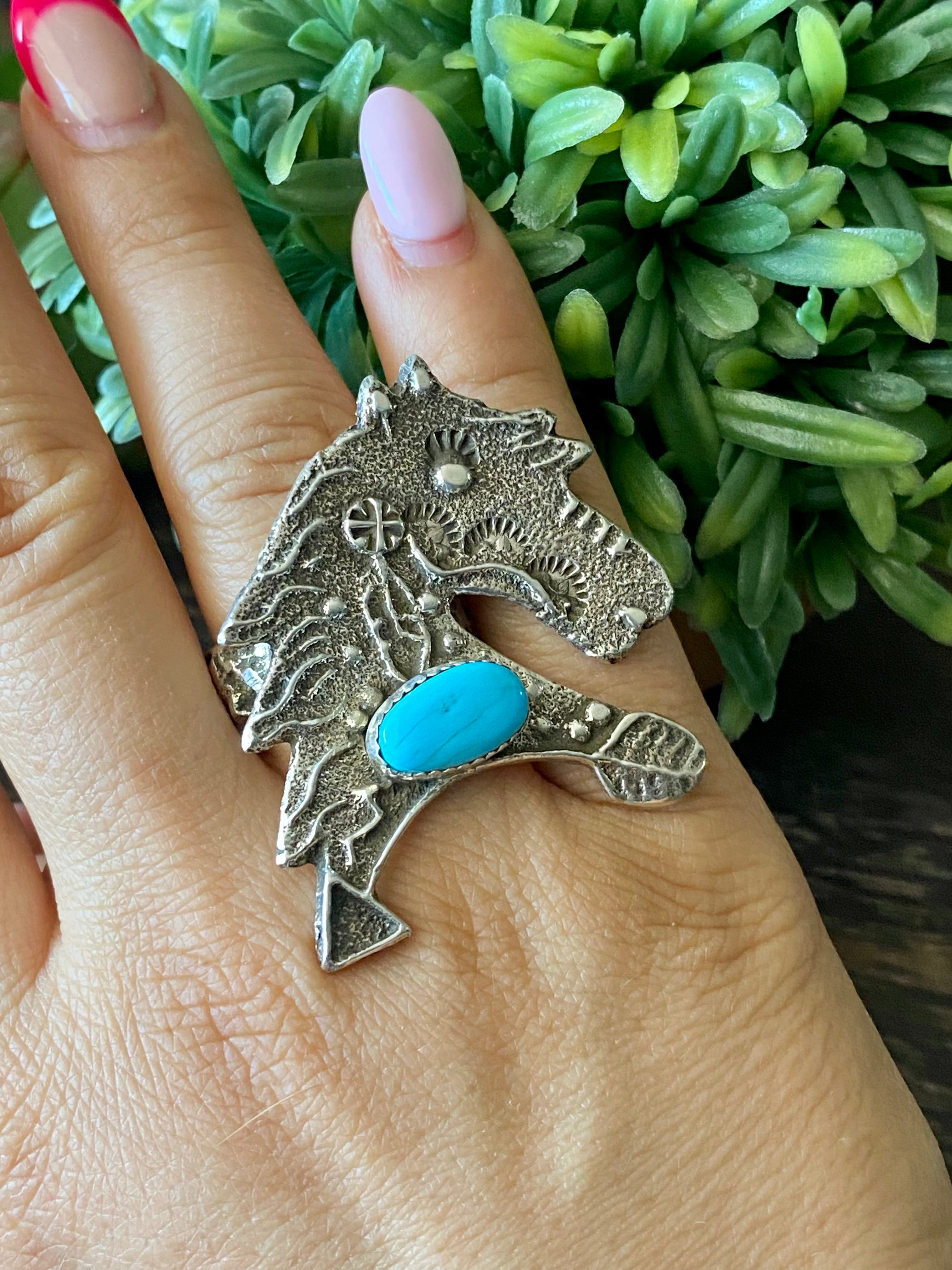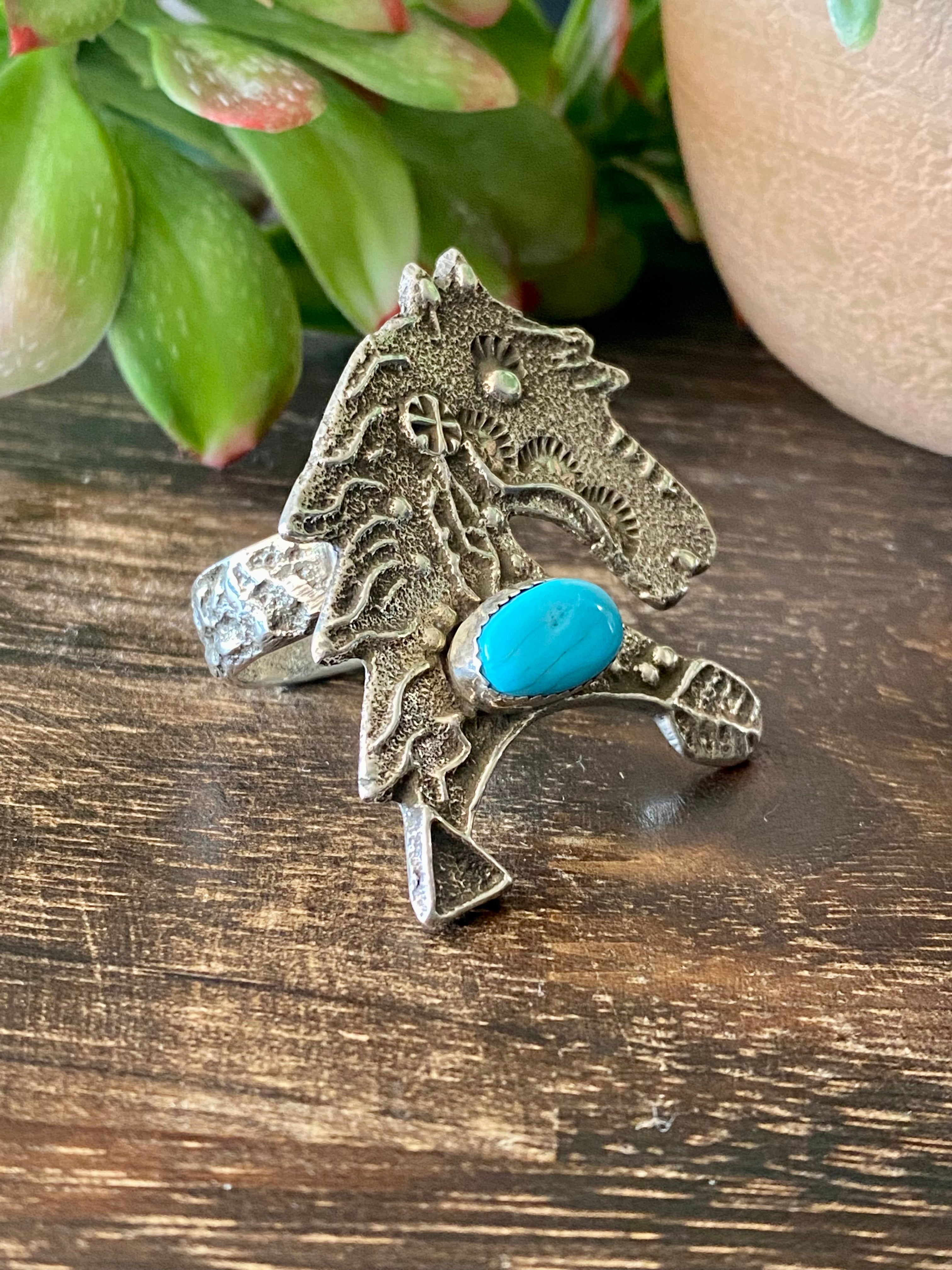 Delbert Arviso Kingman Turquoise & Sterling Silver Tufa Cast Horse Ring Size 9.75