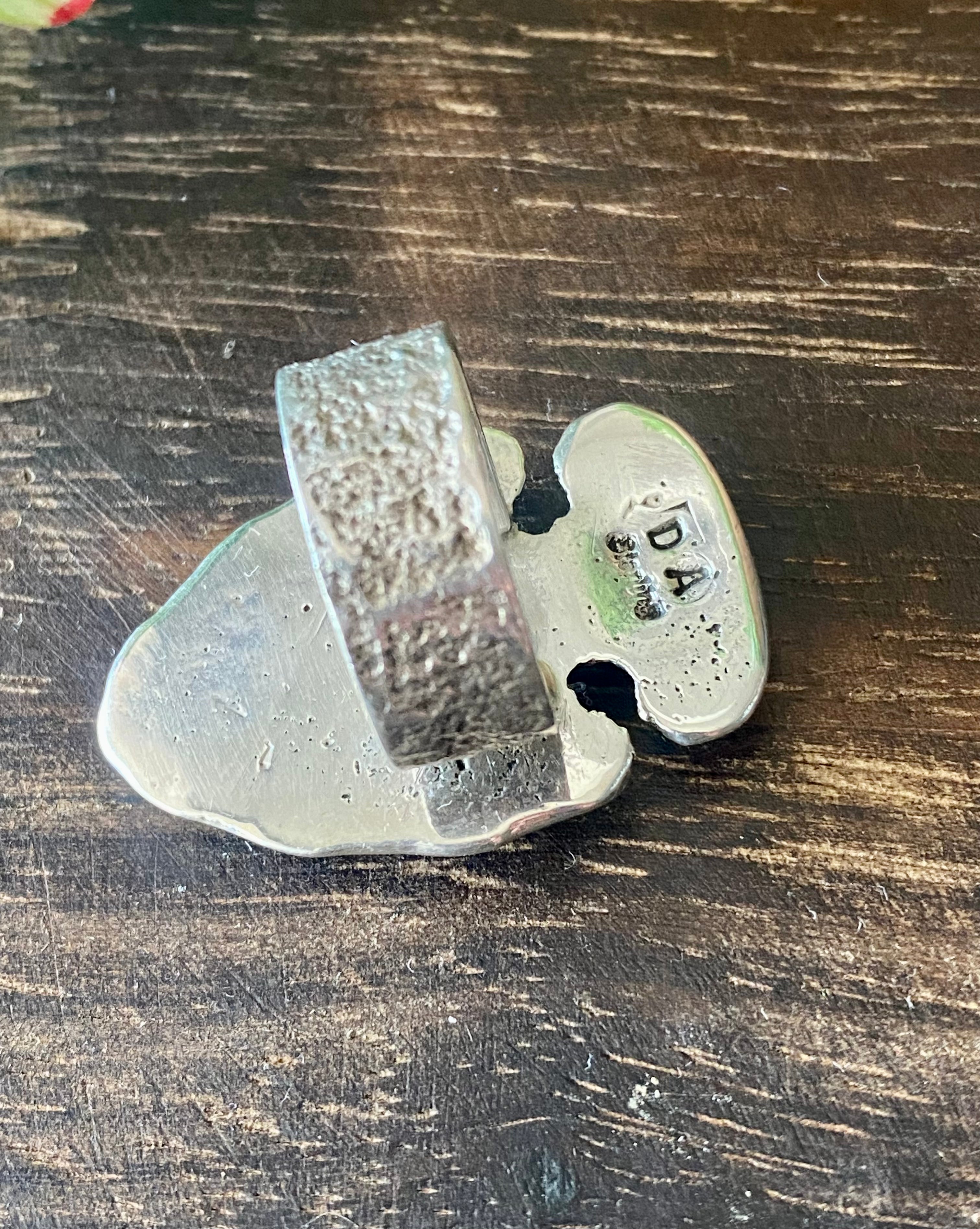 Delbert Arviso Spiny Oyster & Sterling Silver Ring Size 8.25. It measures 1 1/2 inches long and 1 inch wide. Signed by the artist and stamped sterling silver.