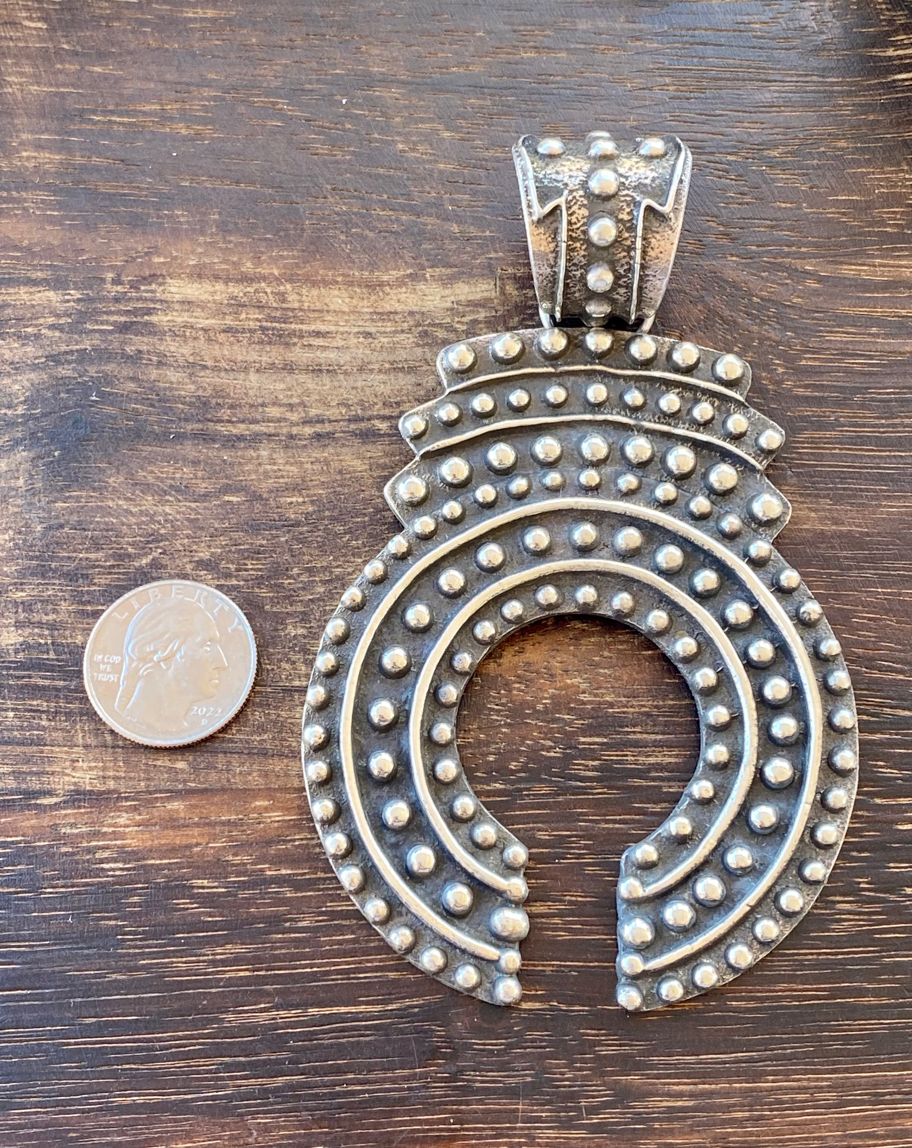 Delbert Arviso Sterling Silver Tufa Cast Naja Pendant. It measures 5 inches long and 3 inches wide. Pendant Only! Signed by the artist and stamped sterling silver. Isn’t she a beauty.