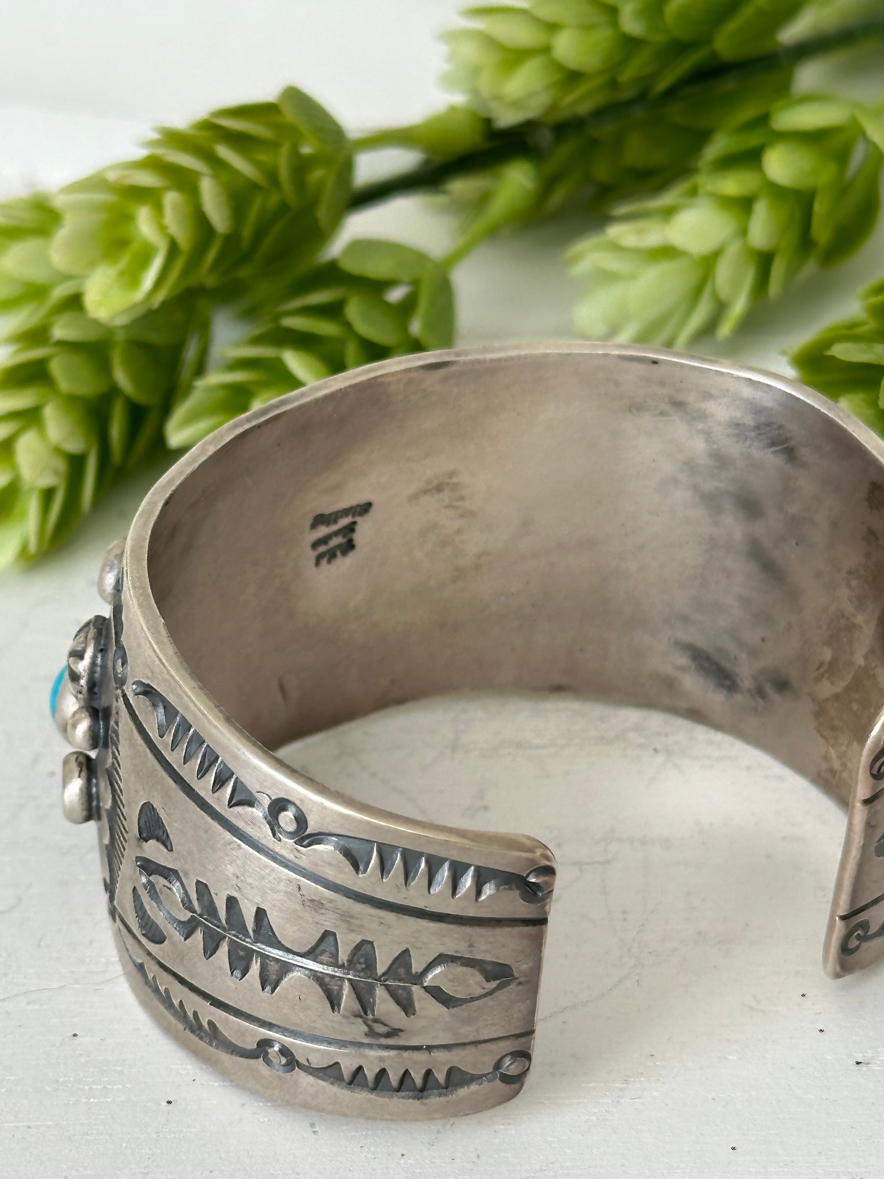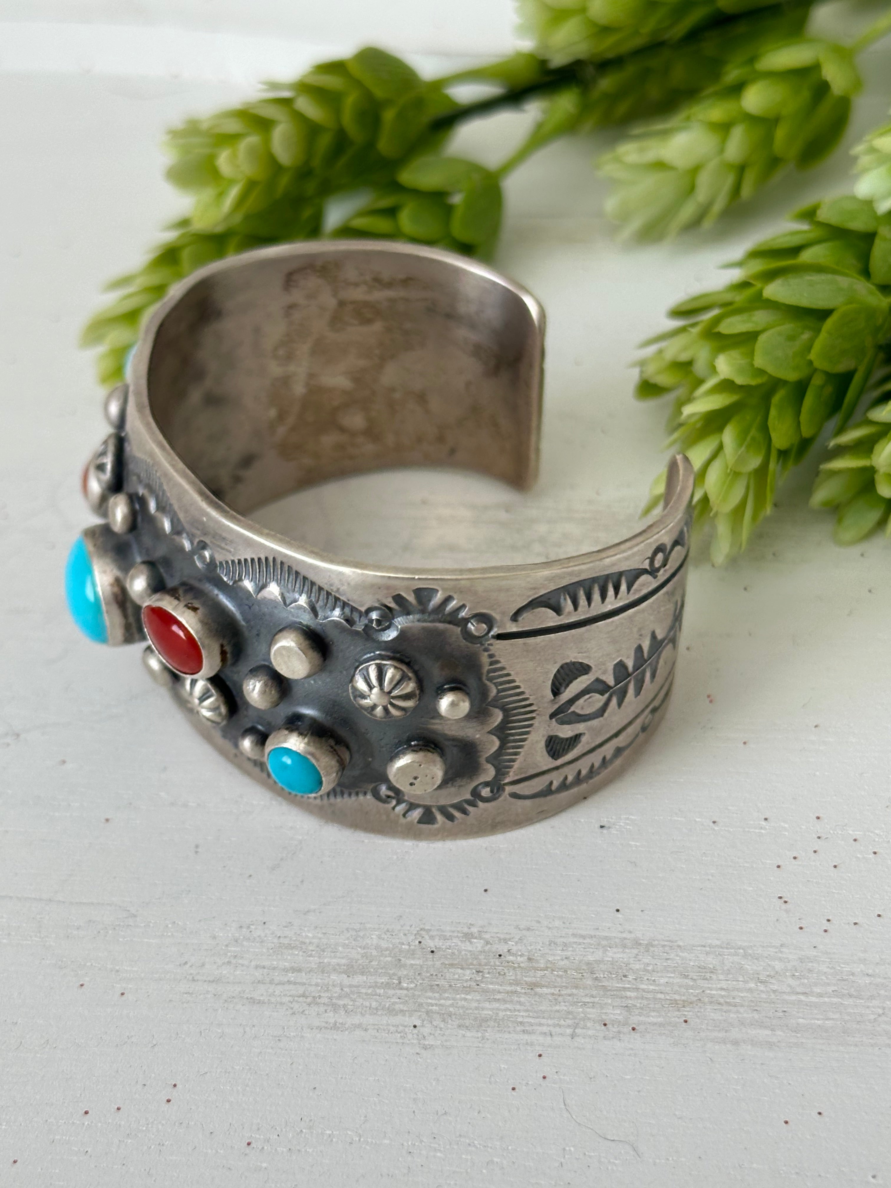 Delbert Secatero Multi Stone & Sterling Silver Cuff Bracelet. It measures 1 1/4 inches wide with an inside circumference of 5 3/4 inches and a gap 1 inch. Signed by the artist and stamped sterling silver.