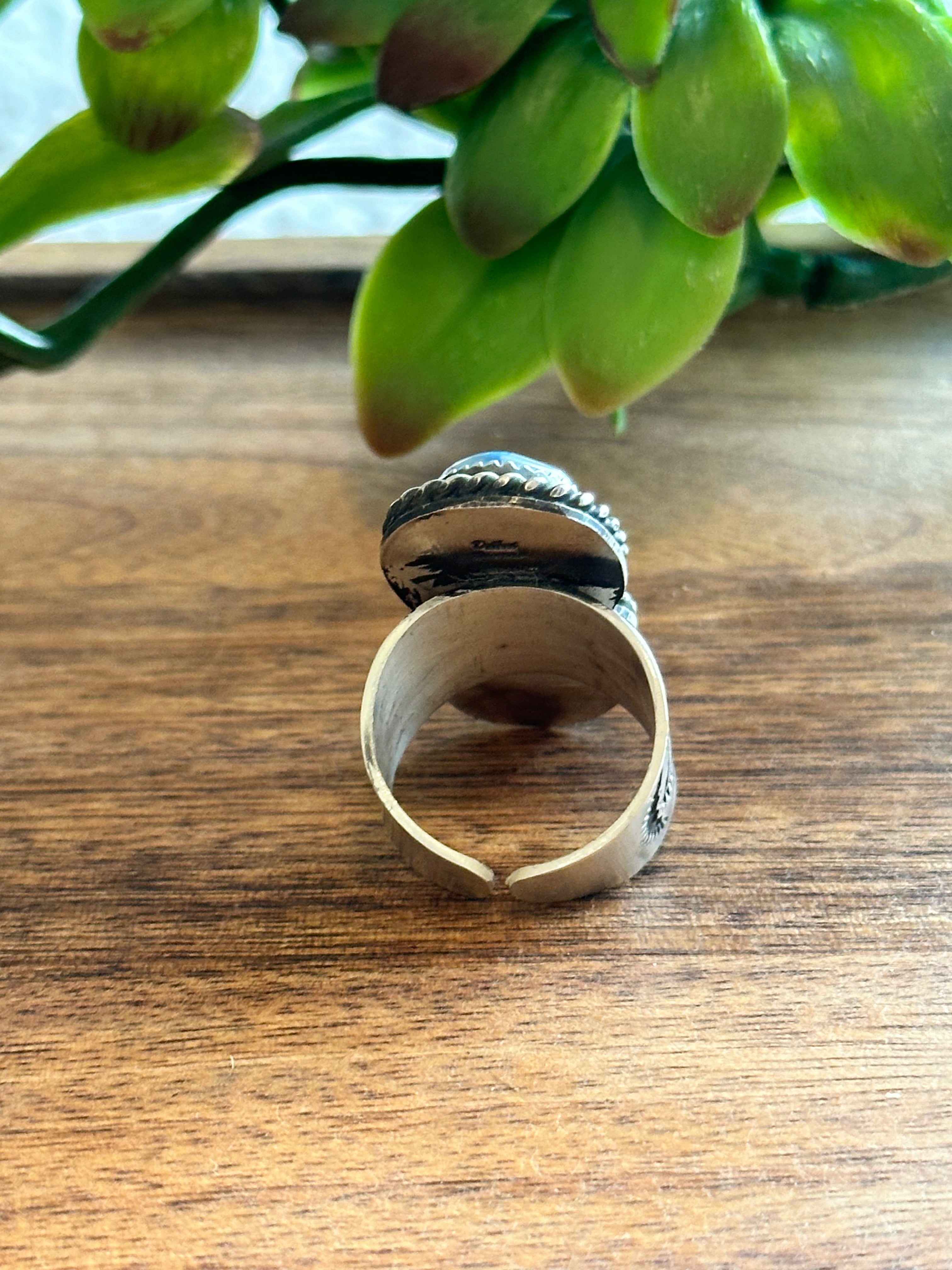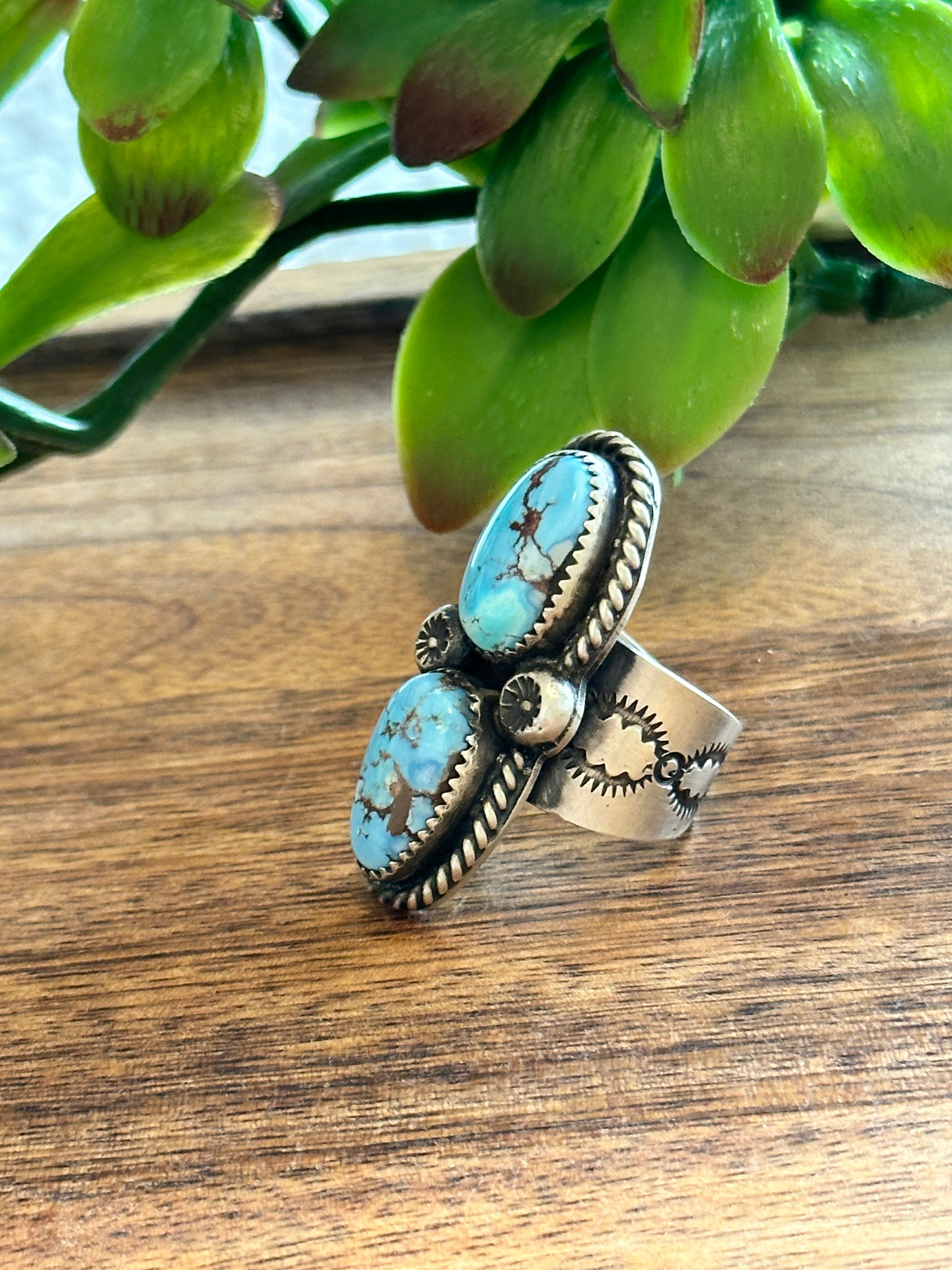 Beautiful ring. Delbert Secetaro Golden Hills Turquoise & Sterling Silver Adjustable Ring. It measures 1 3/4 inches long and 5/8 of an inch wide. Signed by the artist and stamped sterling silver.