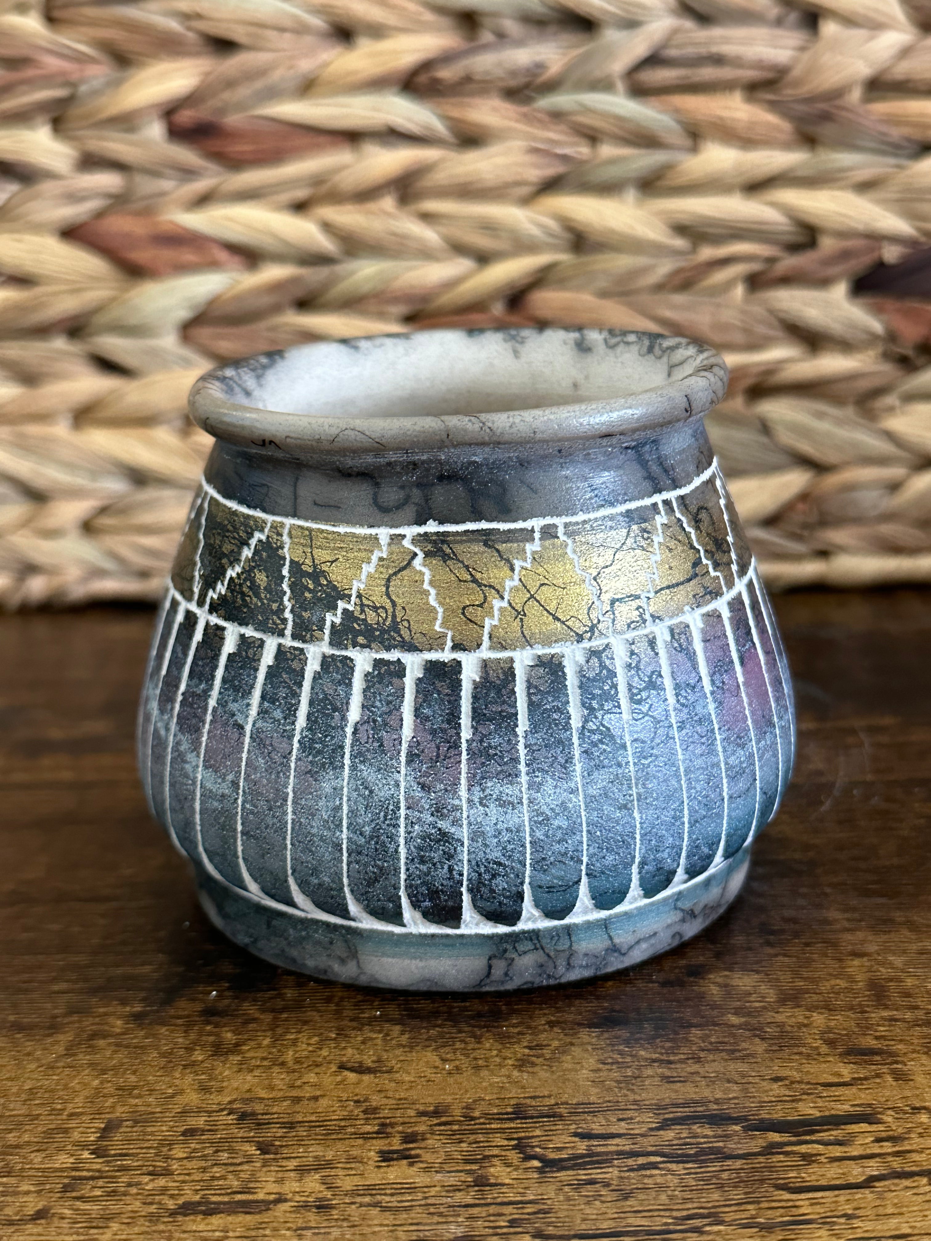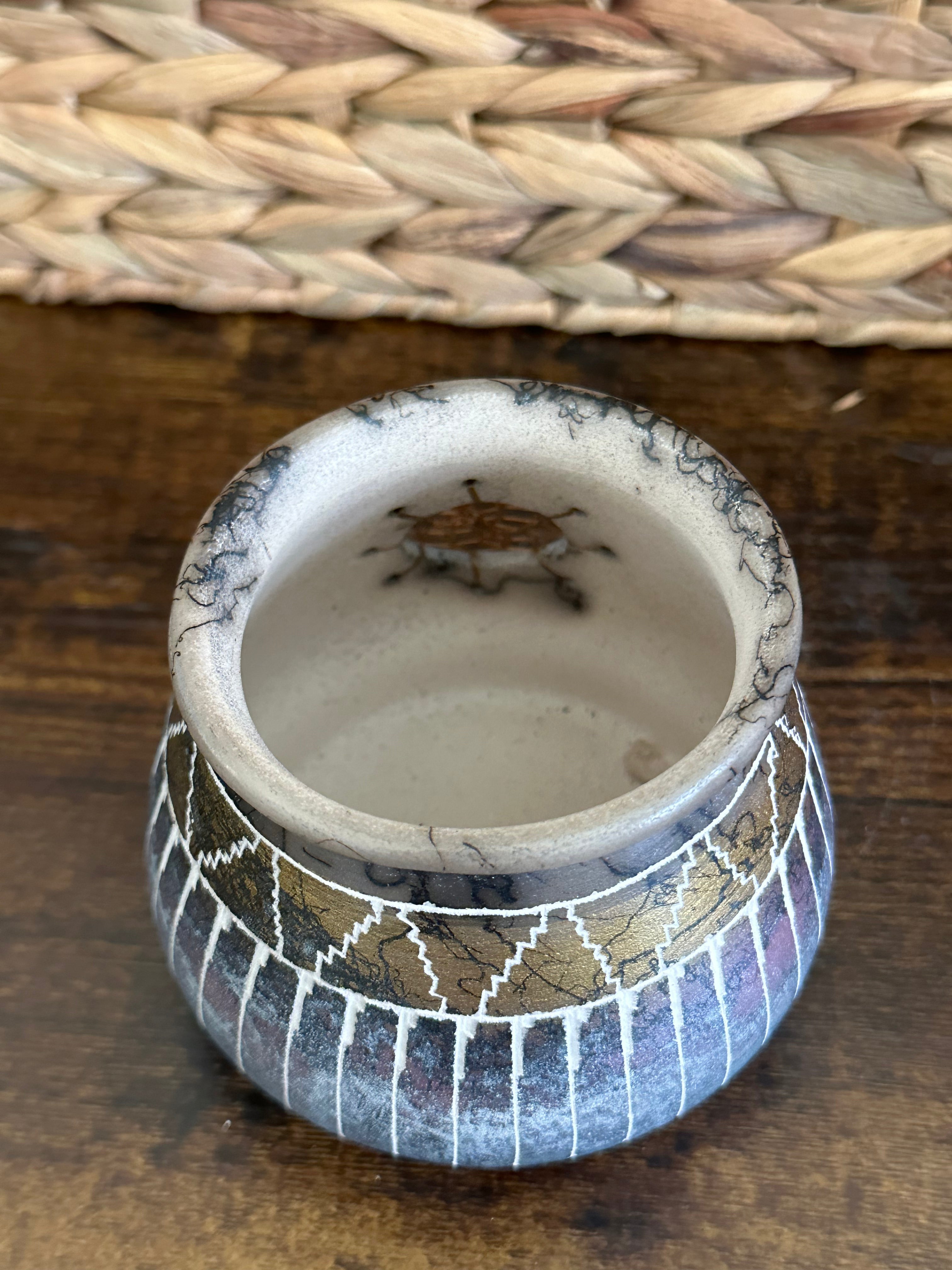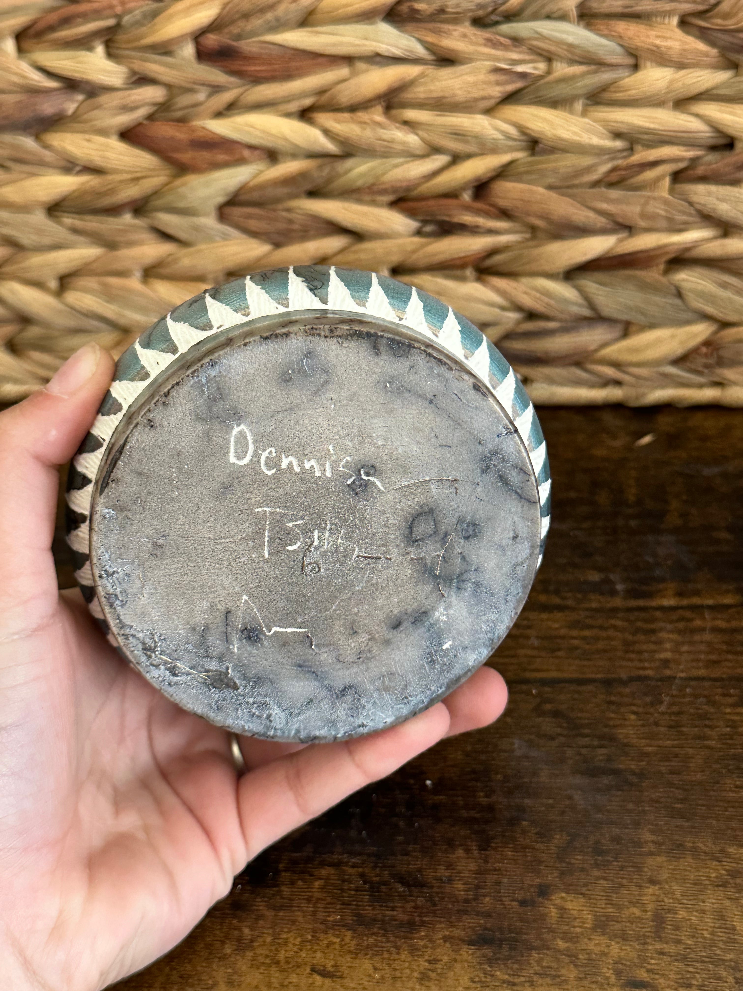 Dennison Billy Navajo Made Pottery. It measures 3 1/4 inches long and 12 1/2 inches round. Signed by the artist.