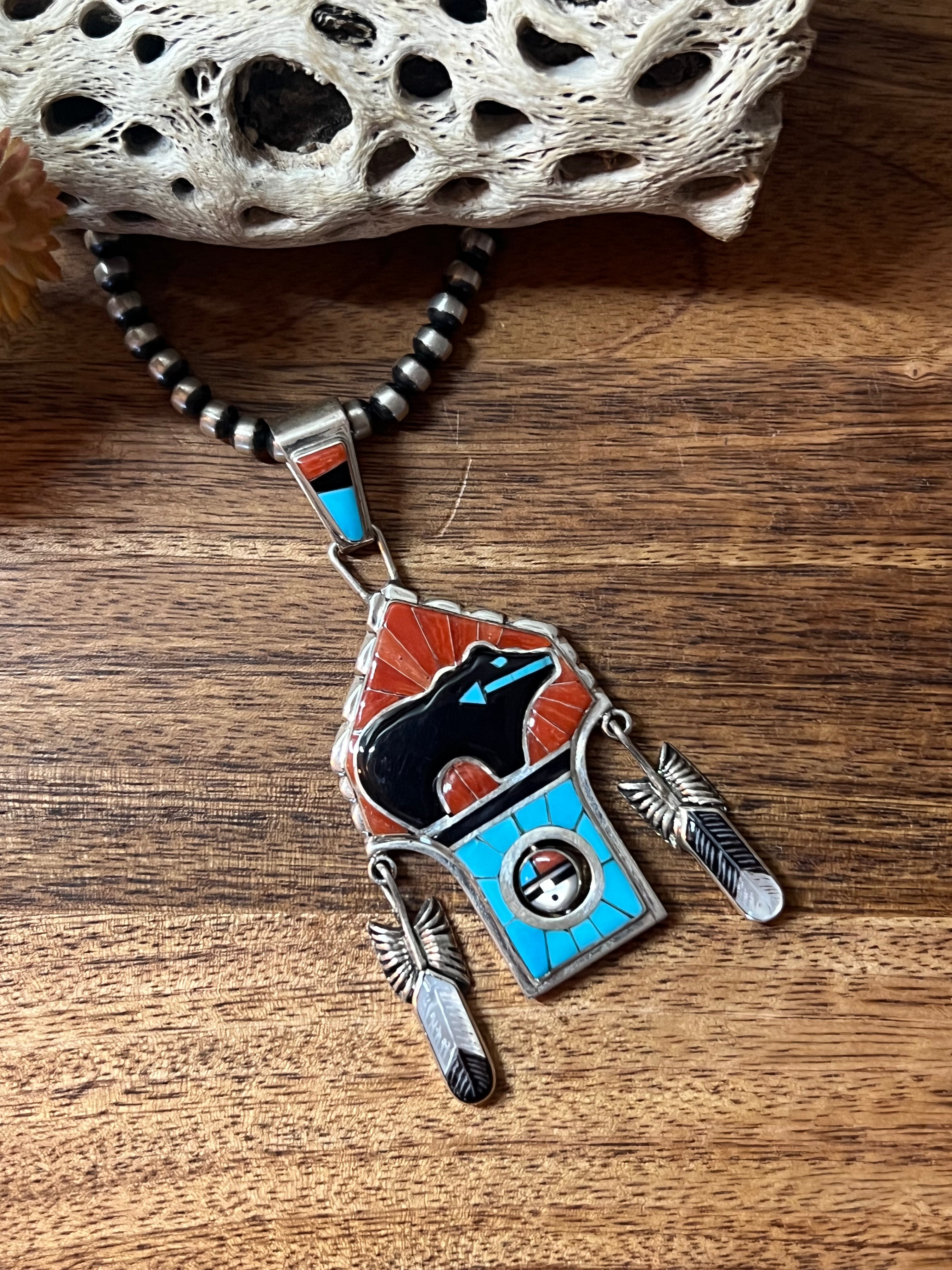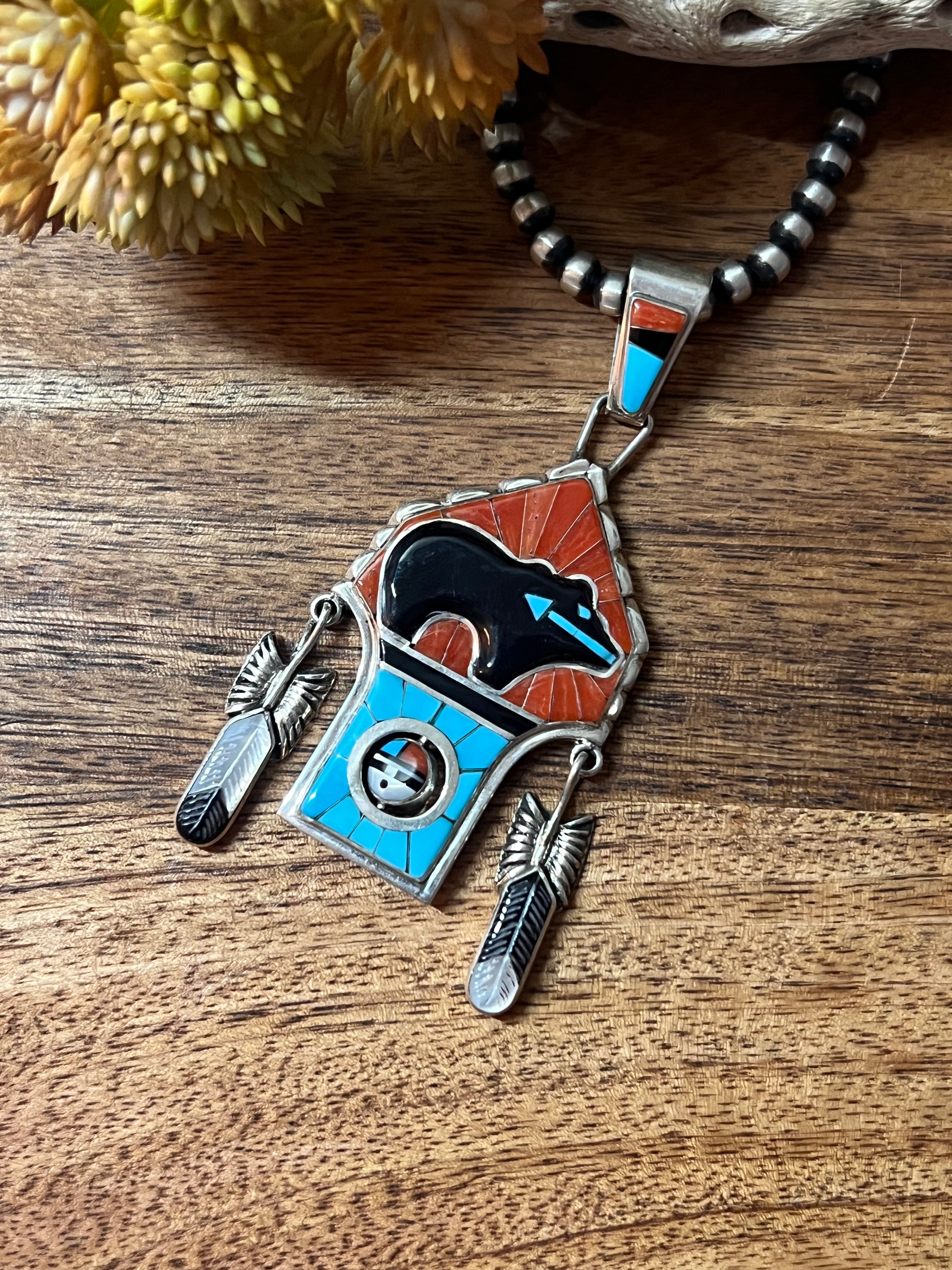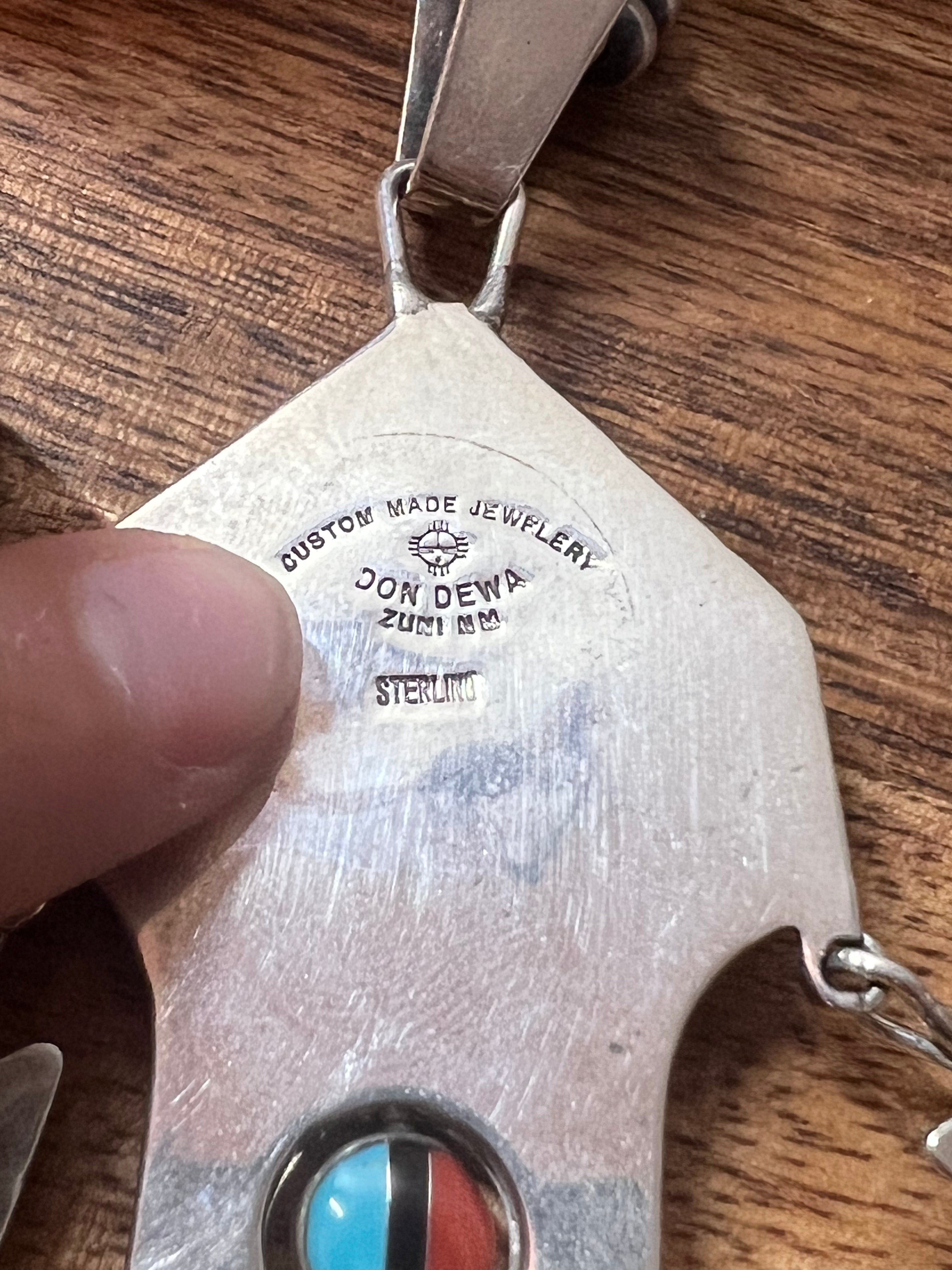 Don Dewa Multi Stone & Sterling Silver Inlay Spinning Sun Face Pendant. It measures 3 inches long and 1 3/4 inches wide. Pendant Only!! Signed by the artist and stamped sterling silver.
