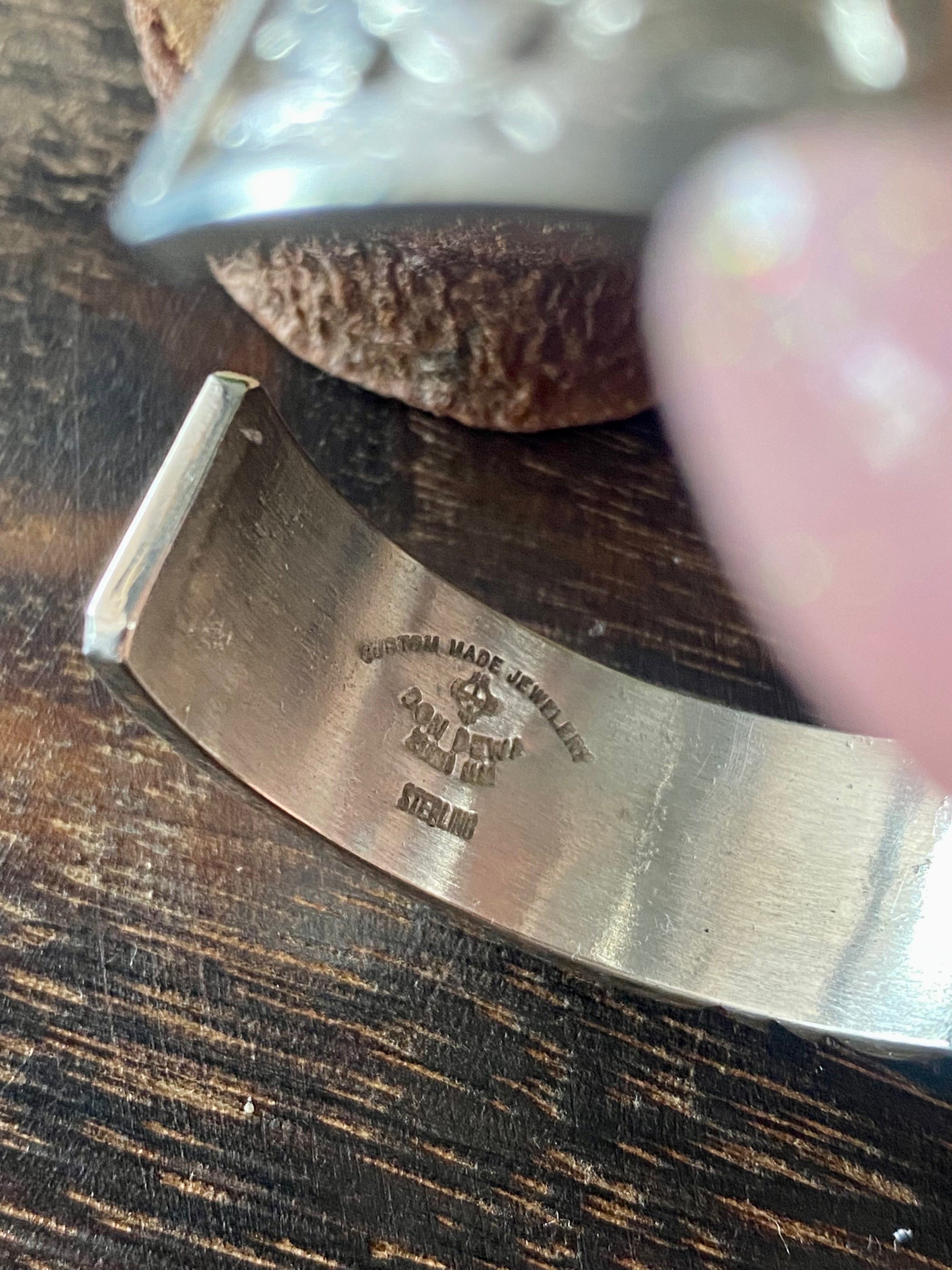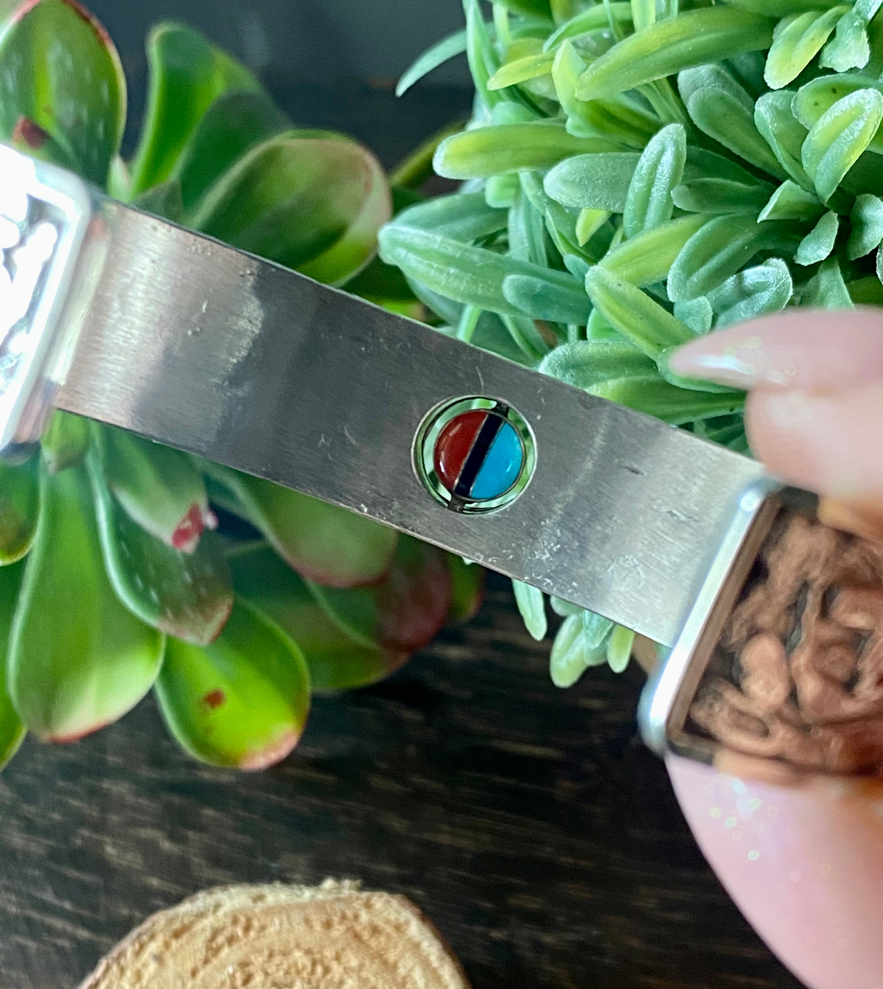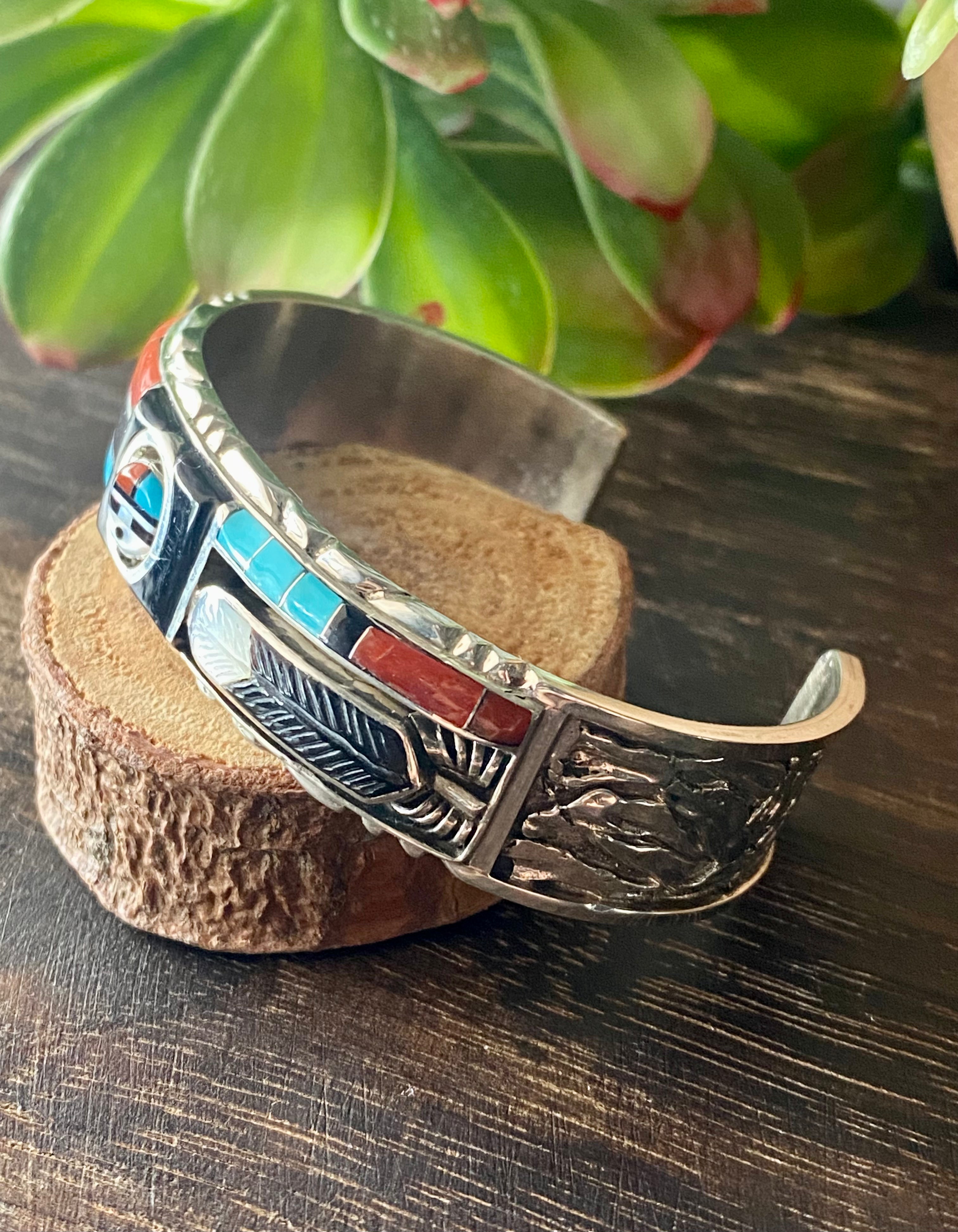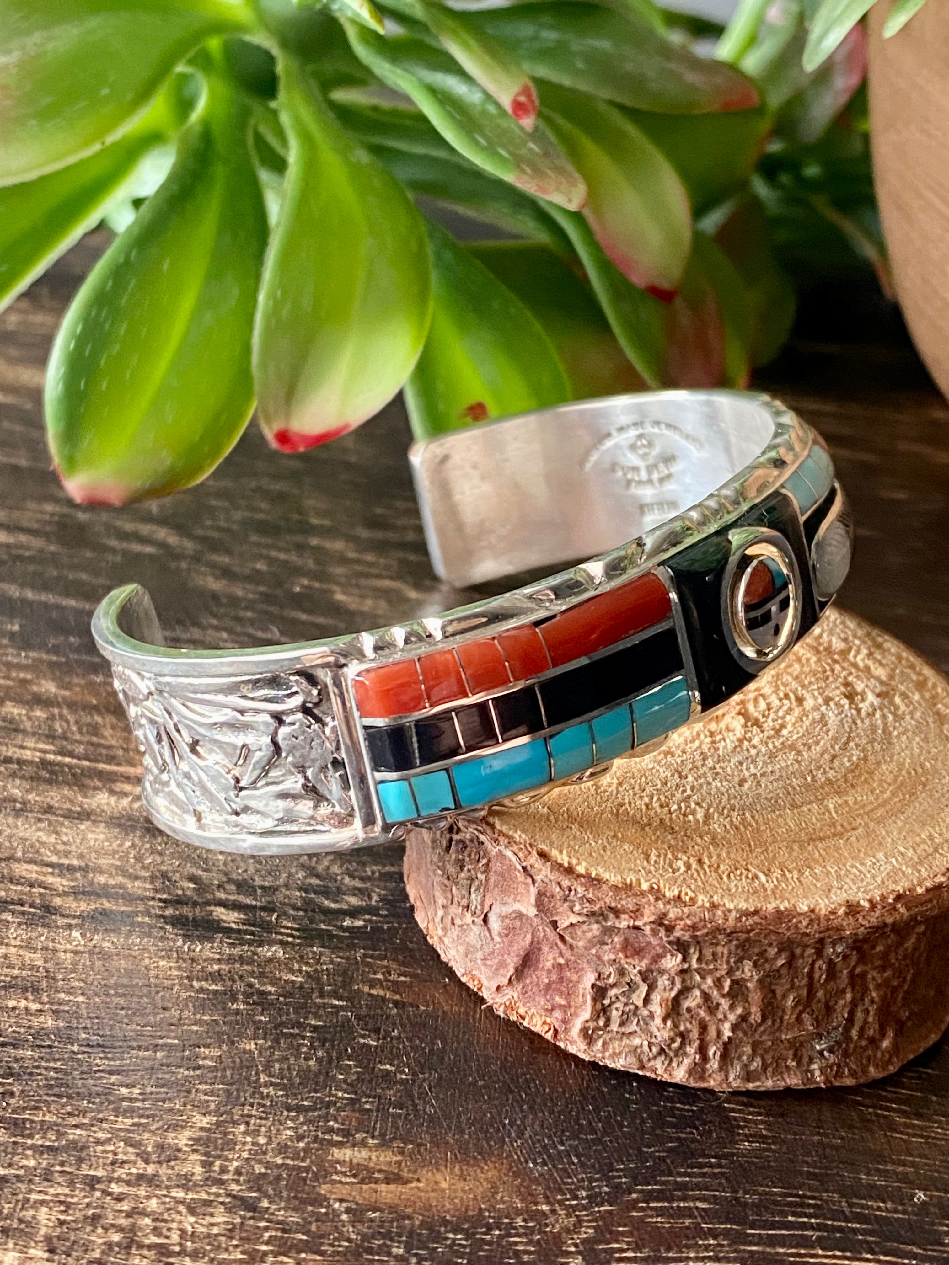 Don Dewa Multi Stone & Sterling Silver Inlay Sunface Cuff Bracelet. It measures just under 5/8 of an inch wide with an inside circumference of 5 3/8 inches and a gap of 1 1/4 inches. Signed by the artist and stamped sterling silver.