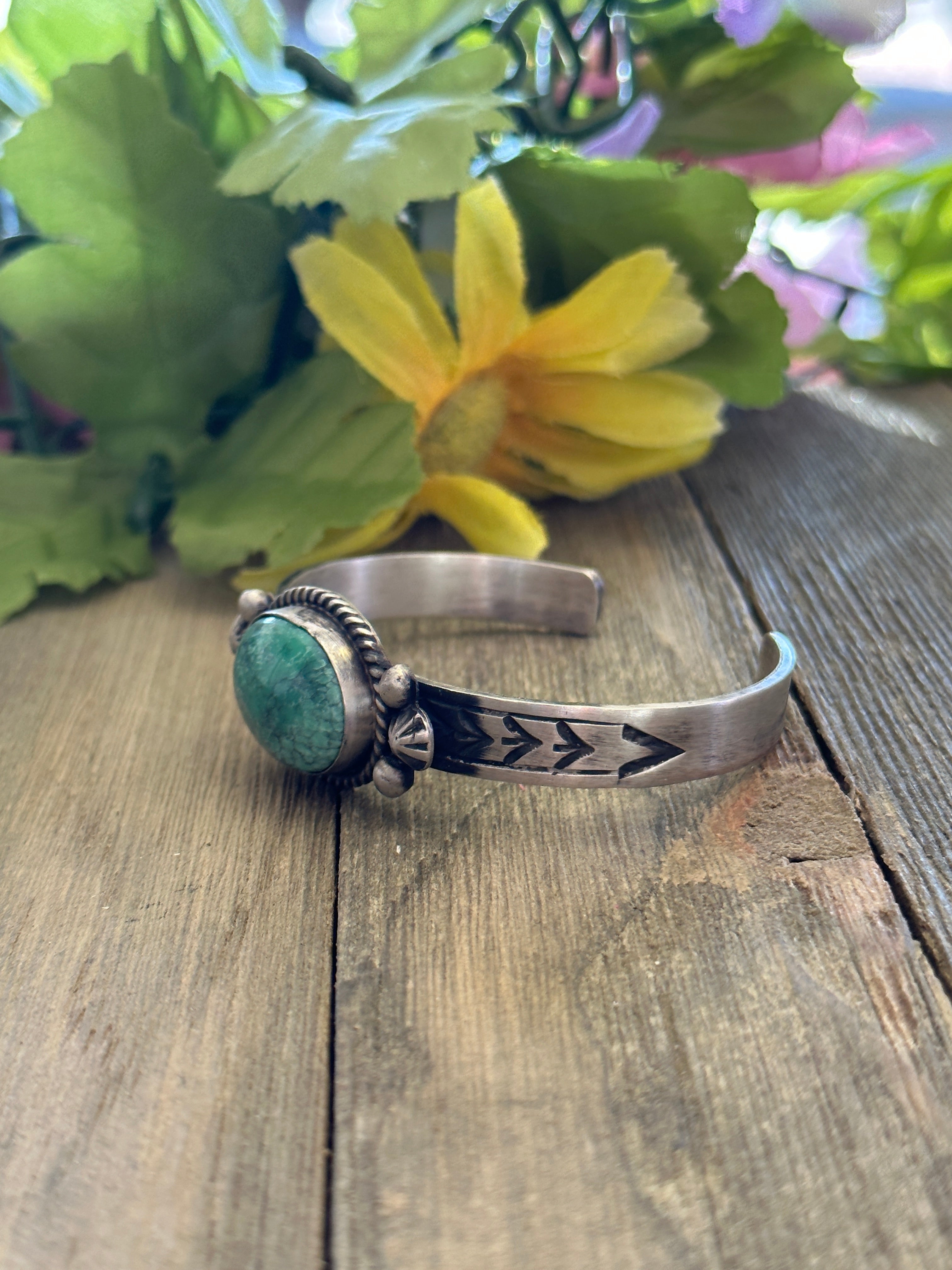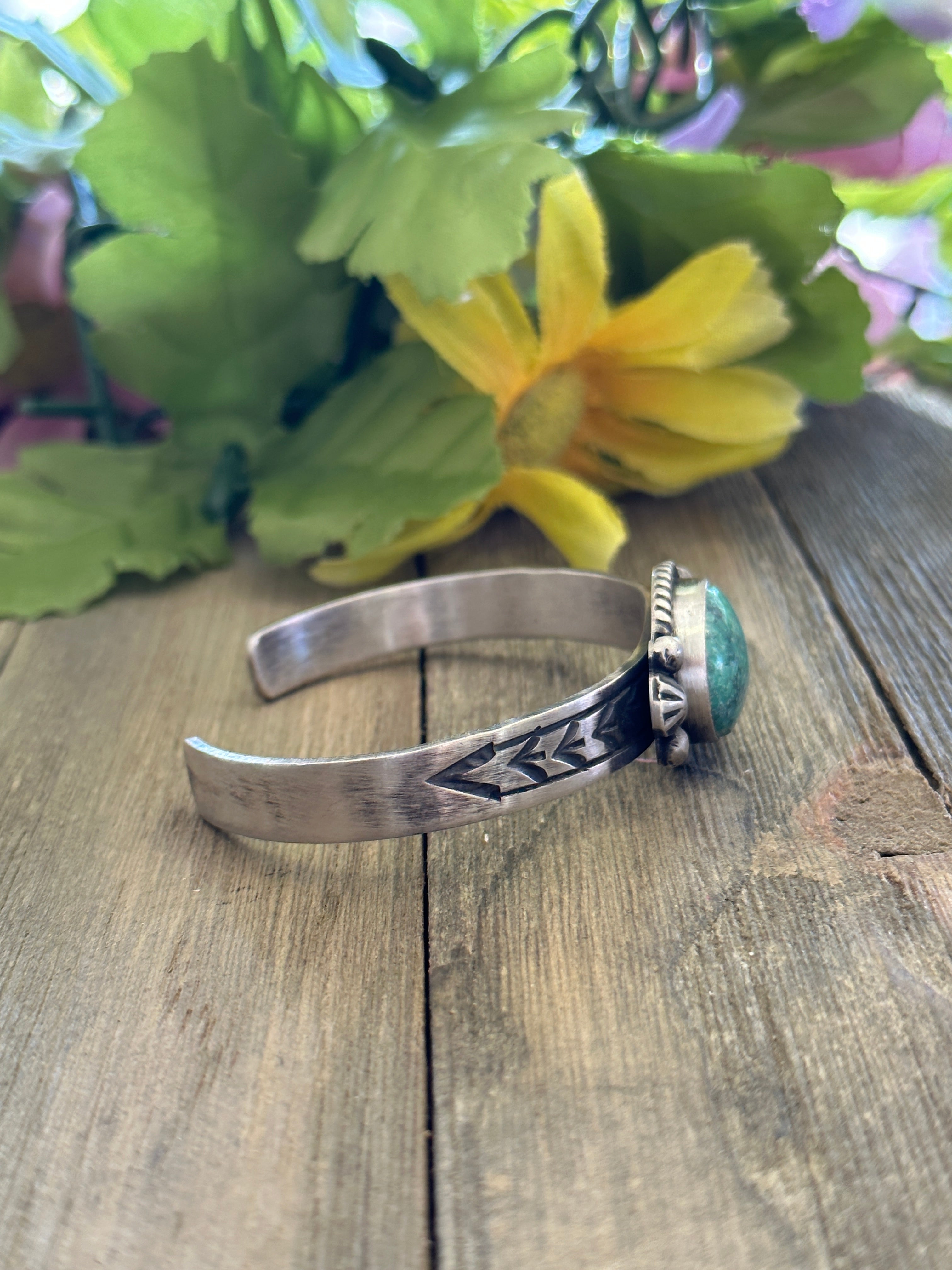 Donovan Skeets Varasite & Sterling Silver Cuff Bracelet. It measures 3/4 of an inch wide with an inside circumference of 5 1/4 inches and a gap of 1 1/8 inches. Signed by the artist and stamped sterling silver.