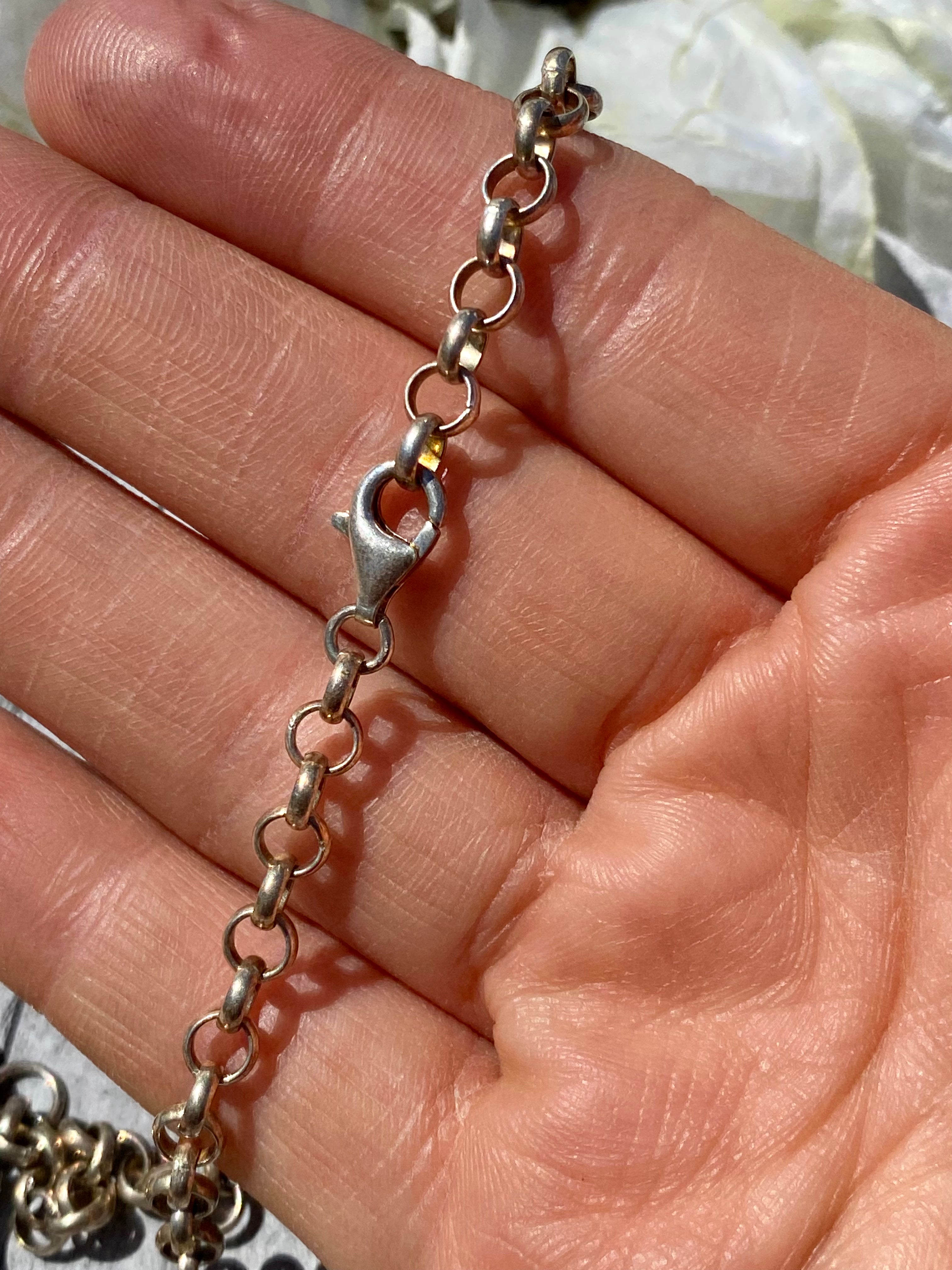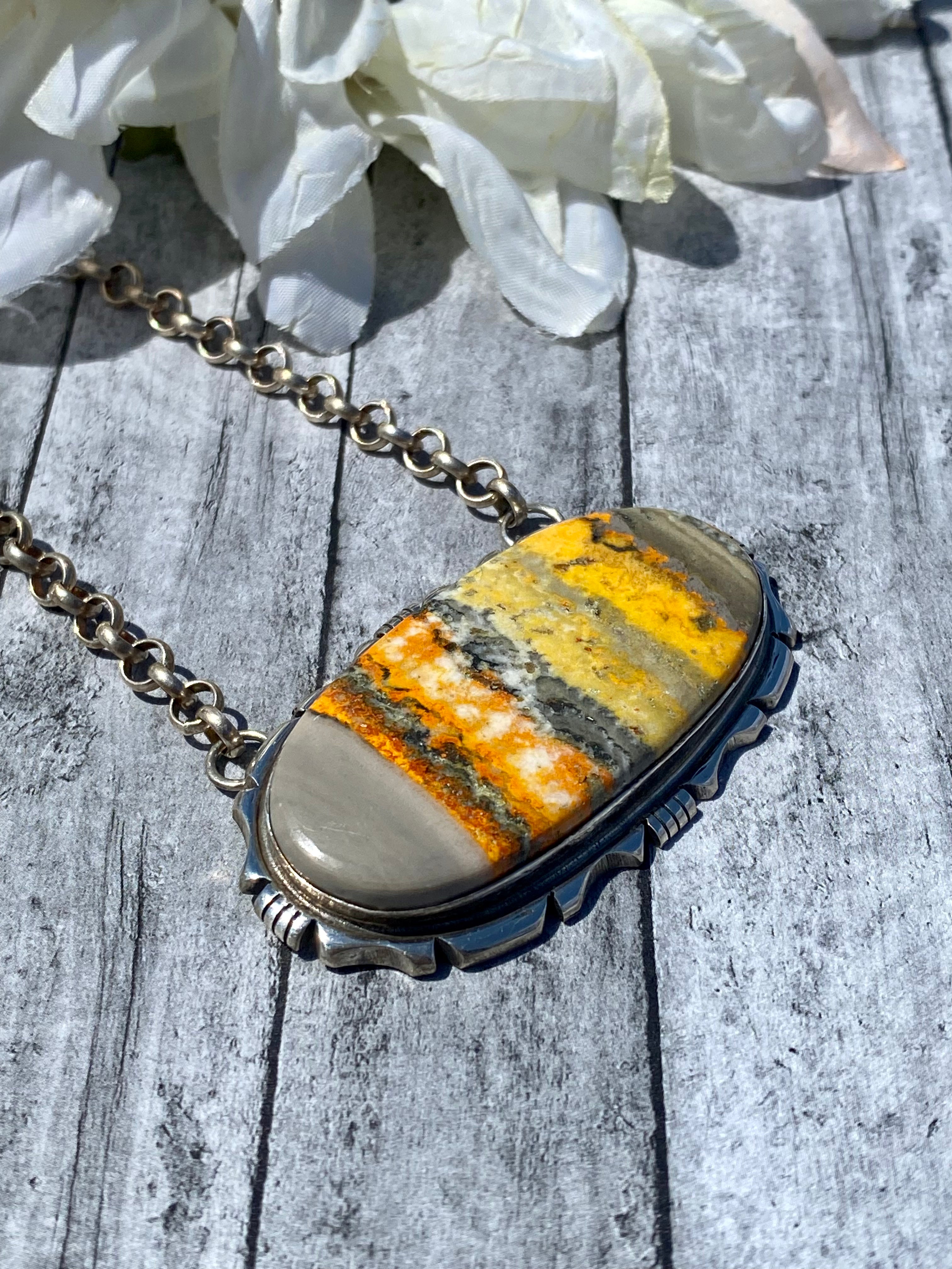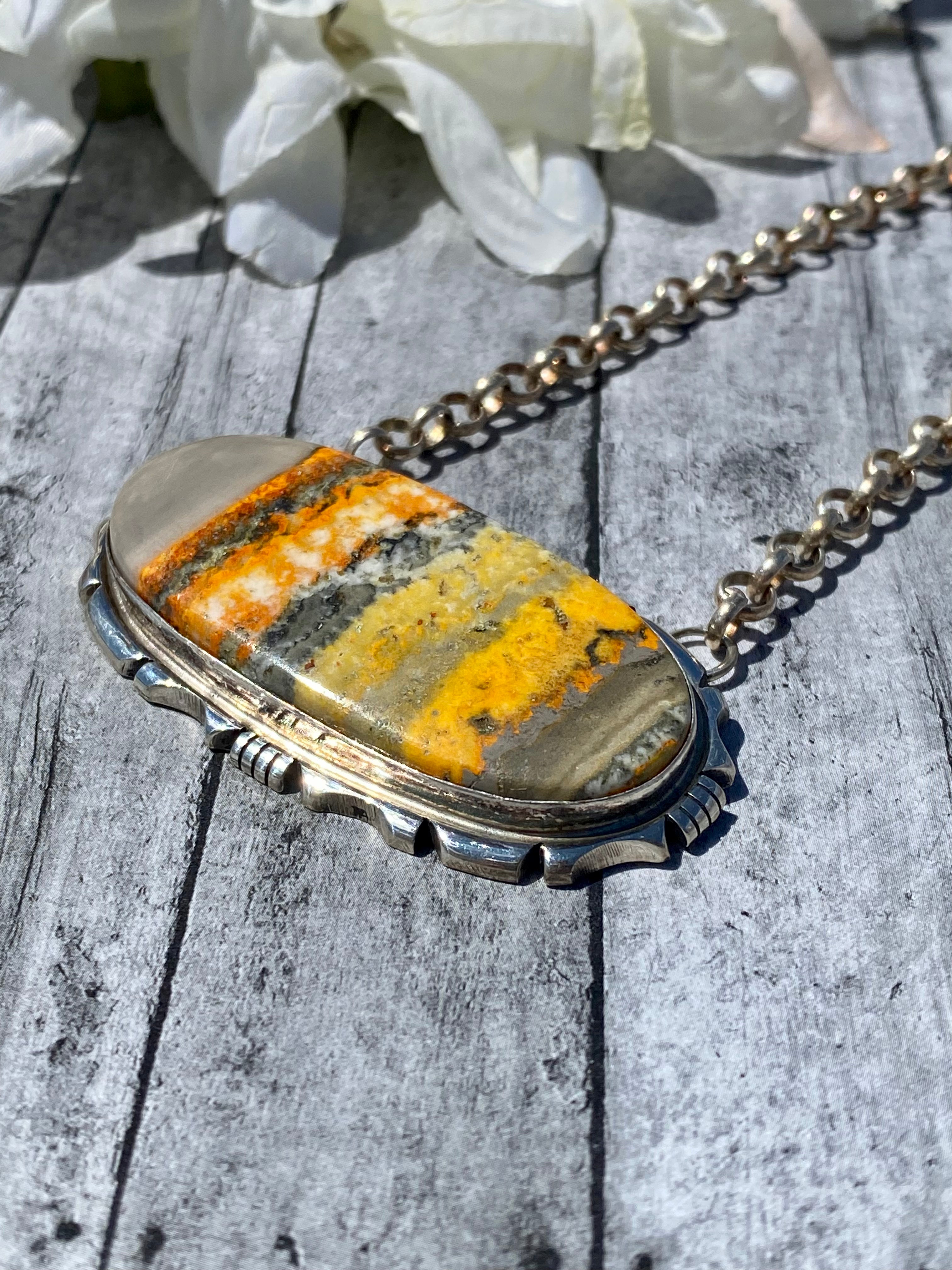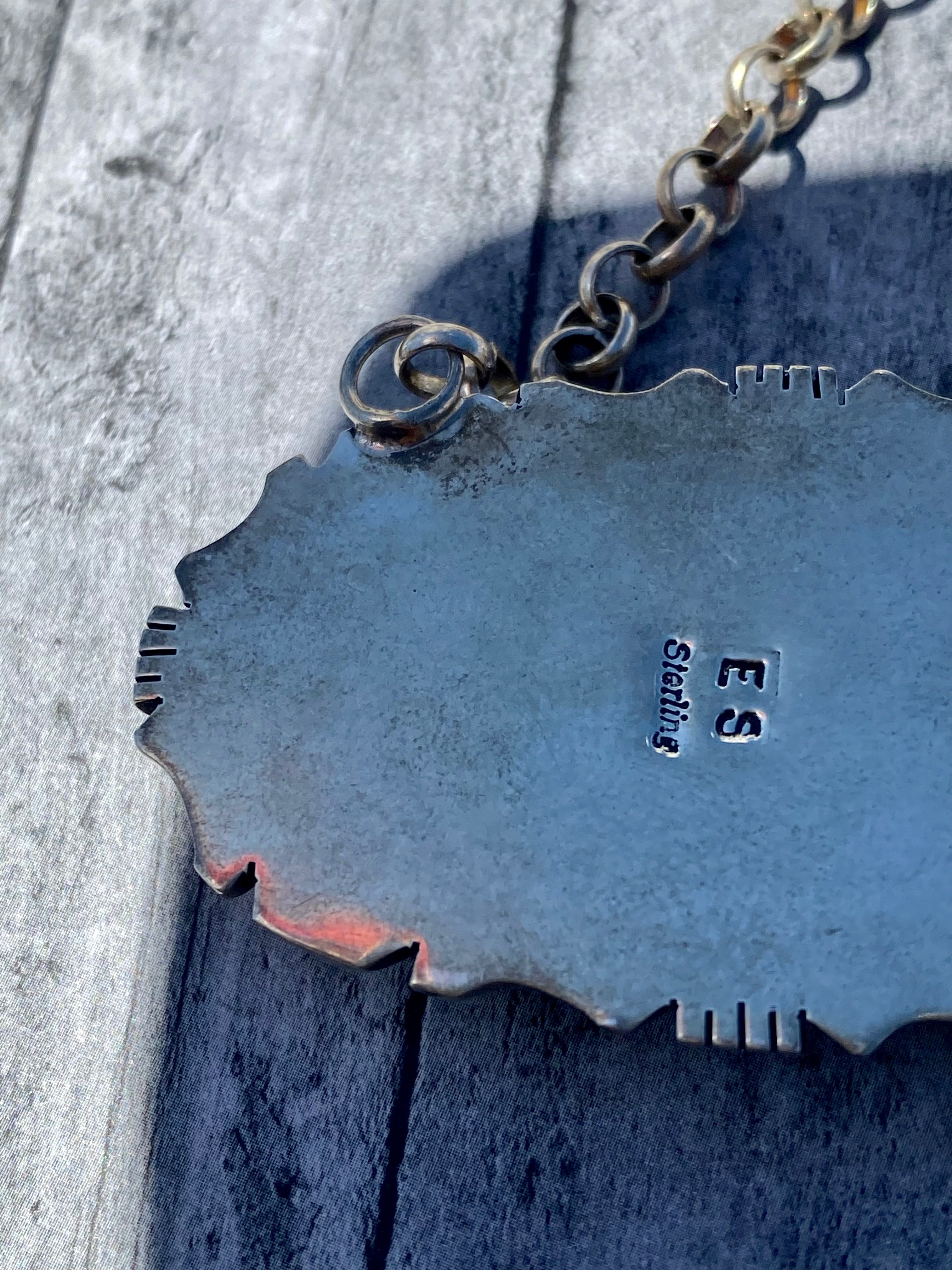Eddie Secatero Bb Agate & Sterling Silver Necklace. It measures 21 inches long with hang while the chain by itself measures 18 inches. Signed by the artist and stamped sterling silver.
